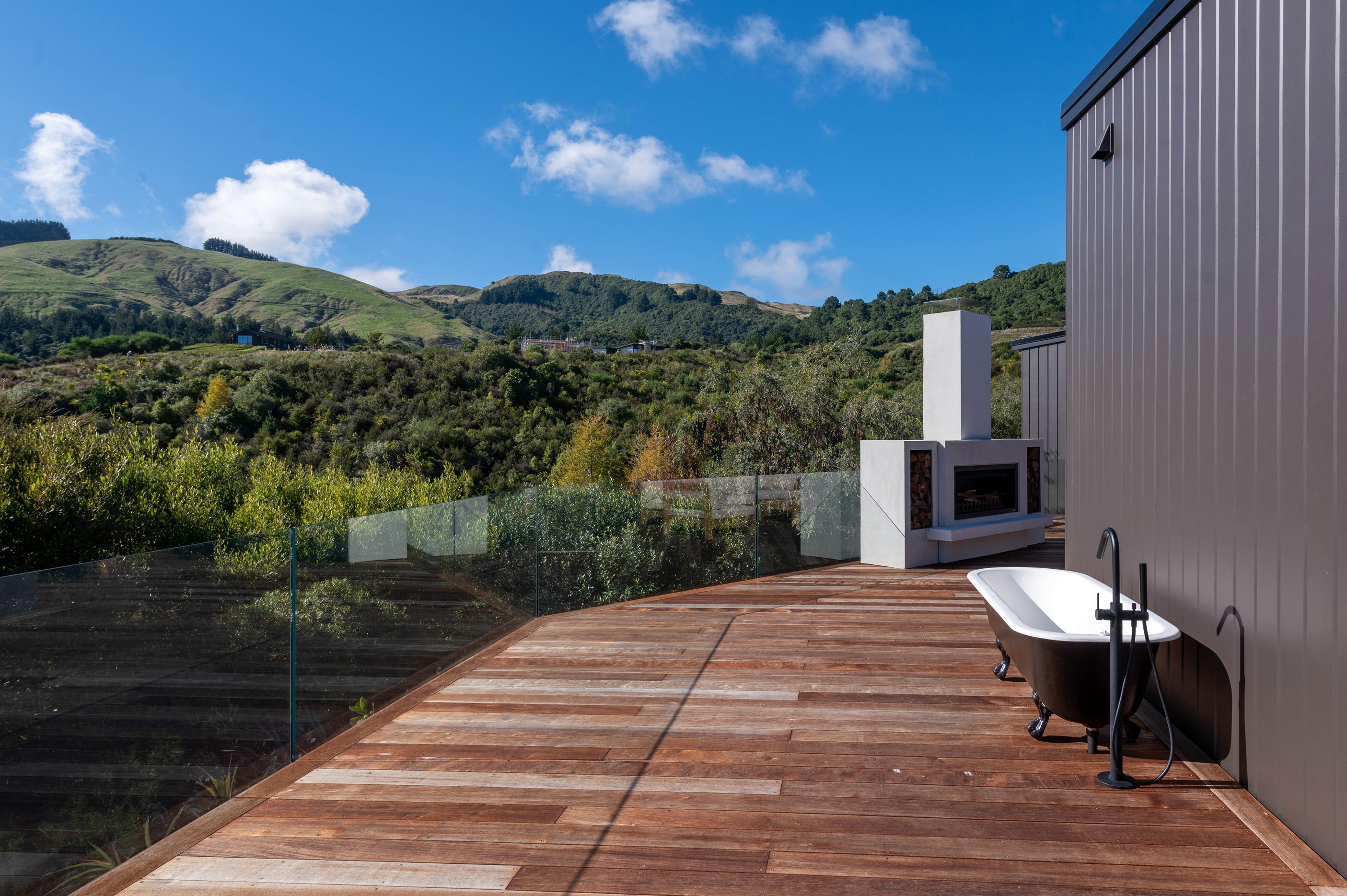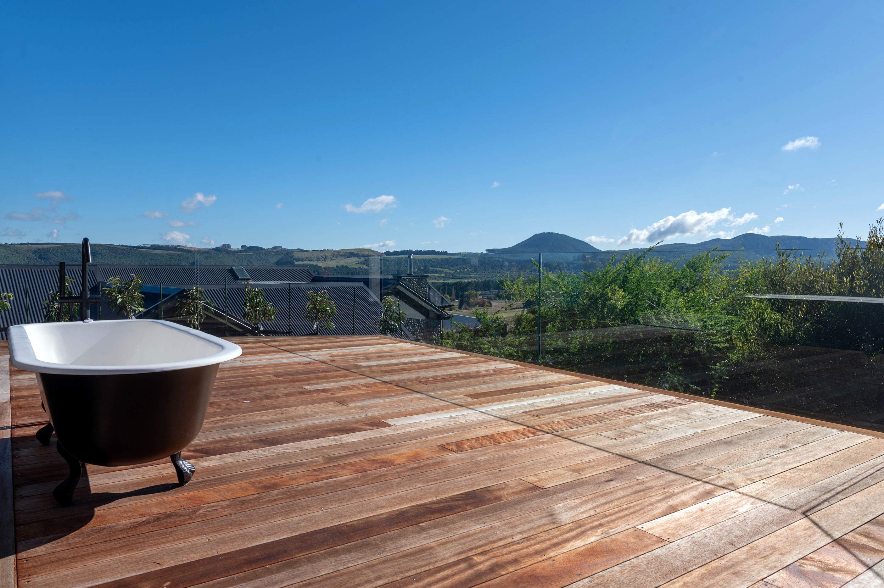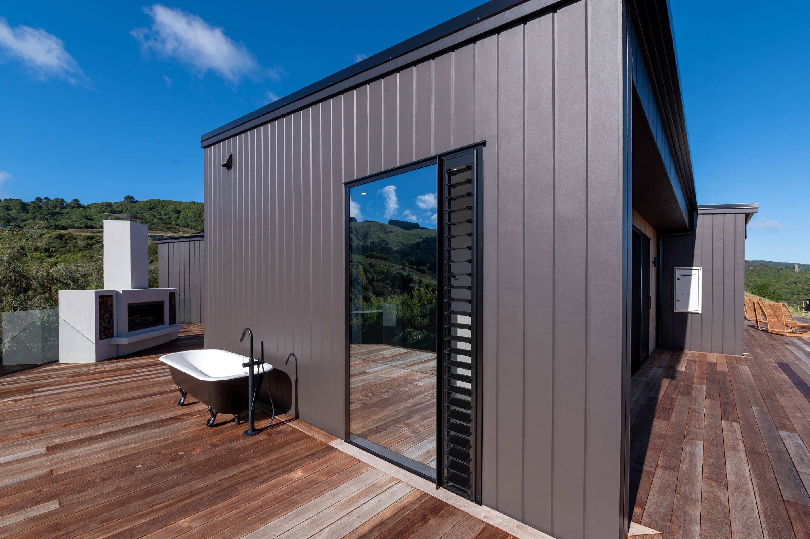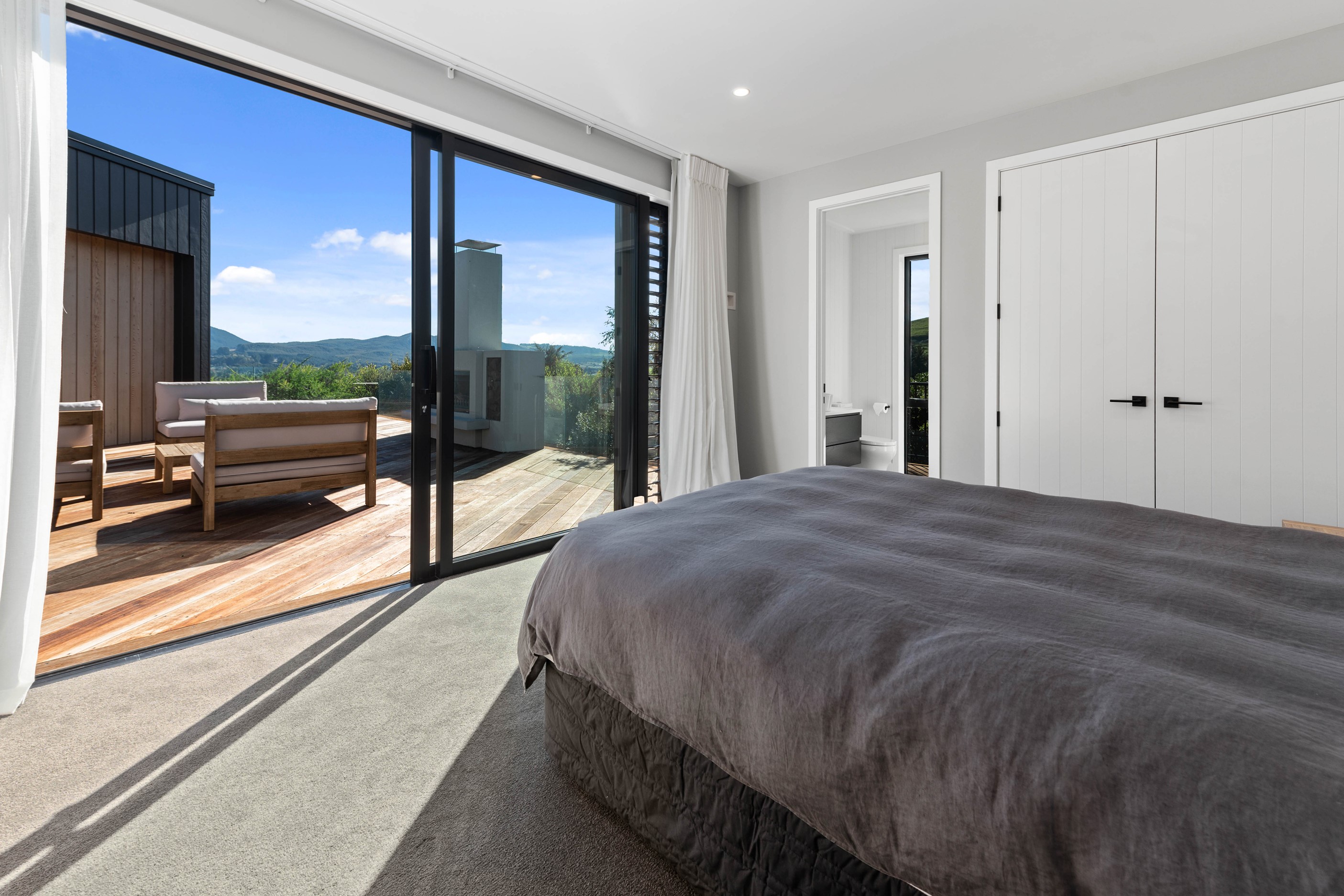 At first glance, this house is a stunner, its dark, woody exterior juxtaposed against the shades-of-green landscape and blues of Lake Taupō. On closer inspection, you’ll find plenty more features that take the 302sqm home to the next level. One of the major drawcards is a 240sqm wrap-around timber deck with an outdoor fire and bath. Is there a better, more tranquil place from which to enjoy the panoramic views of land and lake? And because part of this sprawling terrace is covered, rainy weather is never an issue. Inside, you’ll find four bedrooms, three high-end bathrooms and two living areas. Almost every room has a view and dark cabinetry creates a moody style. The living area, combined with a cleverly designed kitchen and scullery, make it a natural for entertaining. A blackened steel fireplace anchors the main living space, creating a dramatic but cosy effect and an extra-large glass sliding door maximises that remarkable view. Nothing has been left to chance in this light, airy and sunny architectural home, from the way it occupies its site to the many special features within.