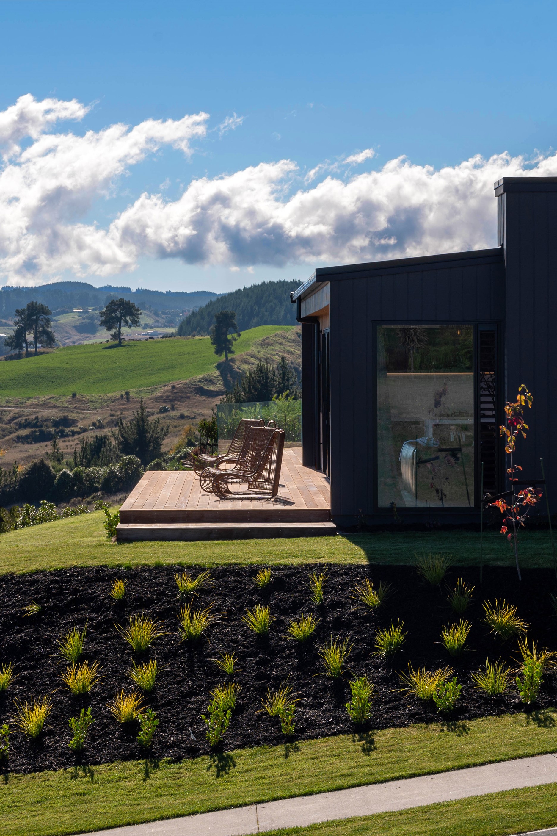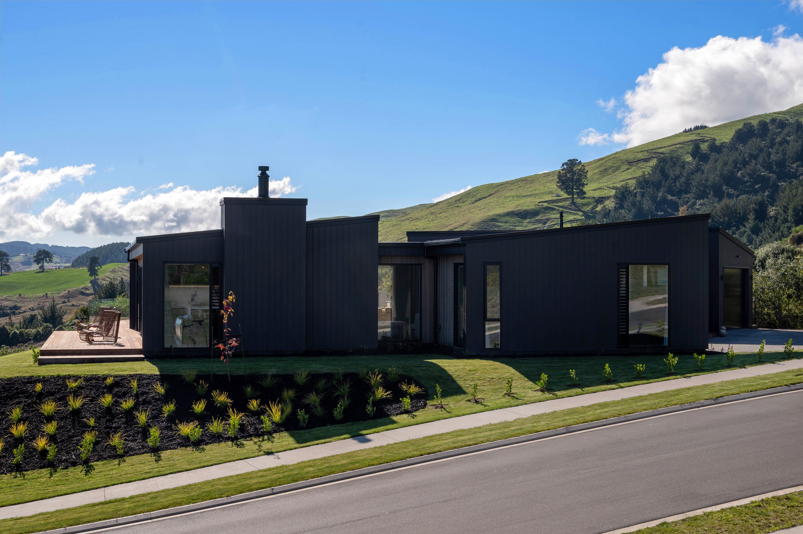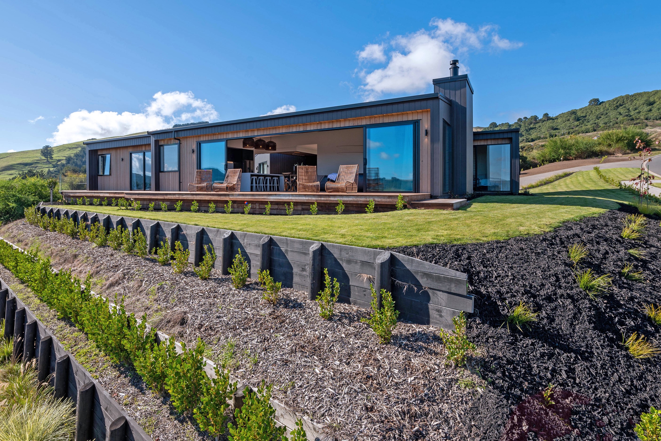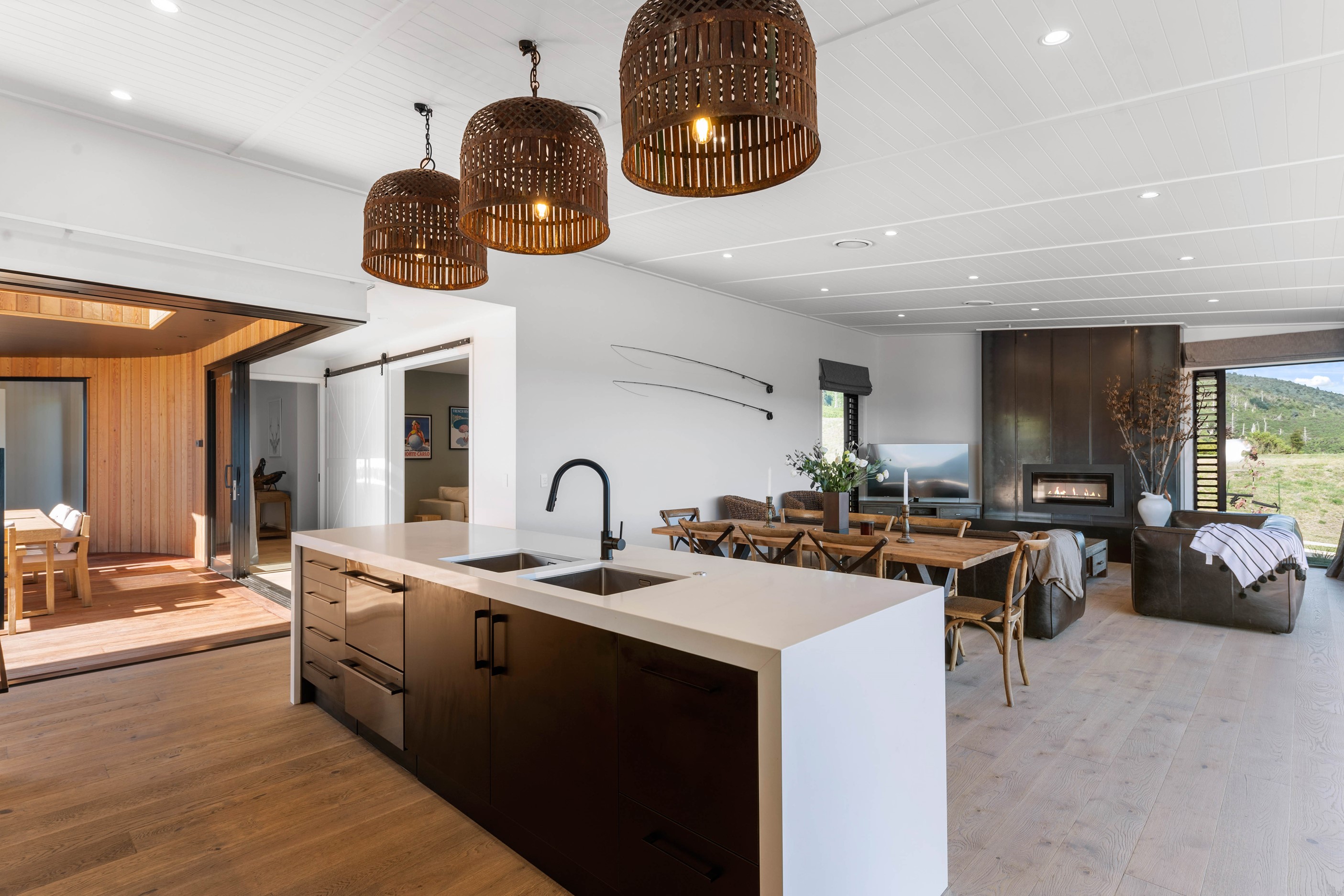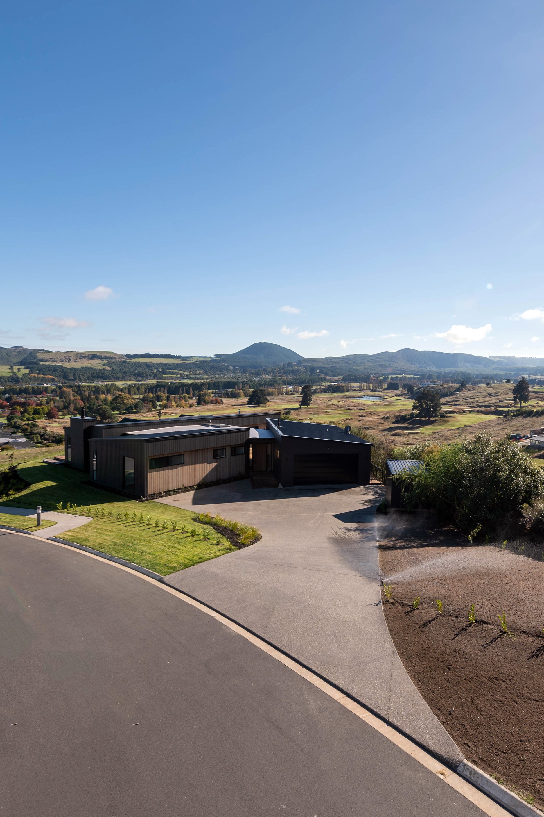 At first glance, this house is a stunner, its dark, woody exterior juxtaposed against the shades-of-green landscape and blues of Lake Taupō. On closer inspection, you’ll find plenty more features that take the 302sqm home to the next level. One of the major drawcards is a 240sqm wrap-around timber deck with an outdoor fire and bath. Is there a better, more tranquil place from which to enjoy the panoramic views of land and lake? And because part of this sprawling terrace is covered, rainy weather is never an issue. Inside, you’ll find four bedrooms, three high-end bathrooms and two living areas. Almost every room has a view and dark cabinetry creates a moody style. The living area, combined with a cleverly designed kitchen and scullery, make it a natural for entertaining. A blackened steel fireplace anchors the main living space, creating a dramatic but cosy effect and an extra-large glass sliding door maximises that remarkable view. Nothing has been left to chance in this light, airy and sunny architectural home, from the way it occupies its site to the many special features within.