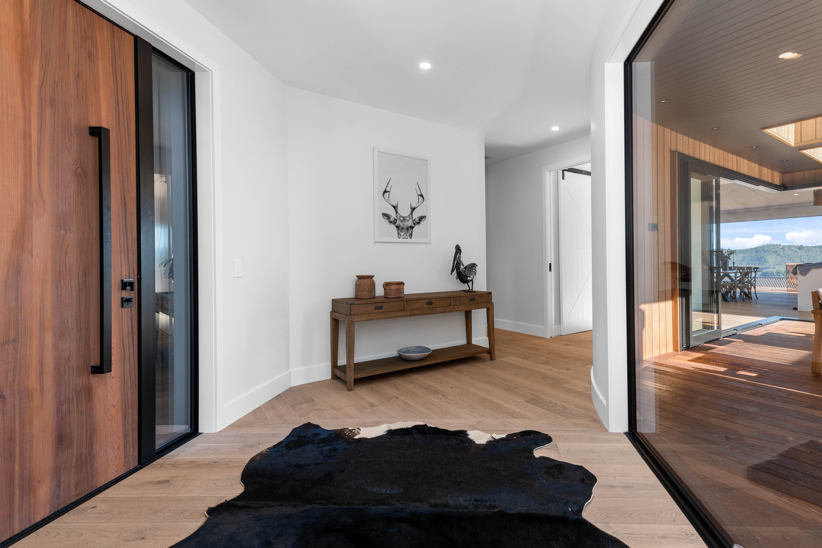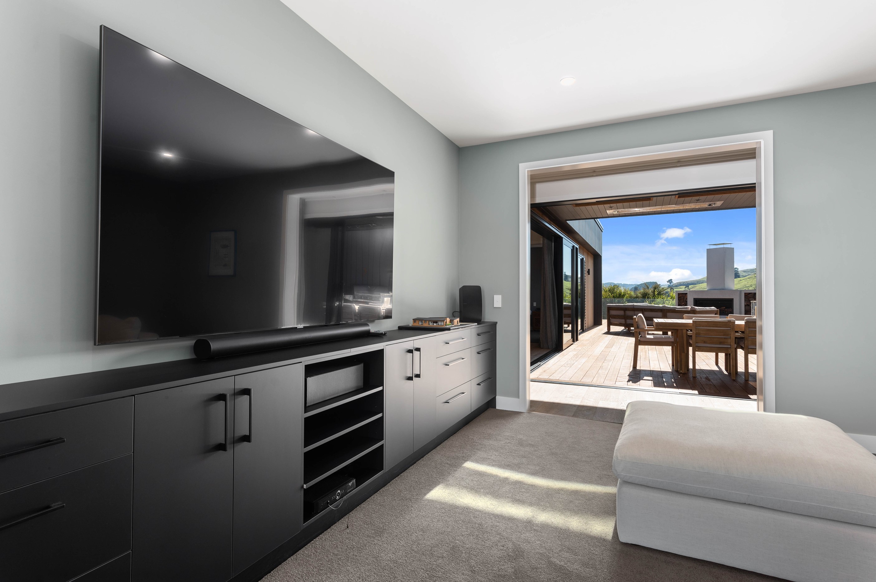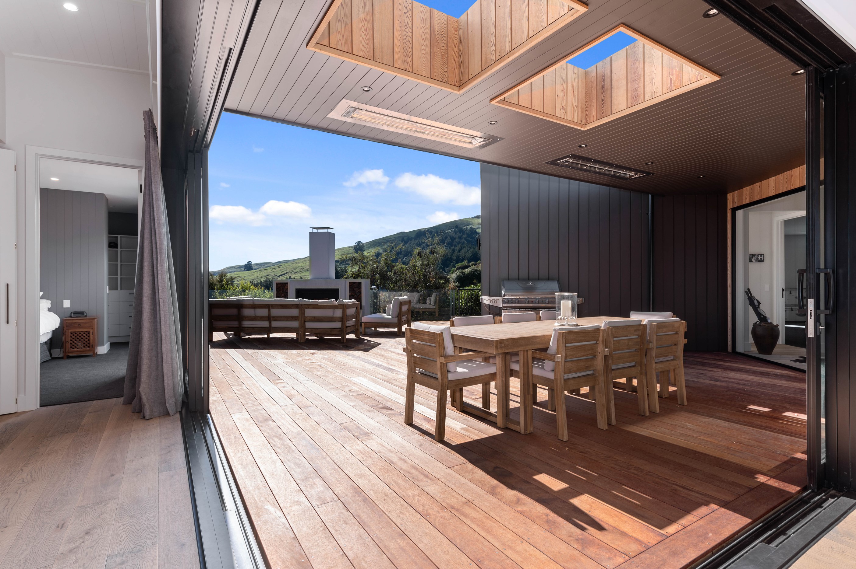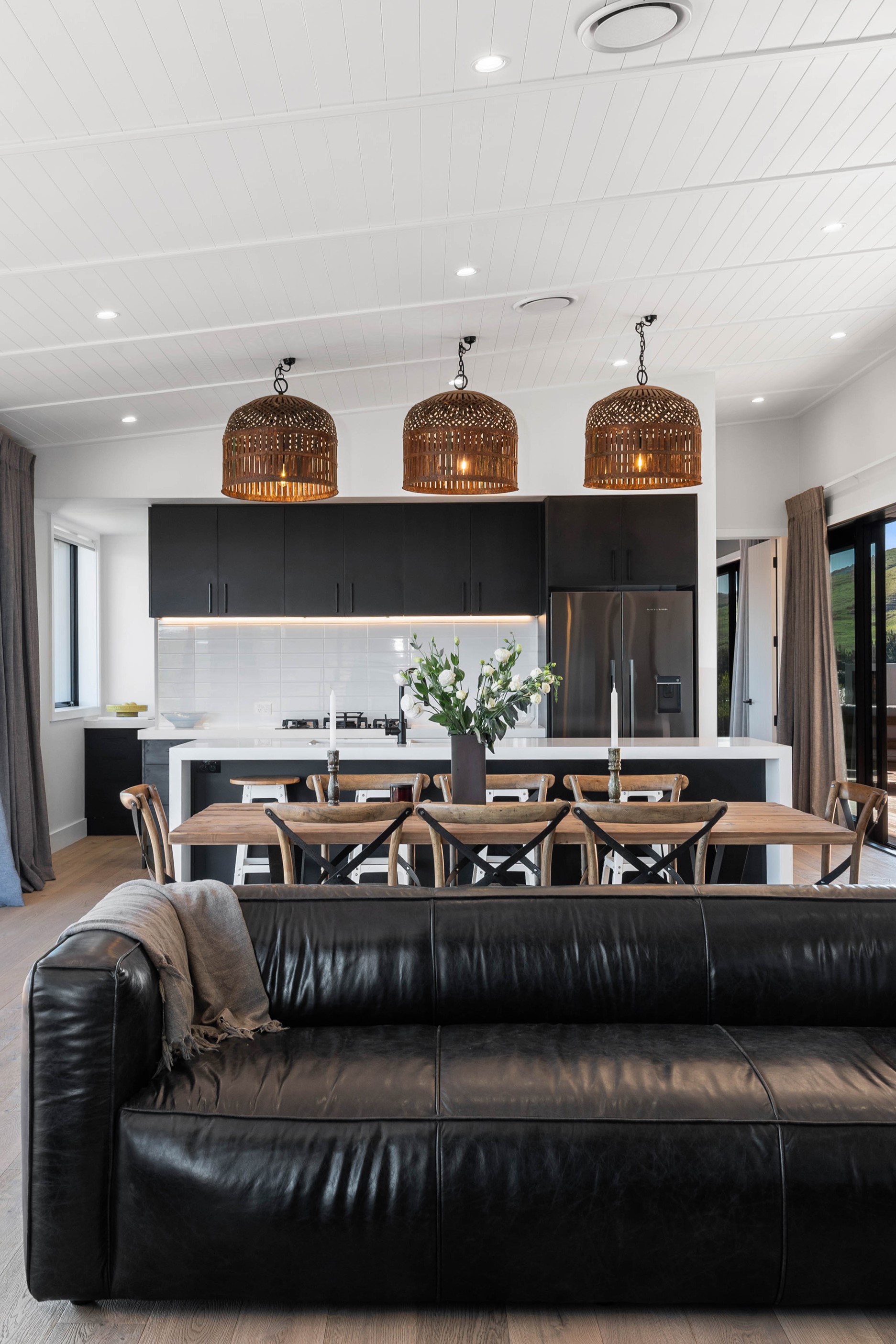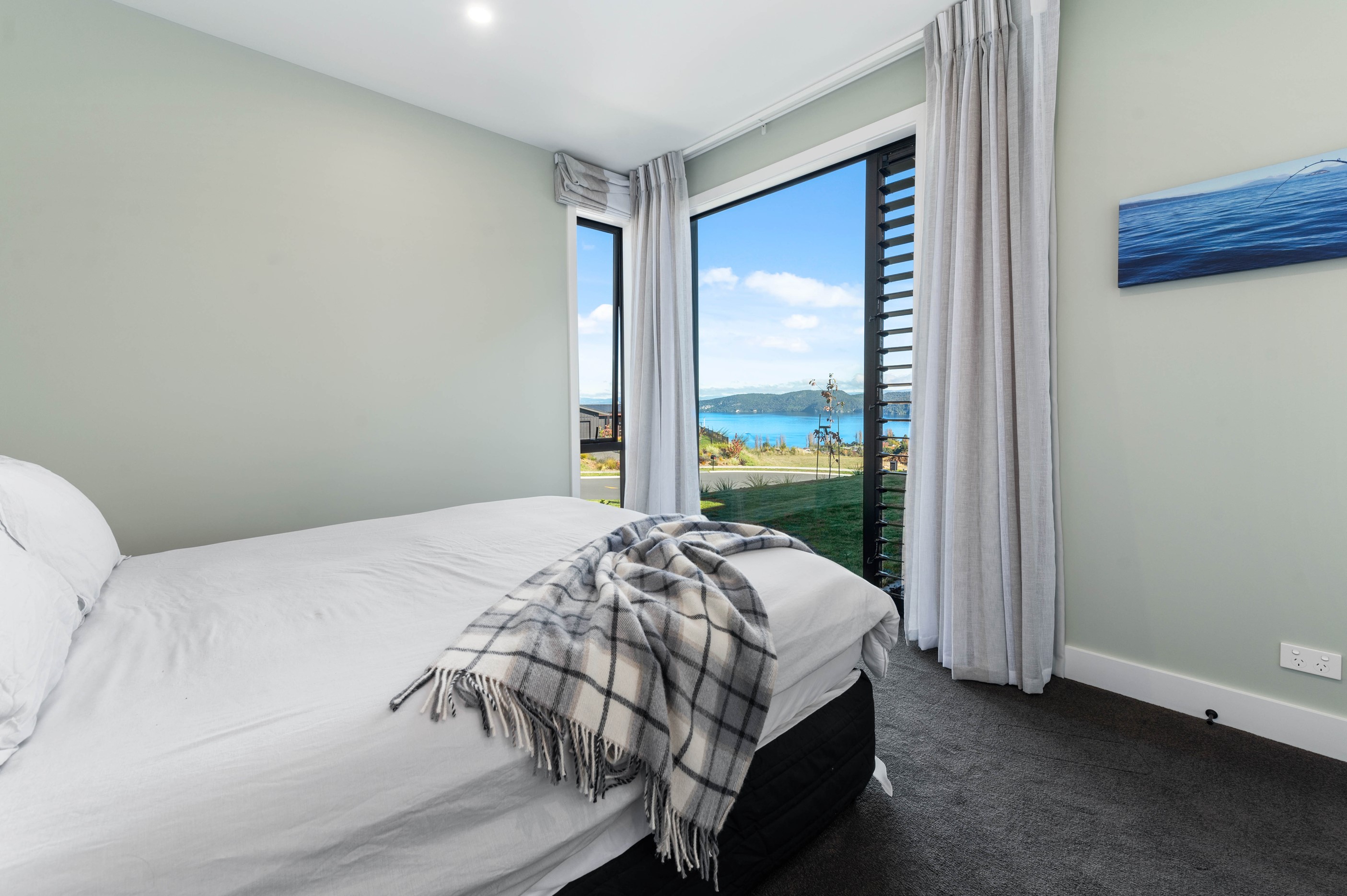 At first glance, this house is a stunner, its dark, woody exterior juxtaposed against the shades-of-green landscape and blues of Lake Taupō. On closer inspection, you’ll find plenty more features that take the 302sqm home to the next level. One of the major drawcards is a 240sqm wrap-around timber deck with an outdoor fire and bath. Is there a better, more tranquil place from which to enjoy the panoramic views of land and lake? And because part of this sprawling terrace is covered, rainy weather is never an issue. Inside, you’ll find four bedrooms, three high-end bathrooms and two living areas. Almost every room has a view and dark cabinetry creates a moody style. The living area, combined with a cleverly designed kitchen and scullery, make it a natural for entertaining. A blackened steel fireplace anchors the main living space, creating a dramatic but cosy effect and an extra-large glass sliding door maximises that remarkable view. Nothing has been left to chance in this light, airy and sunny architectural home, from the way it occupies its site to the many special features within.