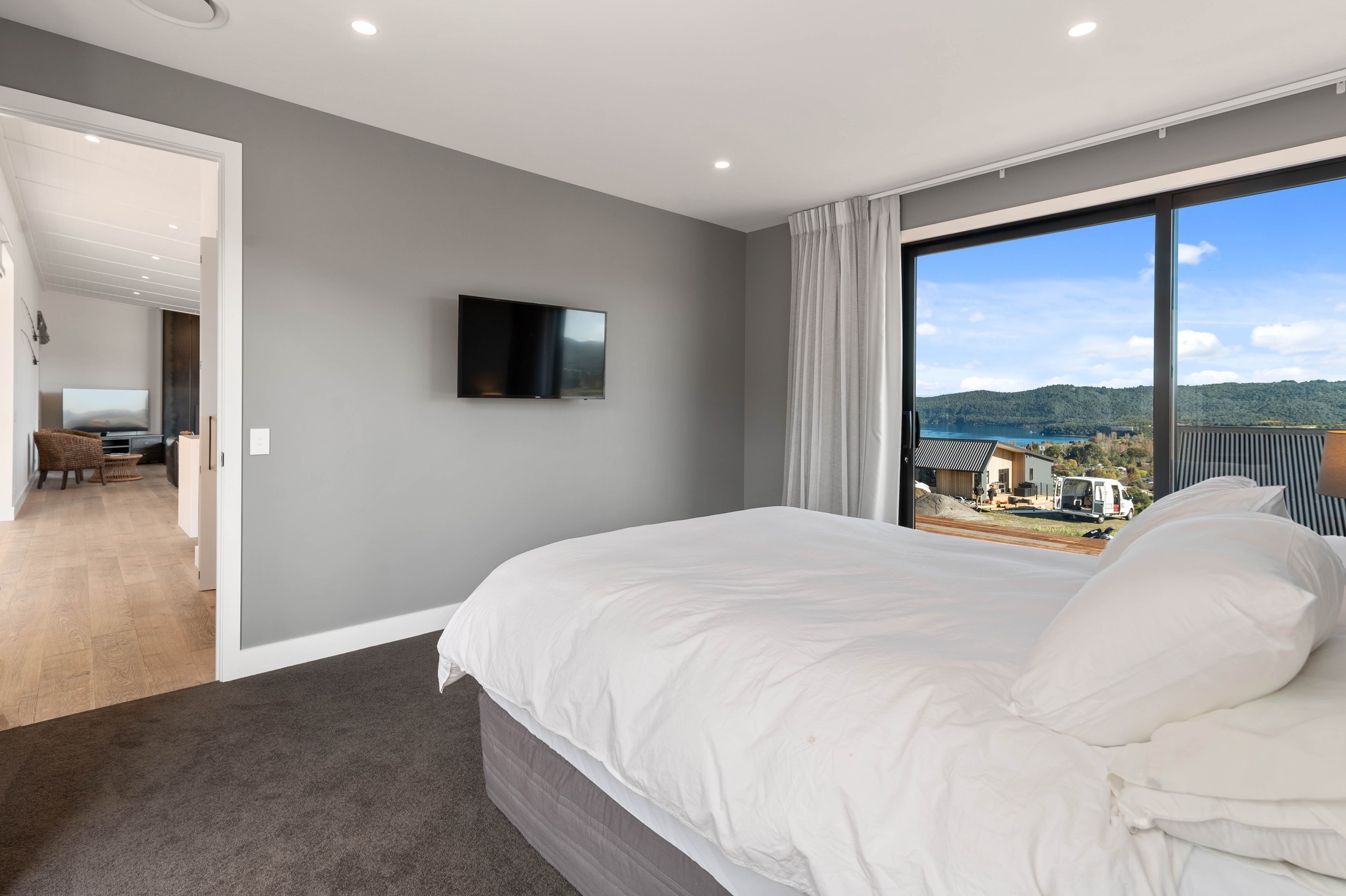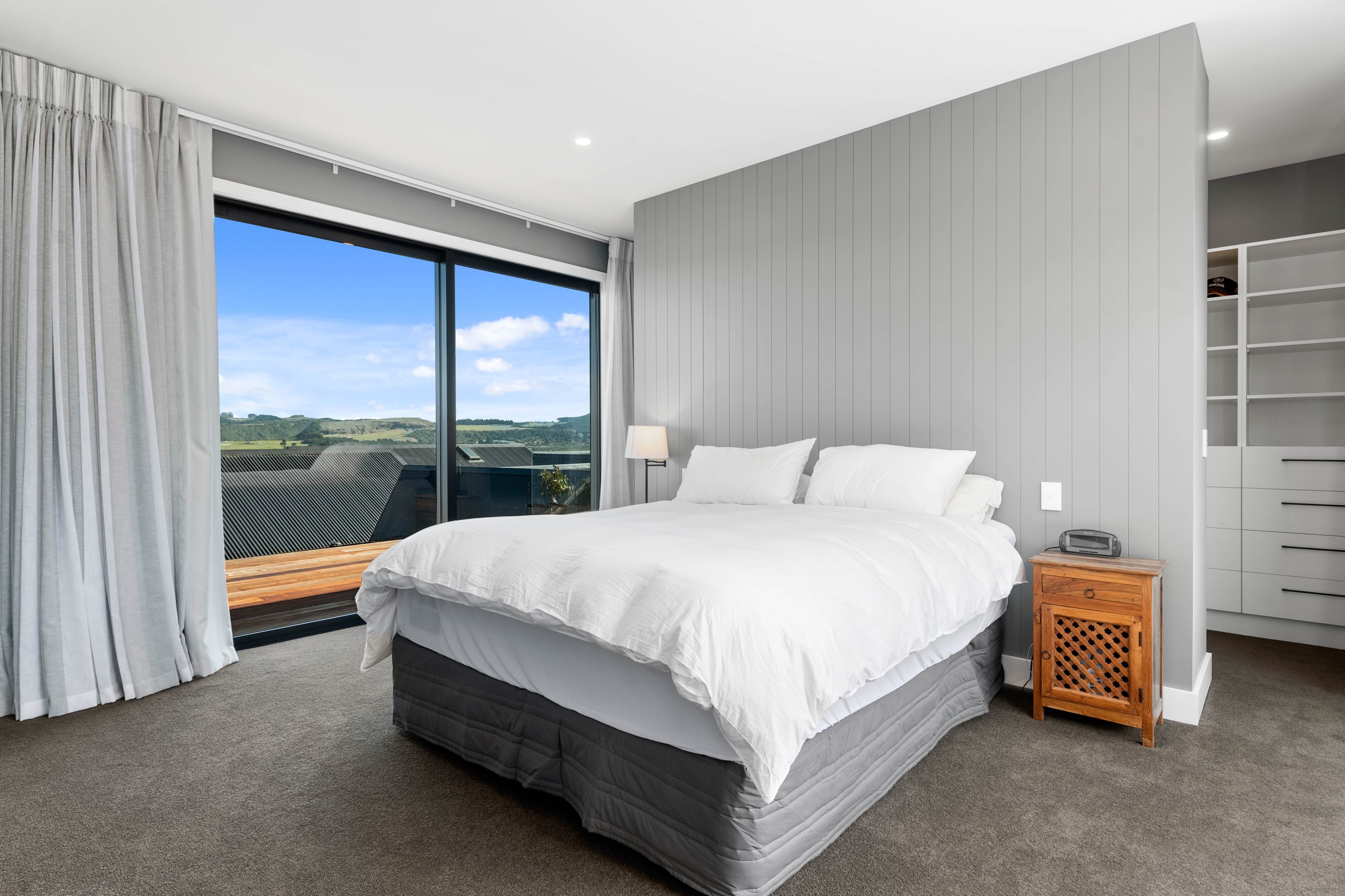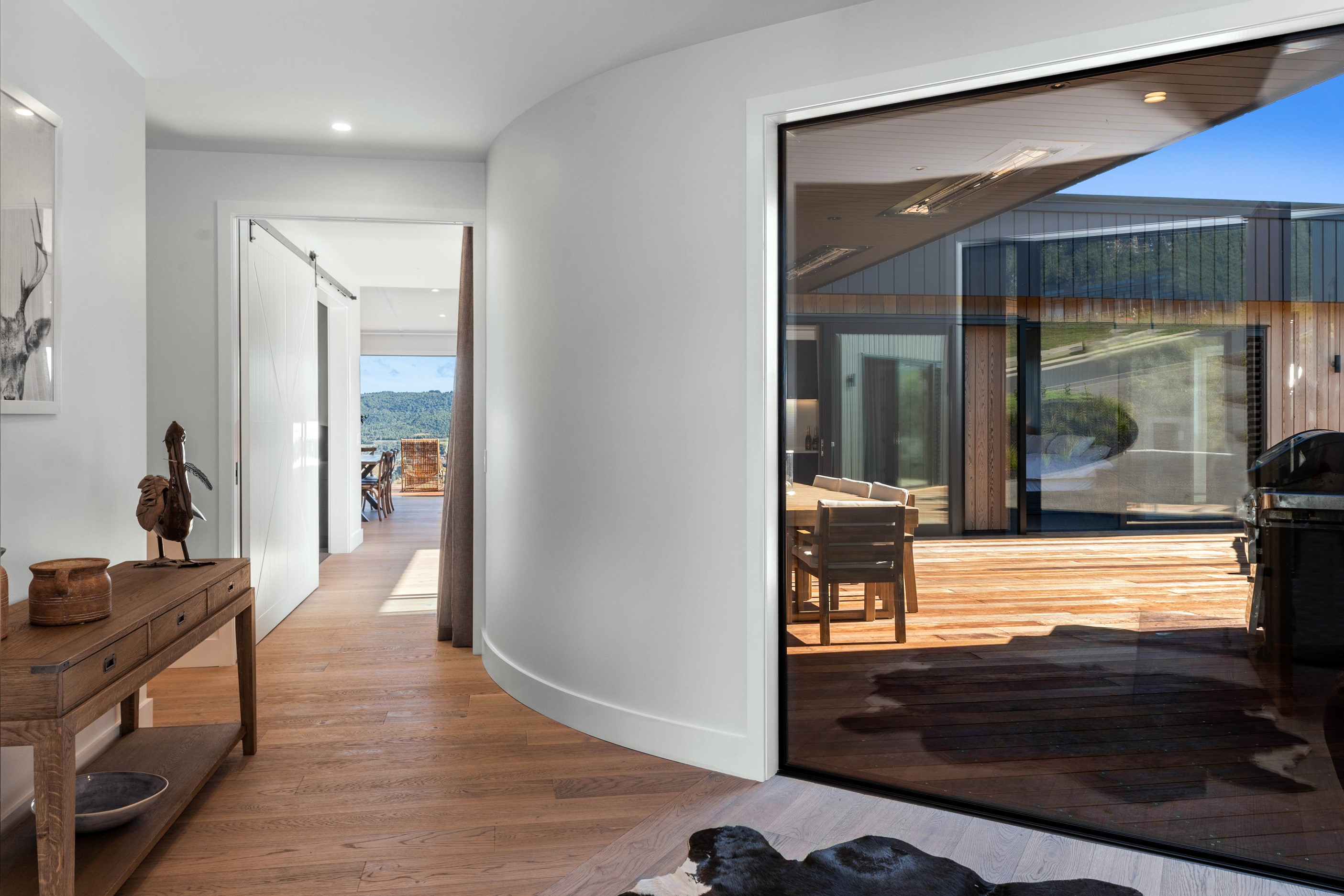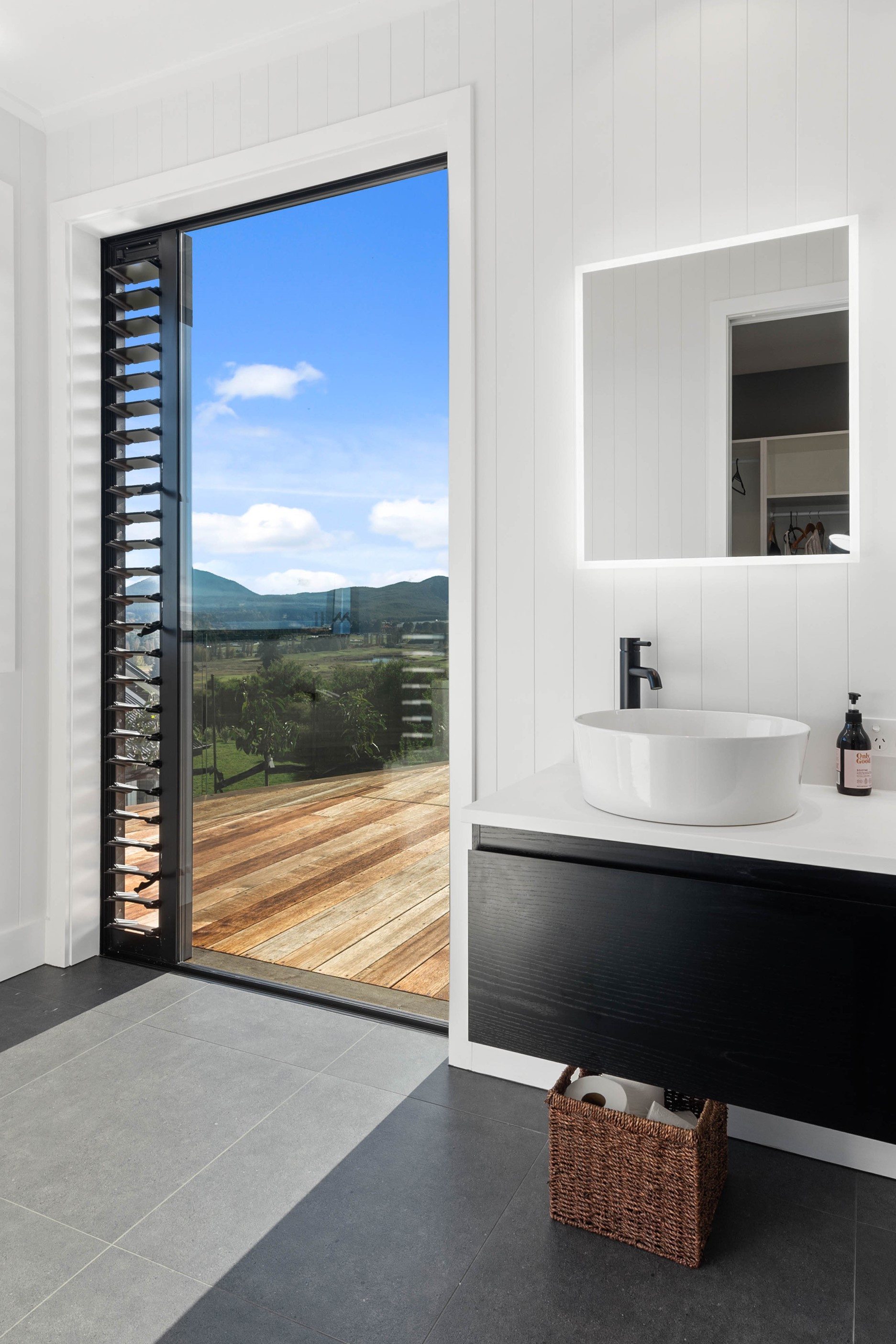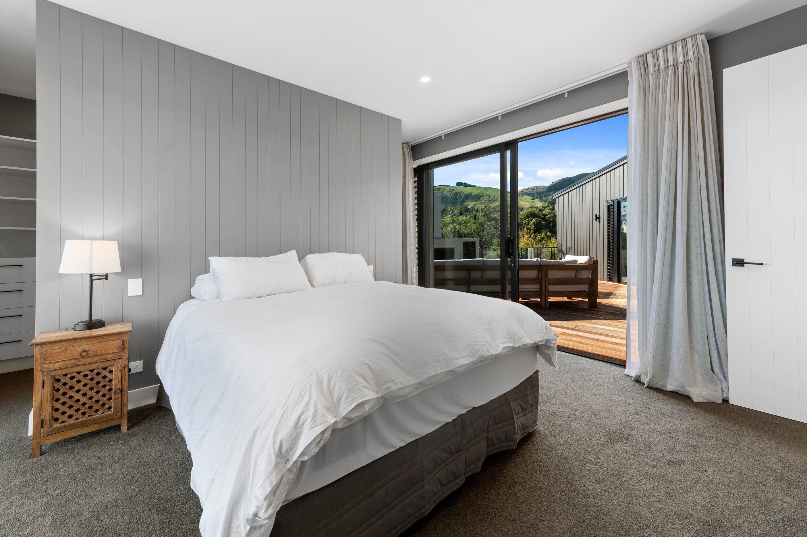 At first glance, this house is a stunner, its dark, woody exterior juxtaposed against the shades-of-green landscape and blues of Lake Taupō. On closer inspection, you’ll find plenty more features that take the 302sqm home to the next level. One of the major drawcards is a 240sqm wrap-around timber deck with an outdoor fire and bath. Is there a better, more tranquil place from which to enjoy the panoramic views of land and lake? And because part of this sprawling terrace is covered, rainy weather is never an issue. Inside, you’ll find four bedrooms, three high-end bathrooms and two living areas. Almost every room has a view and dark cabinetry creates a moody style. The living area, combined with a cleverly designed kitchen and scullery, make it a natural for entertaining. A blackened steel fireplace anchors the main living space, creating a dramatic but cosy effect and an extra-large glass sliding door maximises that remarkable view. Nothing has been left to chance in this light, airy and sunny architectural home, from the way it occupies its site to the many special features within.
