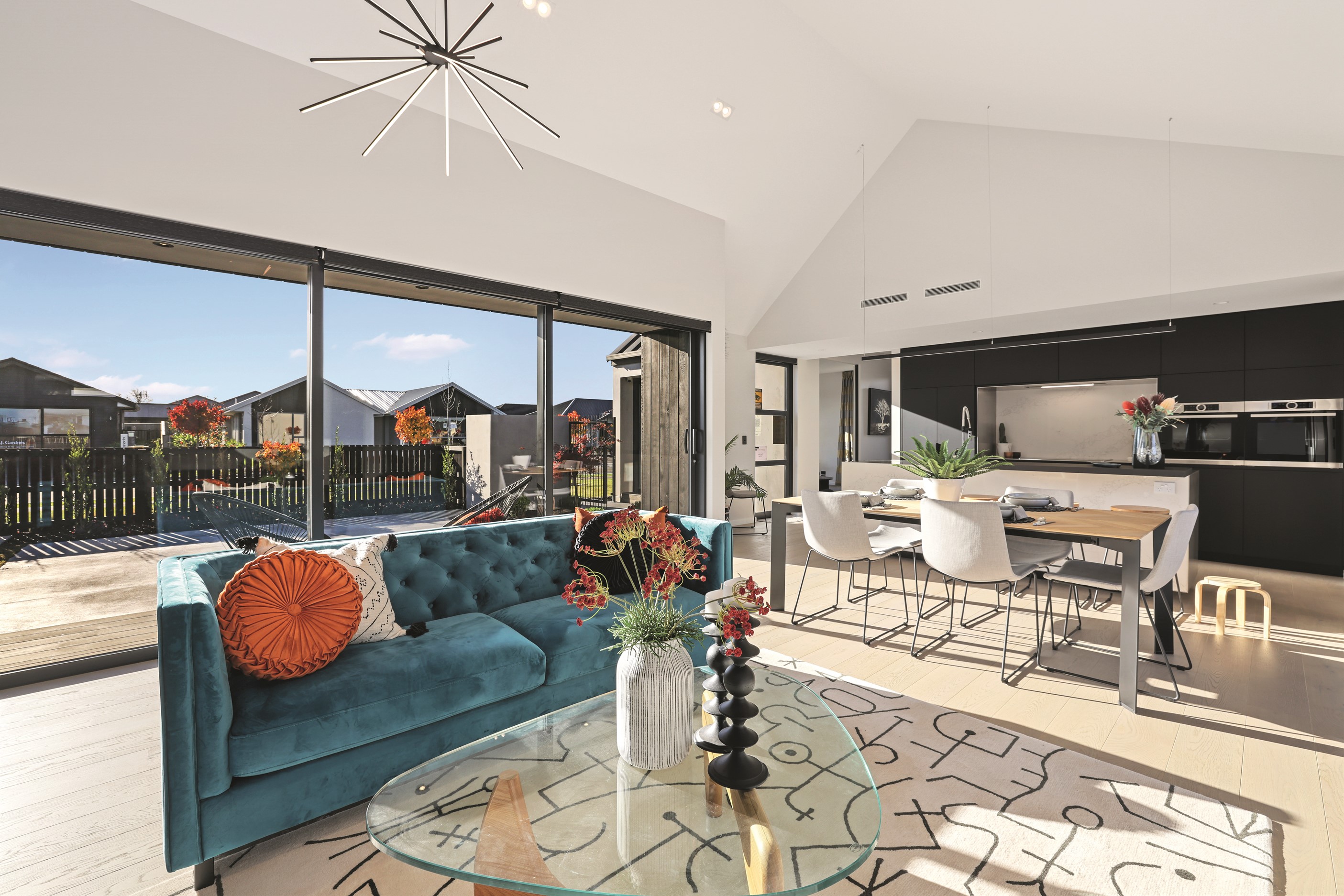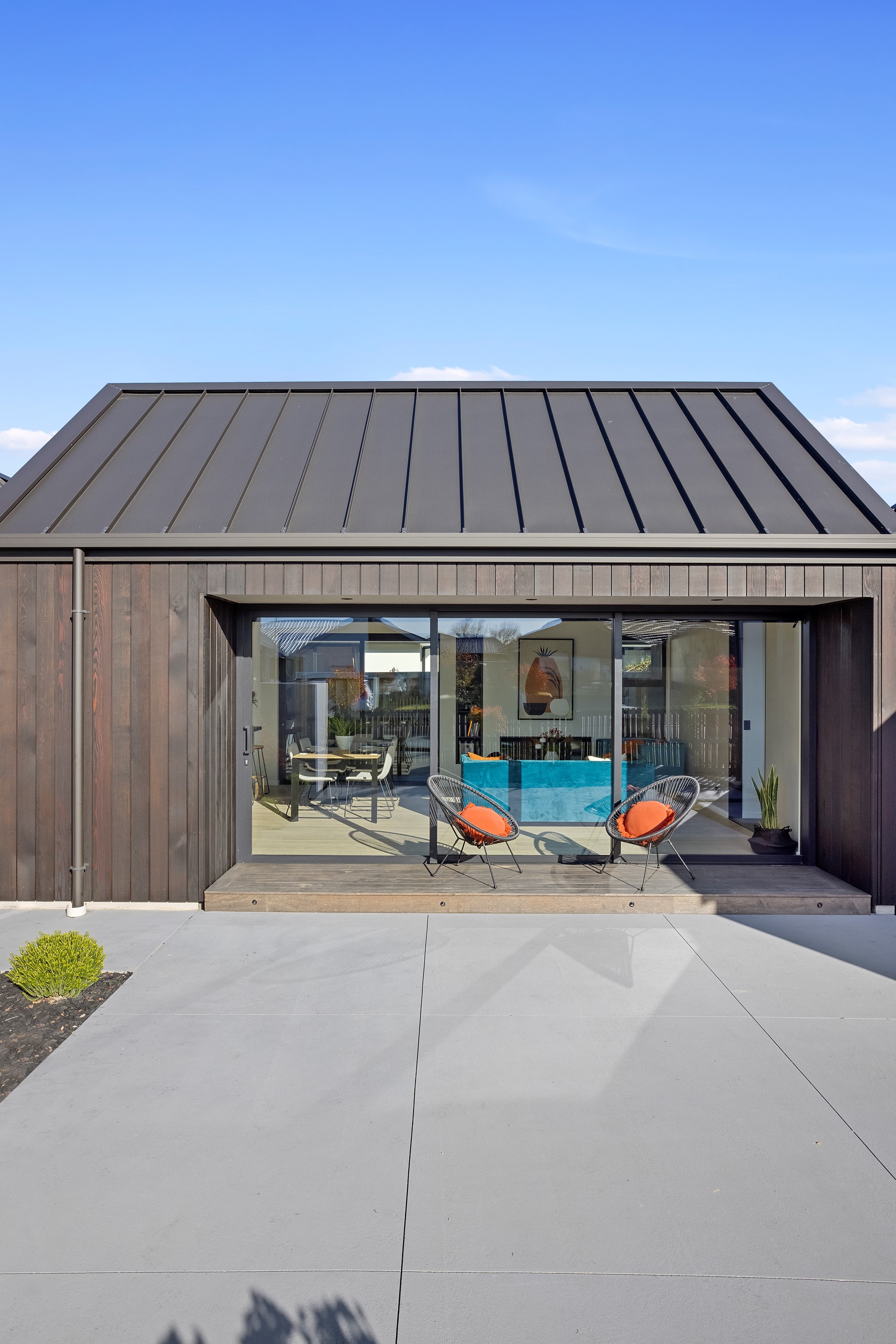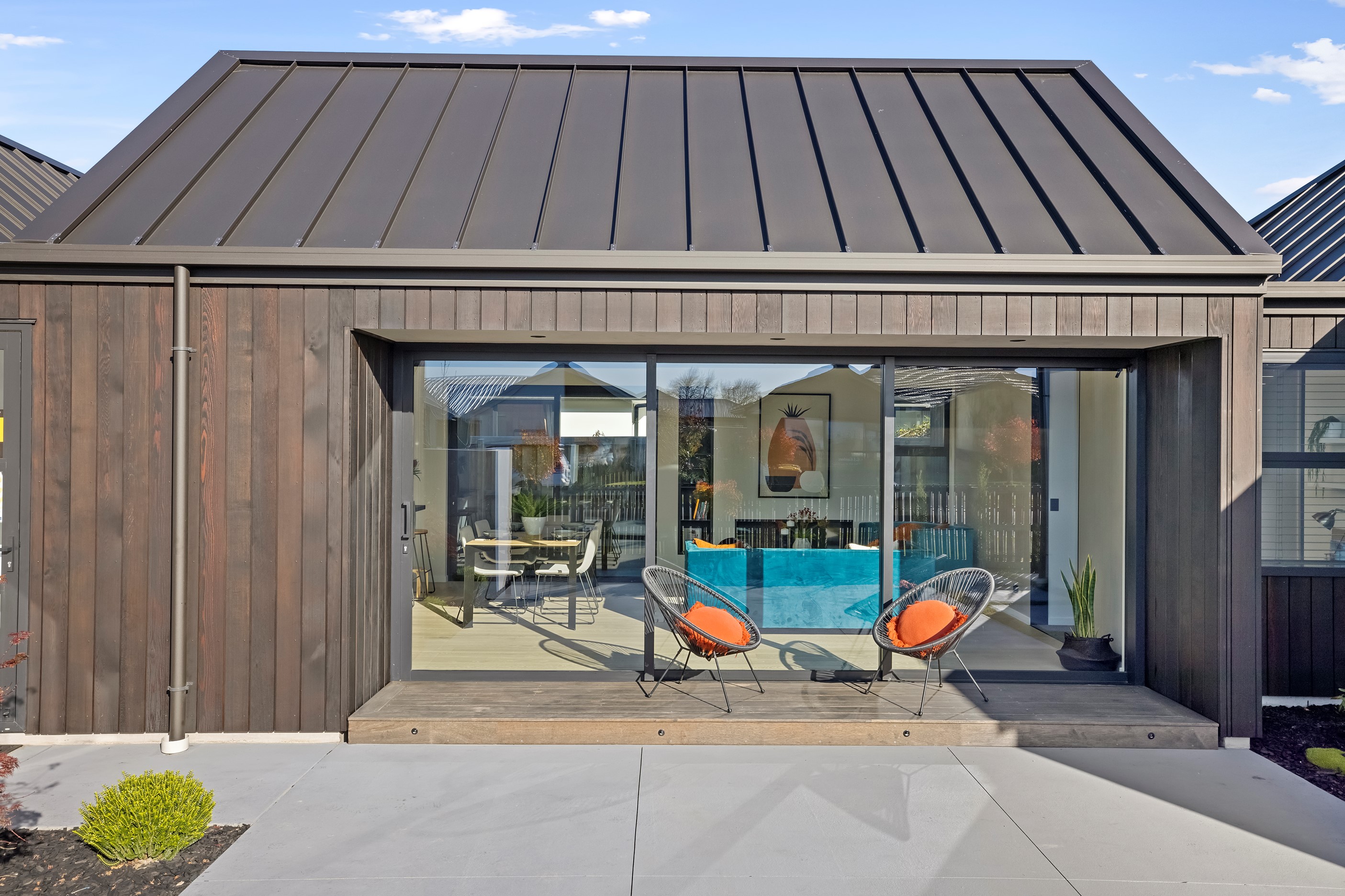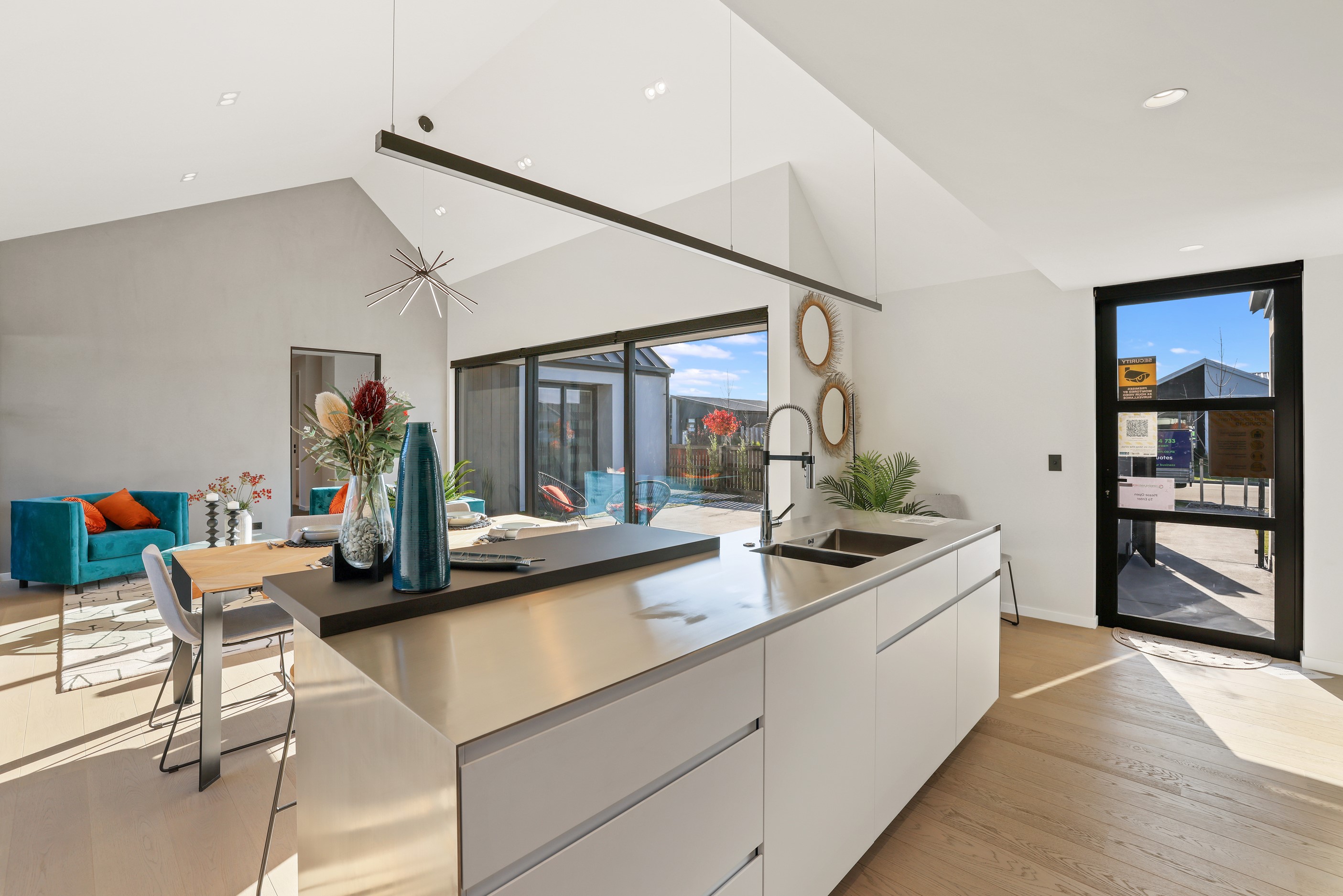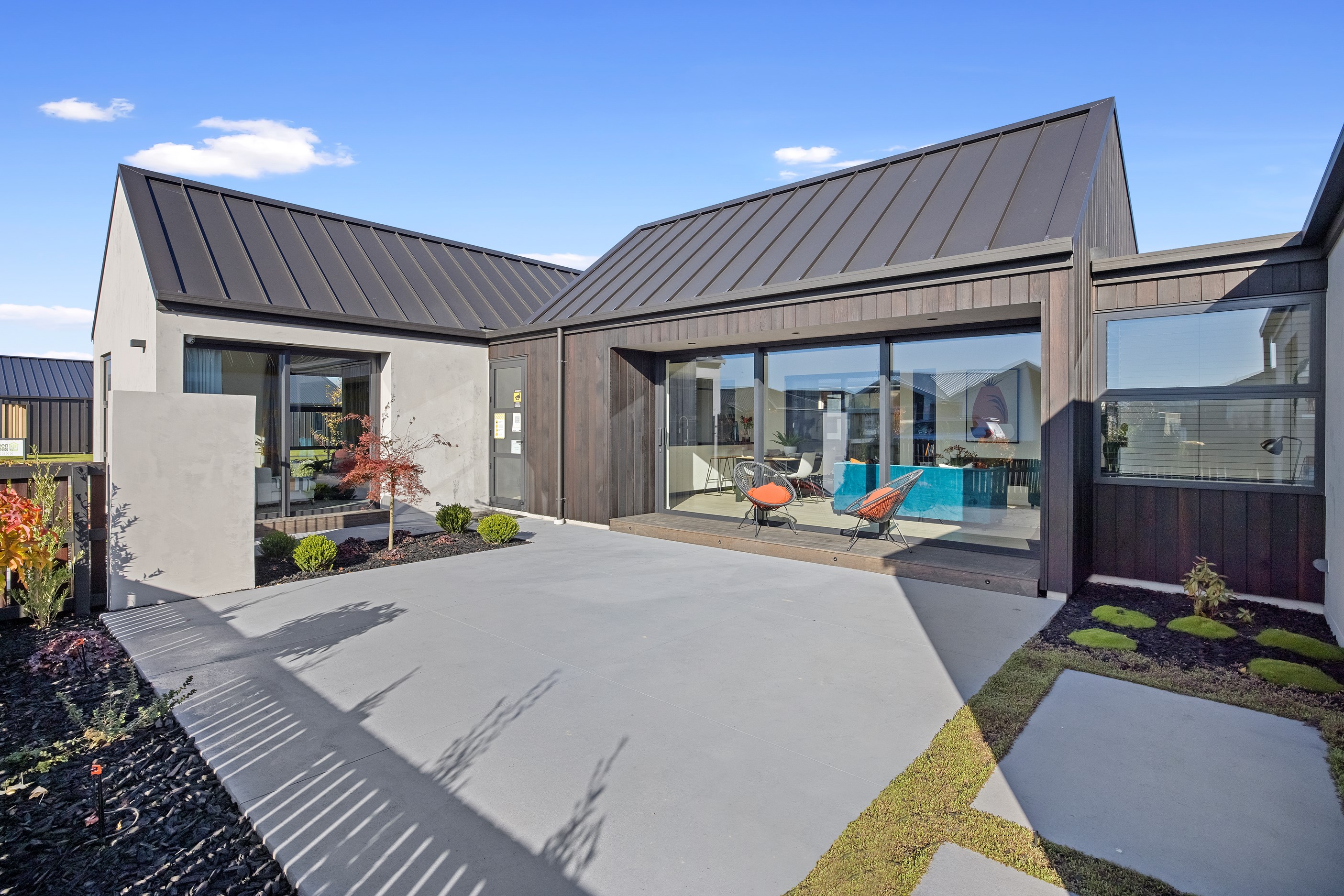 Pavilion-style houses usually have a strong connection to the outdoors, and this architecturally designed U-shaped show home is no different. The living room has sliders on both sides, the family space has a vaulted cathedral ceiling and the whole house has a 2.7m stud, all of which enhance the open, light feel. The living and family zones and main bedroom open two bathrooms and two living areas, there is much to be enjoyed in the 188sqm footprint. There's also a double garage, study with floating shelves and main bedroom with ensuite and walk-in wardrobe. A neutral palette of steel, concrete, cedar and plaster is a lesson in how to create a harmonious aesthetic using different cladding. In the kitchen, black and white cabinets, mitred joinery and a stainless steel-wrapped island produce a sleek look. A recessed area encased in stainless steel makes an eye-catching feature, and specialist lighting also draws the eye. Clever design combined with quality craftsmanship result in a stunning show home packed with personality.