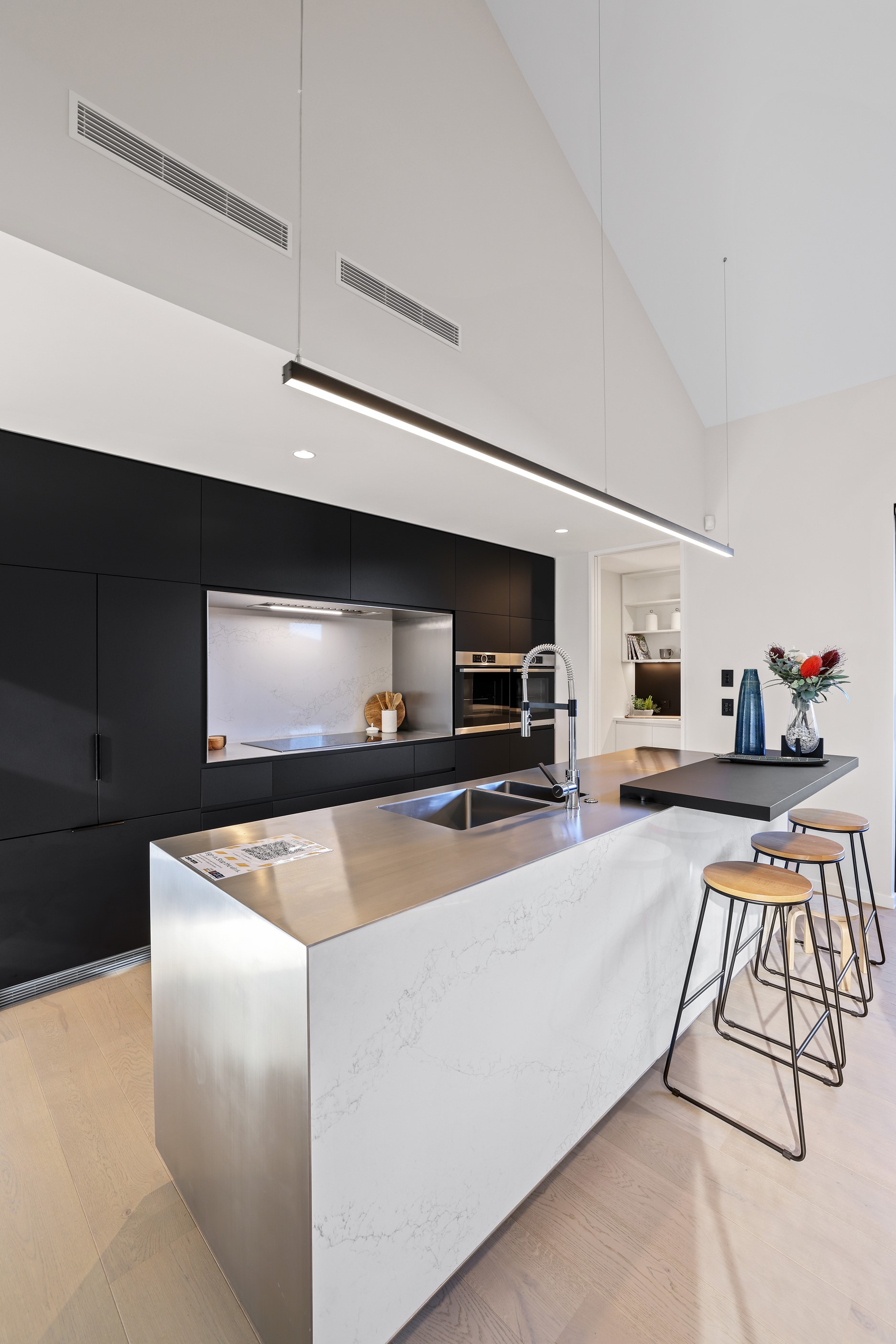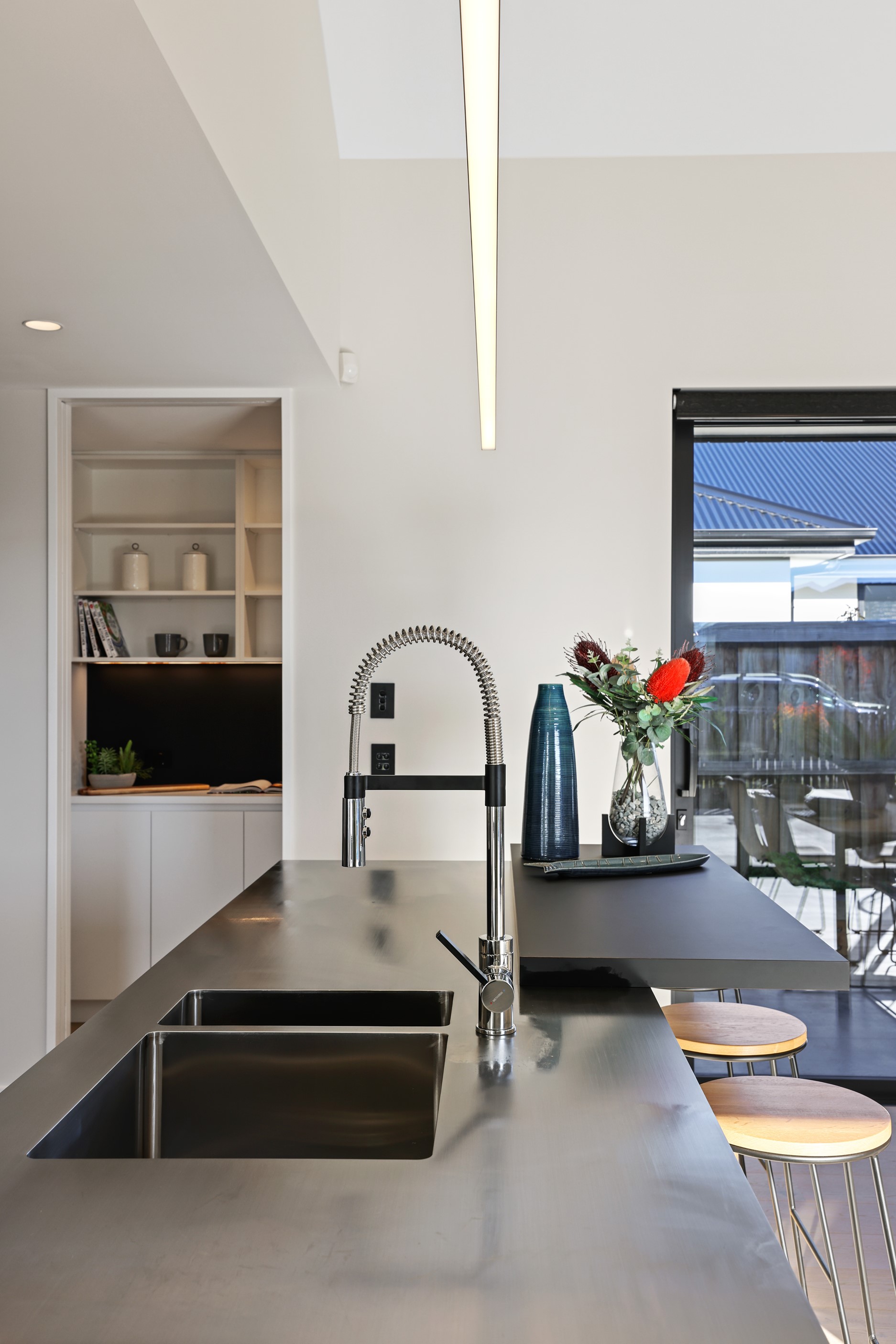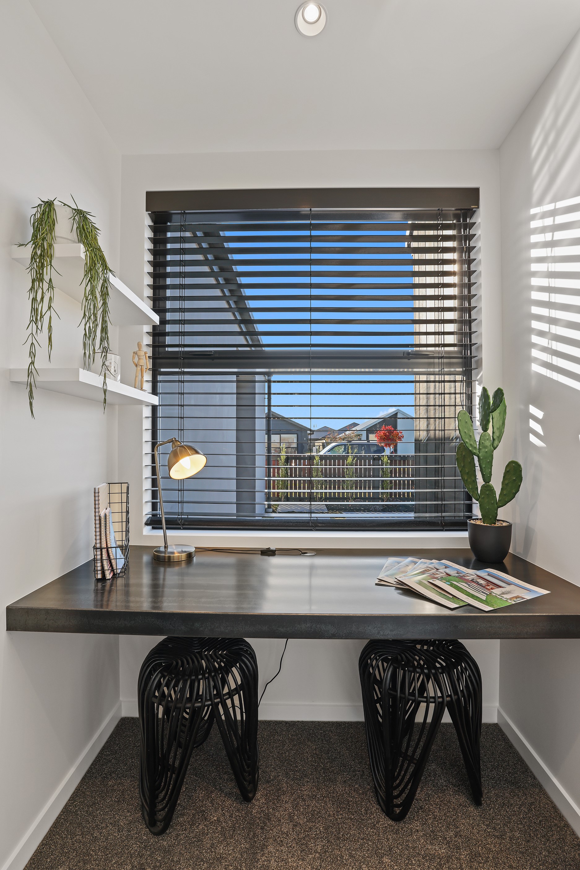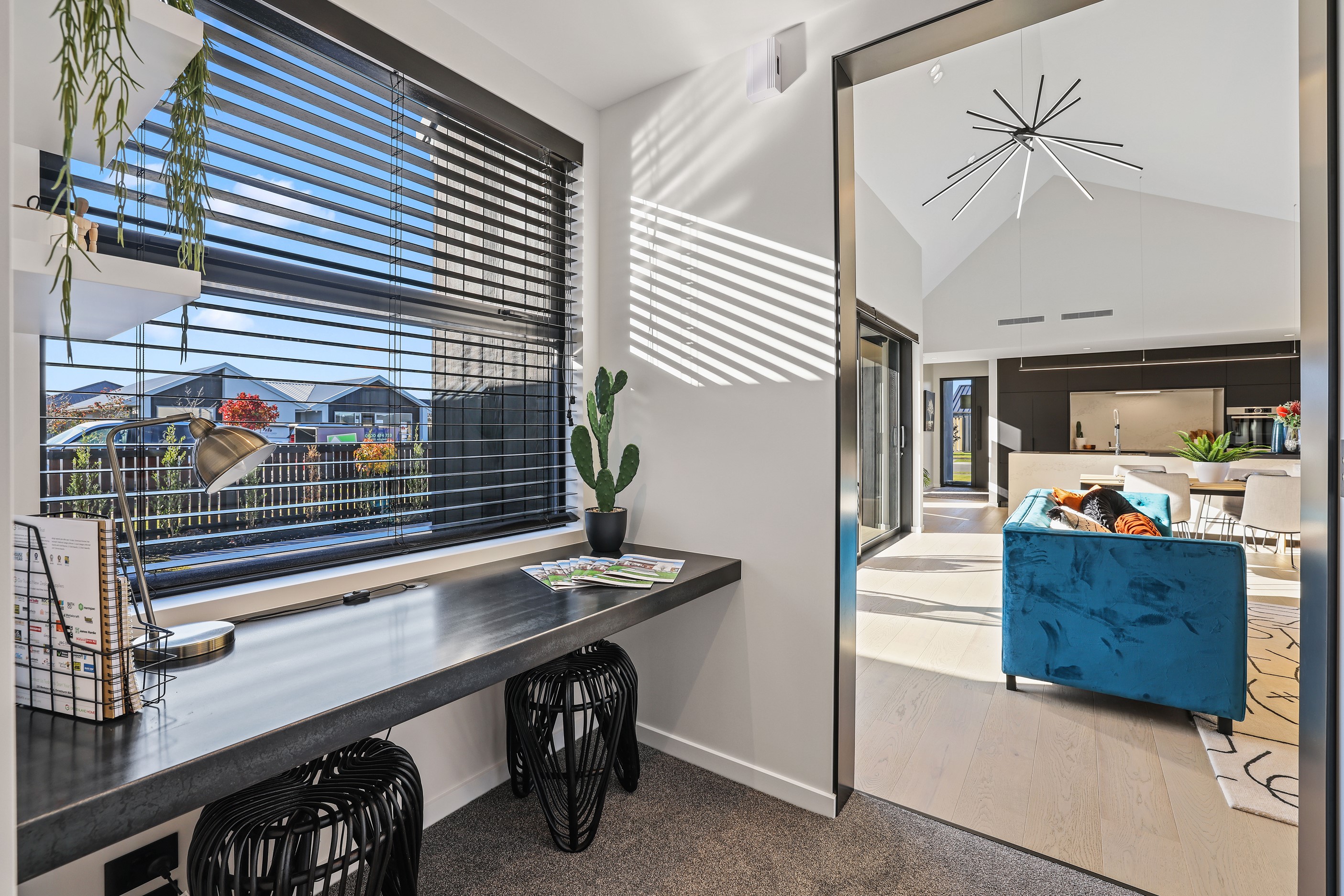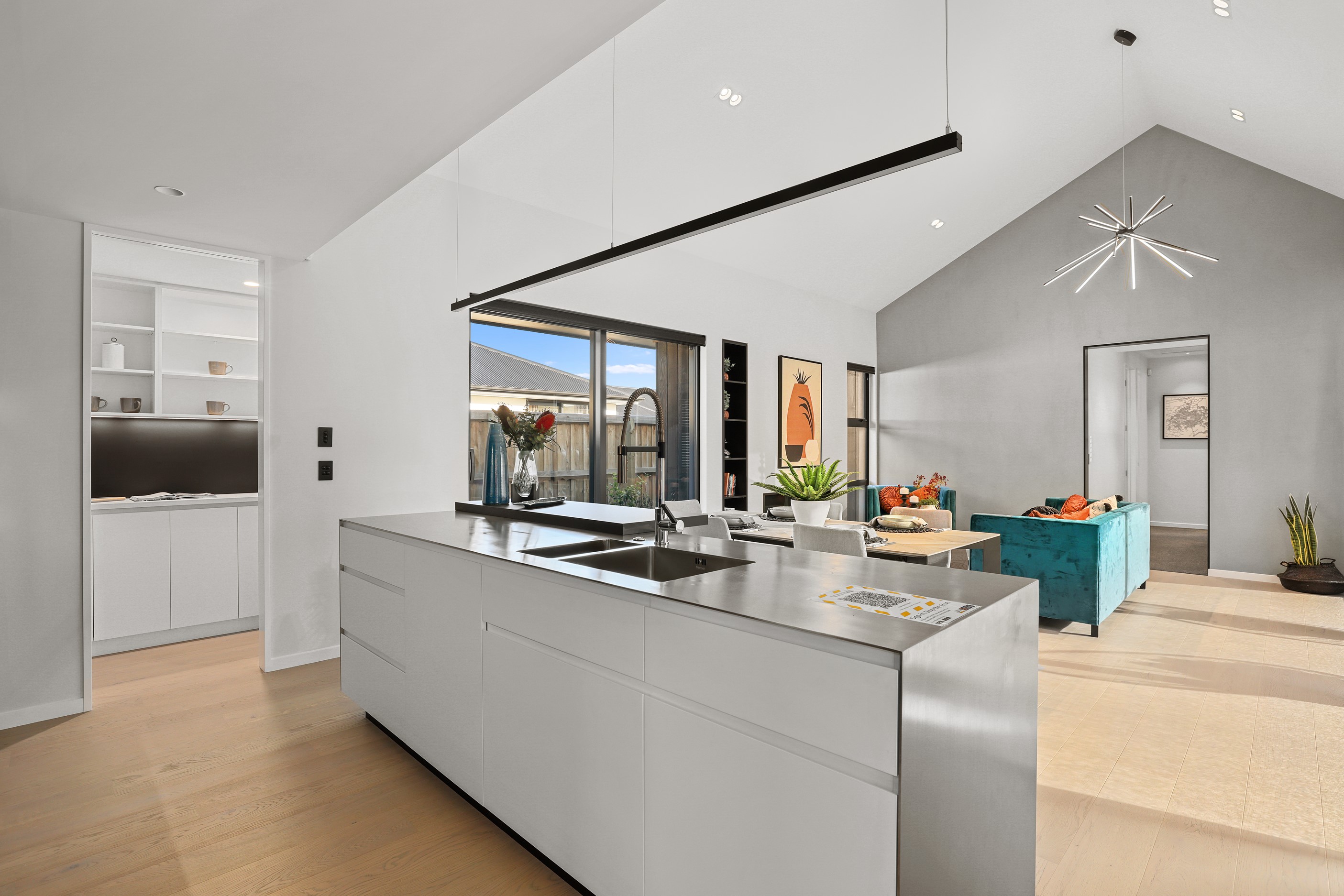 Pavilion-style houses usually have a strong connection to the outdoors, and this architecturally designed U-shaped show home is no different. The living room has sliders on both sides, the family space has a vaulted cathedral ceiling and the whole house has a 2.7m stud, all of which enhance the open, light feel. The living and family zones and main bedroom open two bathrooms and two living areas, there is much to be enjoyed in the 188sqm footprint. There's also a double garage, study with floating shelves and main bedroom with ensuite and walk-in wardrobe. A neutral palette of steel, concrete, cedar and plaster is a lesson in how to create a harmonious aesthetic using different cladding. In the kitchen, black and white cabinets, mitred joinery and a stainless steel-wrapped island produce a sleek look. A recessed area encased in stainless steel makes an eye-catching feature, and specialist lighting also draws the eye. Clever design combined with quality craftsmanship result in a stunning show home packed with personality.
