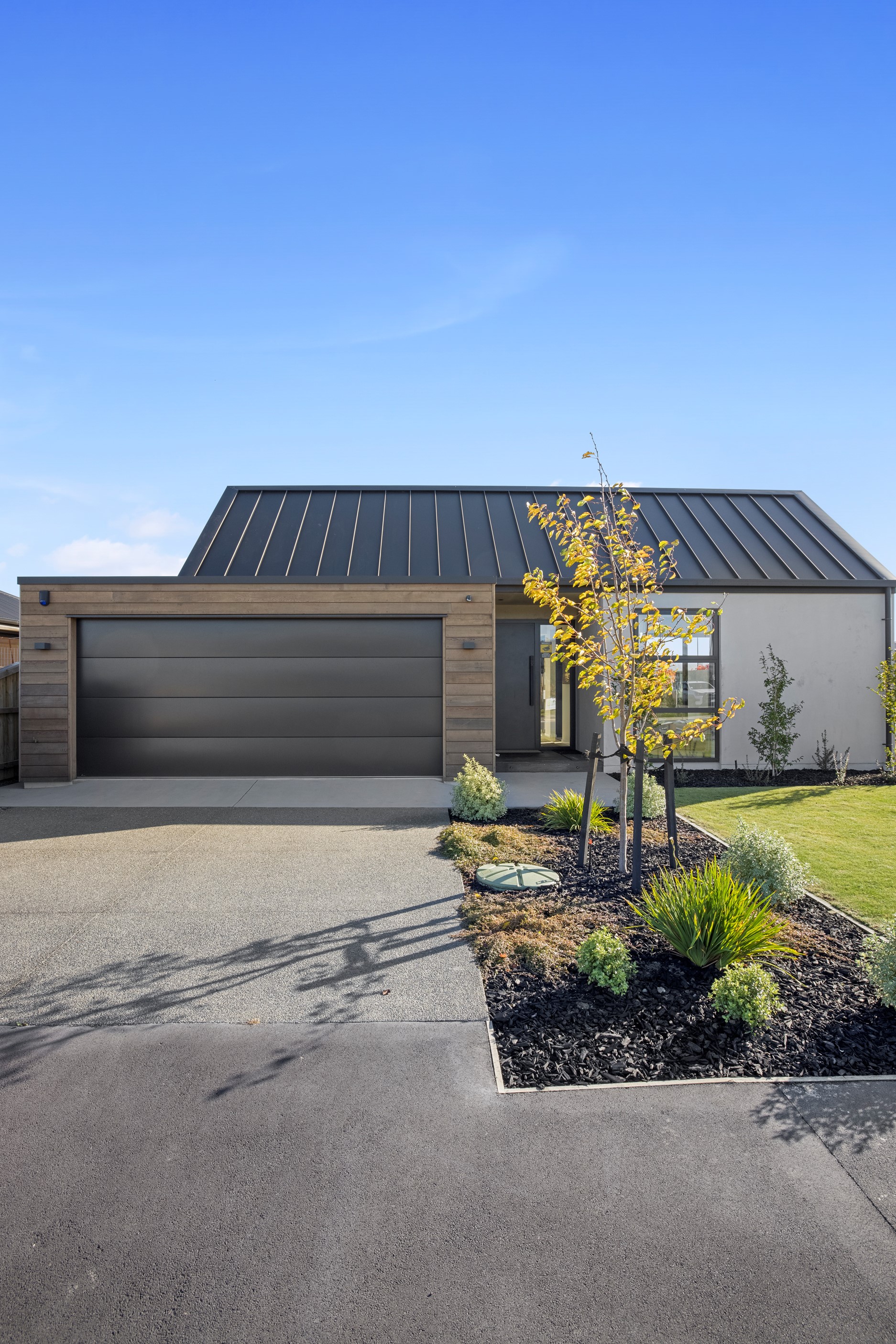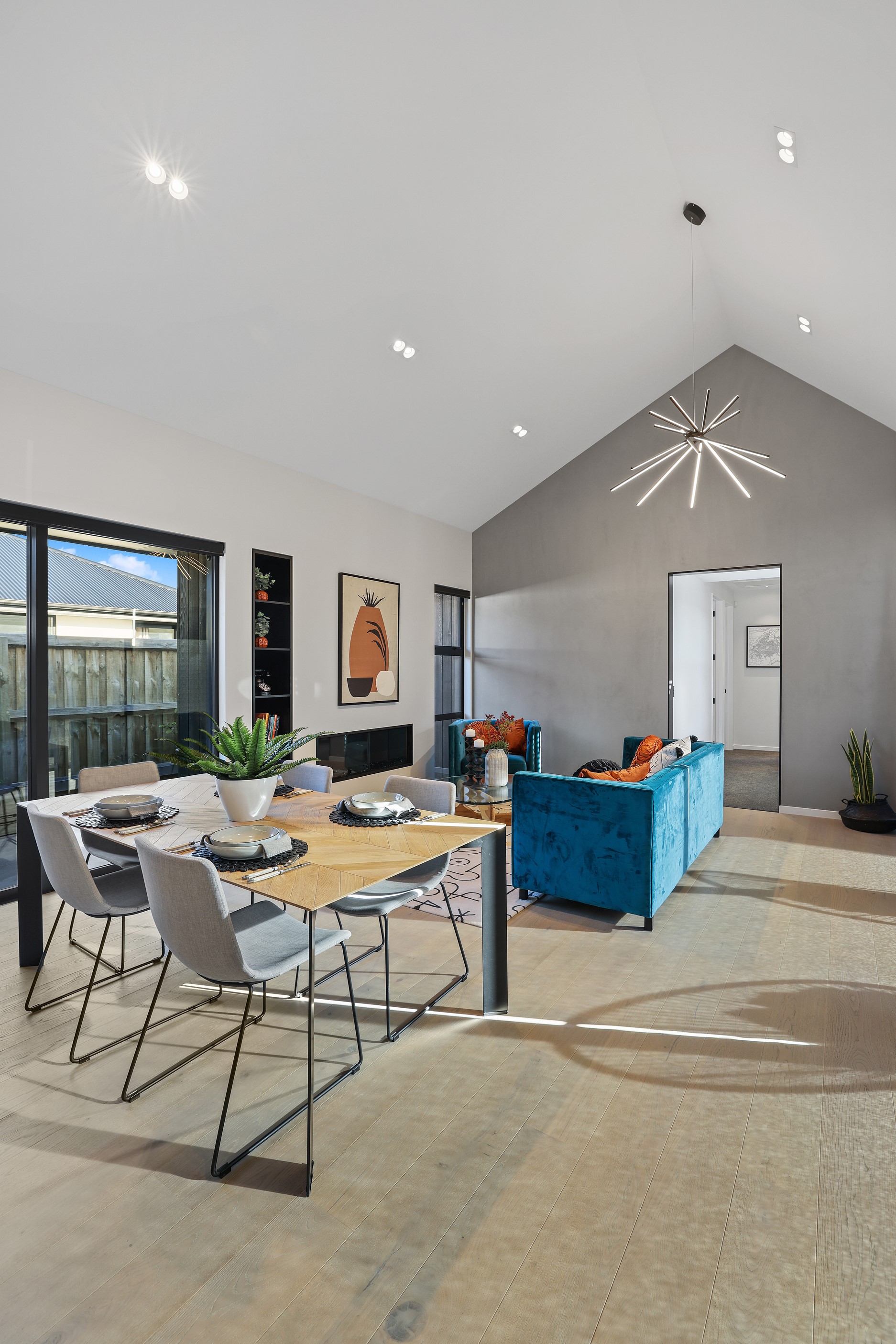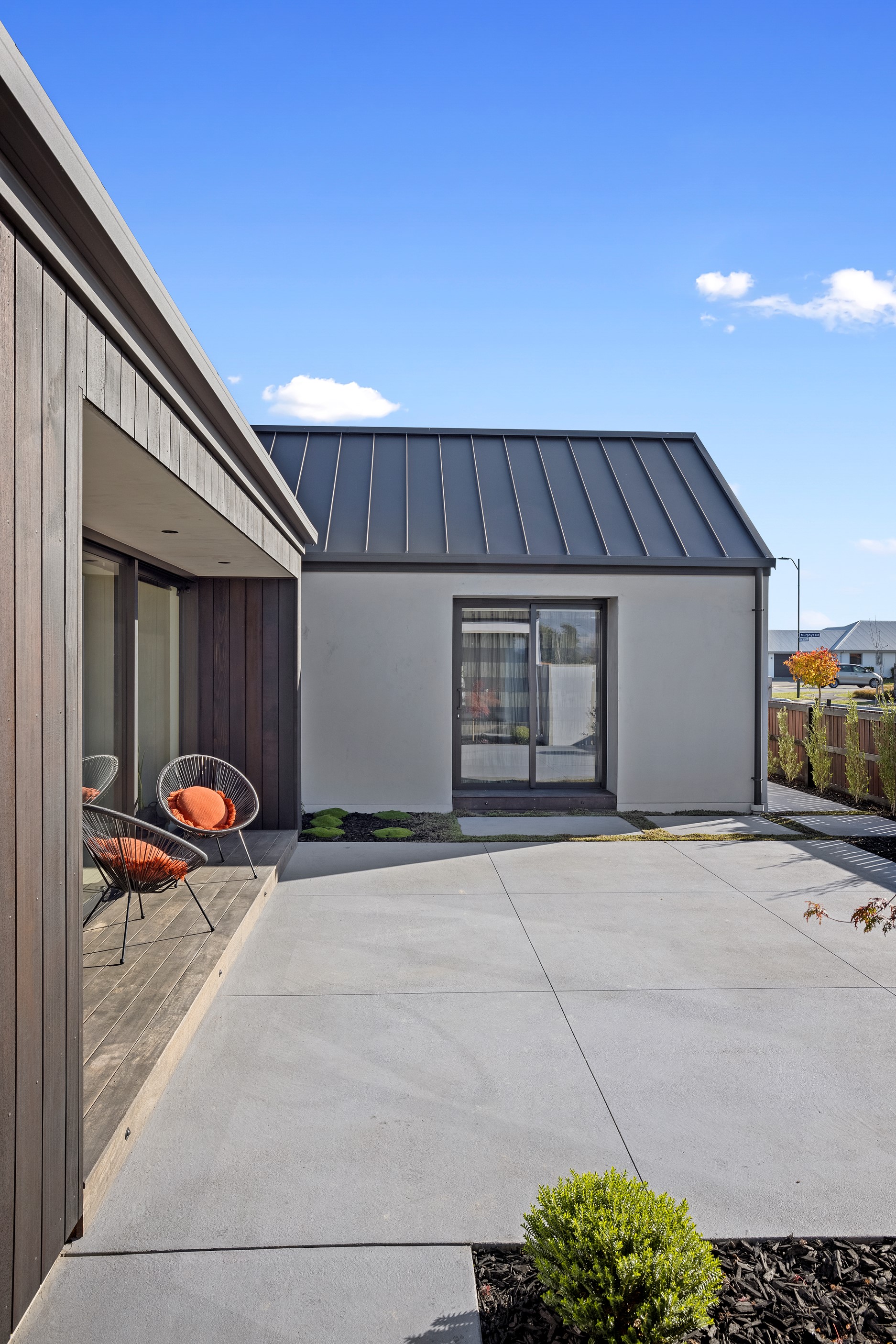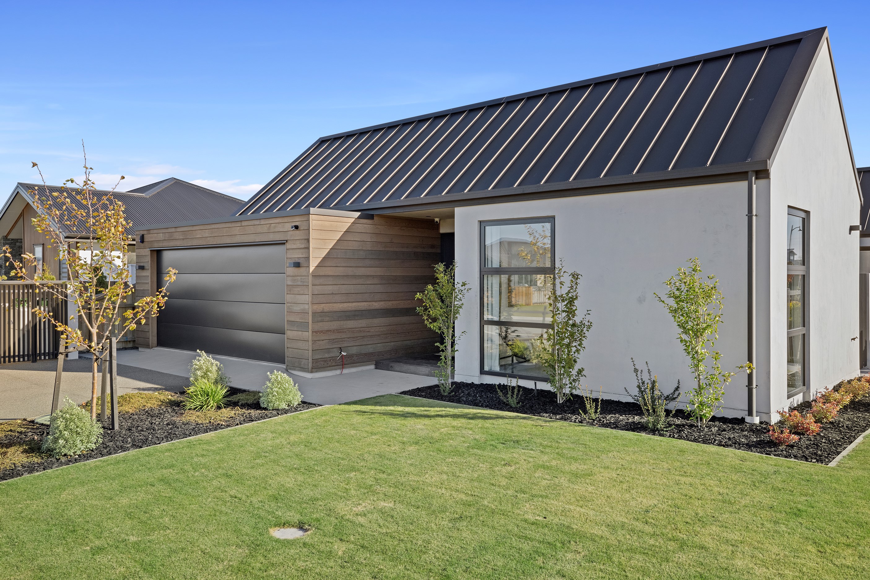 Pavilion-style houses usually have a strong connection to the outdoors, and this architecturally designed U-shaped show home is no different. The living room has sliders on both sides, the family space has a vaulted cathedral ceiling and the whole house has a 2.7m stud, all of which enhance the open, light feel. The living and family zones and main bedroom open two bathrooms and two living areas, there is much to be enjoyed in the 188sqm footprint. There's also a double garage, study with floating shelves and main bedroom with ensuite and walk-in wardrobe. A neutral palette of steel, concrete, cedar and plaster is a lesson in how to create a harmonious aesthetic using different cladding. In the kitchen, black and white cabinets, mitred joinery and a stainless steel-wrapped island produce a sleek look. A recessed area encased in stainless steel makes an eye-catching feature, and specialist lighting also draws the eye. Clever design combined with quality craftsmanship result in a stunning show home packed with personality.
