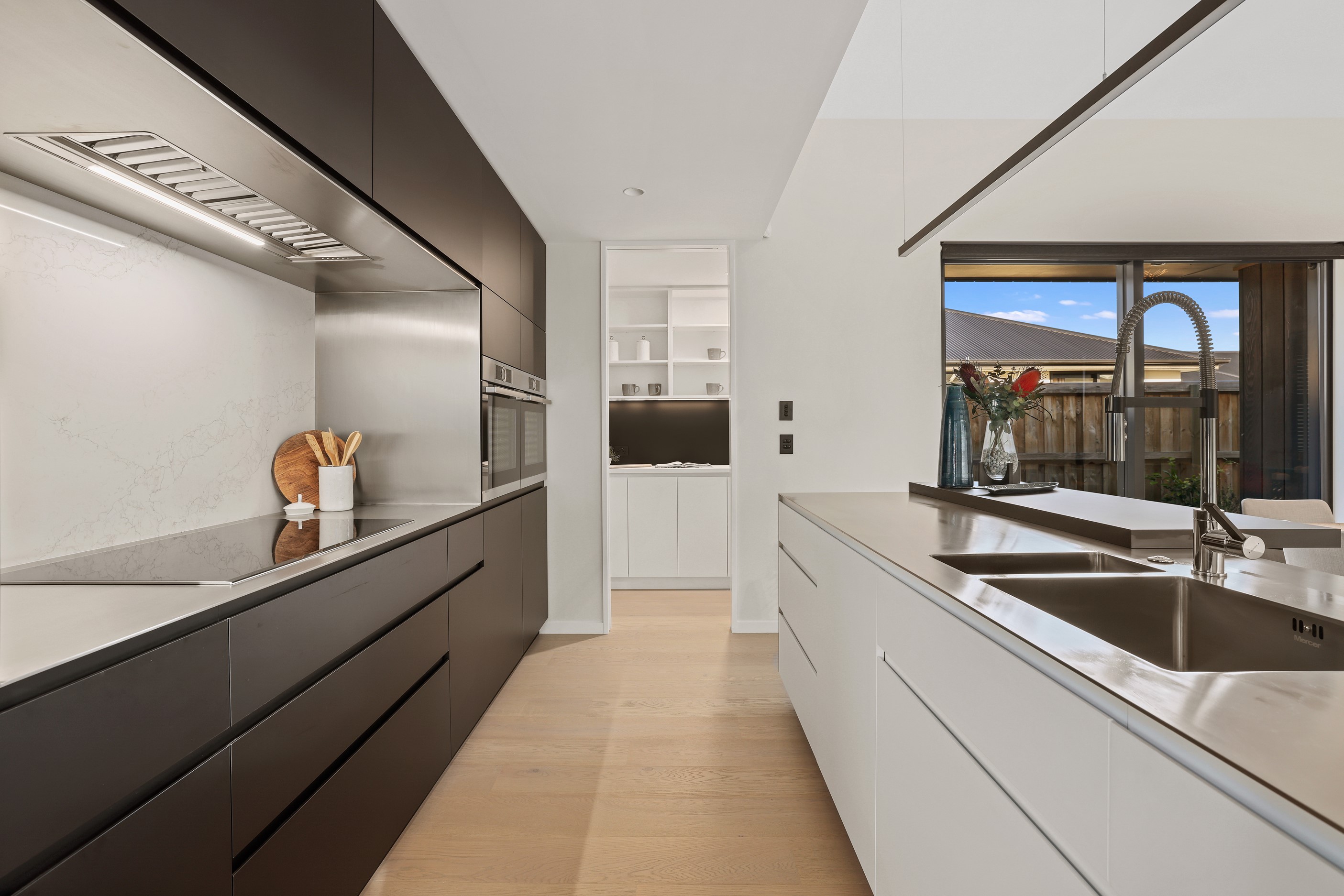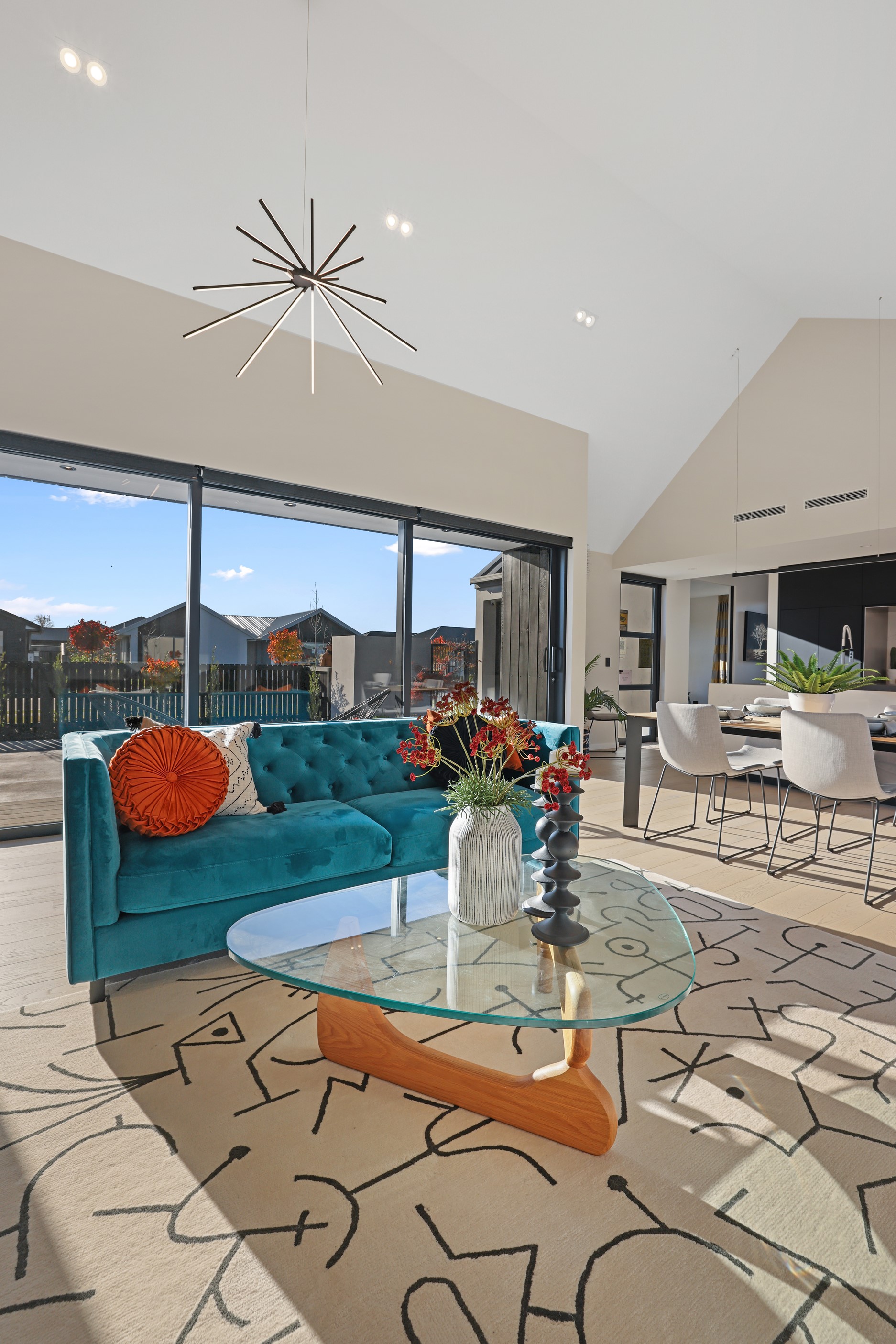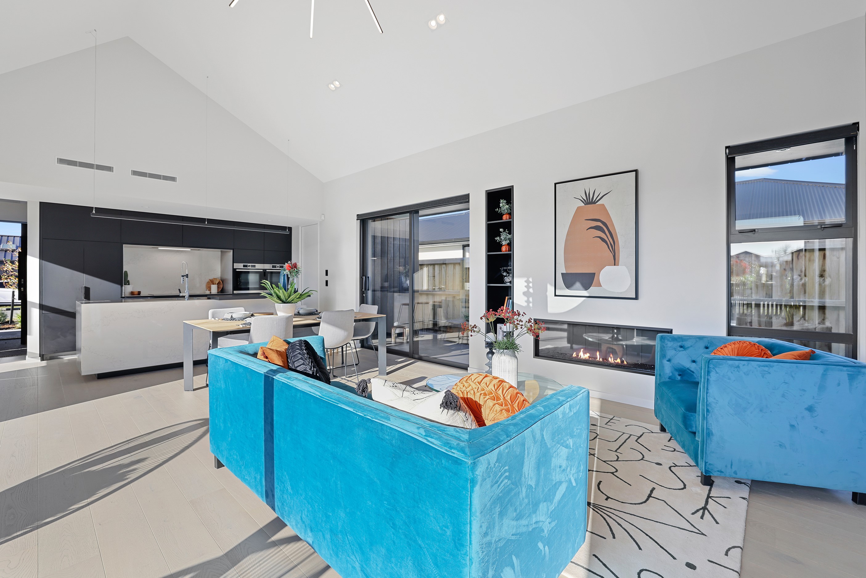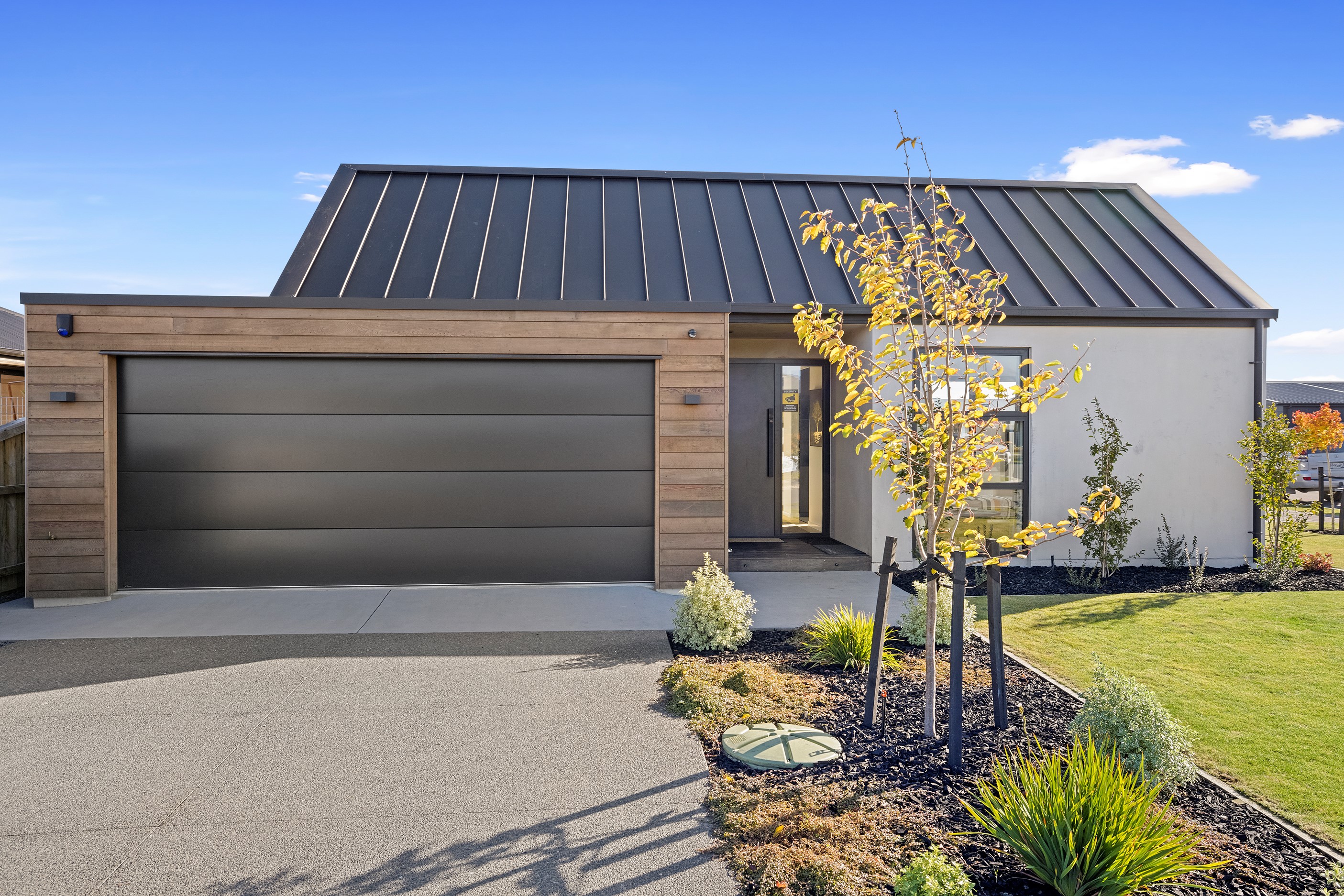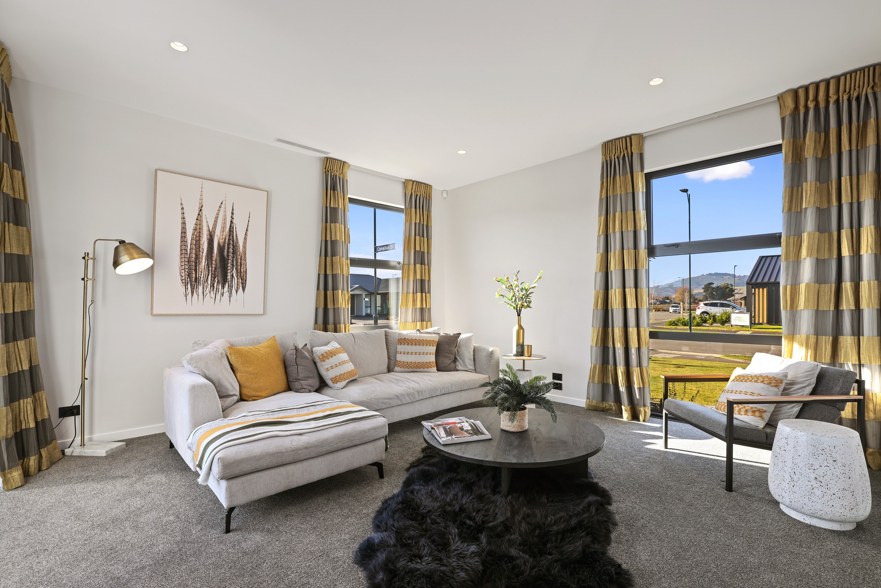 Pavilion-style houses usually have a strong connection to the outdoors, and this architecturally designed U-shaped show home is no different. The living room has sliders on both sides, the family space has a vaulted cathedral ceiling and the whole house has a 2.7m stud, all of which enhance the open, light feel. The living and family zones and main bedroom open two bathrooms and two living areas, there is much to be enjoyed in the 188sqm footprint. There's also a double garage, study with floating shelves and main bedroom with ensuite and walk-in wardrobe. A neutral palette of steel, concrete, cedar and plaster is a lesson in how to create a harmonious aesthetic using different cladding. In the kitchen, black and white cabinets, mitred joinery and a stainless steel-wrapped island produce a sleek look. A recessed area encased in stainless steel makes an eye-catching feature, and specialist lighting also draws the eye. Clever design combined with quality craftsmanship result in a stunning show home packed with personality.