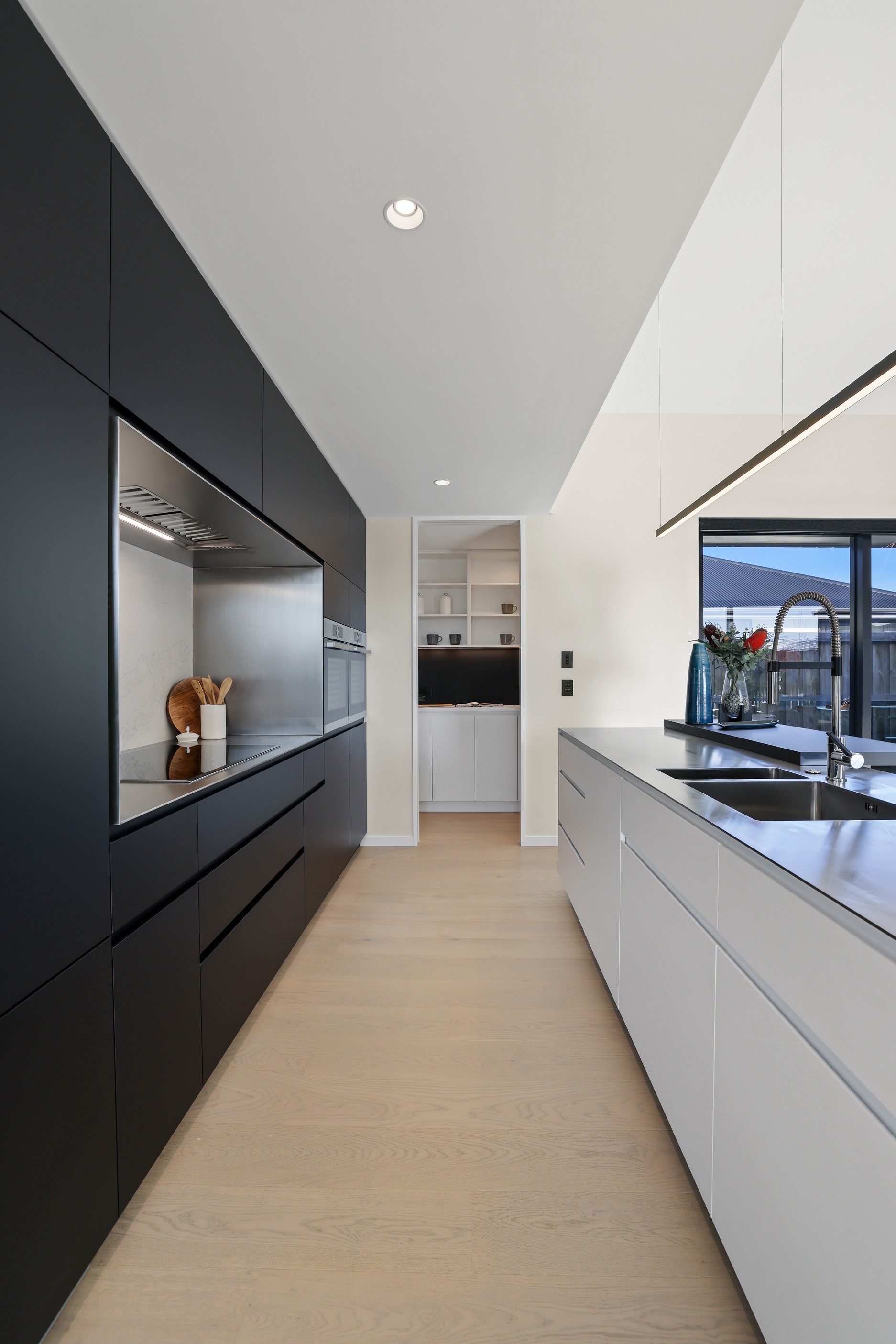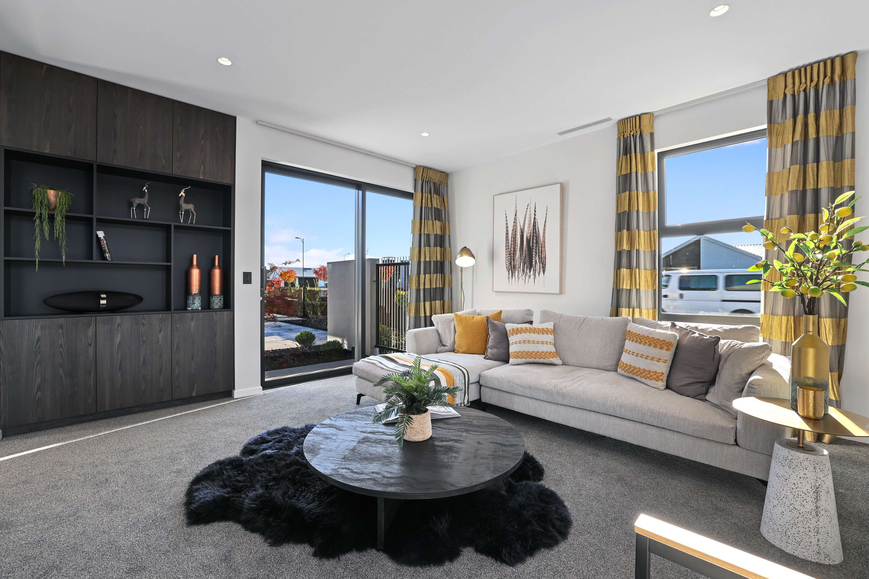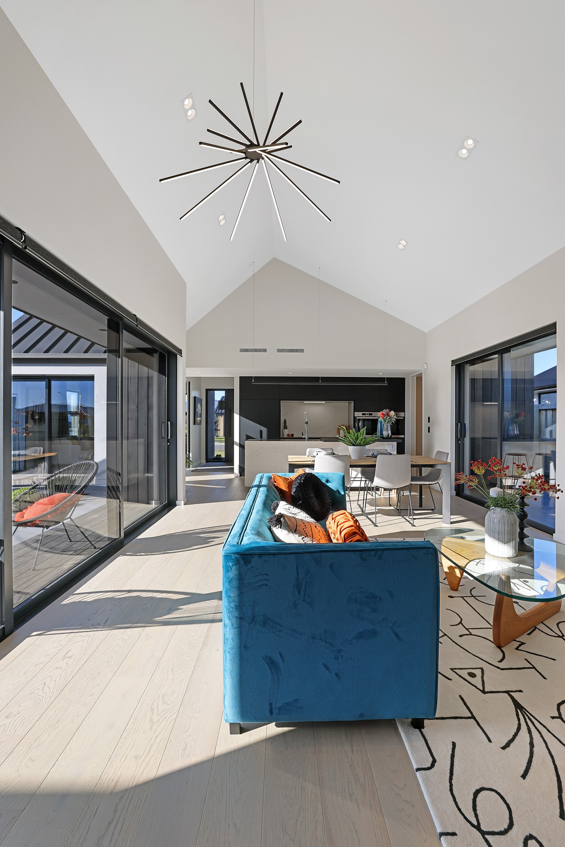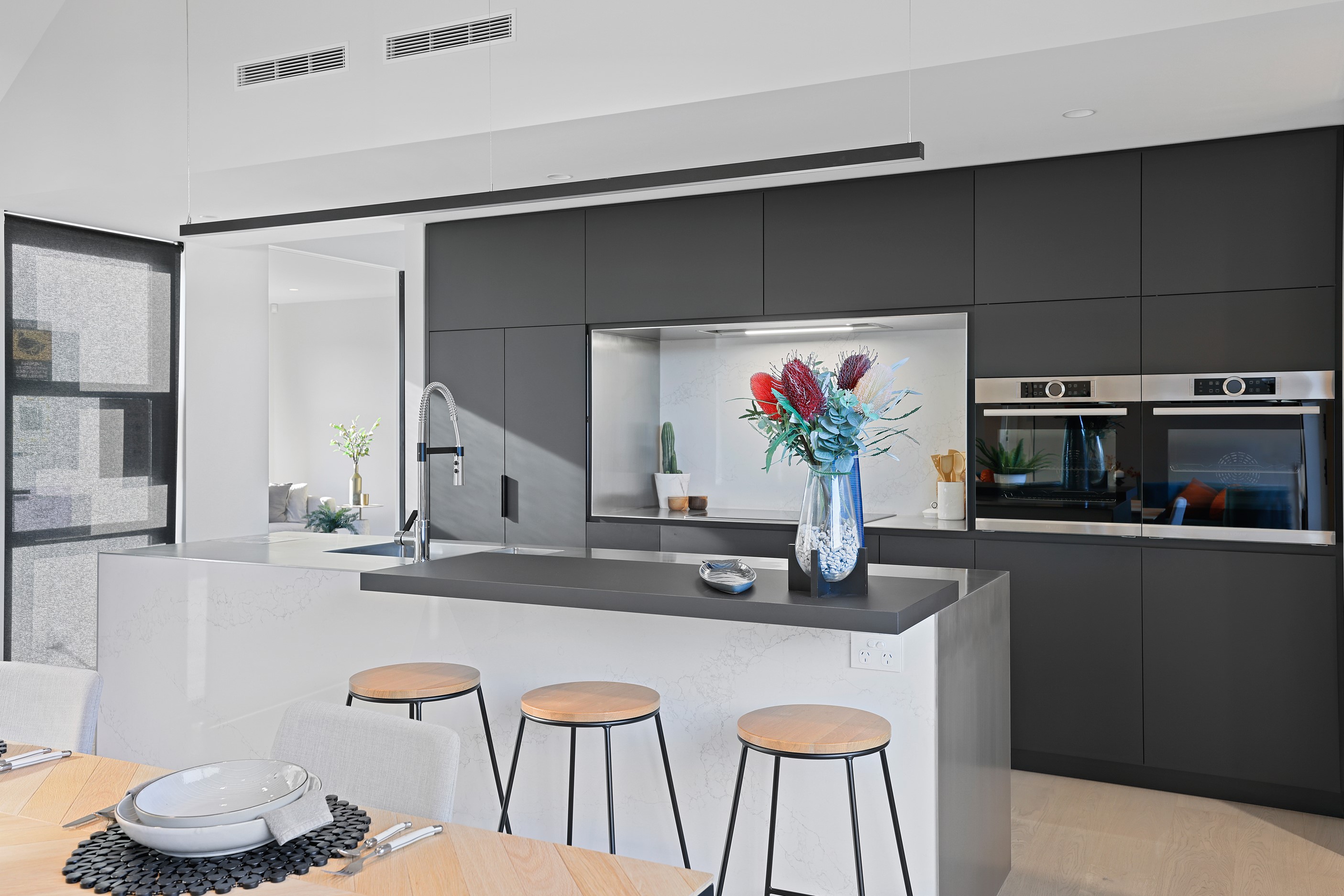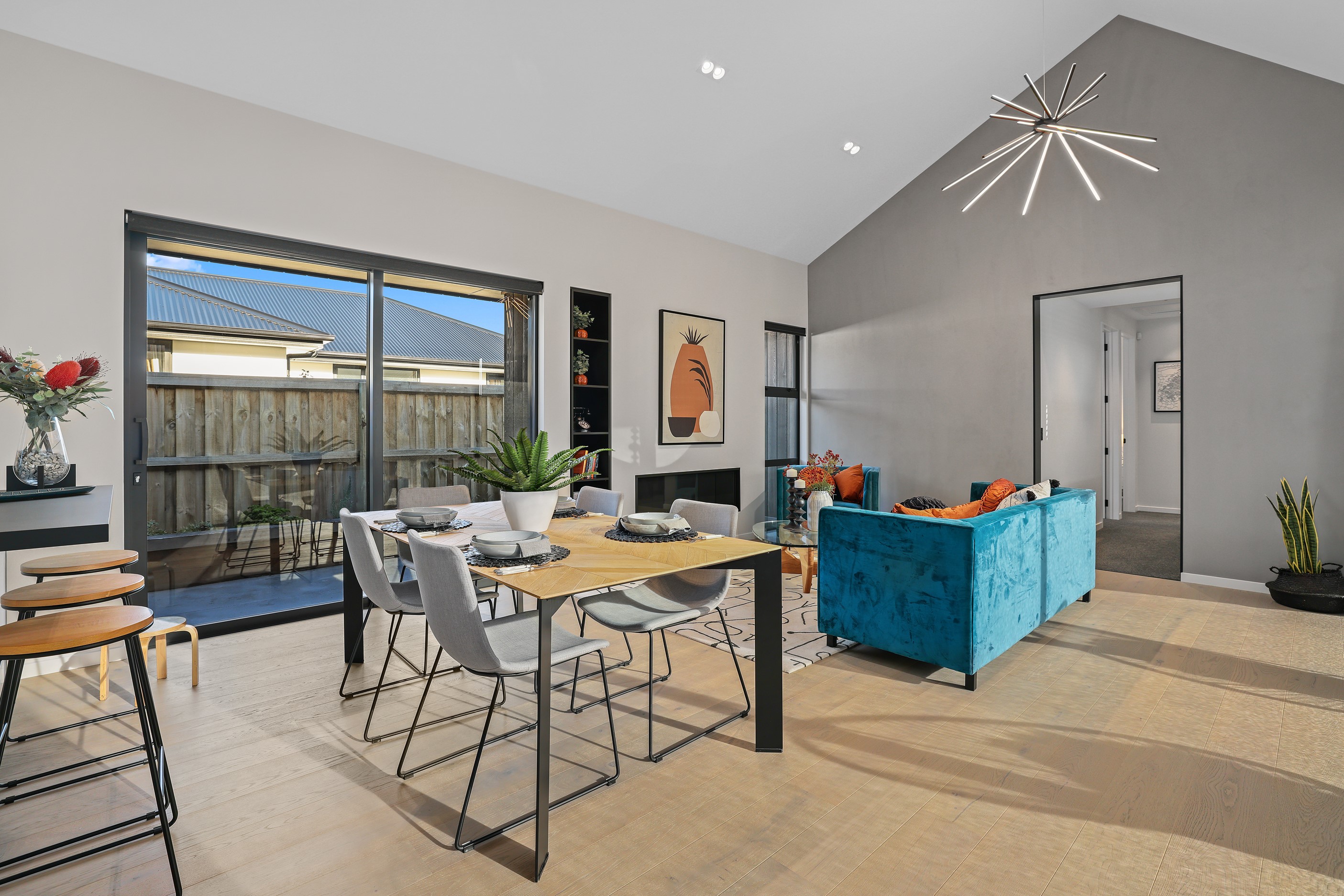 Pavilion-style houses usually have a strong connection to the outdoors, and this architecturally designed U-shaped show home is no different. The living room has sliders on both sides, the family space has a vaulted cathedral ceiling and the whole house has a 2.7m stud, all of which enhance the open, light feel. The living and family zones and main bedroom open two bathrooms and two living areas, there is much to be enjoyed in the 188sqm footprint. There's also a double garage, study with floating shelves and main bedroom with ensuite and walk-in wardrobe. A neutral palette of steel, concrete, cedar and plaster is a lesson in how to create a harmonious aesthetic using different cladding. In the kitchen, black and white cabinets, mitred joinery and a stainless steel-wrapped island produce a sleek look. A recessed area encased in stainless steel makes an eye-catching feature, and specialist lighting also draws the eye. Clever design combined with quality craftsmanship result in a stunning show home packed with personality.