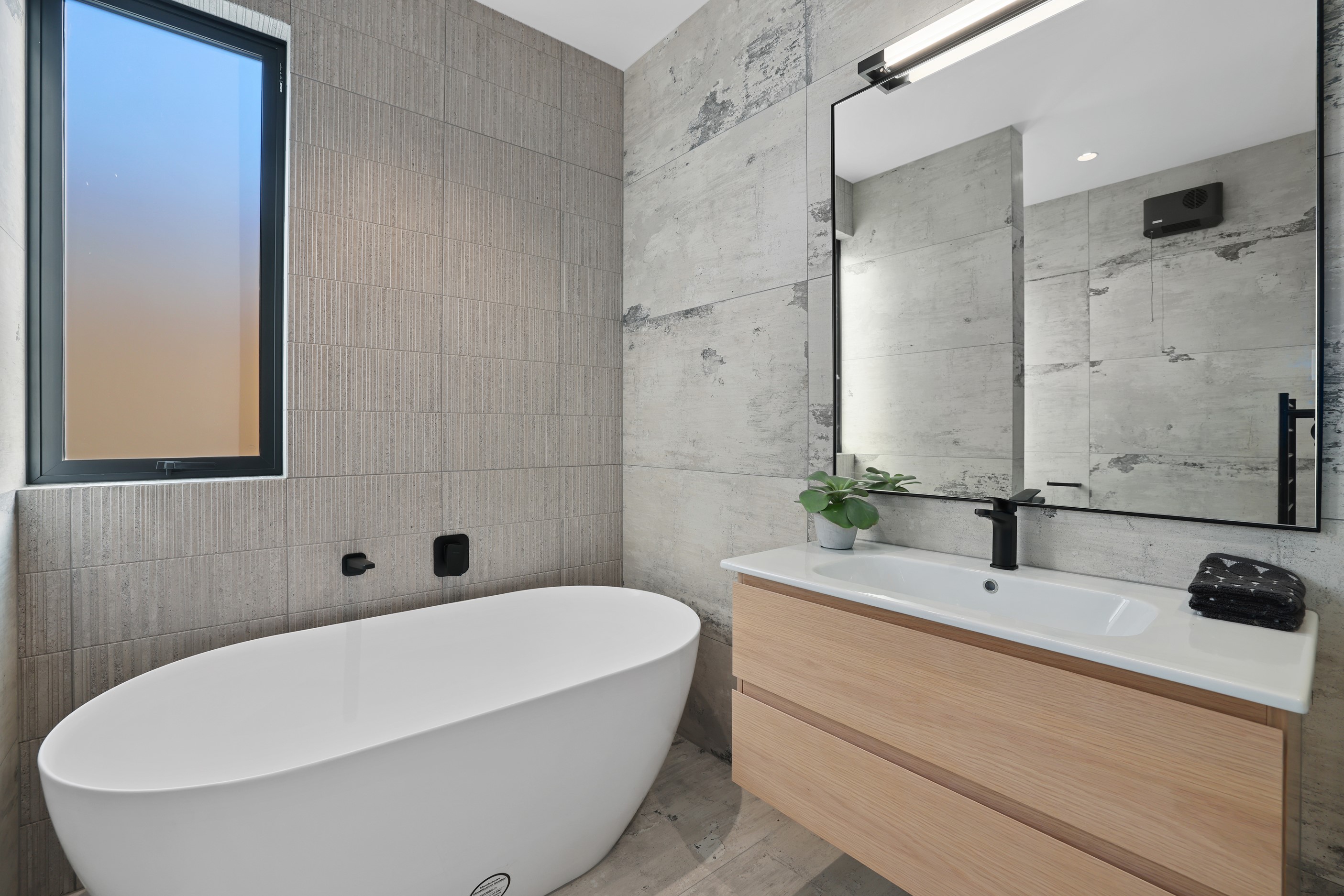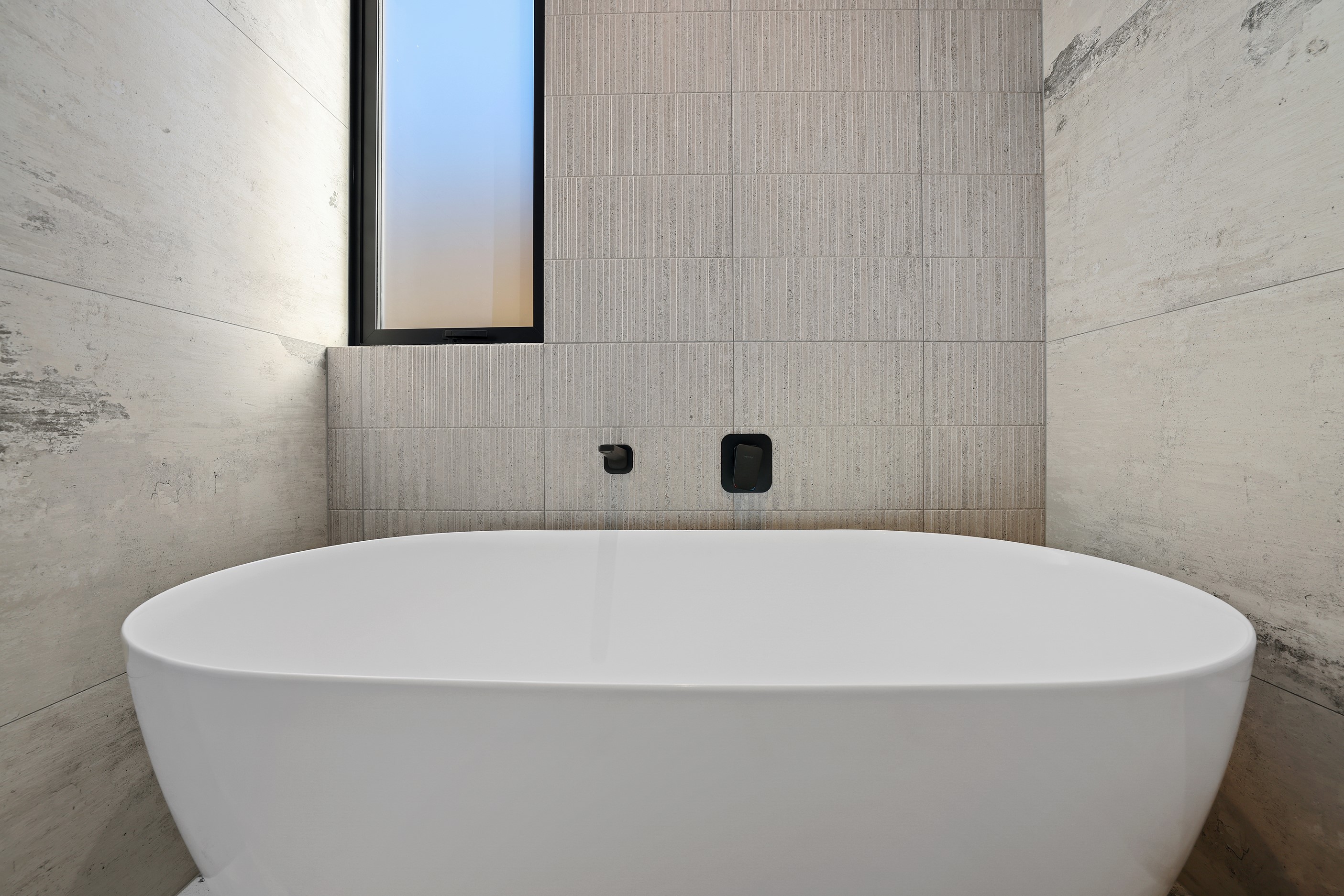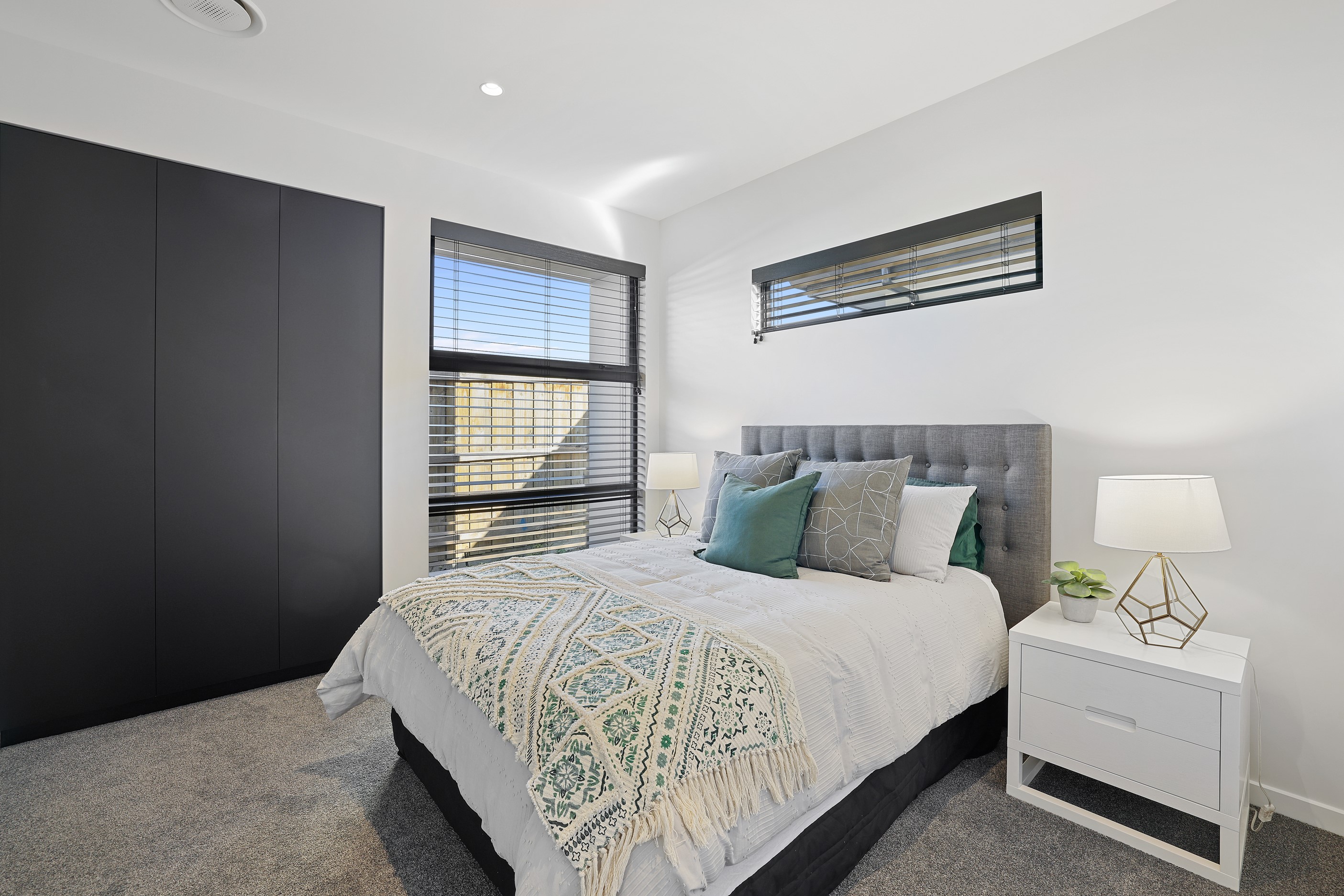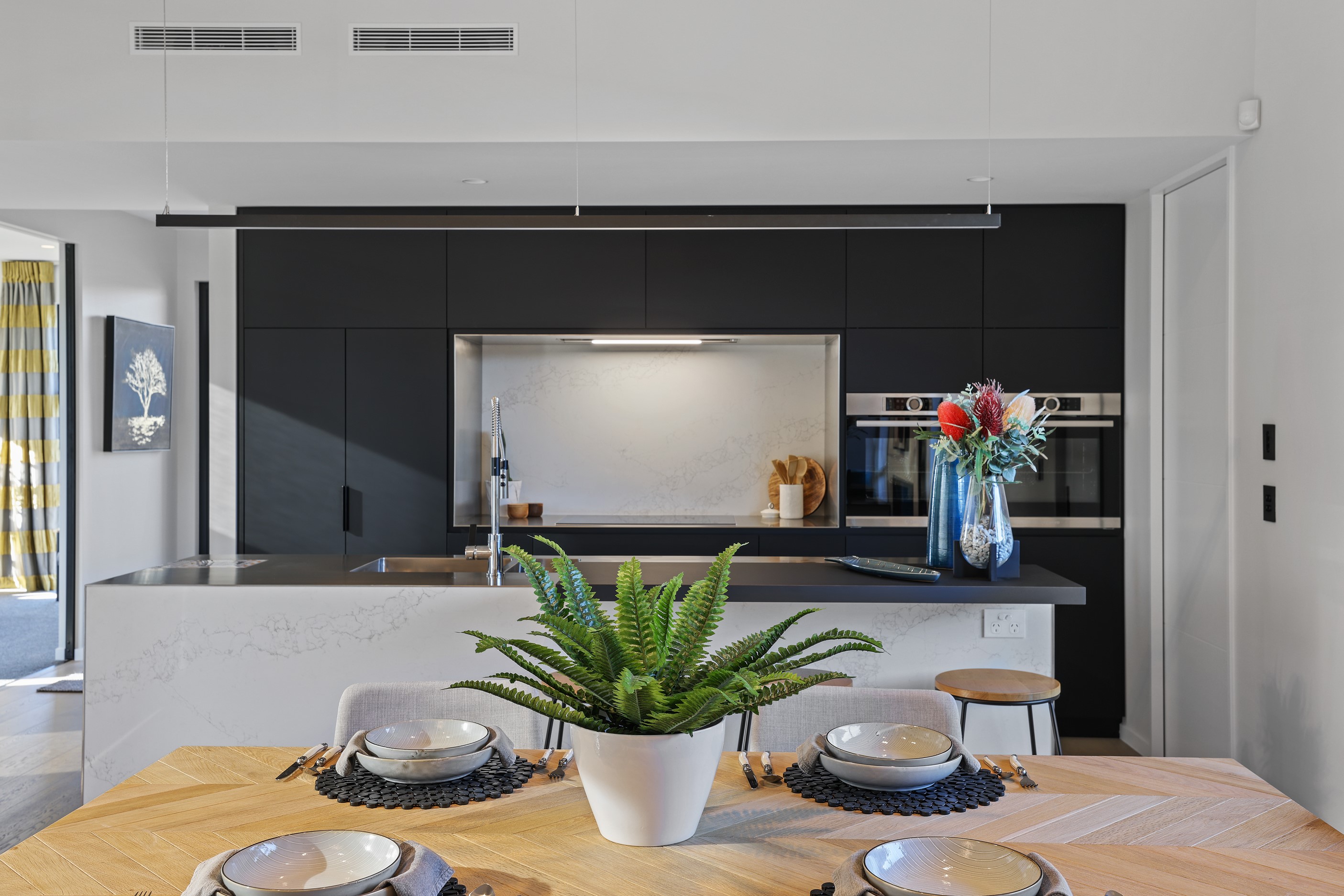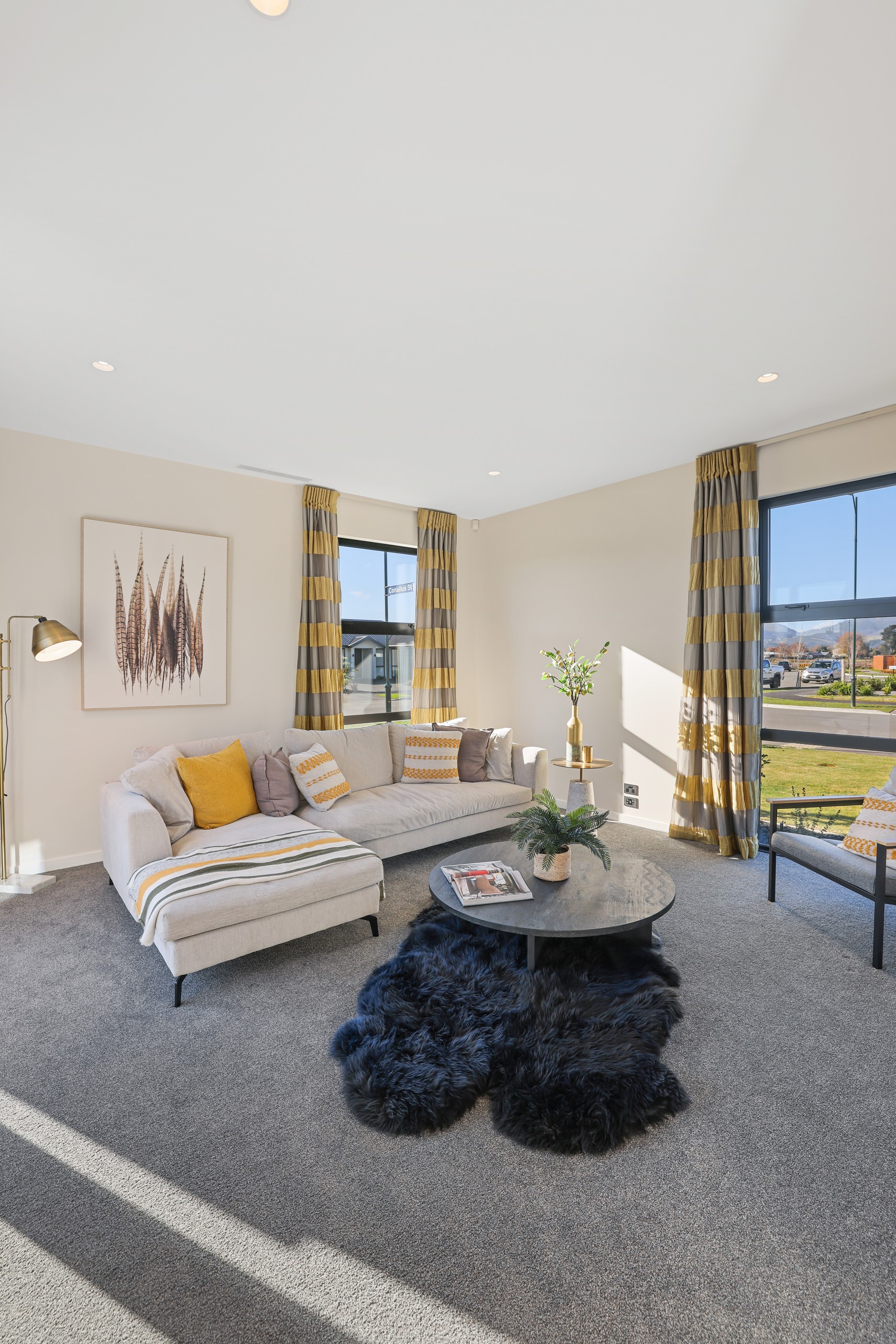 Pavilion-style houses usually have a strong connection to the outdoors, and this architecturally designed U-shaped show home is no different. The living room has sliders on both sides, the family space has a vaulted cathedral ceiling and the whole house has a 2.7m stud, all of which enhance the open, light feel. The living and family zones and main bedroom open two bathrooms and two living areas, there is much to be enjoyed in the 188sqm footprint. There's also a double garage, study with floating shelves and main bedroom with ensuite and walk-in wardrobe. A neutral palette of steel, concrete, cedar and plaster is a lesson in how to create a harmonious aesthetic using different cladding. In the kitchen, black and white cabinets, mitred joinery and a stainless steel-wrapped island produce a sleek look. A recessed area encased in stainless steel makes an eye-catching feature, and specialist lighting also draws the eye. Clever design combined with quality craftsmanship result in a stunning show home packed with personality.