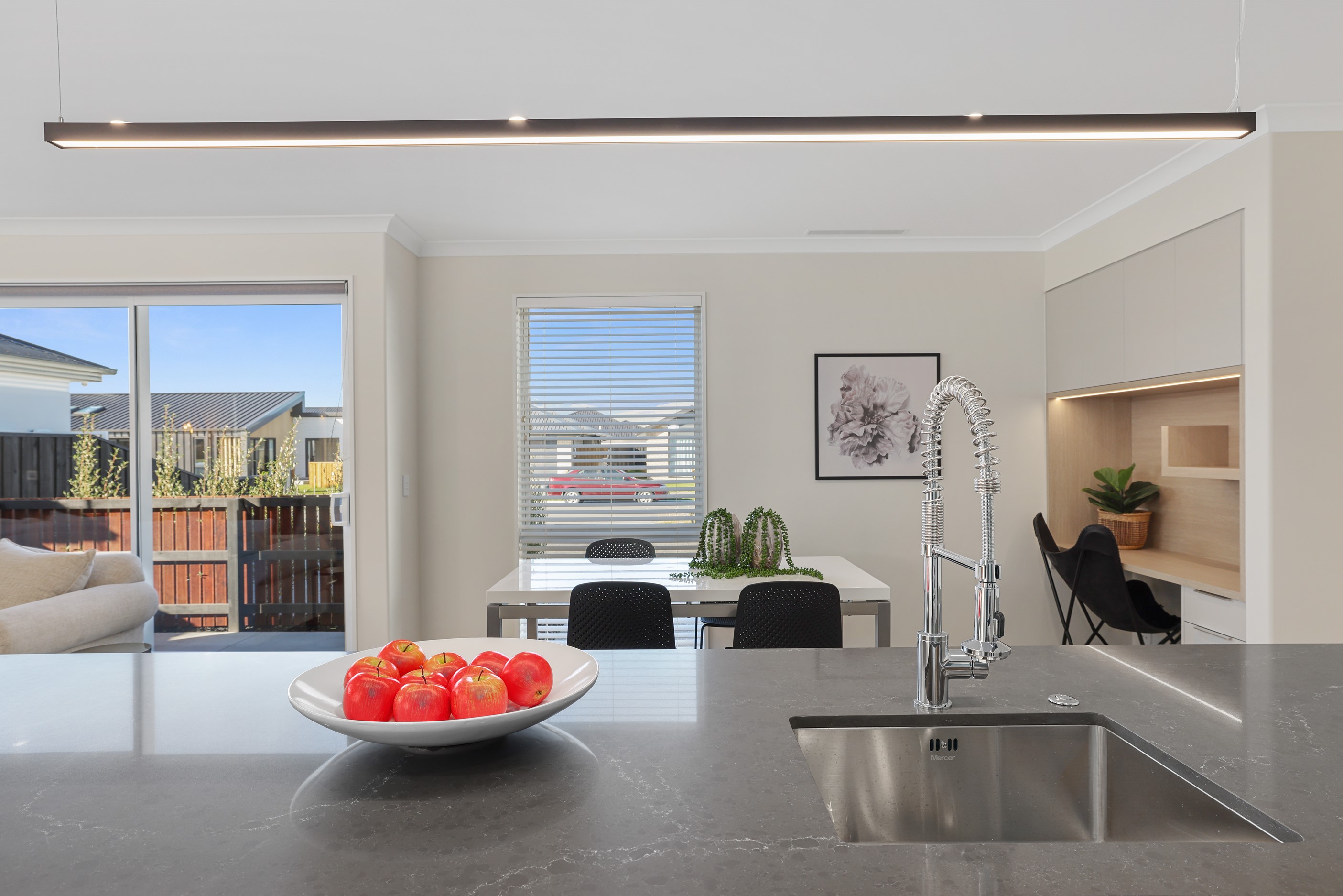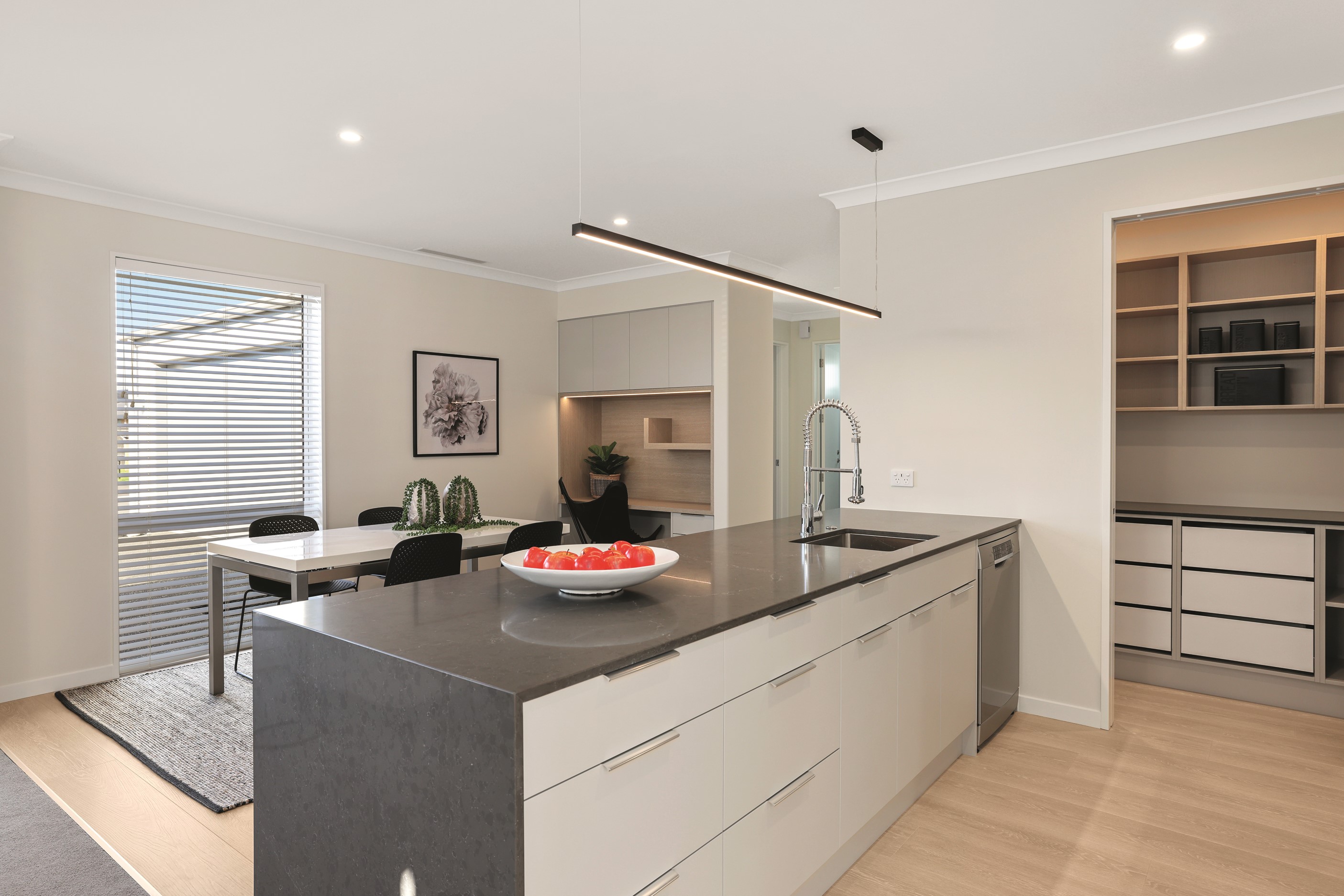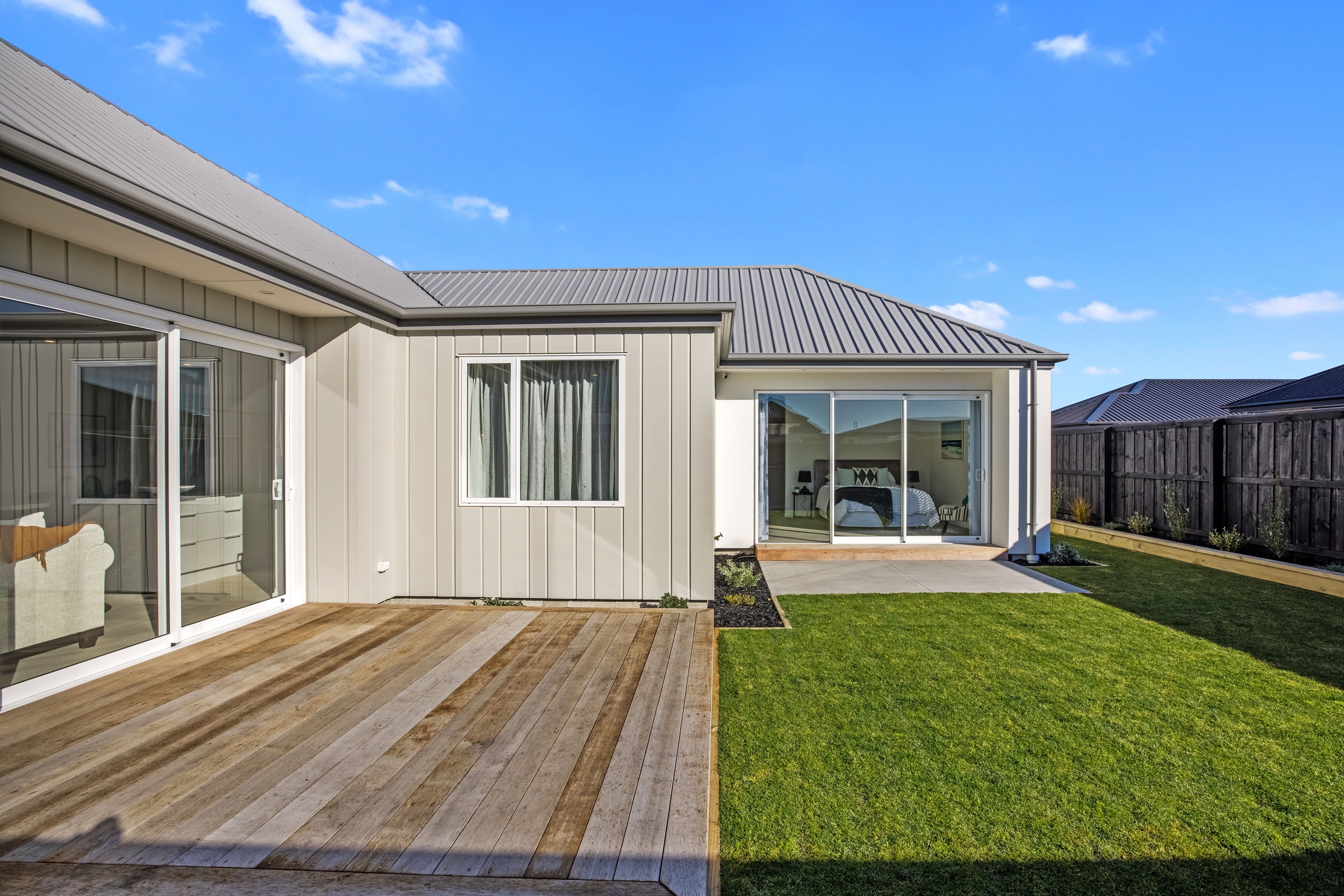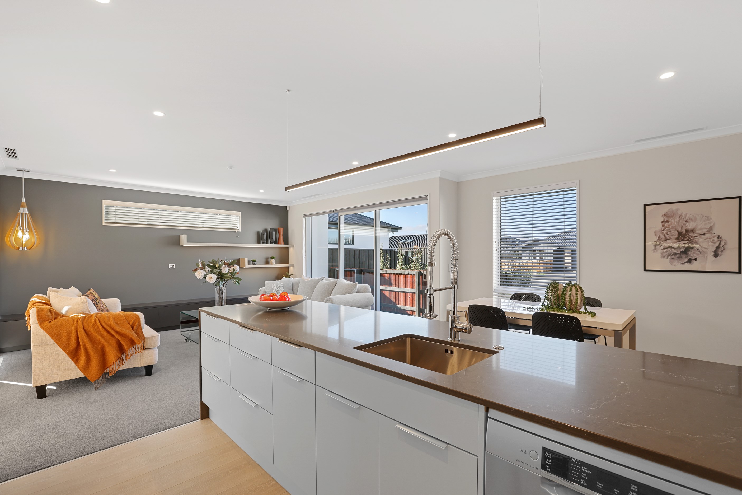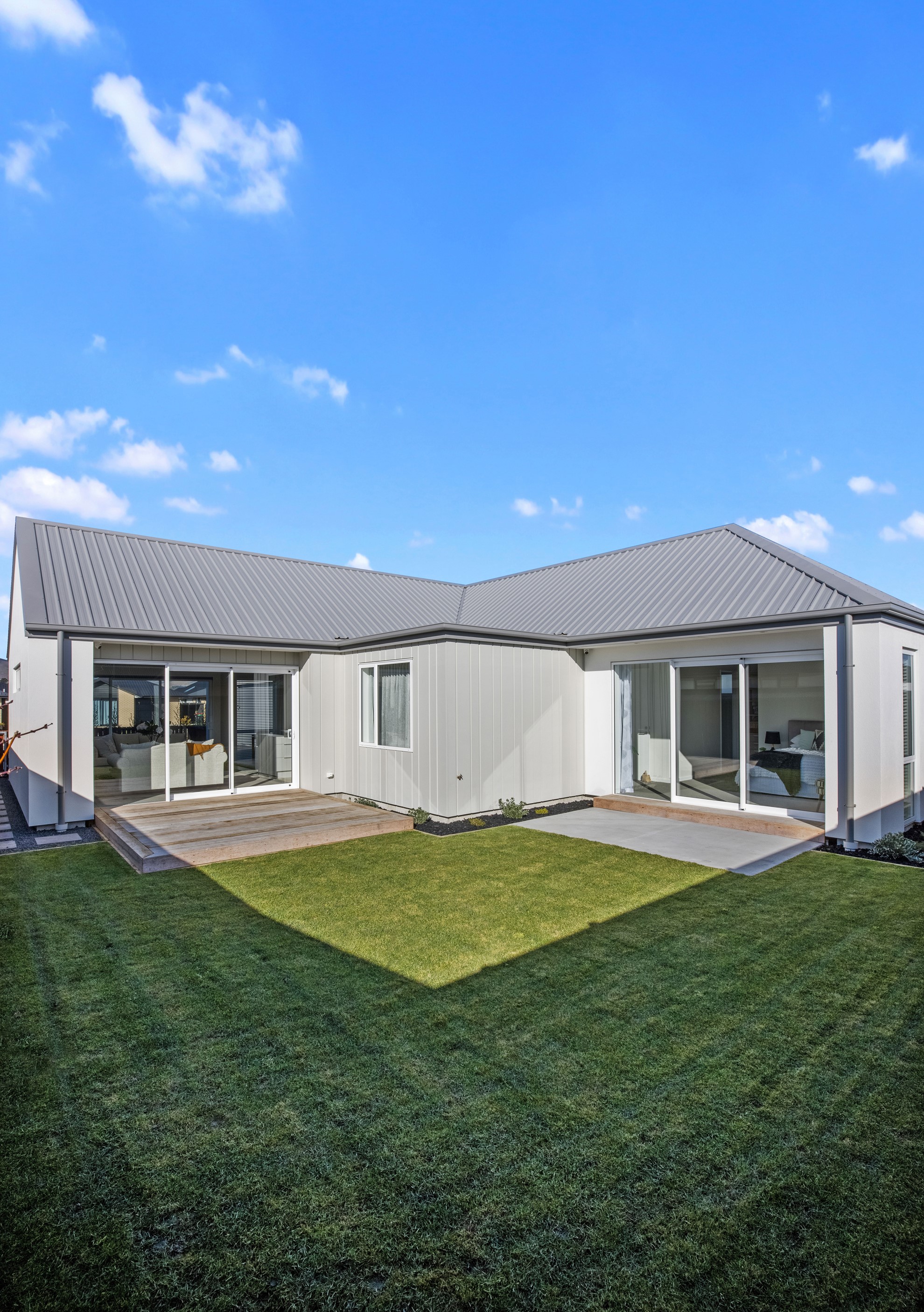 Traditional style meets modern comfort in this three-bedroom home. Living spaces merge naturally and then flow out to decks and patios. The main living space has them on either side – one for your morning coffee and the other for relaxing in the evening. You can move as sunshine and wind conditions change. What could be better? The main bedroom also has a patio. Two elegant tiled bathrooms provide everyday luxury and the well-designed kitchen, with scullery, is a dream for entertainers. The long island bench with seating is just the place to congregate with friends and family, or to chat with the chef. You’ll also find a separate laundry, garage, and main bedroom with ensuite and walk-in wardrobe. But the 170sqm property is much more than a smart, well-designed home – there are personal touches throughout. Stylised floating shelves and painted features – a green front door, an intense blue base to the kitchen island and blue-grey feature walls – bring personality to this property. Handsome in Linea Oblique weatherboard and plaster cladding, this home is designed for family life, and it shows.