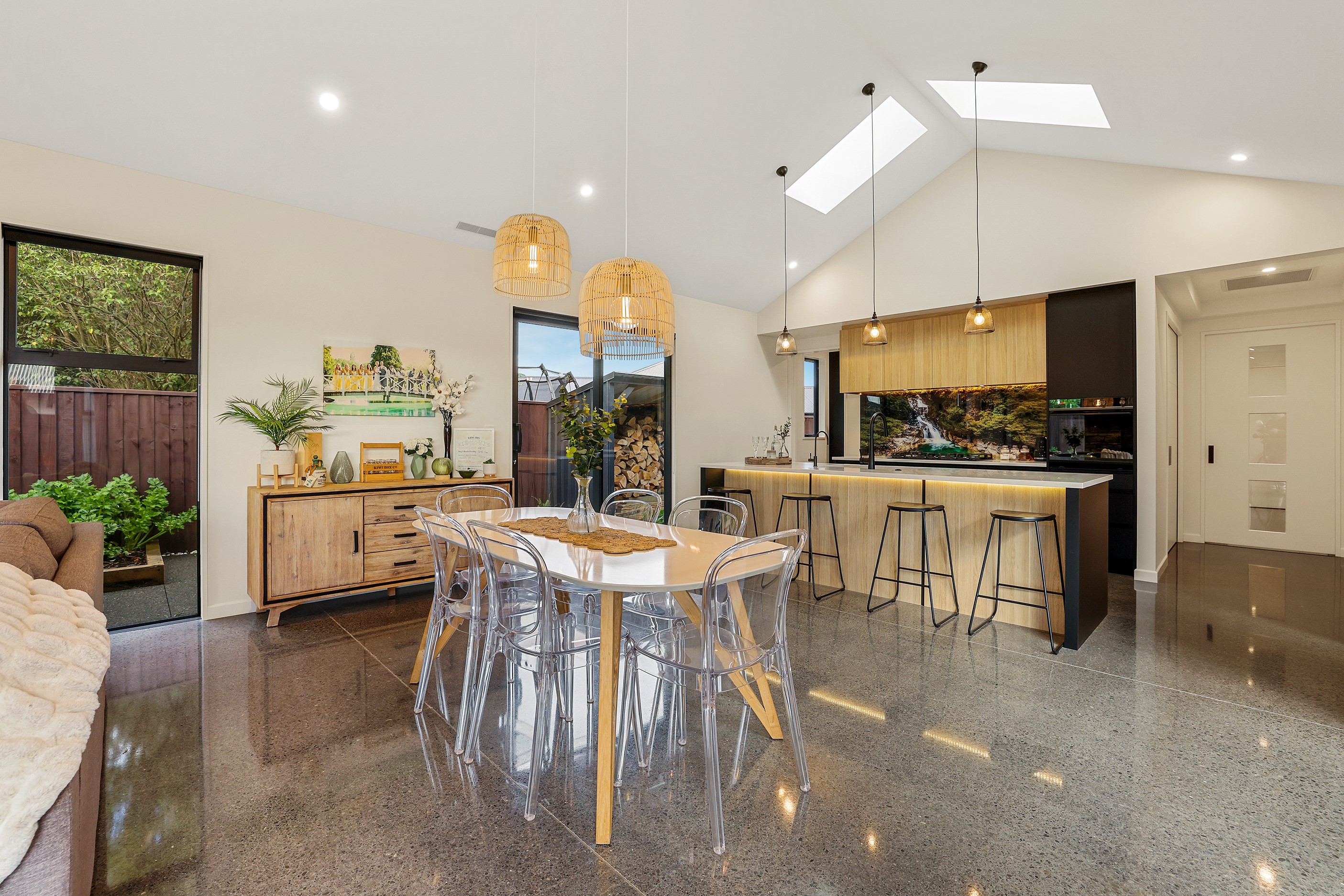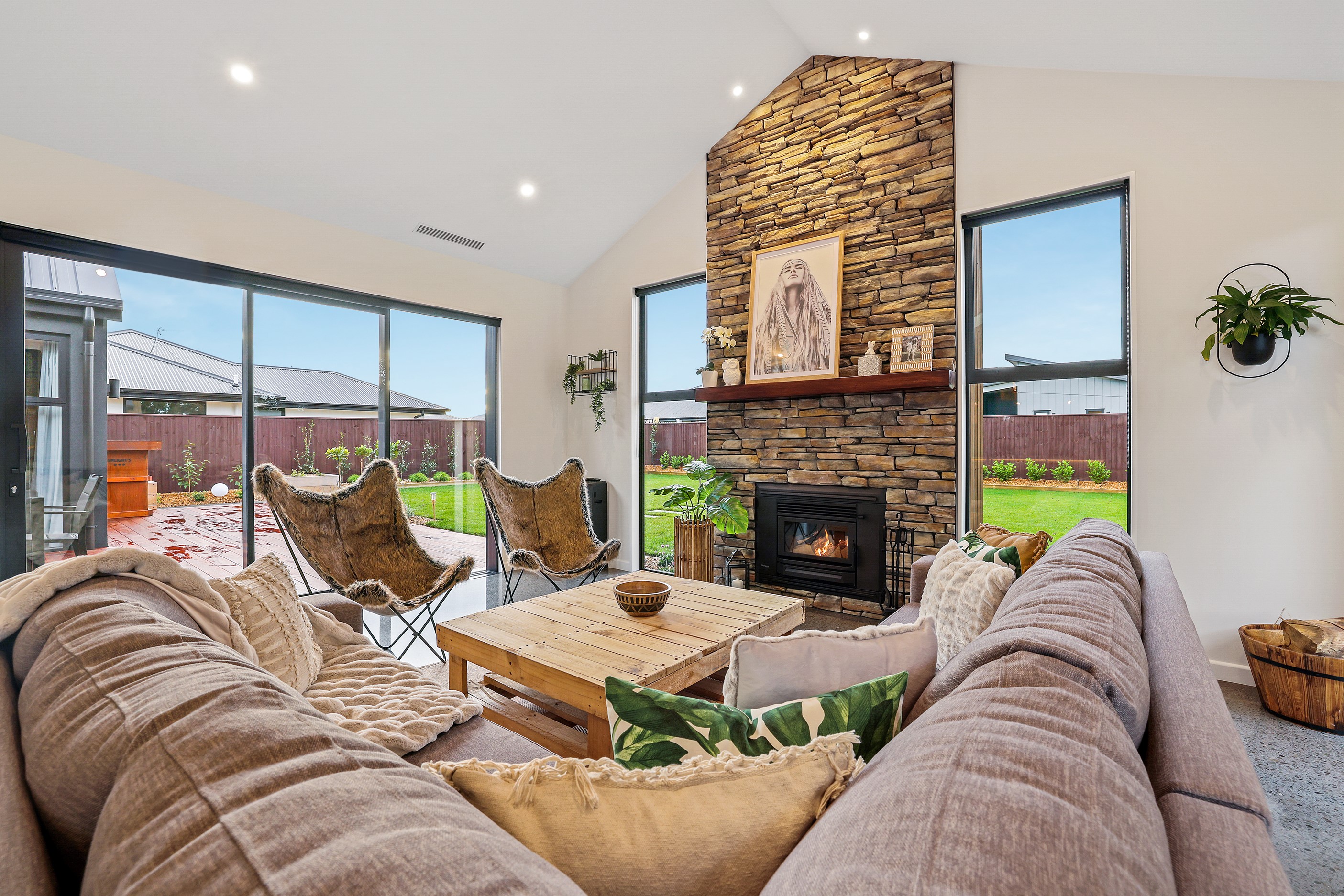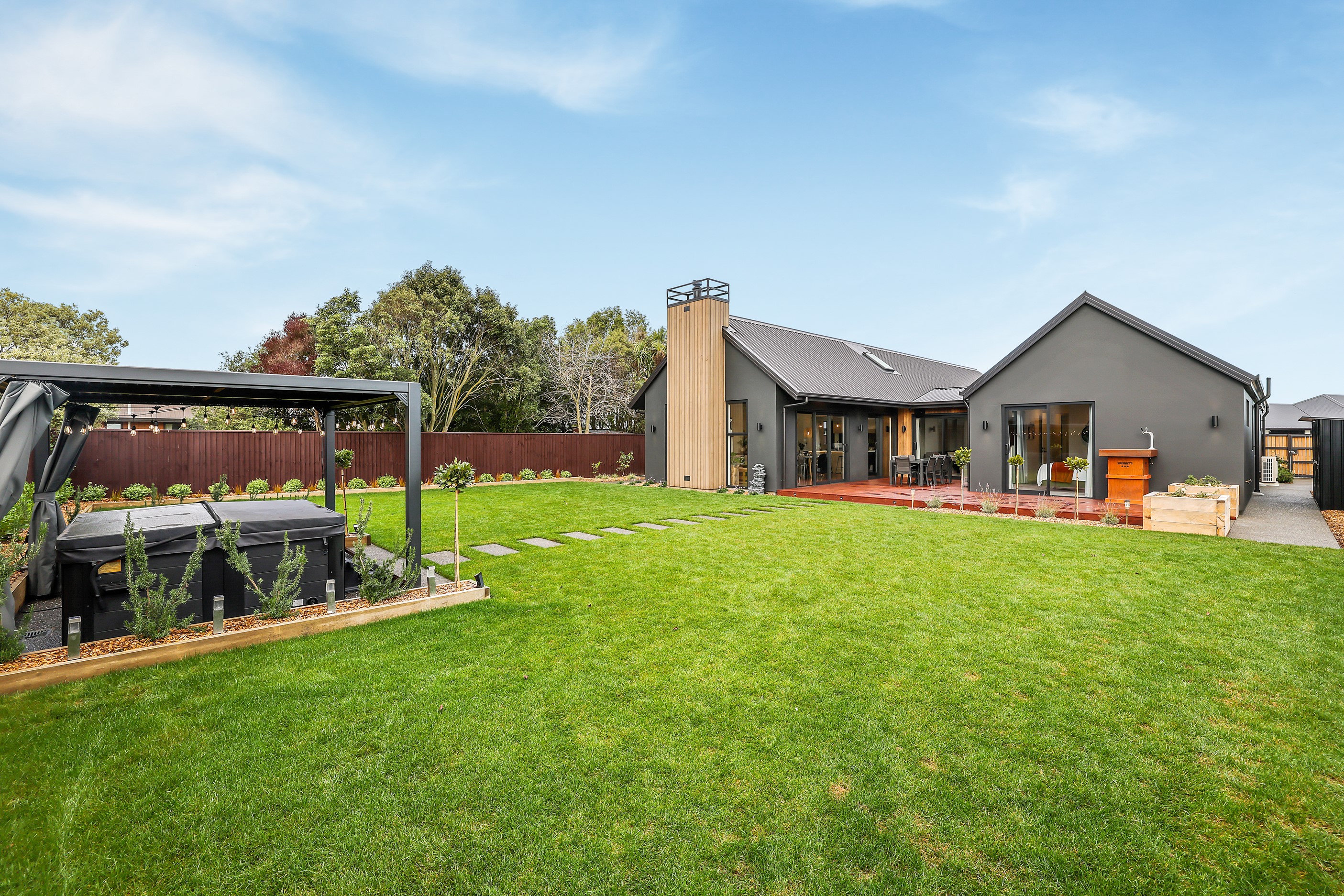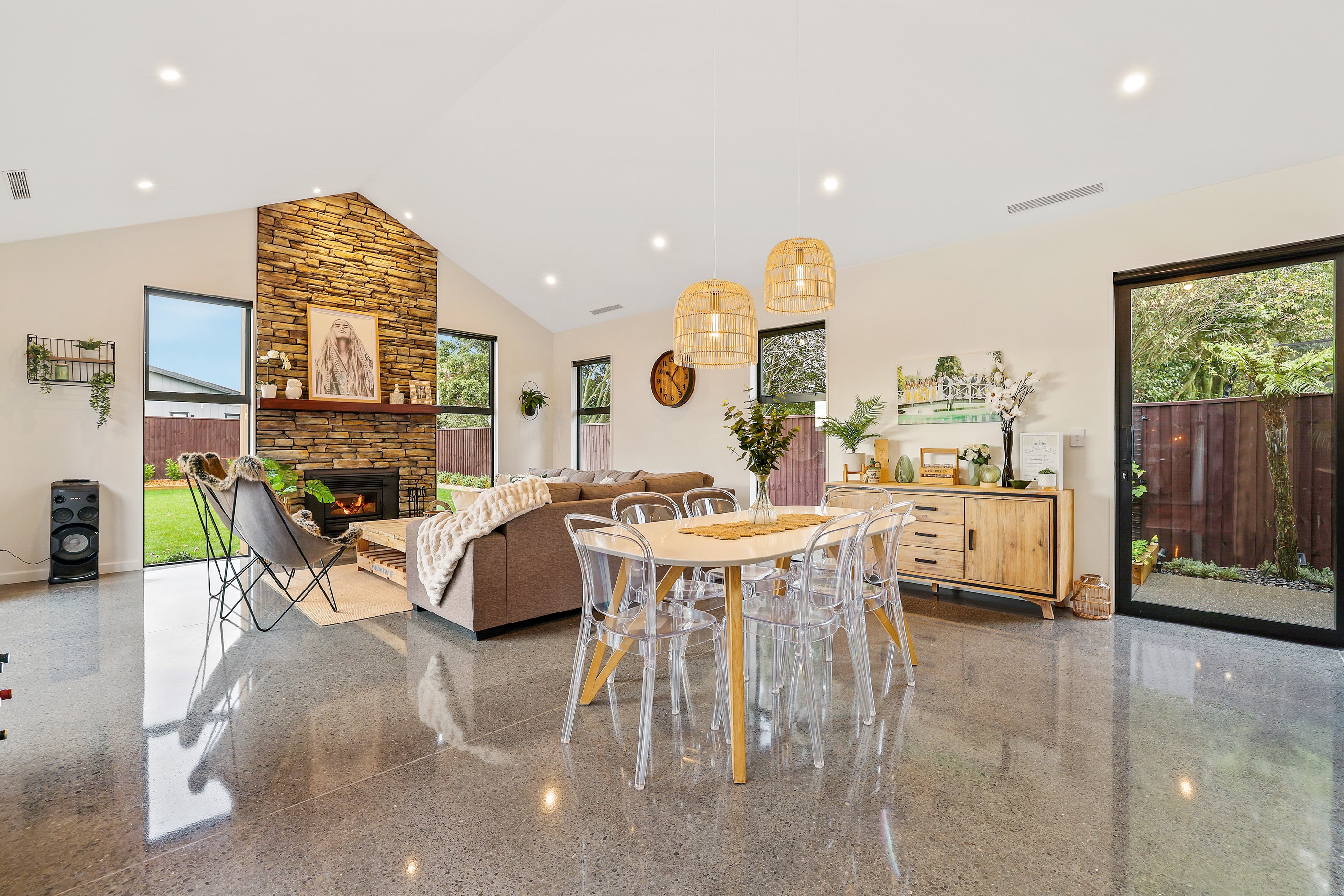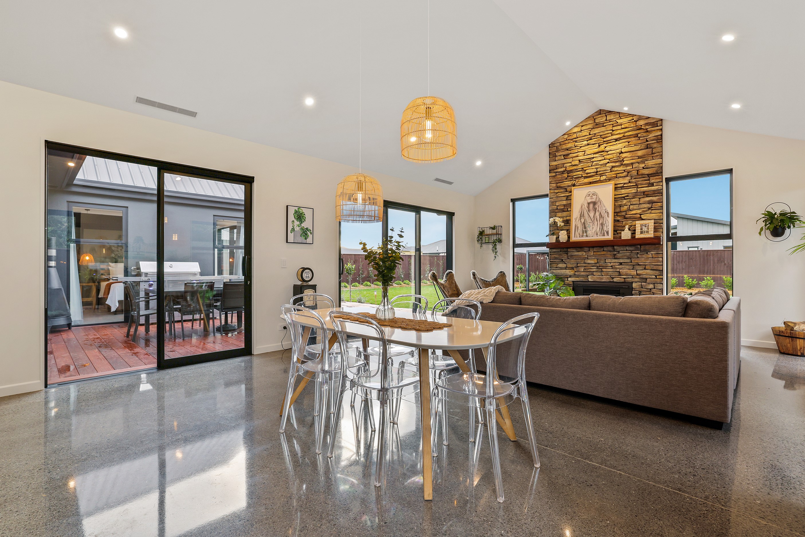 Located in the popular Falcons Landing subdivision, a residential development in sought-after Rolleston, this high-quality home presents easy living at its best. Family life is well catered to with four bedrooms, two bathrooms and two living rooms within the 247sqm H-shaped footprint. The fully equipped kitchen benefits from a spacious scullery, stone benchtops, an attractive splashback and premium appliances. You’ll have the choice of curling up with a book in the large open-plan living area or relaxing in the separate formal lounge. Polished concrete flooring and a full-height stone fireplace demonstrate the excellent craftsmanship found throughout this outstanding family home. A simple yet stylish palette of cedar, black, white and earthy tones feature throughout the property, including the relaxing bathrooms. Soak away the day in the freestanding bath in the main bathroom, or step into the double shower in the superbly appointed ensuite. A seamless transition between indoors and out has been created with the sun-soaked living area spilling out to a decked alfresco entertaining space.