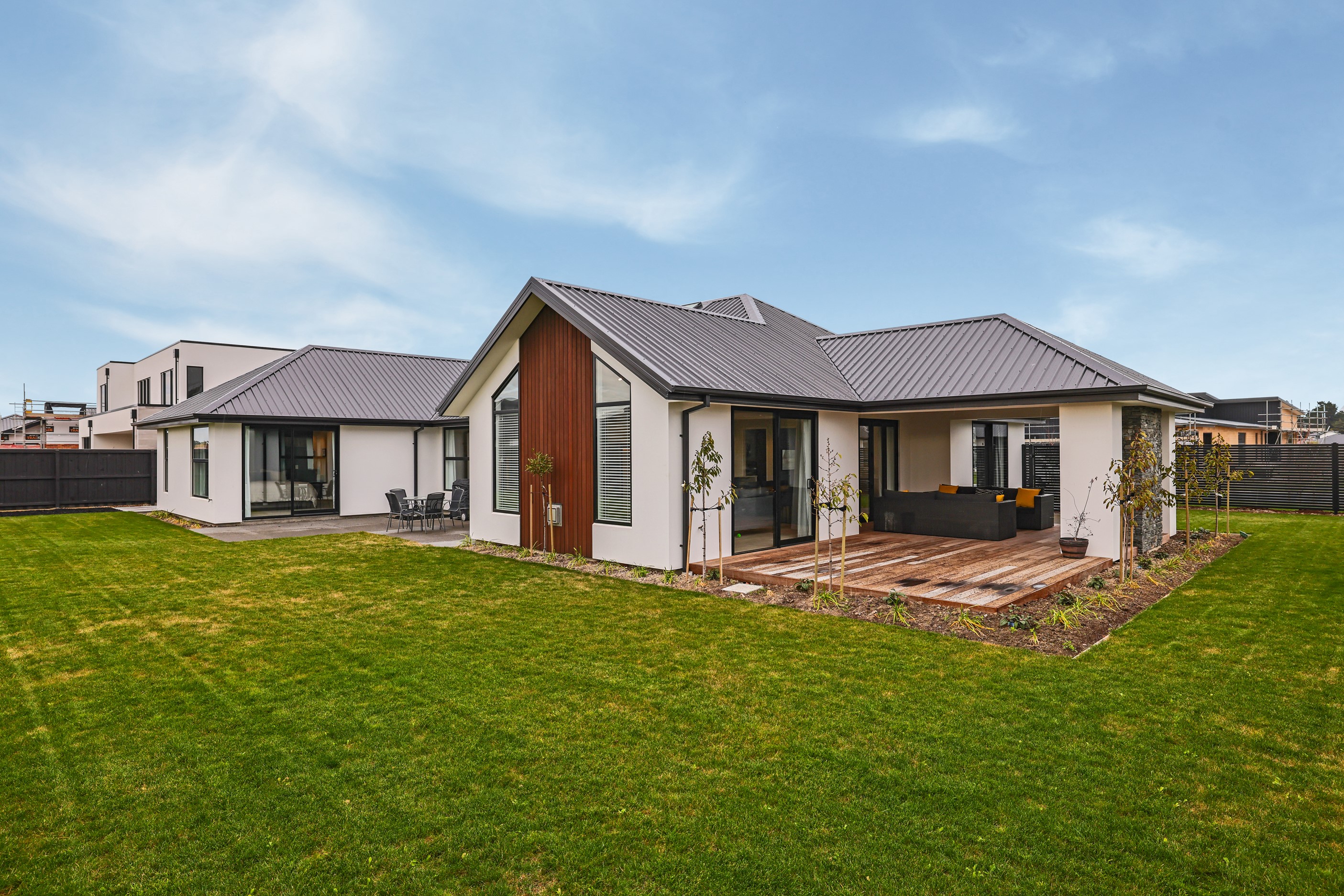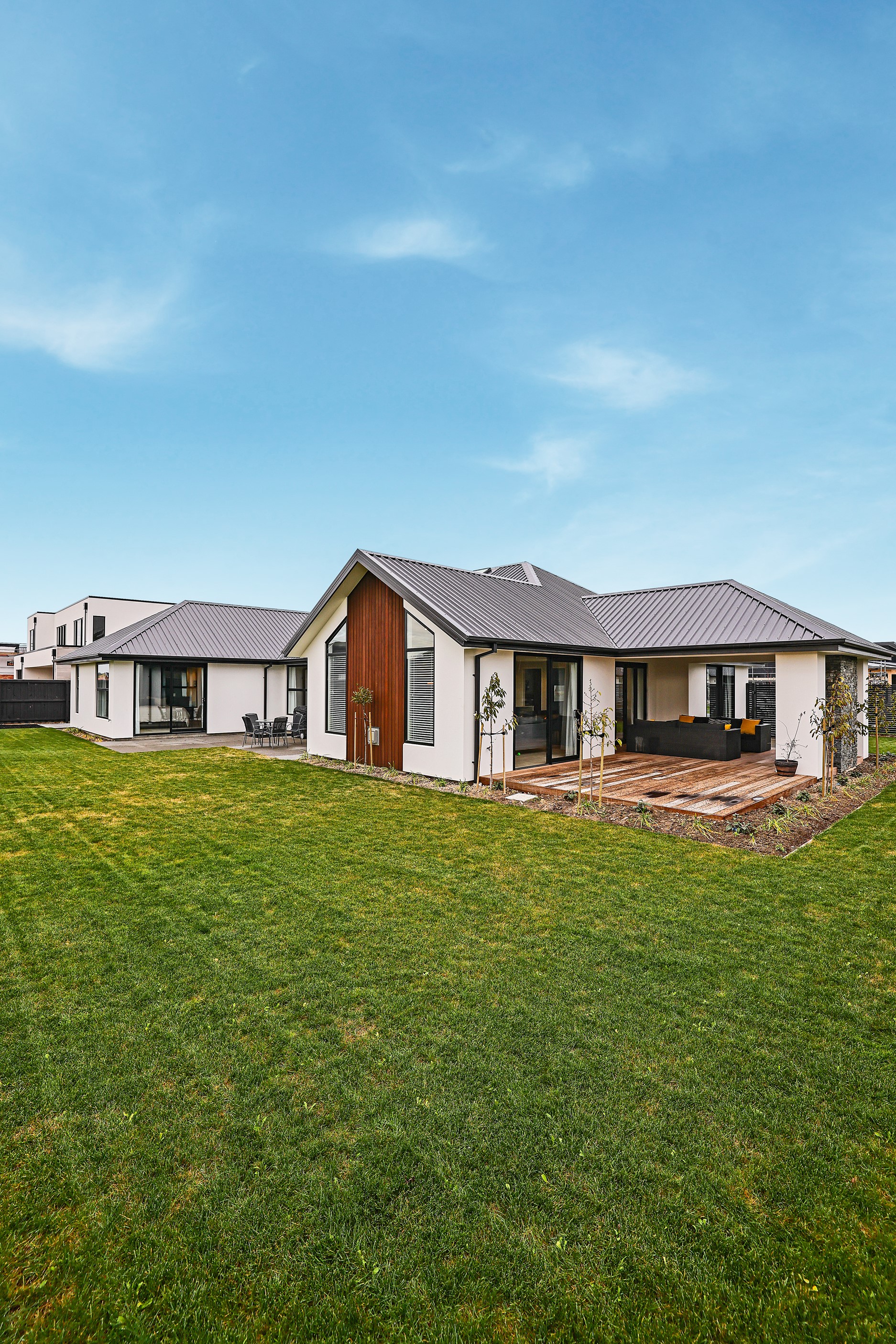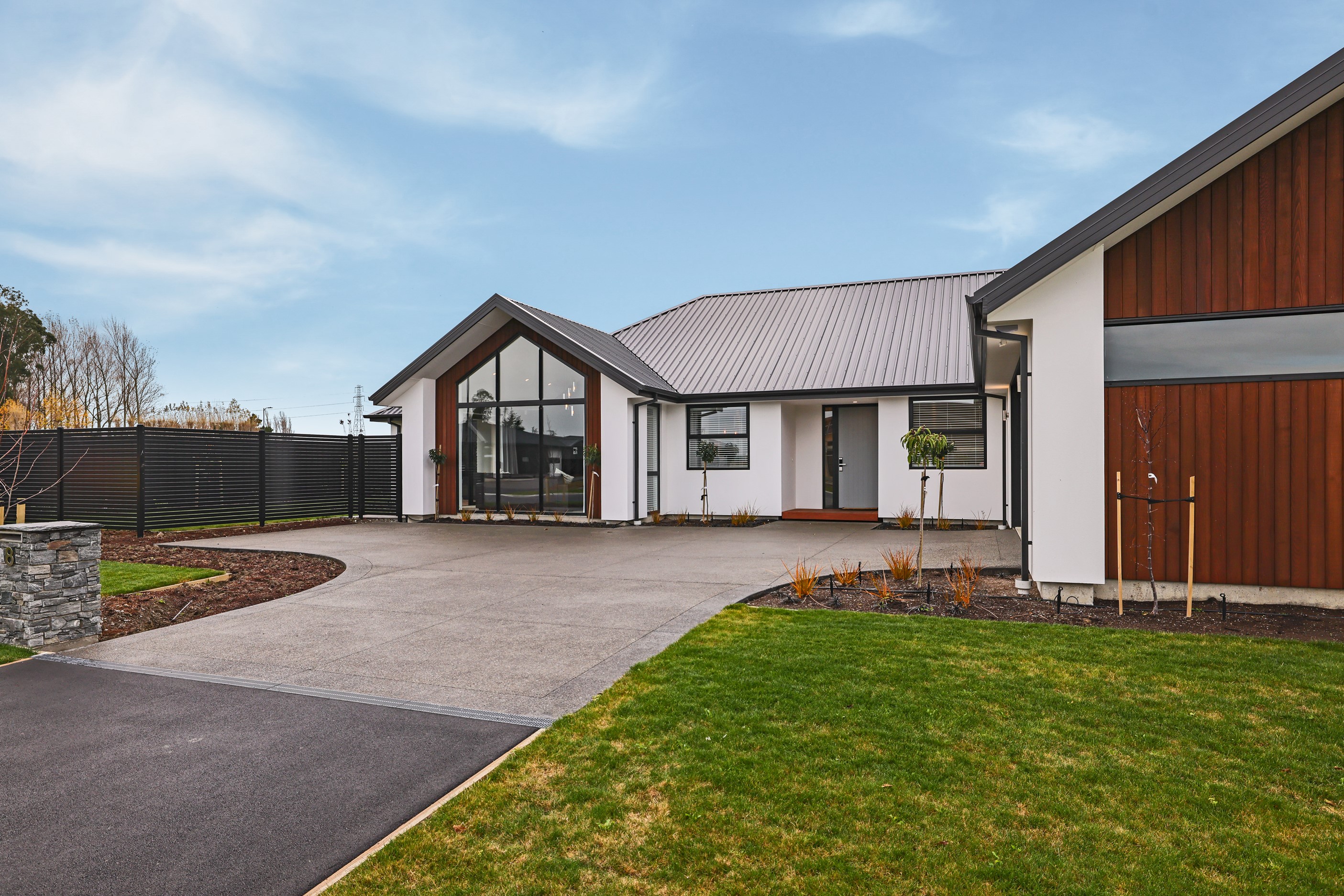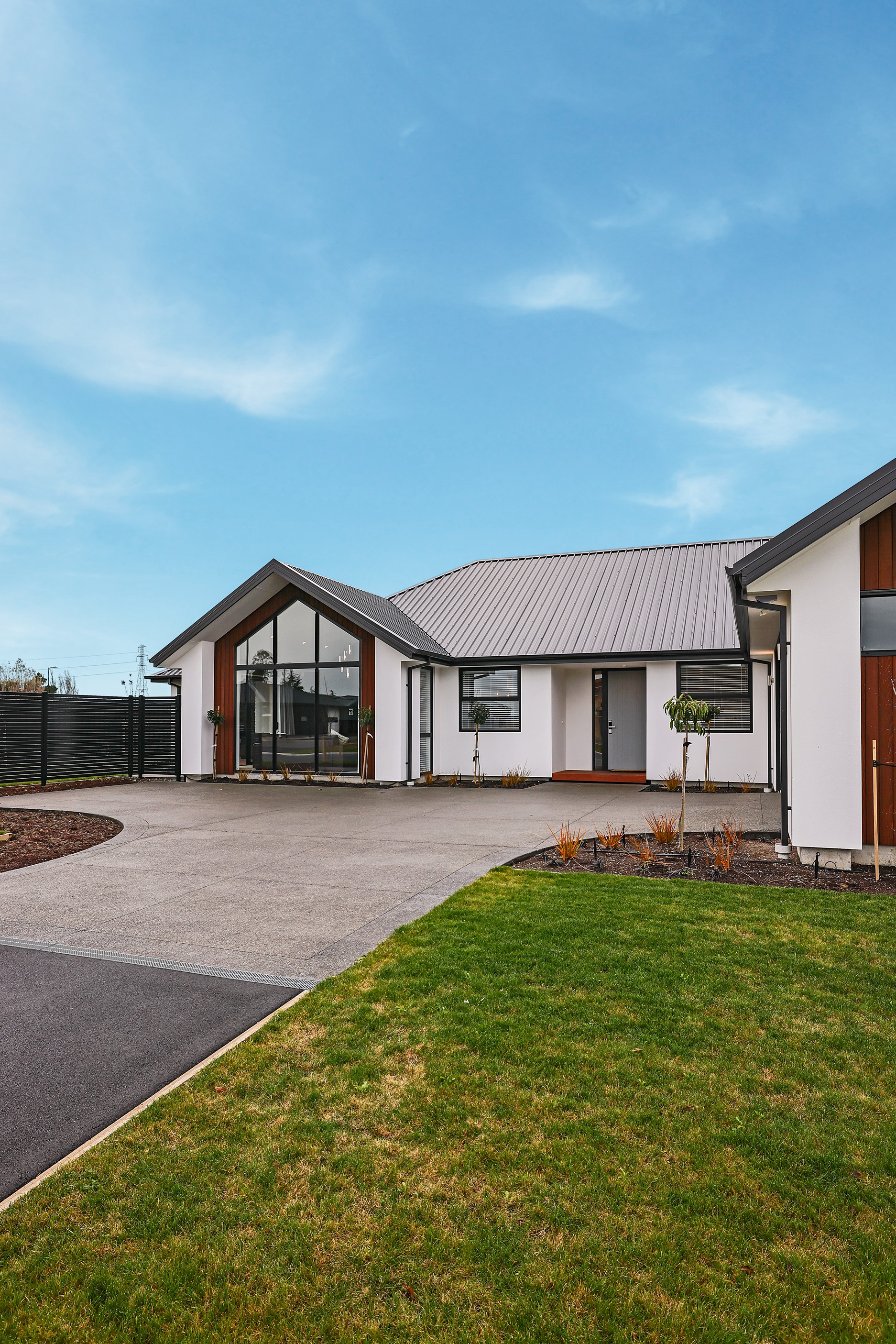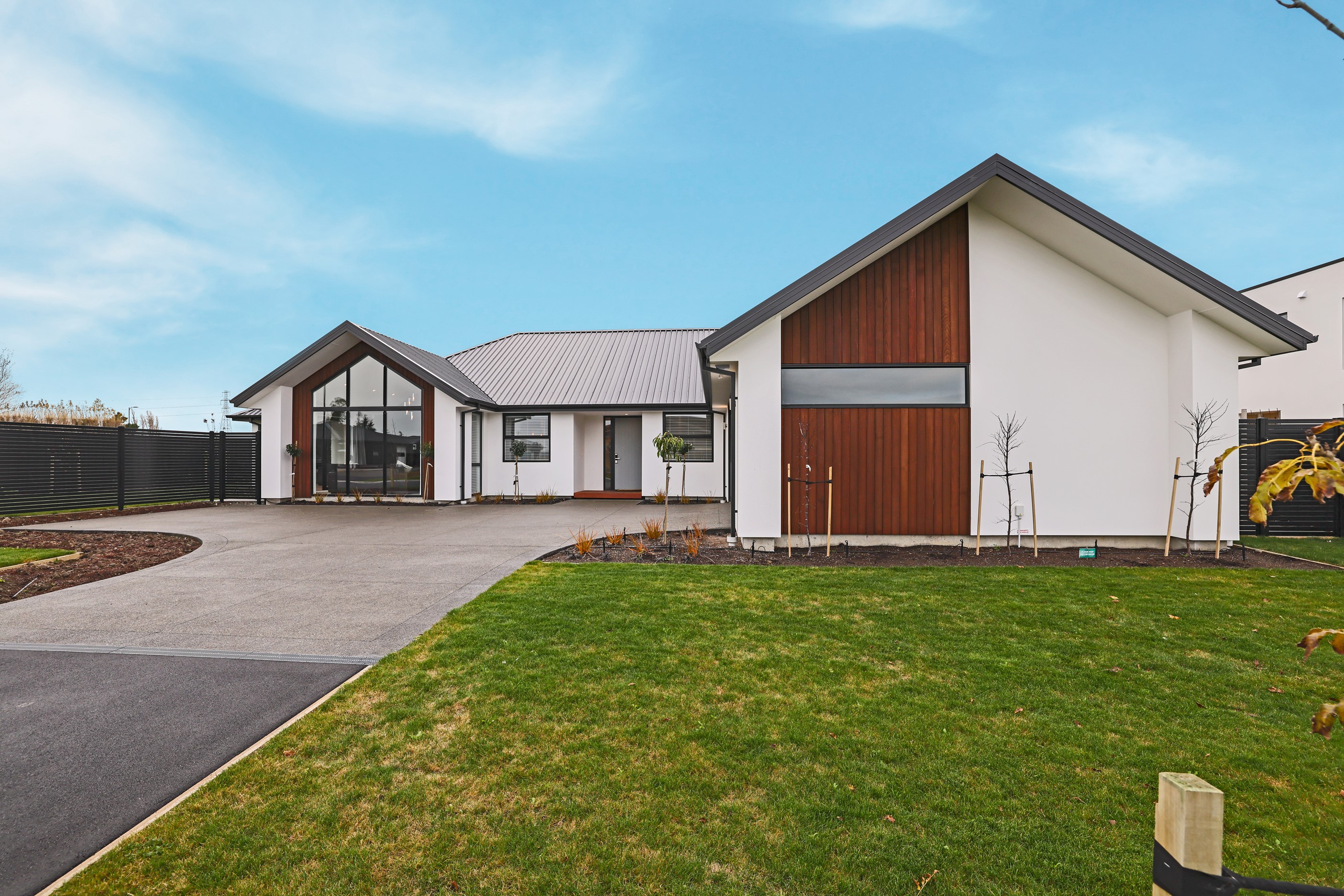 Elegant gable rooflines combine with crisp plaster cladding to create instant street appeal for this modern, stylish home. Feature schist and vertical cedar add to the exterior interest. The four-bedroom home offers 265sqm of floor area and has been designed to meet the homeowner’s brief. The living areas are light and bright with a raking ceiling, and the inbuilt gasfire creates a cosy haven in winter. An executive kitchen forms the heart of the open-plan living space and is complete with a generously sized walk-in pantry, expansive benches and plenty of natural light – thanks to large skylights and windows. A separate lounge adjoins the main living area and is complemented by raking ceilings and a full-height window overlooking the front of the property. Leading from the dining space is an inviting, covered alfresco area that features an outdoor gas fire with an attractive schist surround. The main suite is complete with a luxurious ensuite and walk-in wardrobe. A large family bathroom, separate toilet, laundry, and double garage complete the home.