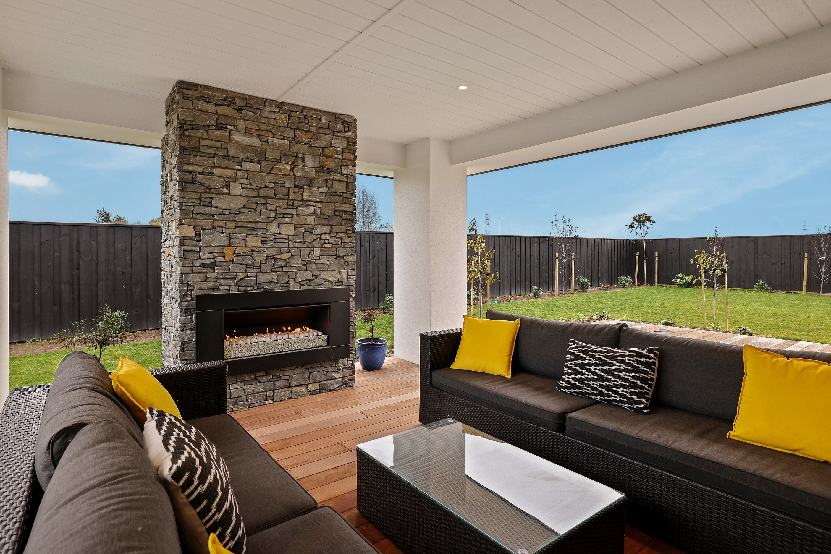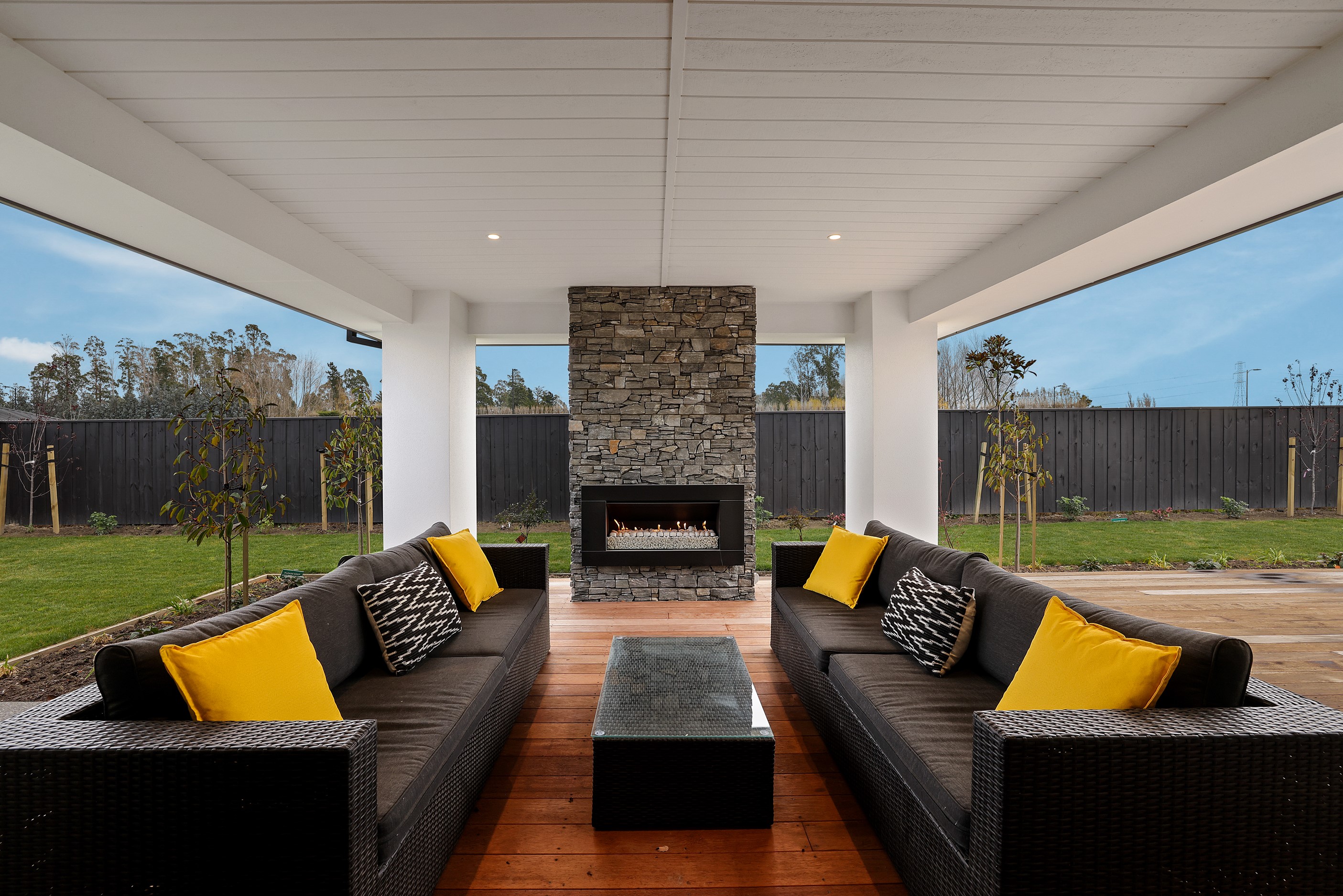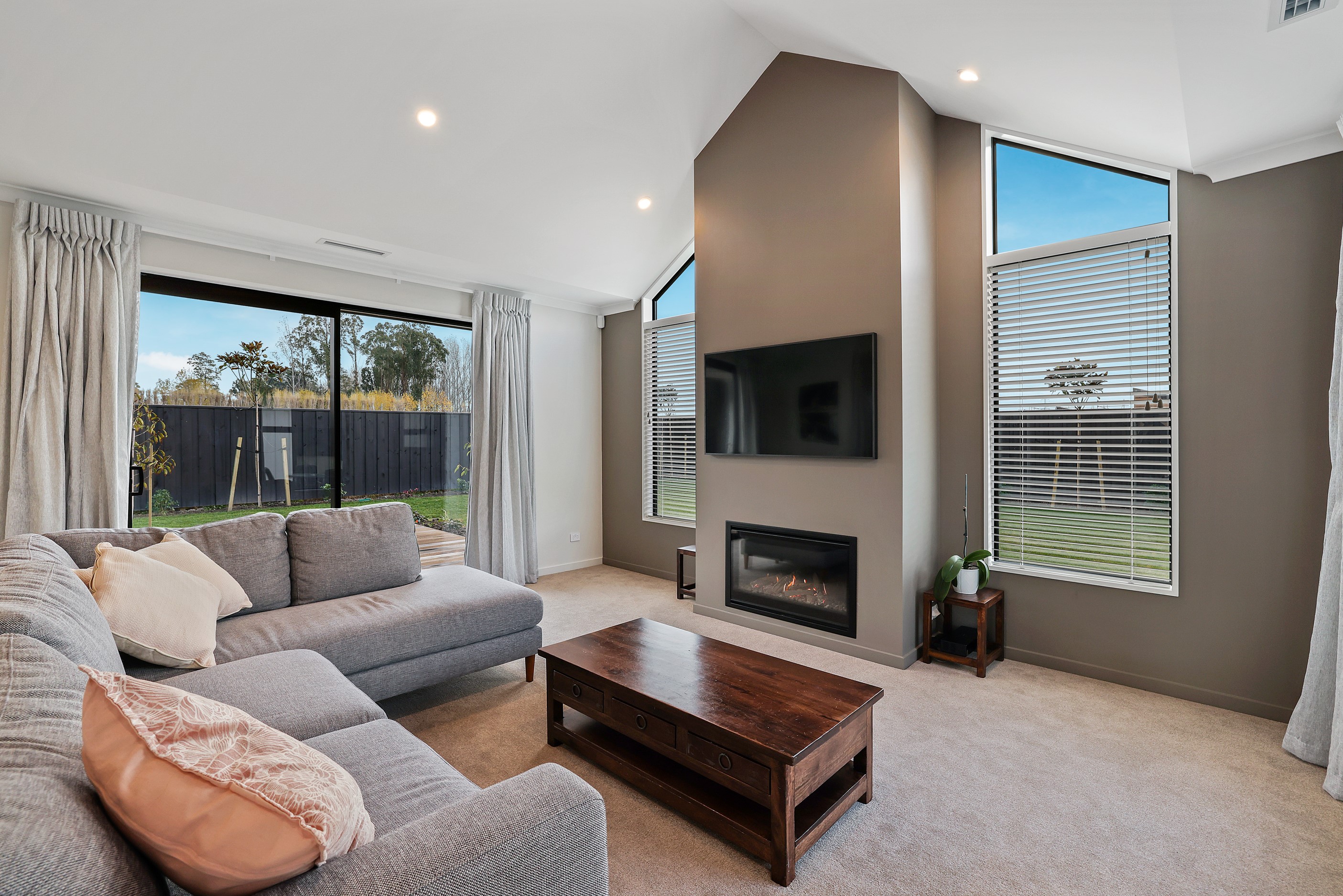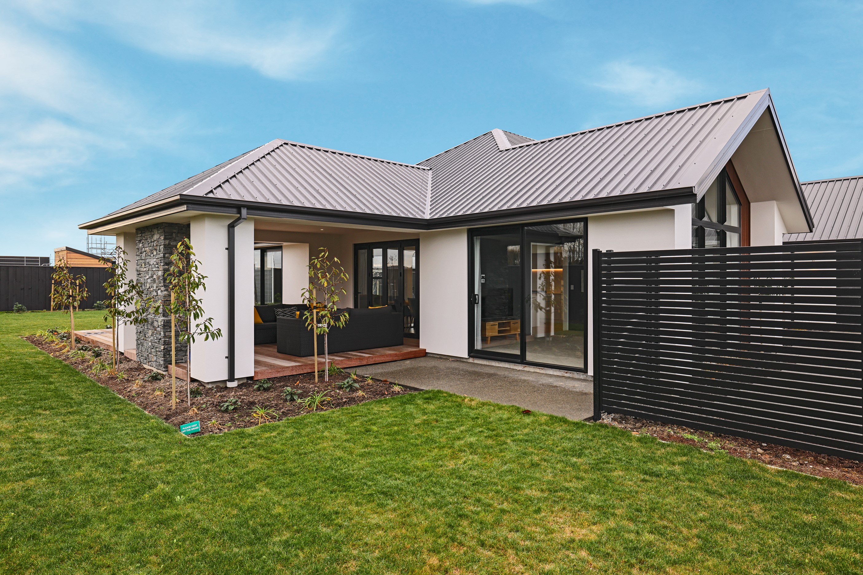 Elegant gable rooflines combine with crisp plaster cladding to create instant street appeal for this modern, stylish home. Feature schist and vertical cedar add to the exterior interest. The four-bedroom home offers 265sqm of floor area and has been designed to meet the homeowner’s brief. The living areas are light and bright with a raking ceiling, and the inbuilt gasfire creates a cosy haven in winter. An executive kitchen forms the heart of the open-plan living space and is complete with a generously sized walk-in pantry, expansive benches and plenty of natural light – thanks to large skylights and windows. A separate lounge adjoins the main living area and is complemented by raking ceilings and a full-height window overlooking the front of the property. Leading from the dining space is an inviting, covered alfresco area that features an outdoor gas fire with an attractive schist surround. The main suite is complete with a luxurious ensuite and walk-in wardrobe. A large family bathroom, separate toilet, laundry, and double garage complete the home.