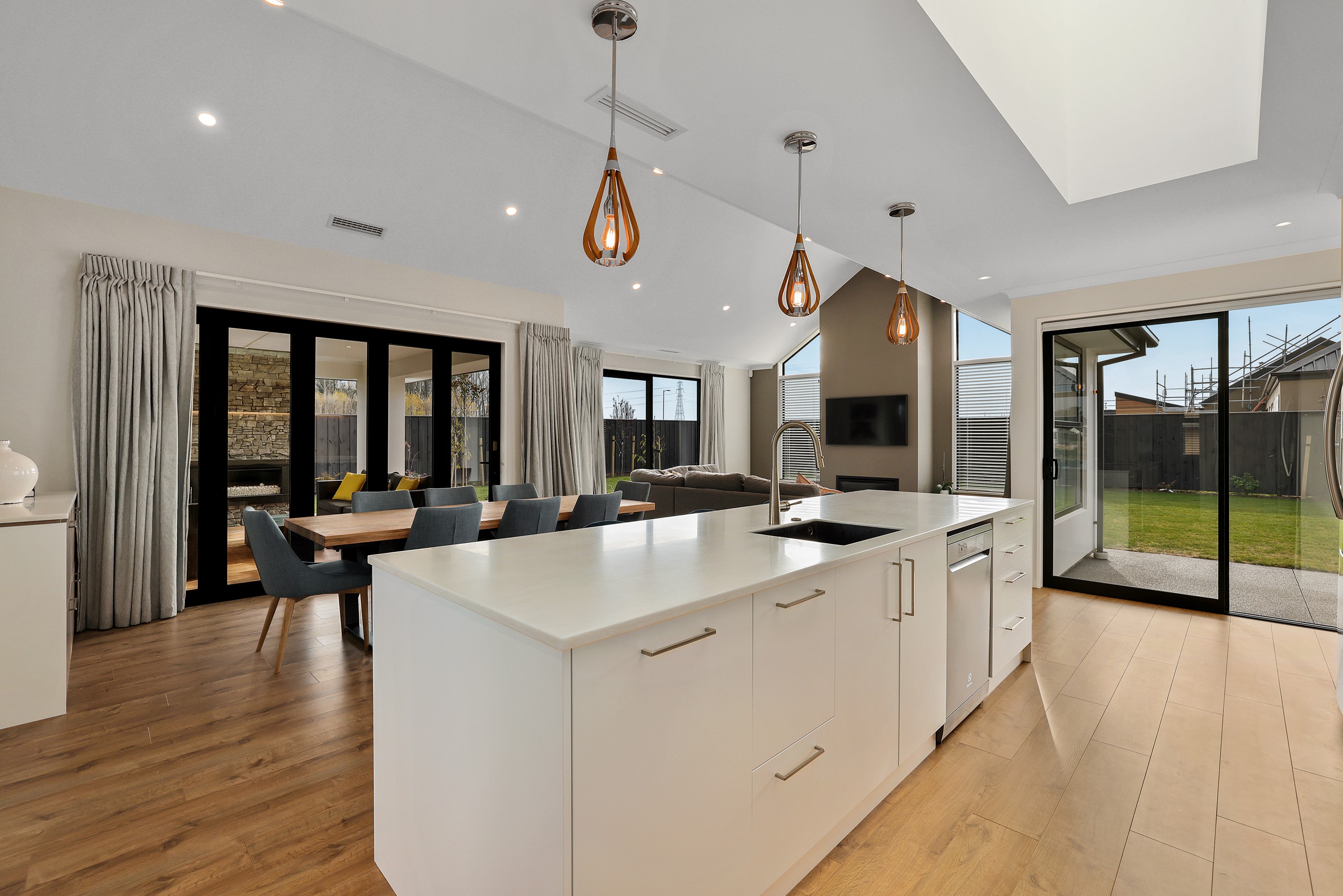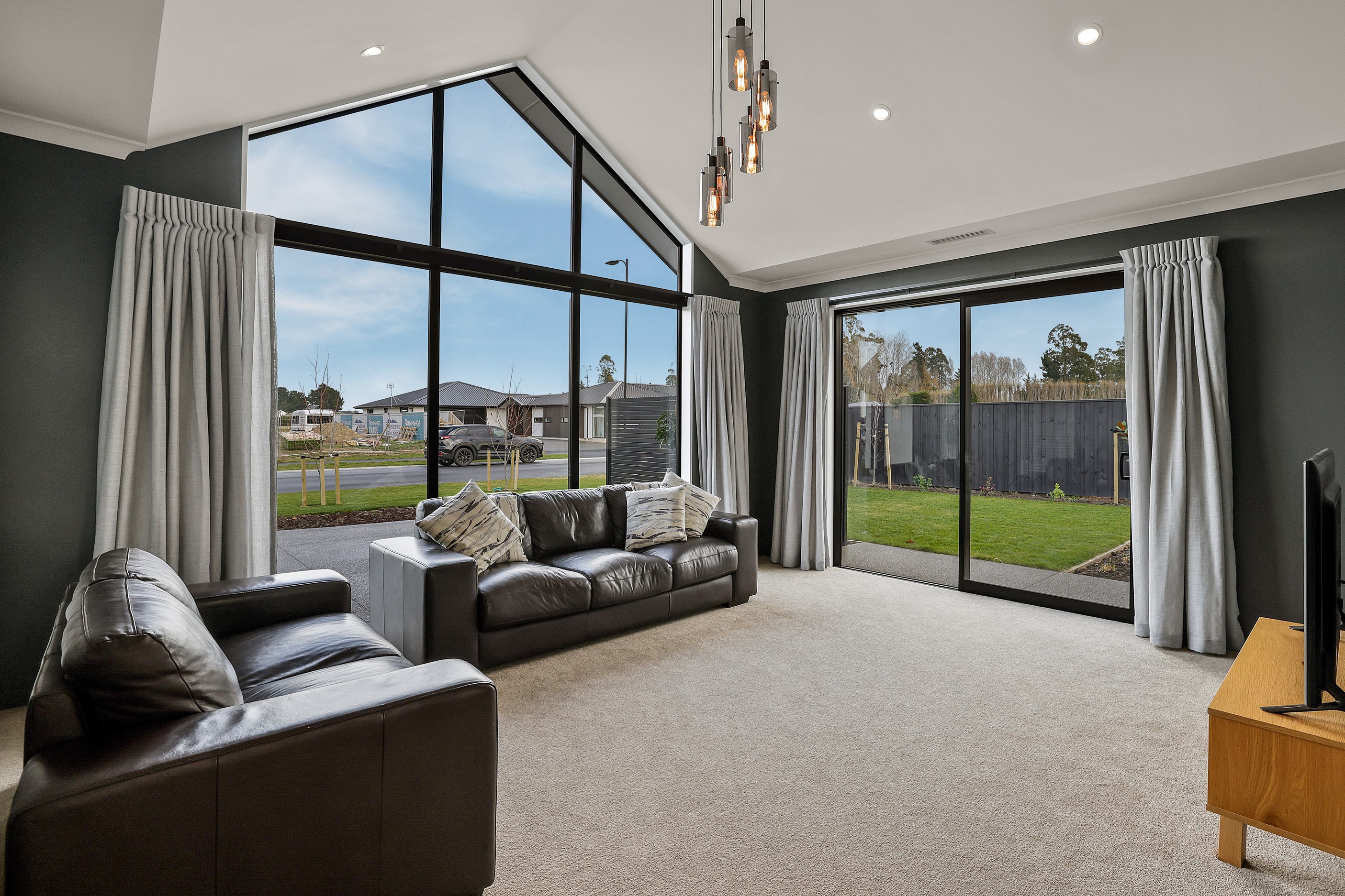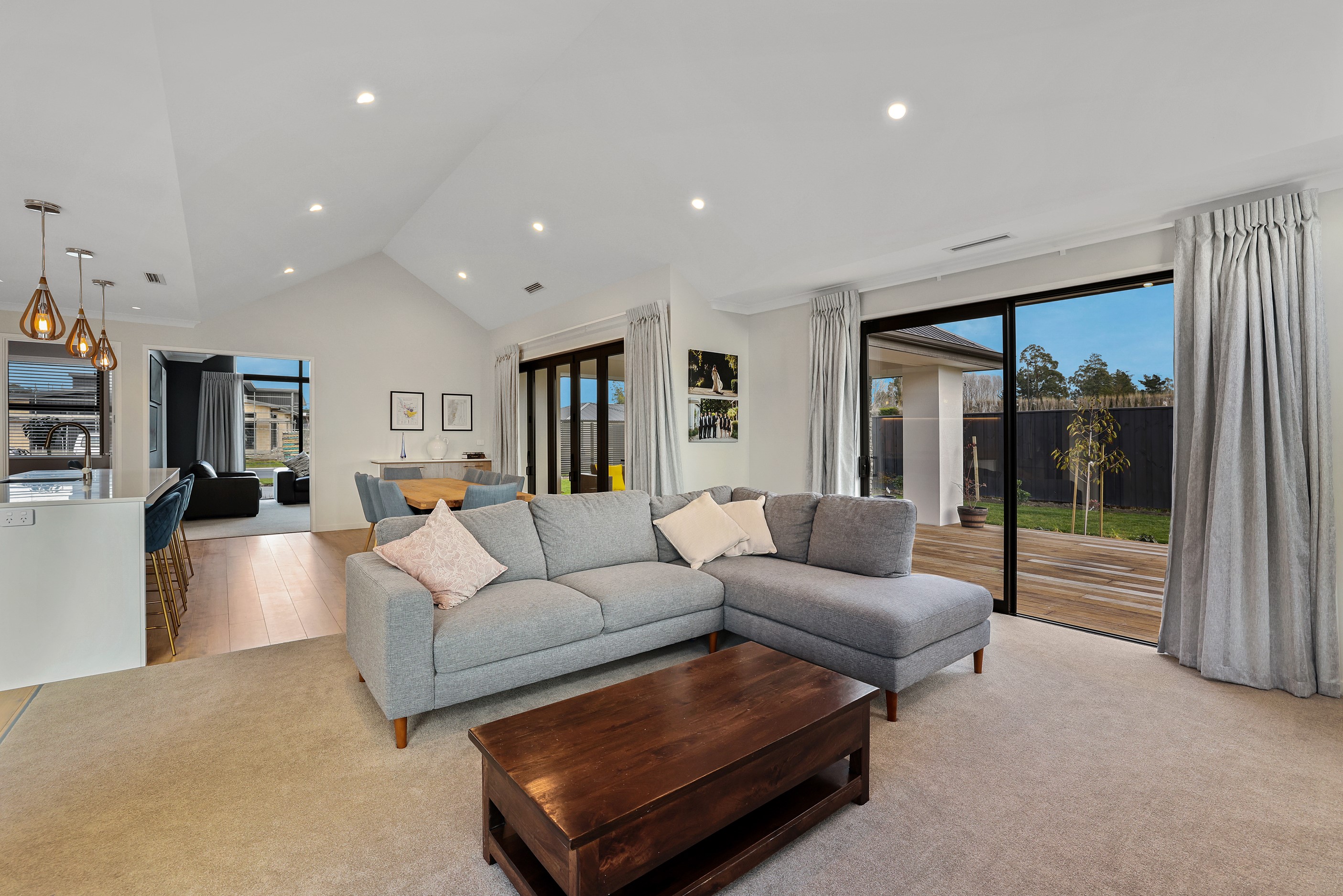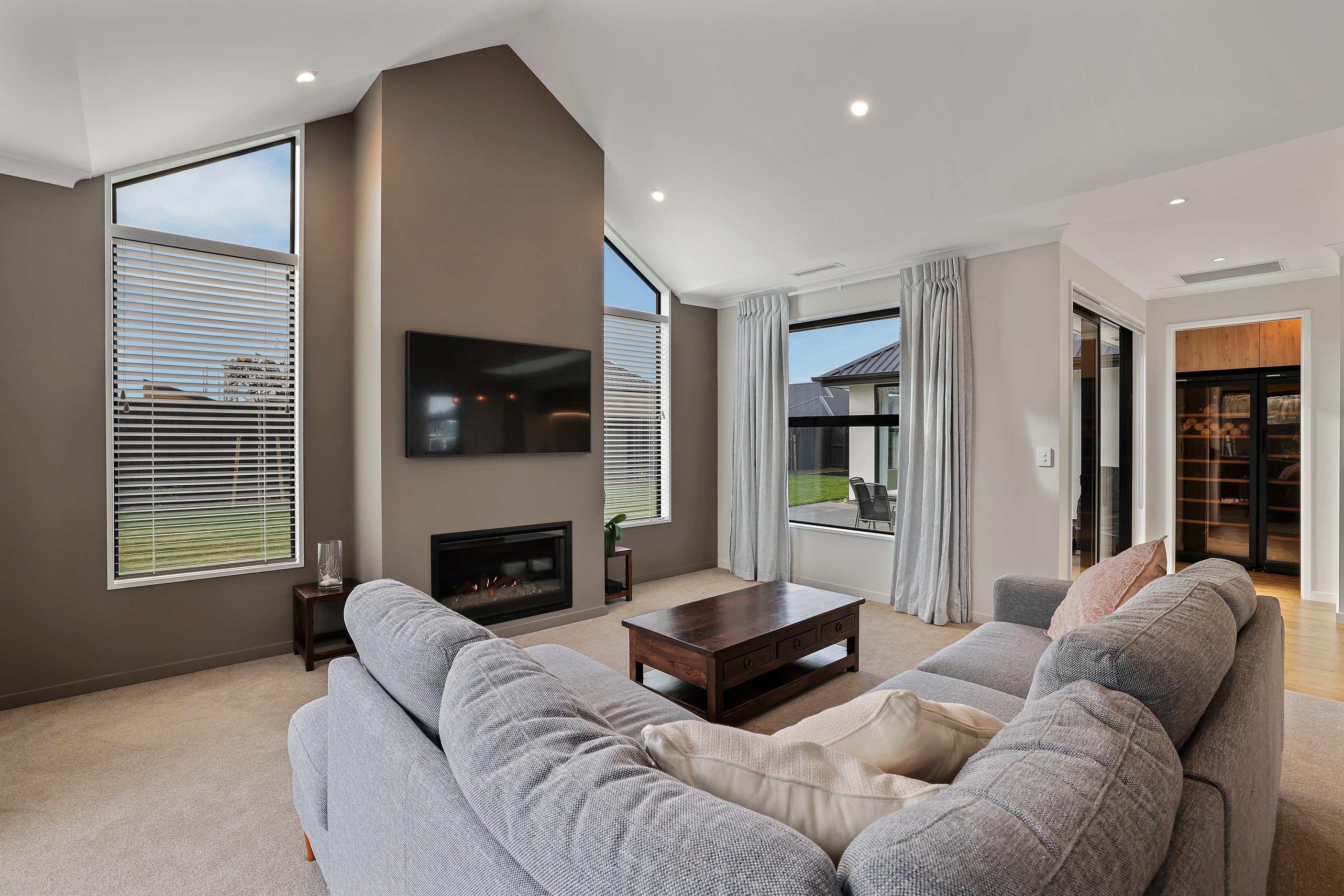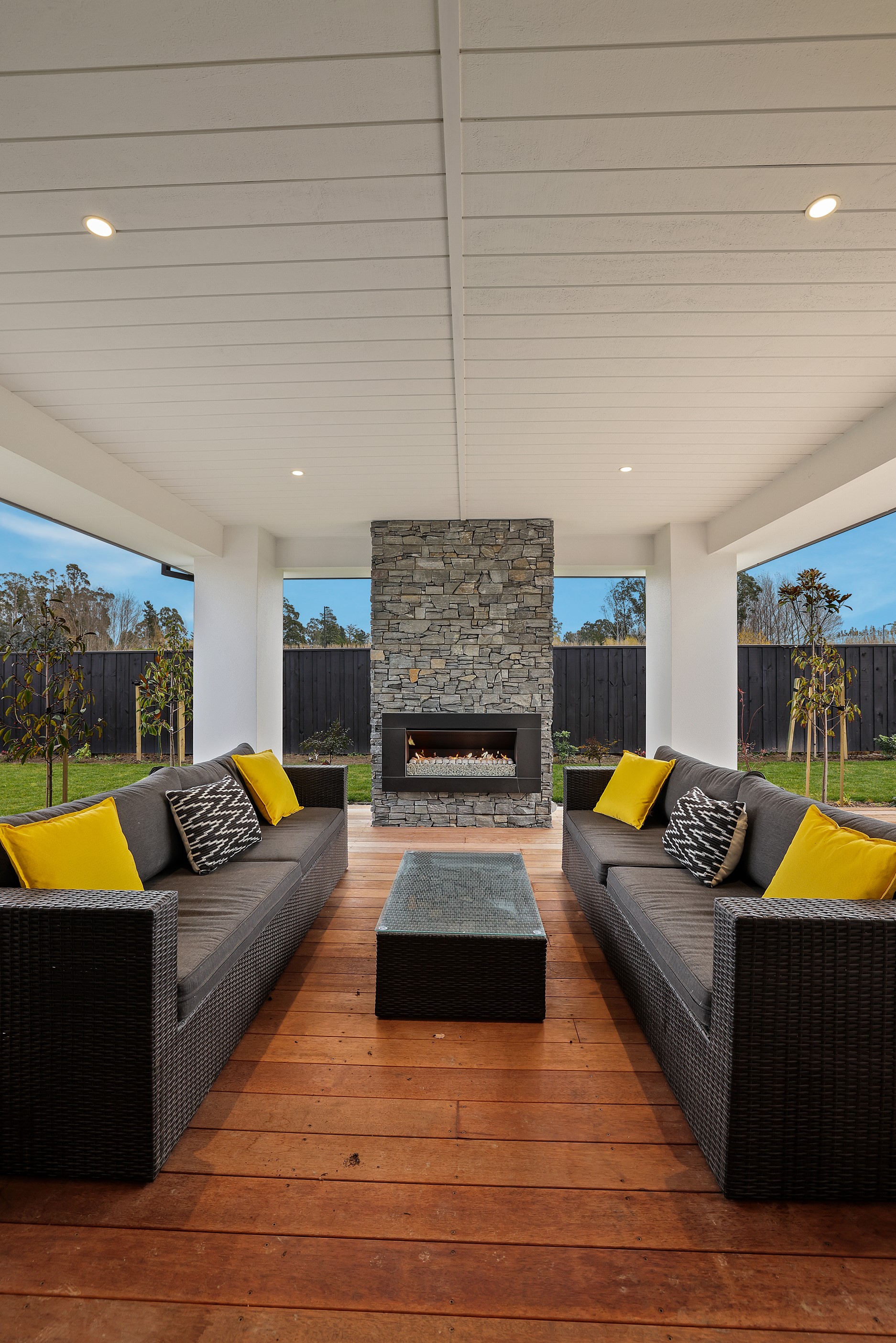 Elegant gable rooflines combine with crisp plaster cladding to create instant street appeal for this modern, stylish home. Feature schist and vertical cedar add to the exterior interest. The four-bedroom home offers 265sqm of floor area and has been designed to meet the homeowner’s brief. The living areas are light and bright with a raking ceiling, and the inbuilt gasfire creates a cosy haven in winter. An executive kitchen forms the heart of the open-plan living space and is complete with a generously sized walk-in pantry, expansive benches and plenty of natural light – thanks to large skylights and windows. A separate lounge adjoins the main living area and is complemented by raking ceilings and a full-height window overlooking the front of the property. Leading from the dining space is an inviting, covered alfresco area that features an outdoor gas fire with an attractive schist surround. The main suite is complete with a luxurious ensuite and walk-in wardrobe. A large family bathroom, separate toilet, laundry, and double garage complete the home.