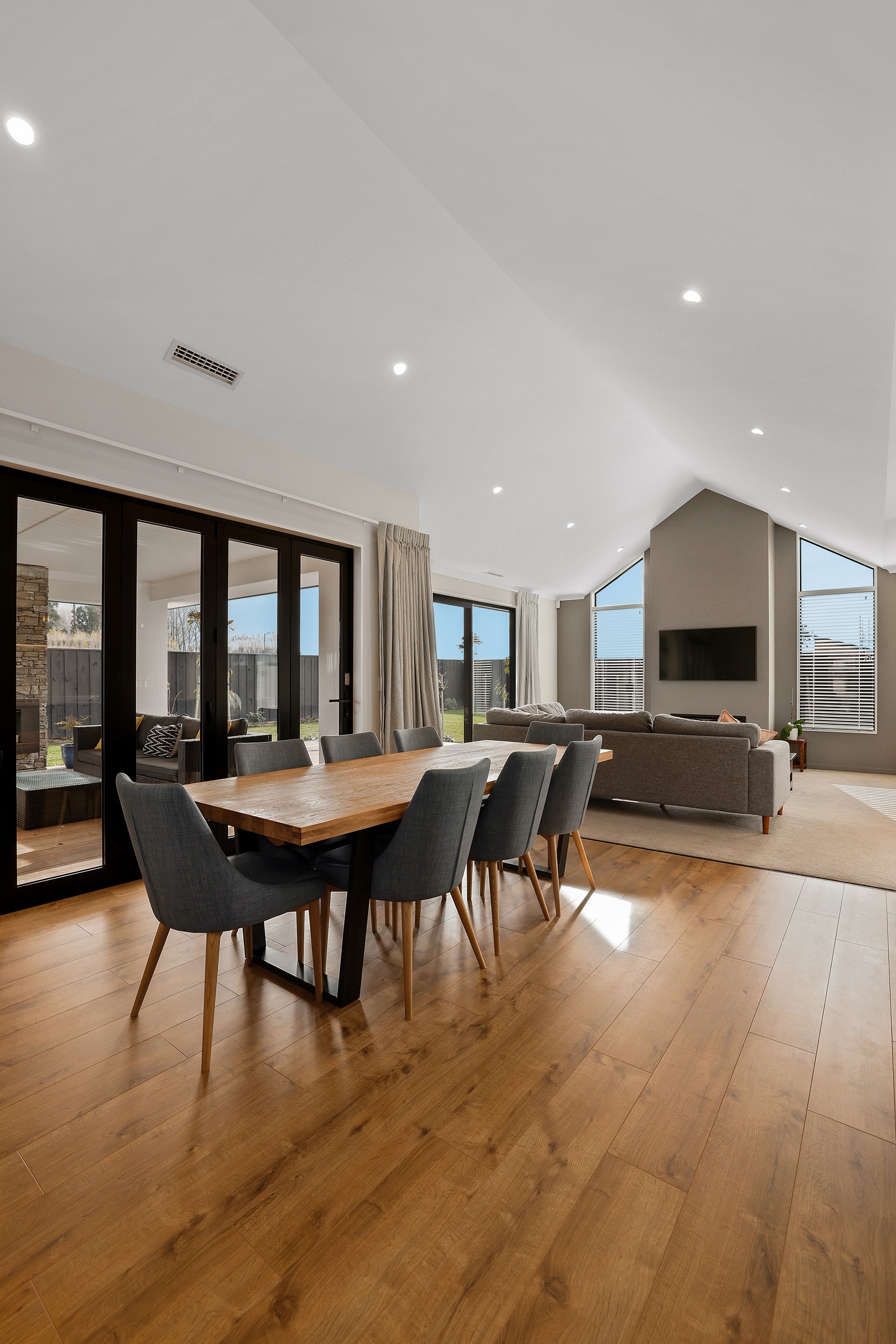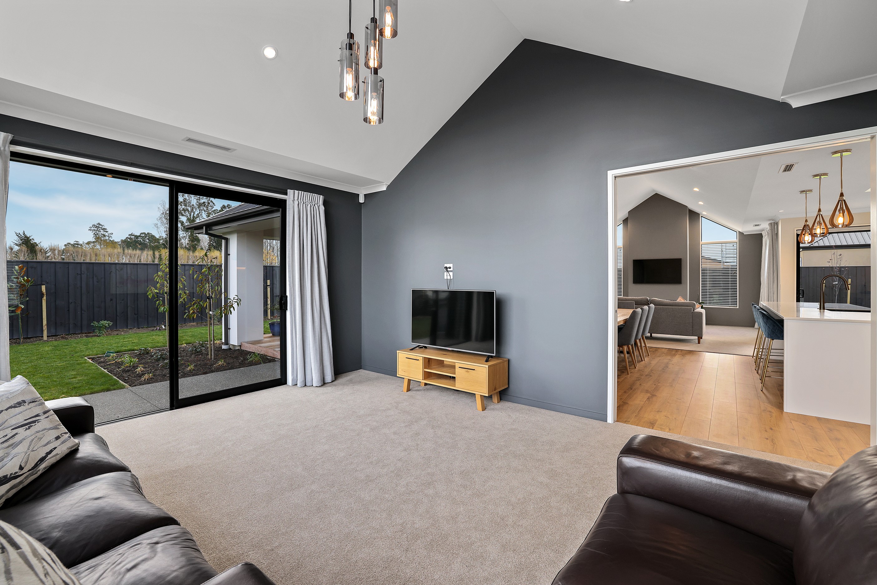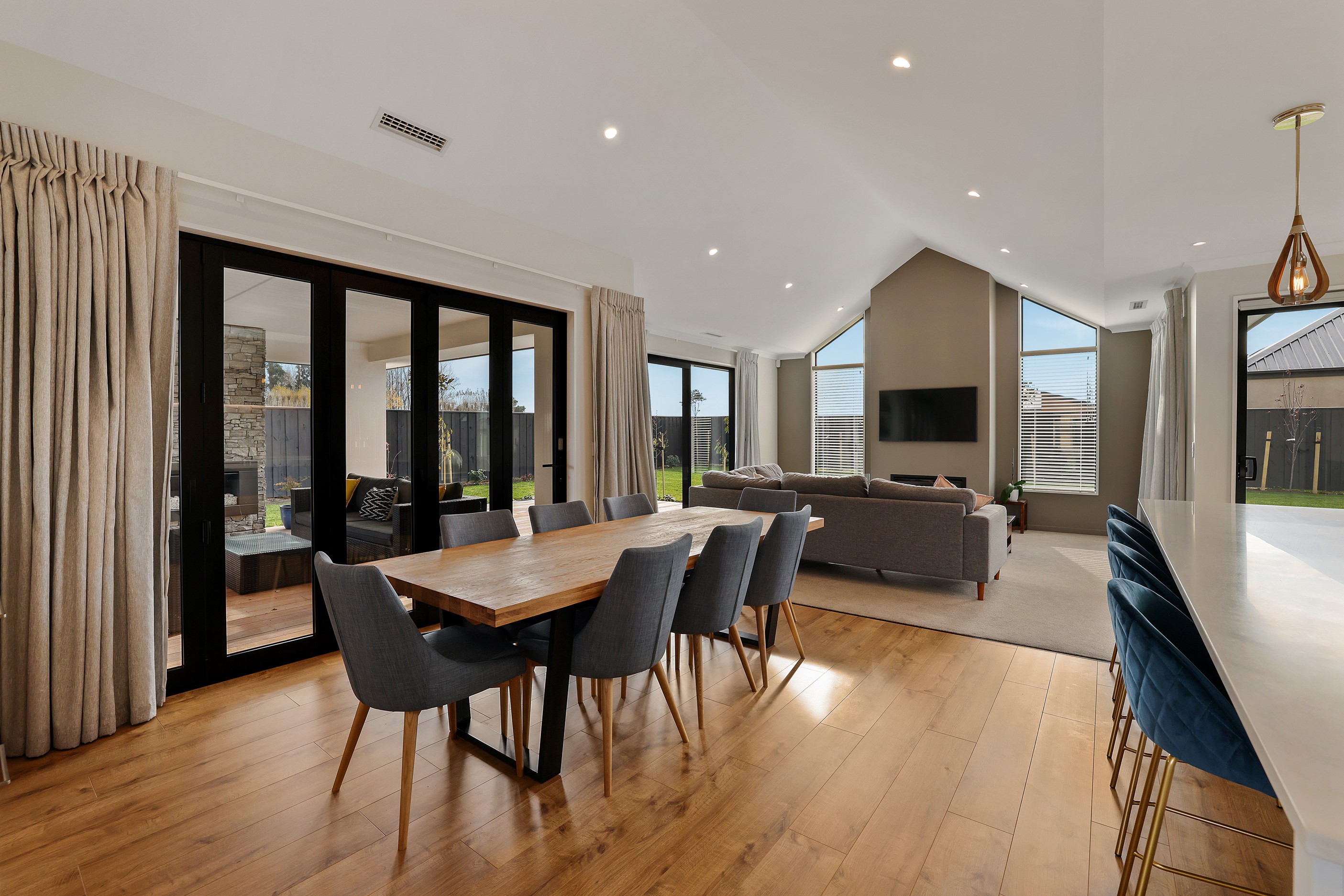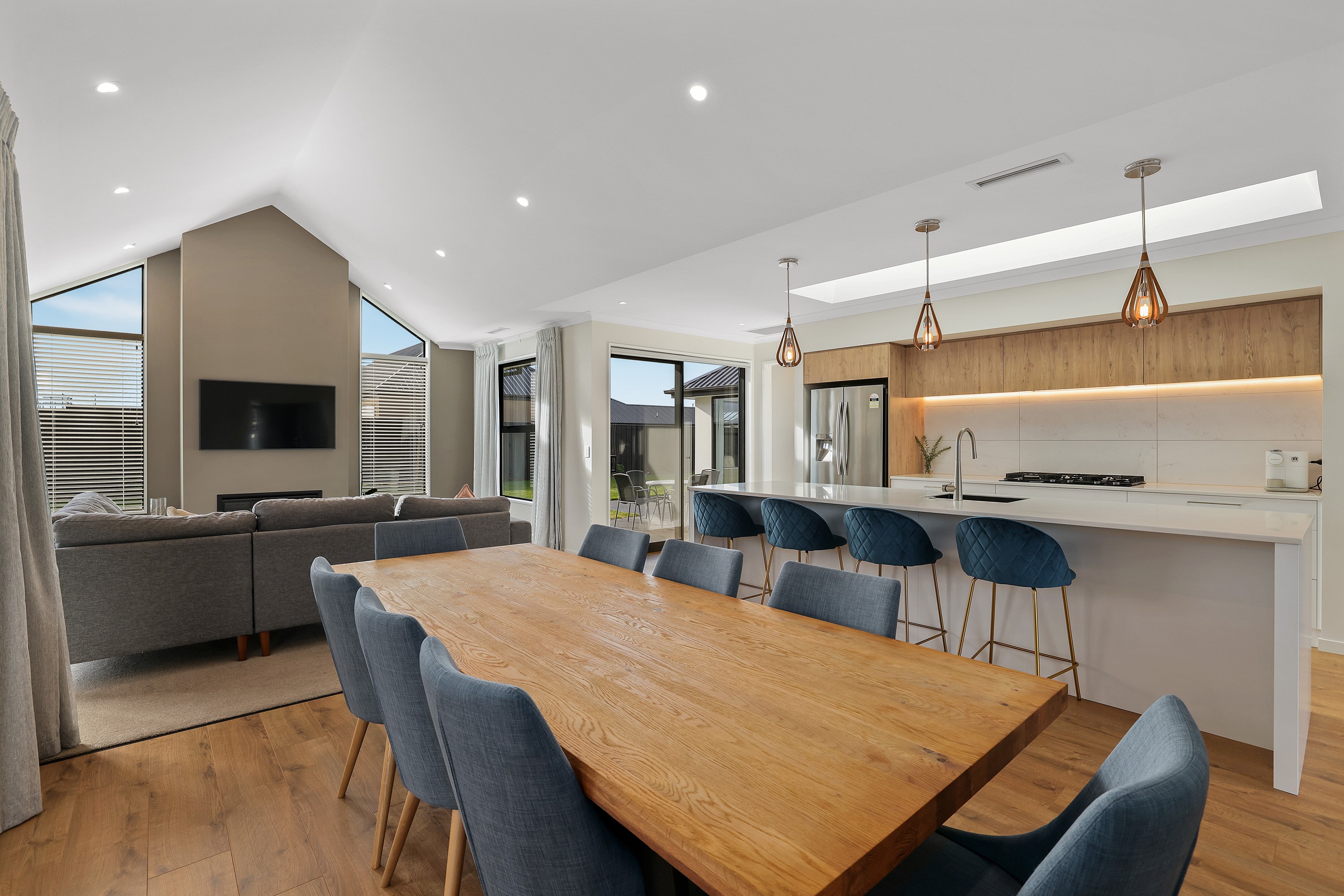 Elegant gable rooflines combine with crisp plaster cladding to create instant street appeal for this modern, stylish home. Feature schist and vertical cedar add to the exterior interest. The four-bedroom home offers 265sqm of floor area and has been designed to meet the homeowner’s brief. The living areas are light and bright with a raking ceiling, and the inbuilt gasfire creates a cosy haven in winter. An executive kitchen forms the heart of the open-plan living space and is complete with a generously sized walk-in pantry, expansive benches and plenty of natural light – thanks to large skylights and windows. A separate lounge adjoins the main living area and is complemented by raking ceilings and a full-height window overlooking the front of the property. Leading from the dining space is an inviting, covered alfresco area that features an outdoor gas fire with an attractive schist surround. The main suite is complete with a luxurious ensuite and walk-in wardrobe. A large family bathroom, separate toilet, laundry, and double garage complete the home.