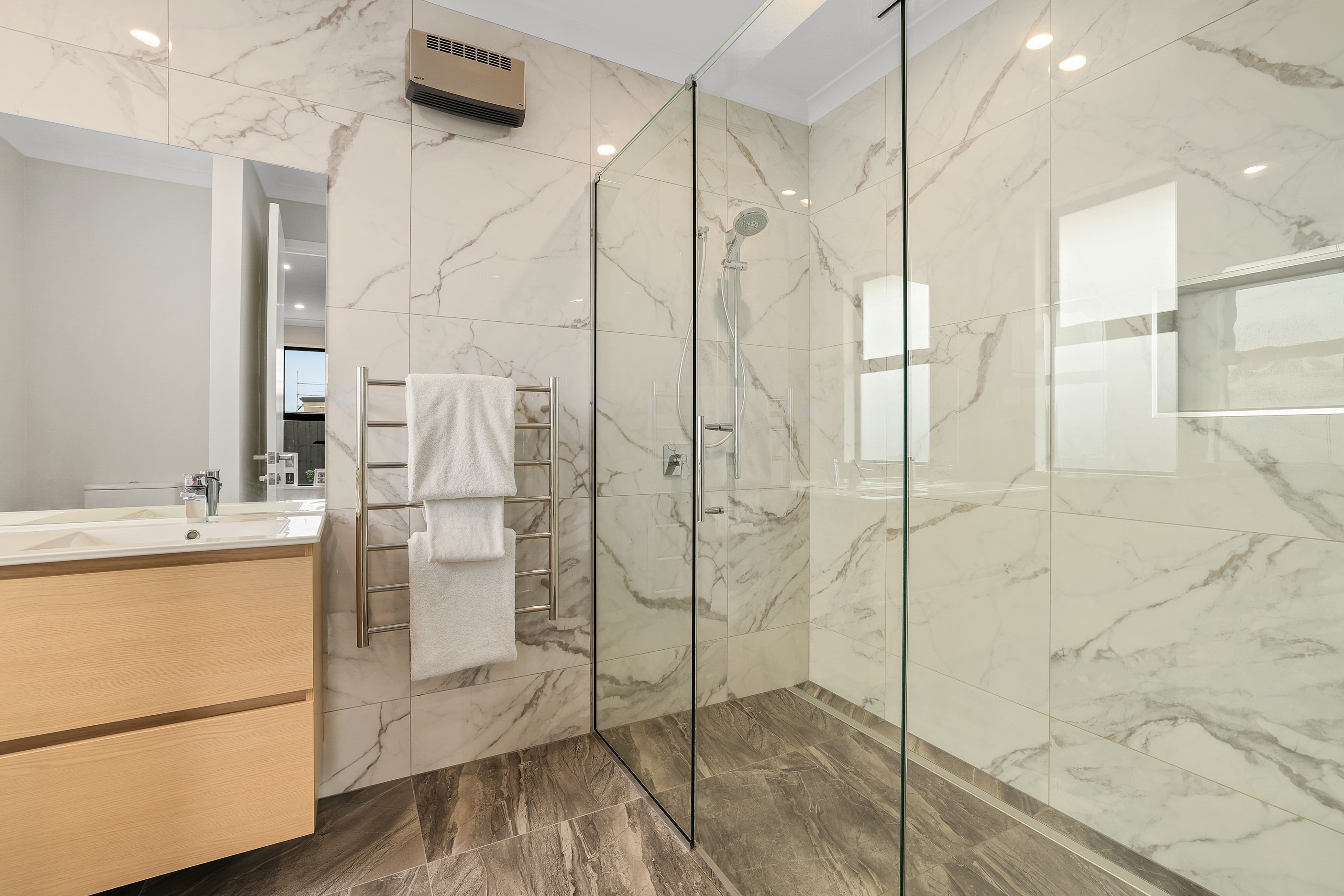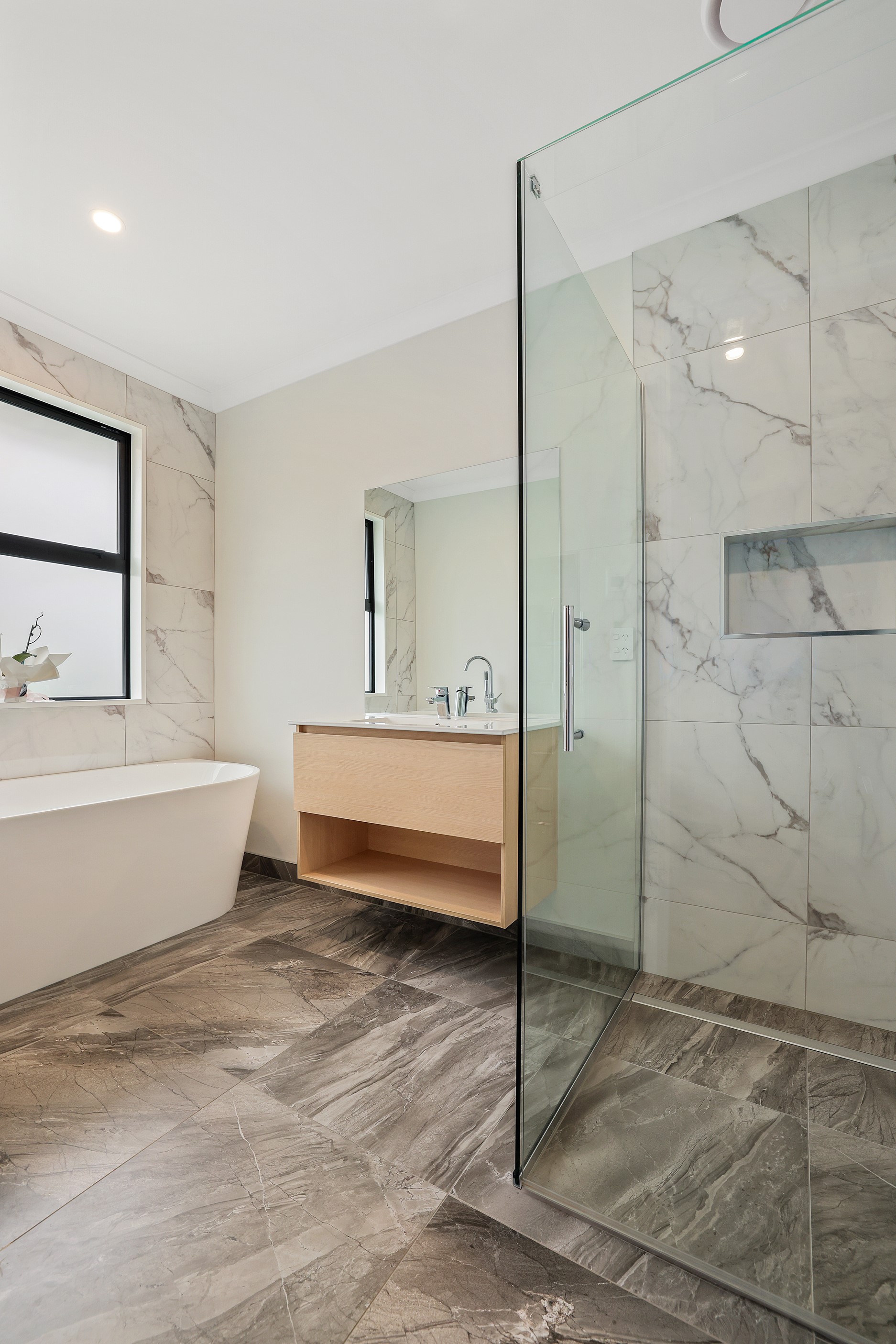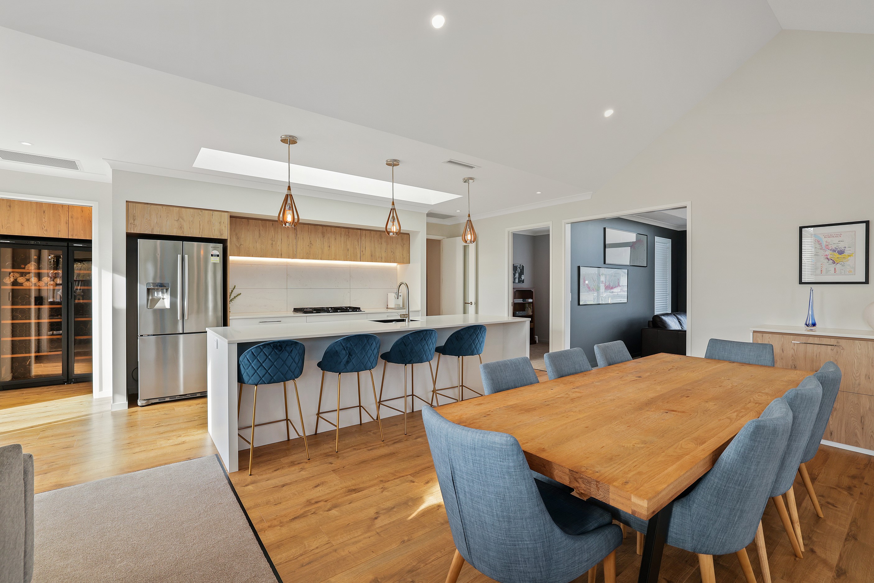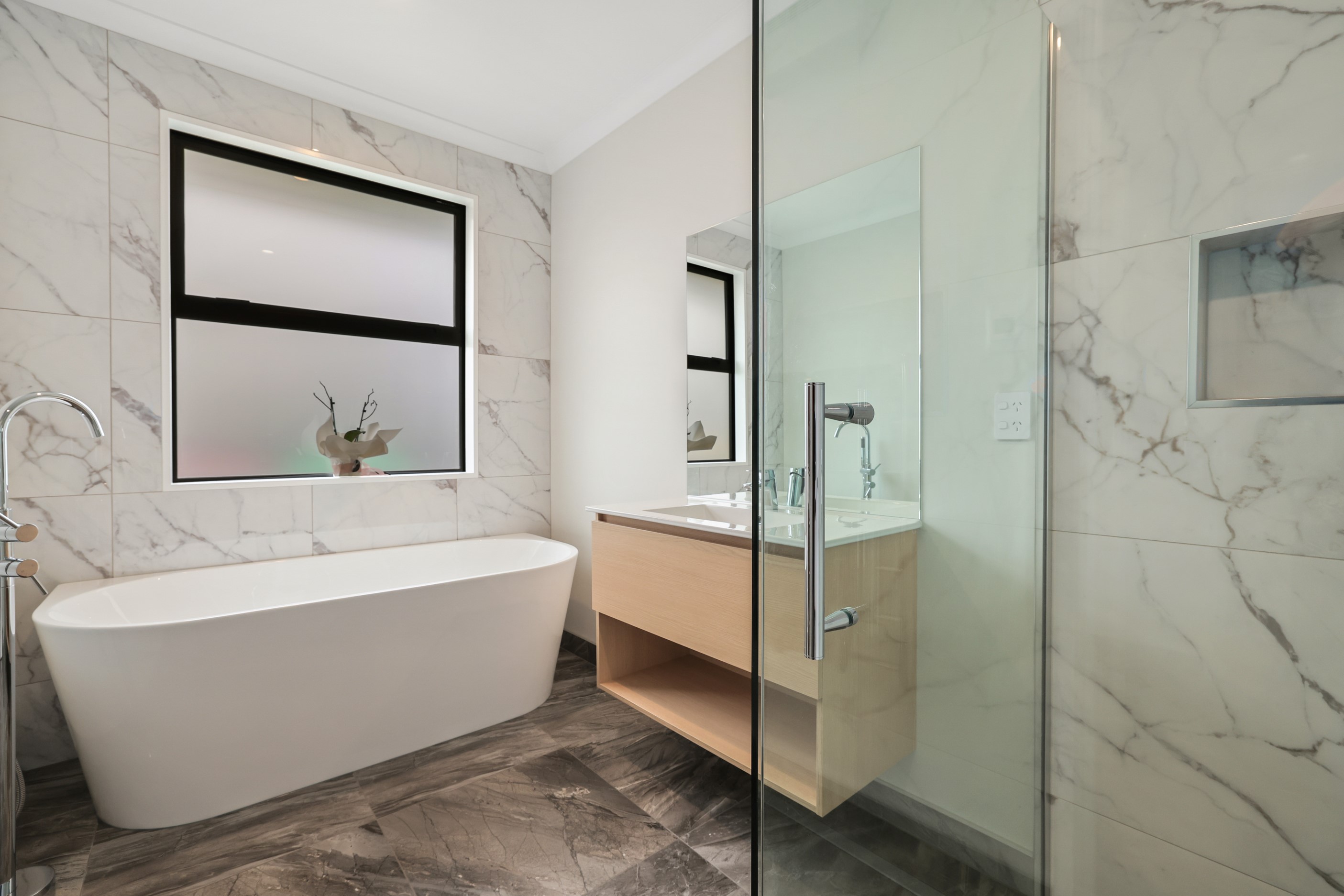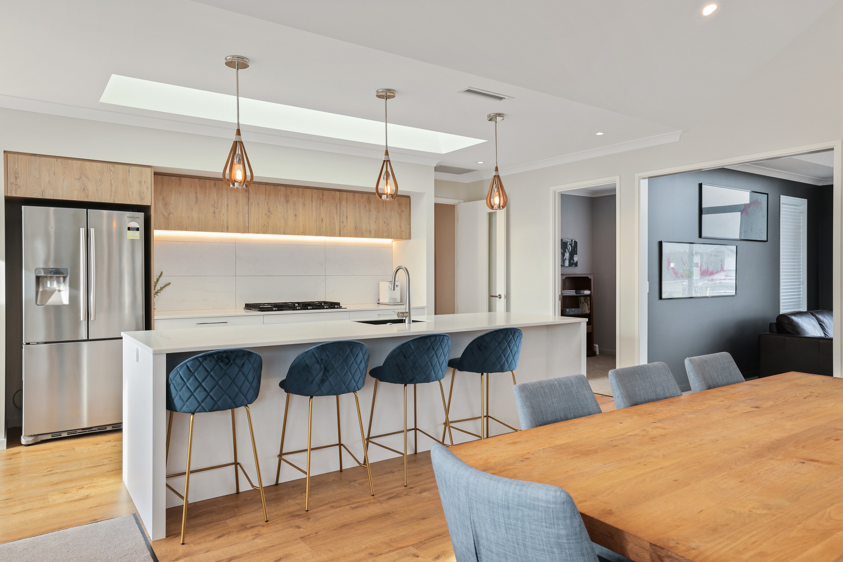 Elegant gable rooflines combine with crisp plaster cladding to create instant street appeal for this modern, stylish home. Feature schist and vertical cedar add to the exterior interest. The four-bedroom home offers 265sqm of floor area and has been designed to meet the homeowner’s brief. The living areas are light and bright with a raking ceiling, and the inbuilt gasfire creates a cosy haven in winter. An executive kitchen forms the heart of the open-plan living space and is complete with a generously sized walk-in pantry, expansive benches and plenty of natural light – thanks to large skylights and windows. A separate lounge adjoins the main living area and is complemented by raking ceilings and a full-height window overlooking the front of the property. Leading from the dining space is an inviting, covered alfresco area that features an outdoor gas fire with an attractive schist surround. The main suite is complete with a luxurious ensuite and walk-in wardrobe. A large family bathroom, separate toilet, laundry, and double garage complete the home.