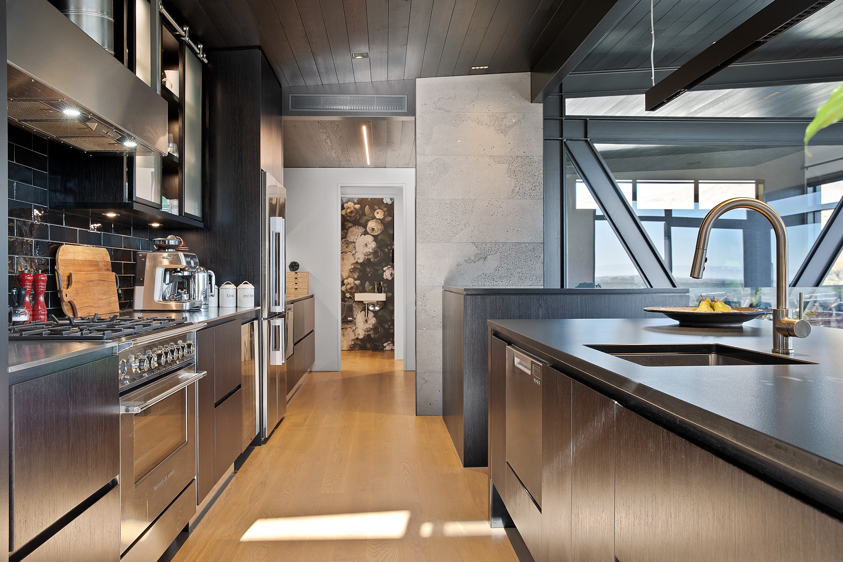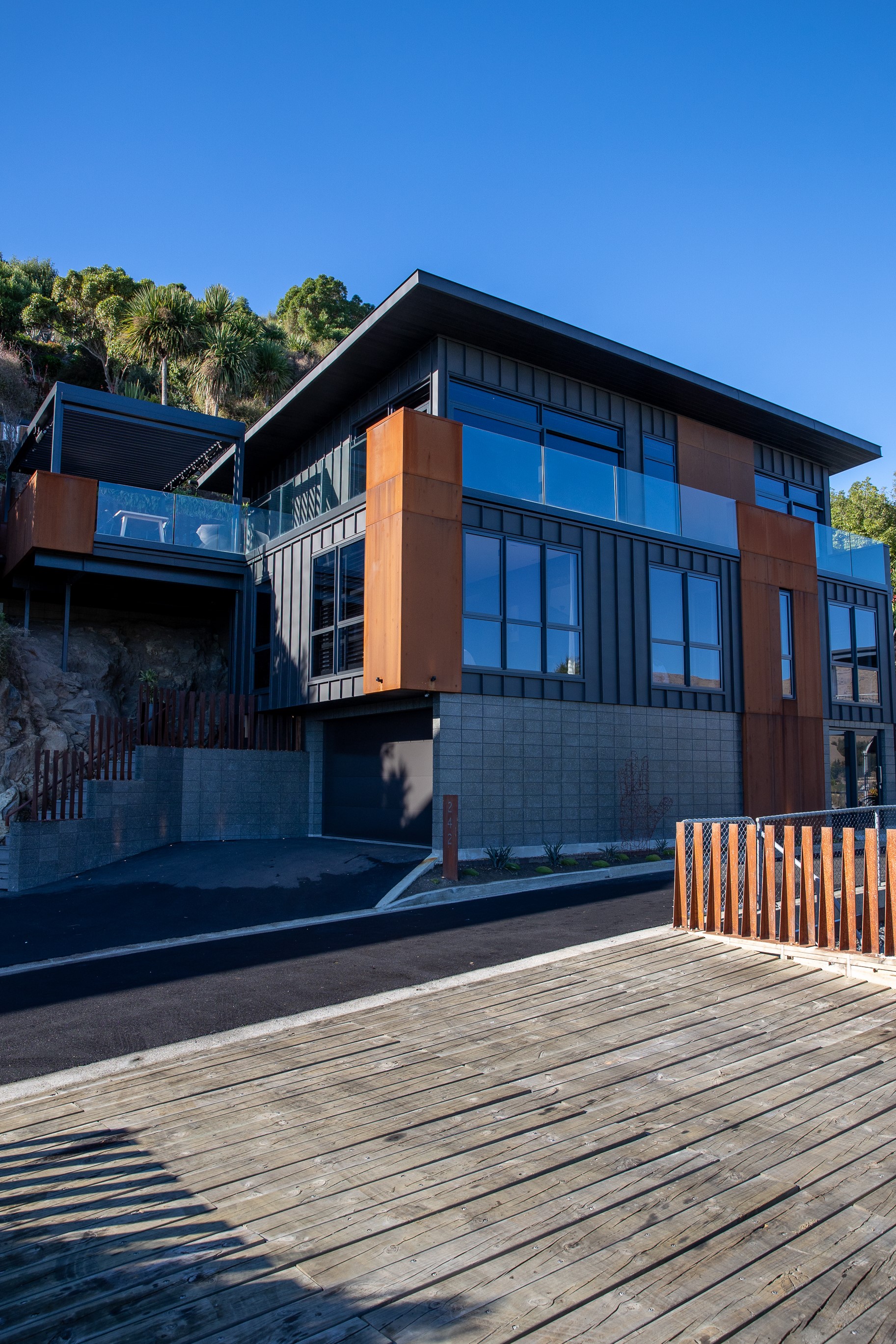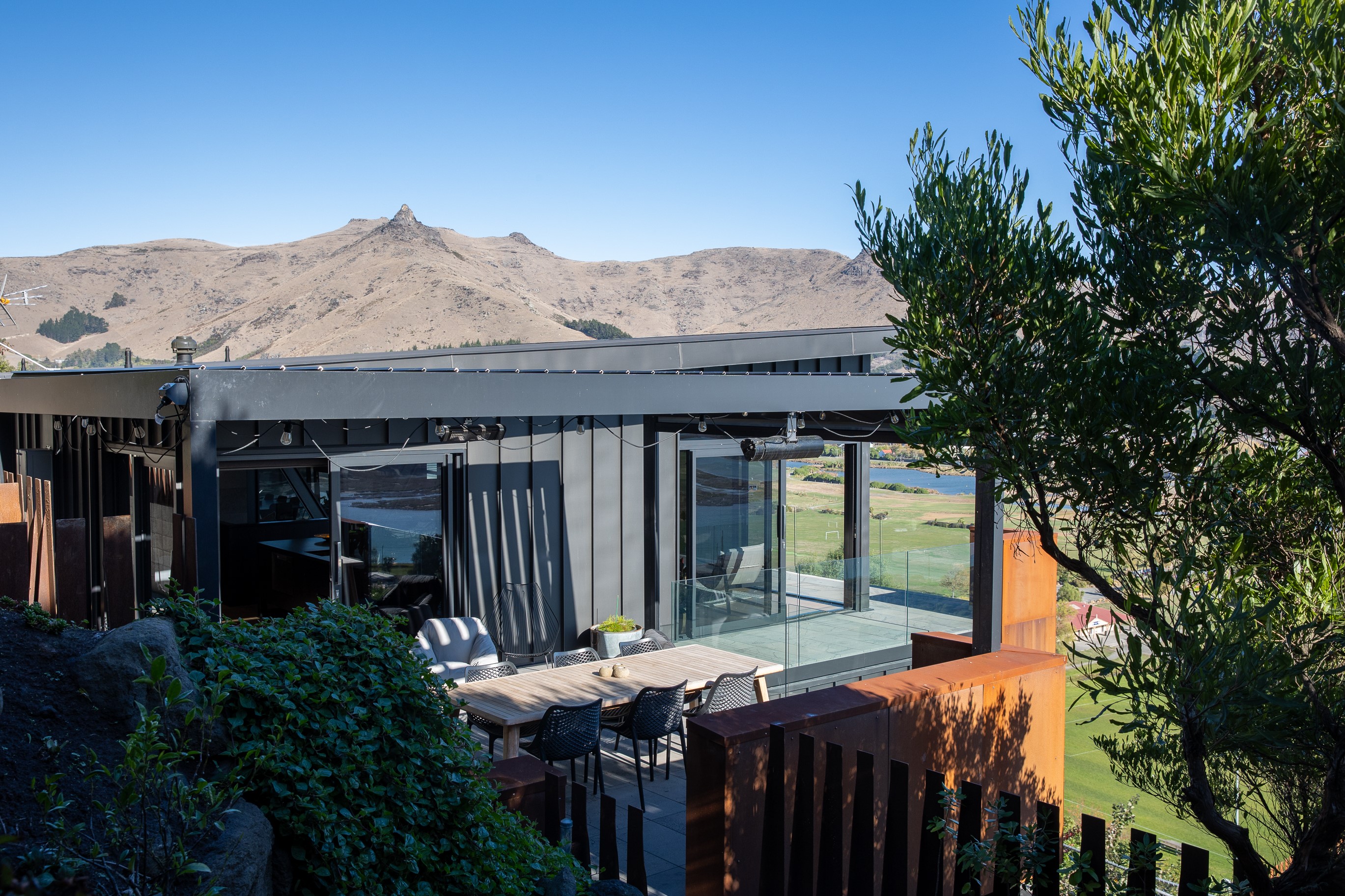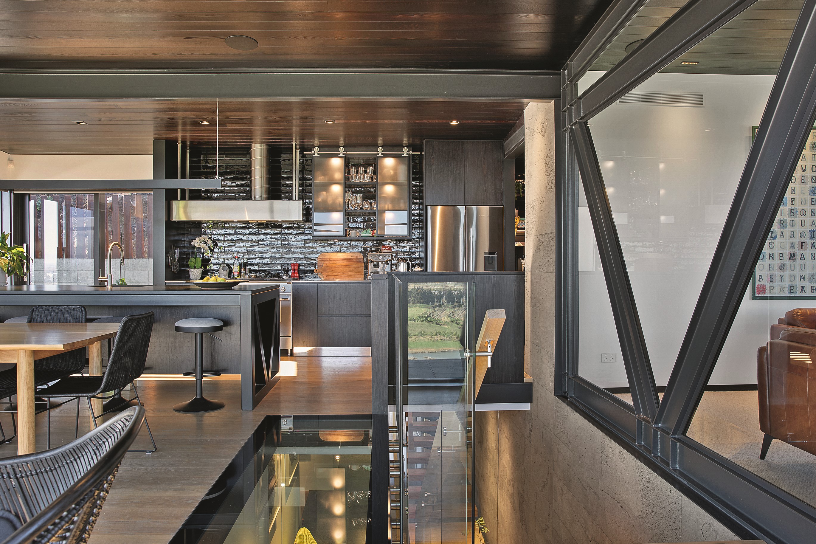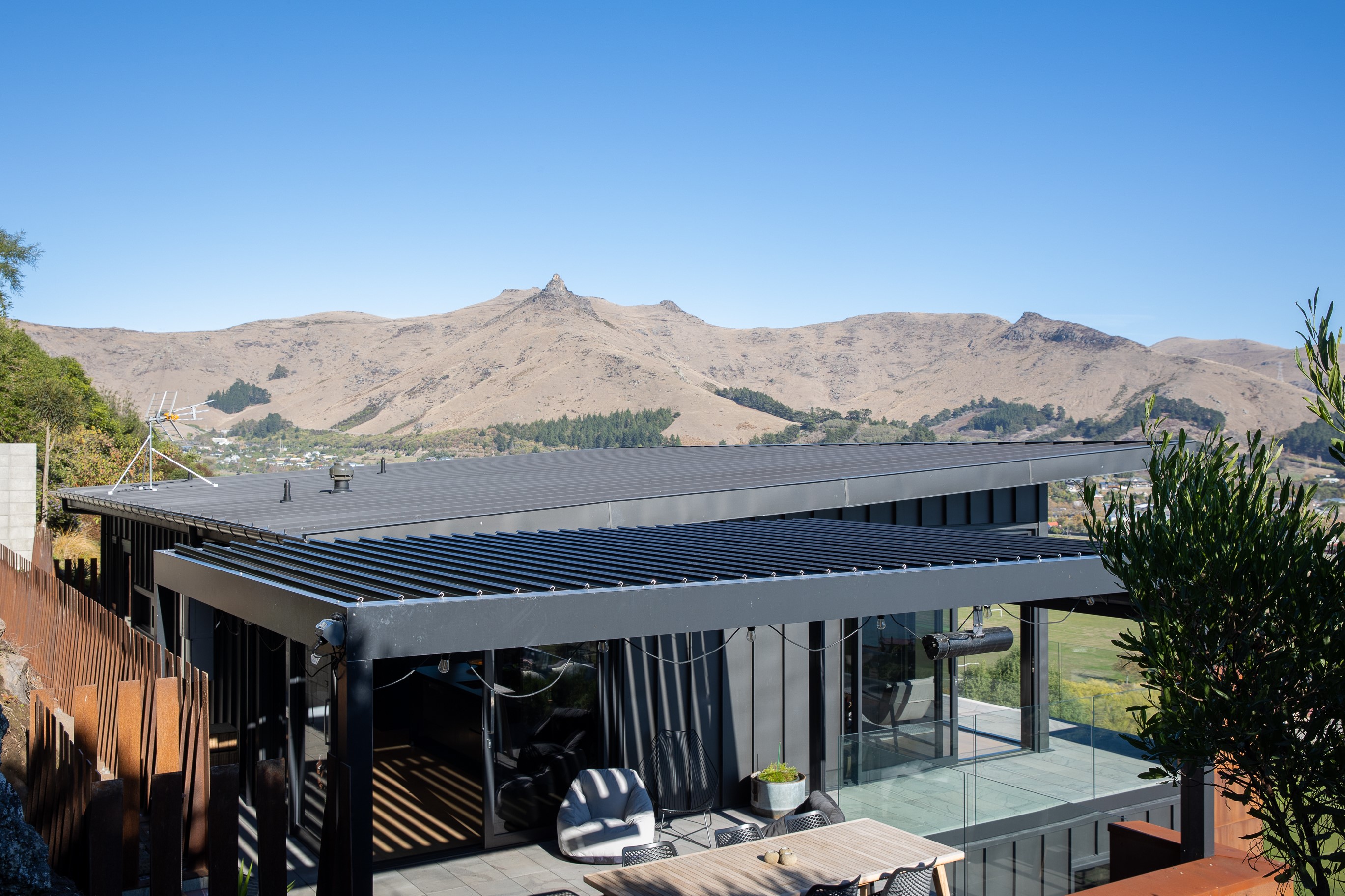 Substantial living on a small footprint is what this home carved into the hillside offers. In 280sqm, you have three levels with three bedrooms and three bathrooms. You’ll find two living areas, a mudroom and a double garage too. The house has been built with an eye to the future, with steel and zinc cladding that ensures the owners can enjoy low-maintenance living on this challenging, sloping section. This house is packed with features. Extensive glazing throughout frames views over Christchurch, the Avon Heathcote Estuary and Southern Alps in the distance. Doors to the balcony beckon the outdoors in and invite the owners outside. Exposed structural steel and timber-lined ceilings add drama to the living spaces. These materials are perfectly complemented by the sleek kitchen in gunmetal grey. Grey shades are repeated in the bathrooms and other parts of the home. A glazed panel on the first floor lets natural light flood into the entrance and throws a spotlight on the feature stairway with floating timber treads.