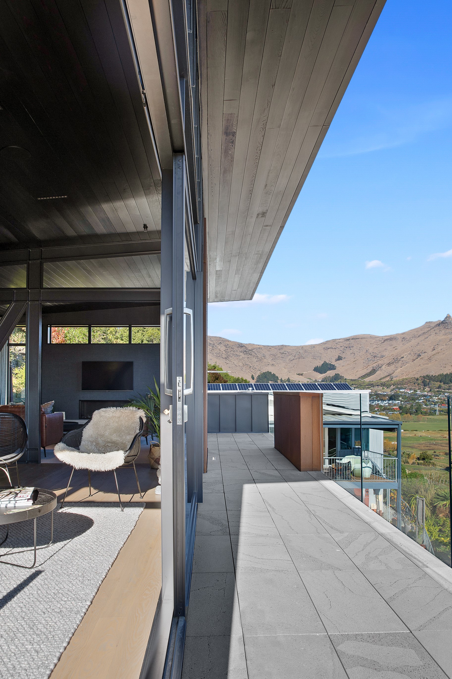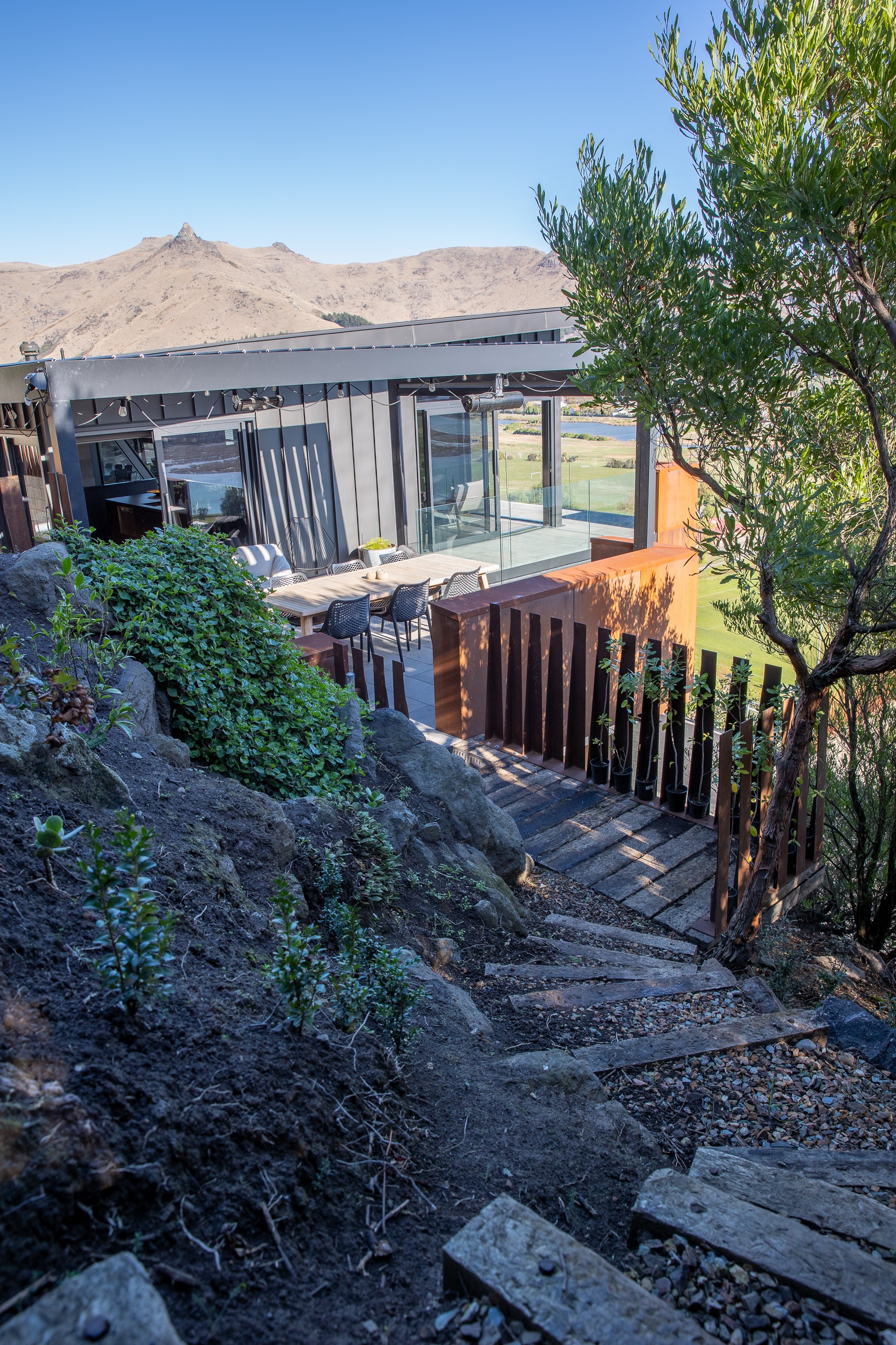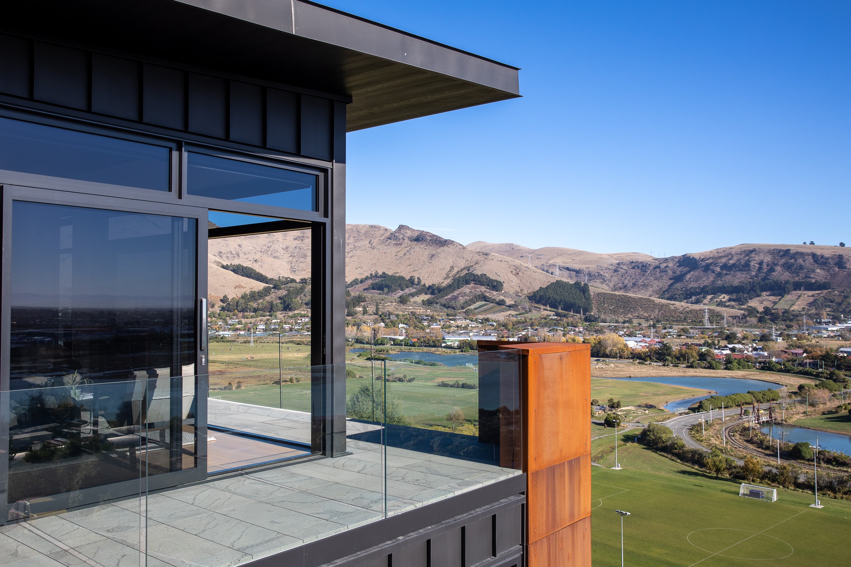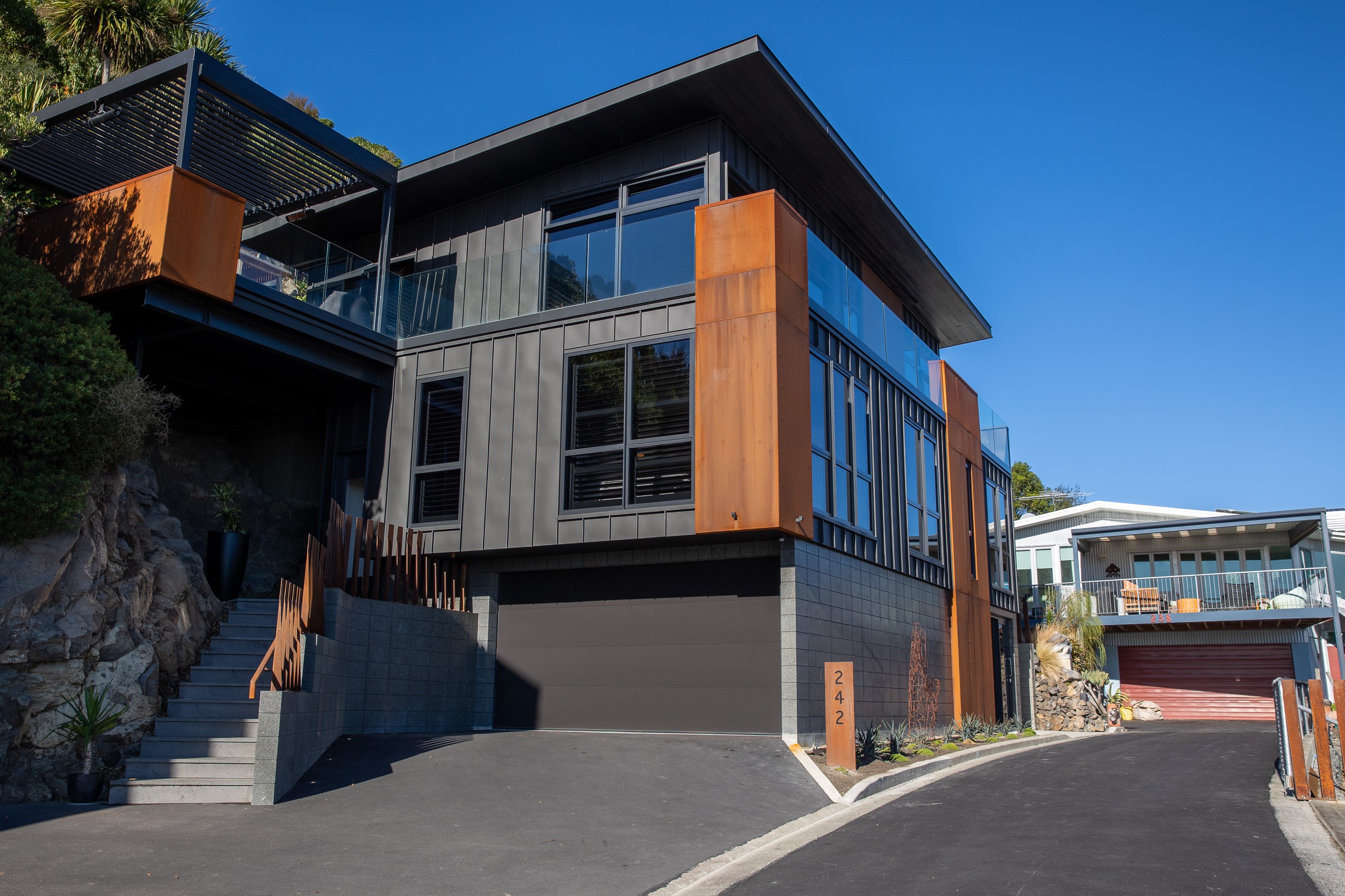 Substantial living on a small footprint is what this home carved into the hillside offers. In 280sqm, you have three levels with three bedrooms and three bathrooms. You’ll find two living areas, a mudroom and a double garage too. The house has been built with an eye to the future, with steel and zinc cladding that ensures the owners can enjoy low-maintenance living on this challenging, sloping section. This house is packed with features. Extensive glazing throughout frames views over Christchurch, the Avon Heathcote Estuary and Southern Alps in the distance. Doors to the balcony beckon the outdoors in and invite the owners outside. Exposed structural steel and timber-lined ceilings add drama to the living spaces. These materials are perfectly complemented by the sleek kitchen in gunmetal grey. Grey shades are repeated in the bathrooms and other parts of the home. A glazed panel on the first floor lets natural light flood into the entrance and throws a spotlight on the feature stairway with floating timber treads.