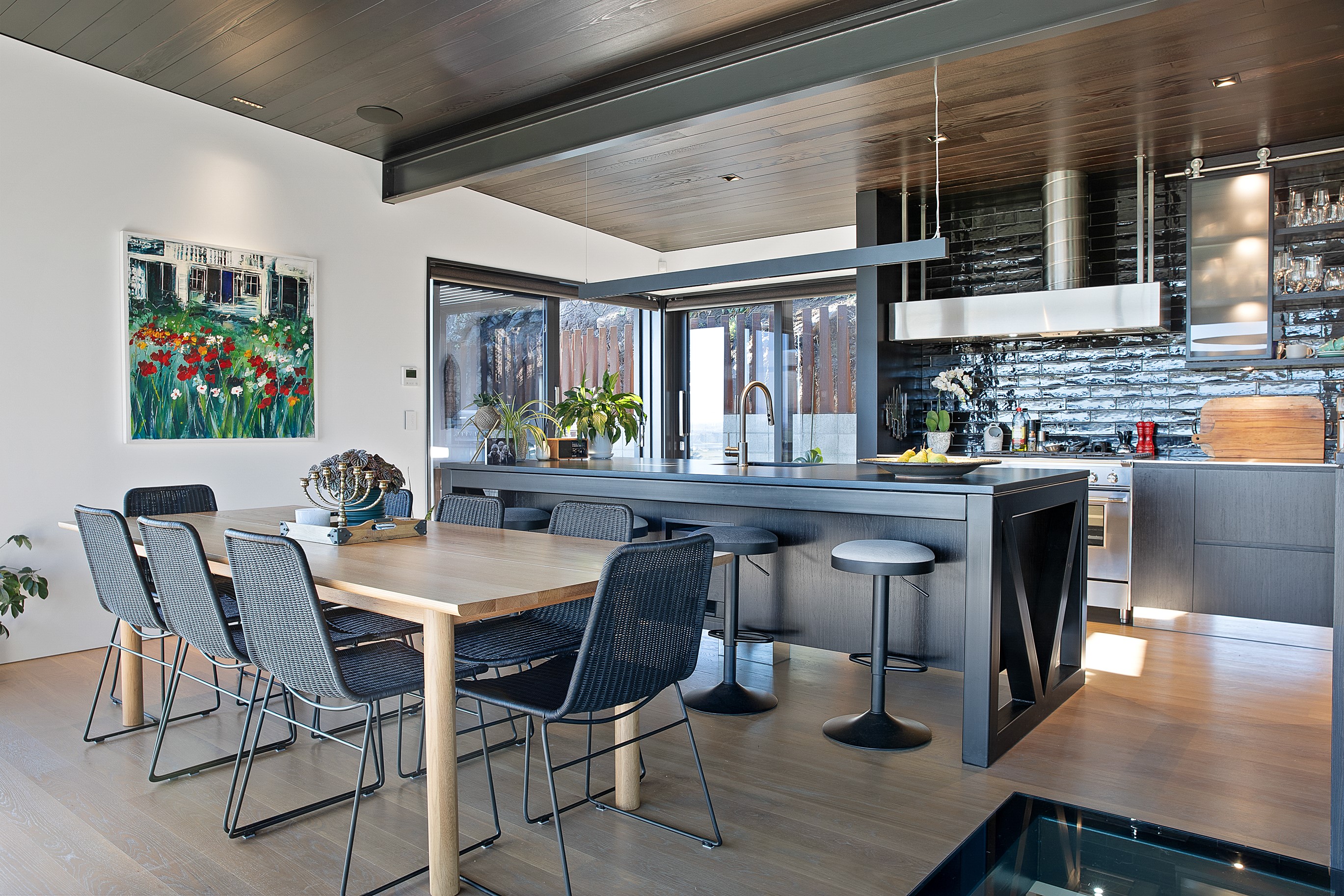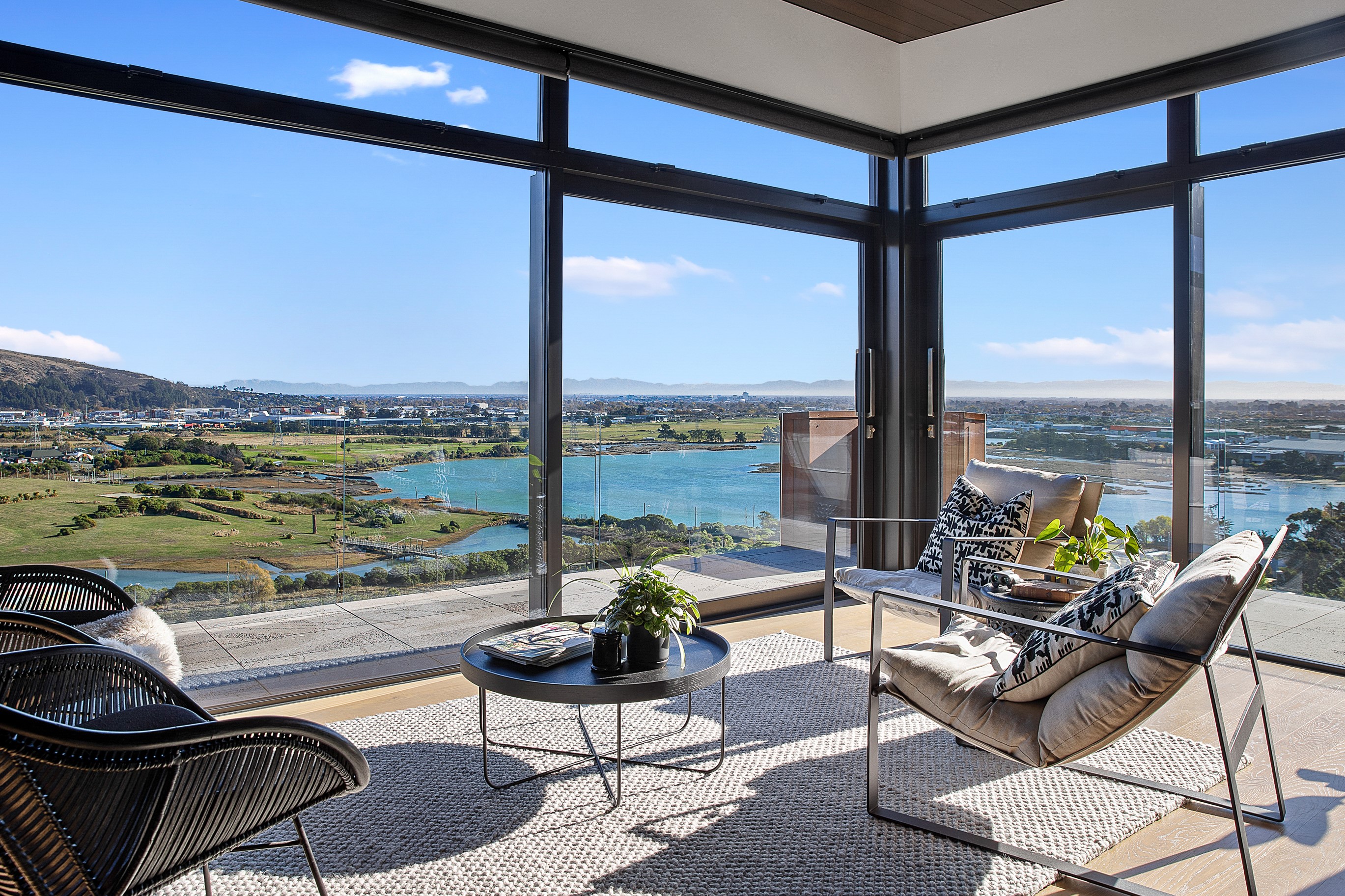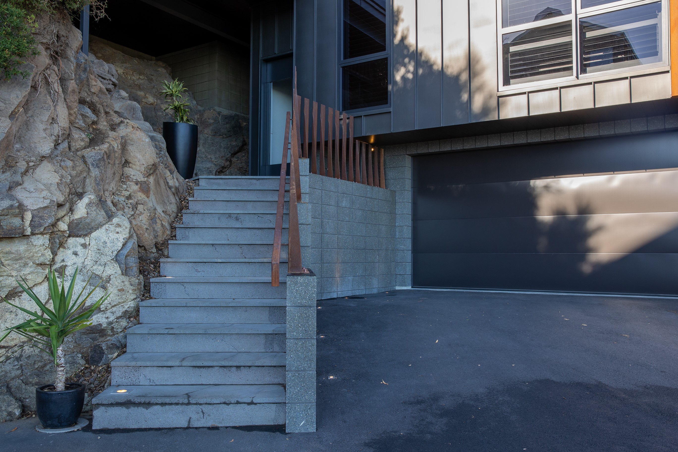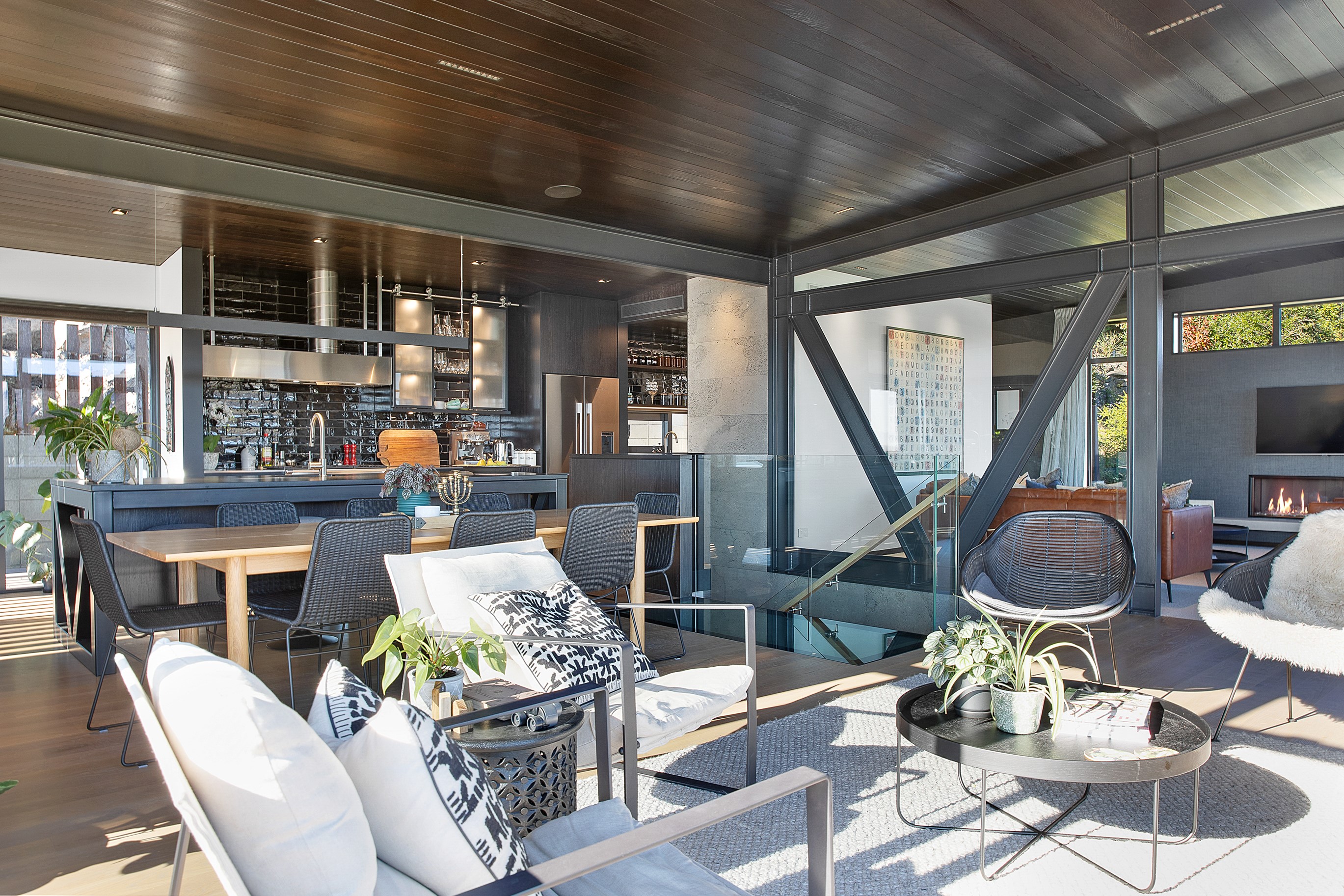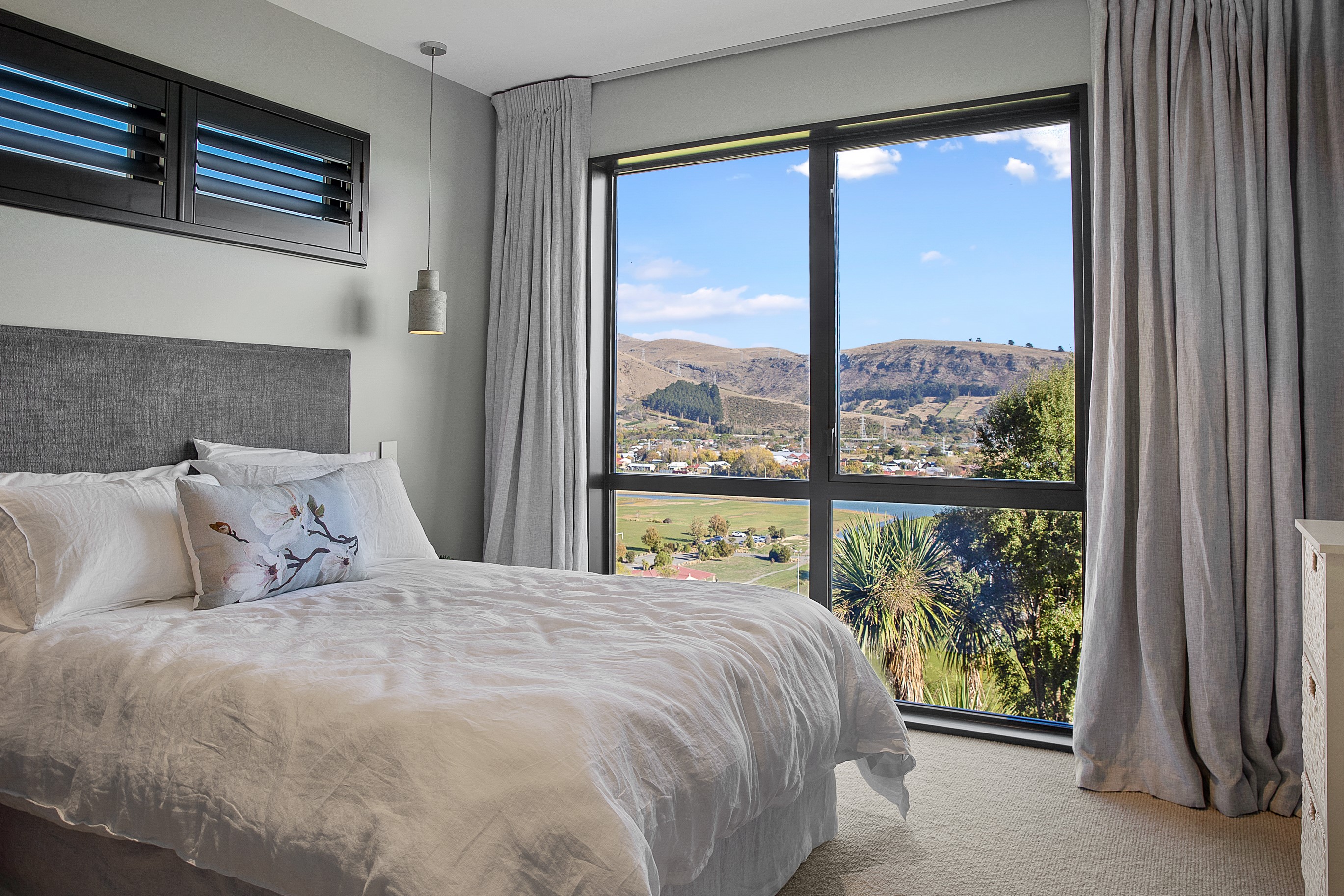 Substantial living on a small footprint is what this home carved into the hillside offers. In 280sqm, you have three levels with three bedrooms and three bathrooms. You’ll find two living areas, a mudroom and a double garage too. The house has been built with an eye to the future, with steel and zinc cladding that ensures the owners can enjoy low-maintenance living on this challenging, sloping section. This house is packed with features. Extensive glazing throughout frames views over Christchurch, the Avon Heathcote Estuary and Southern Alps in the distance. Doors to the balcony beckon the outdoors in and invite the owners outside. Exposed structural steel and timber-lined ceilings add drama to the living spaces. These materials are perfectly complemented by the sleek kitchen in gunmetal grey. Grey shades are repeated in the bathrooms and other parts of the home. A glazed panel on the first floor lets natural light flood into the entrance and throws a spotlight on the feature stairway with floating timber treads.