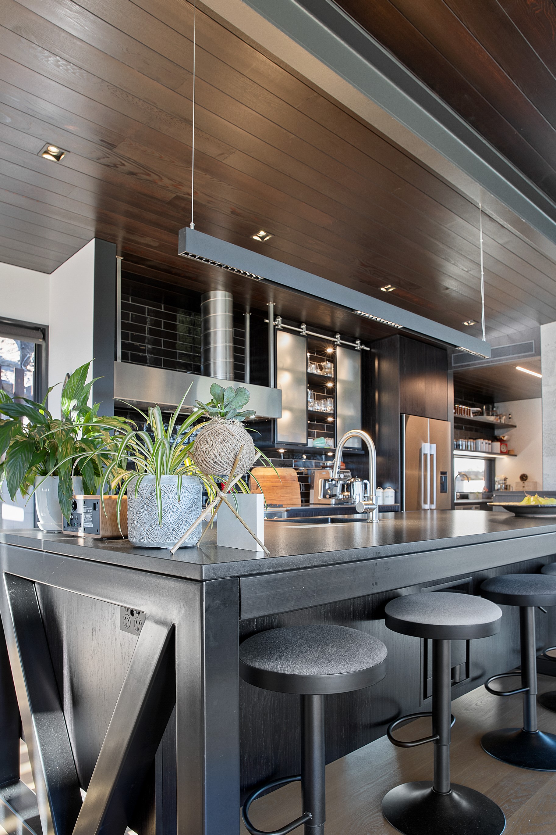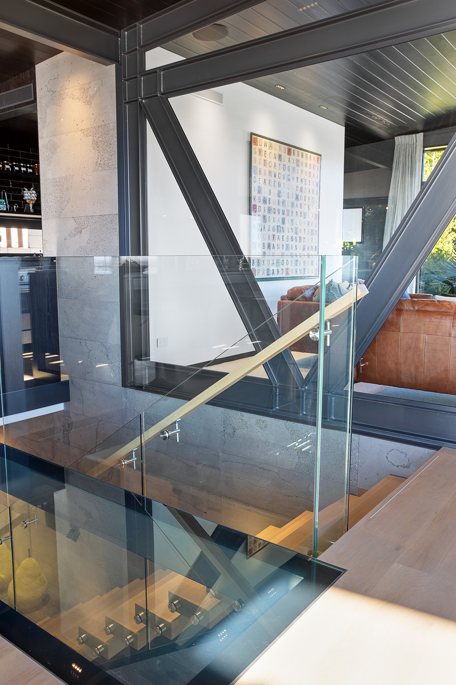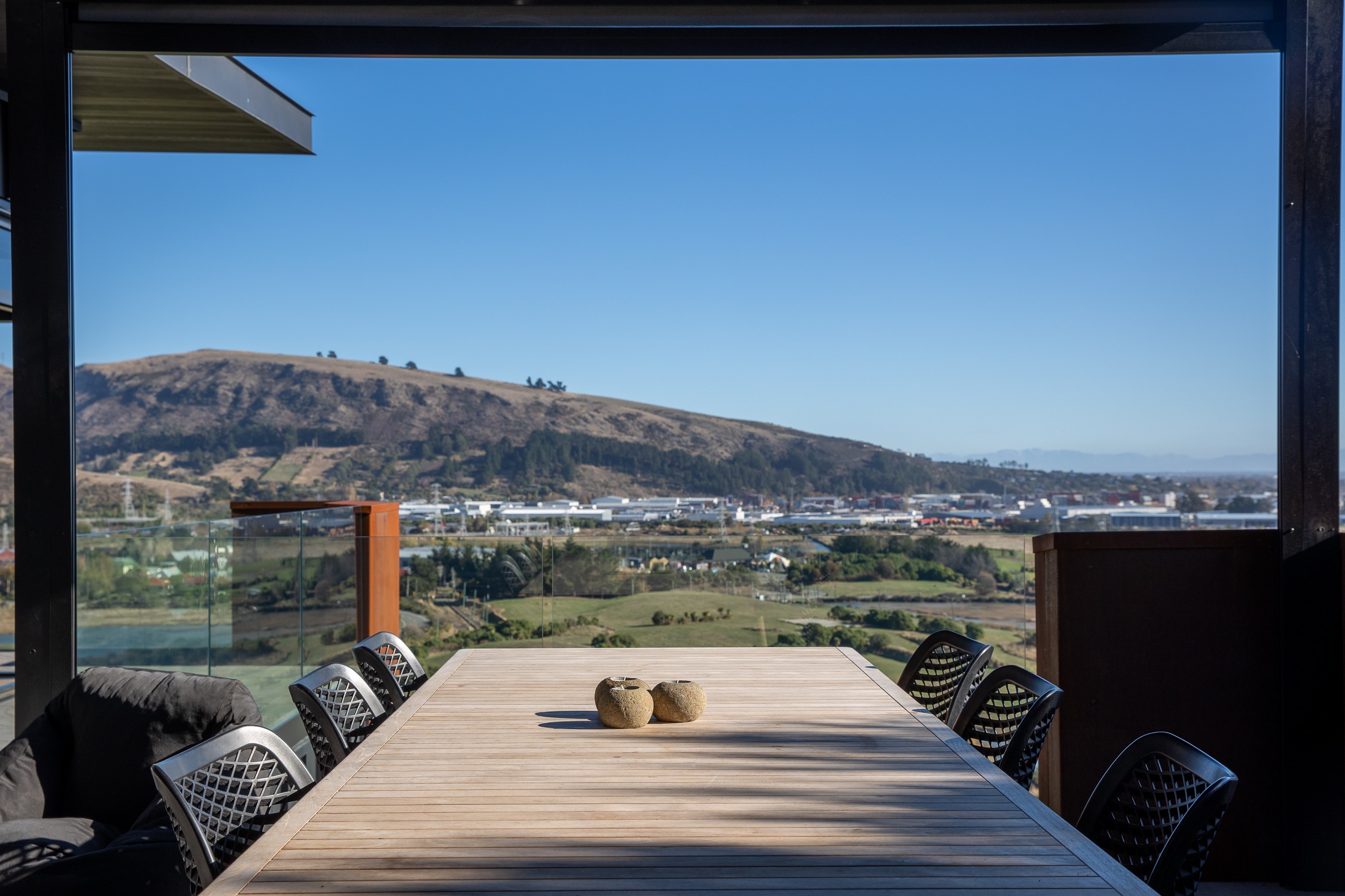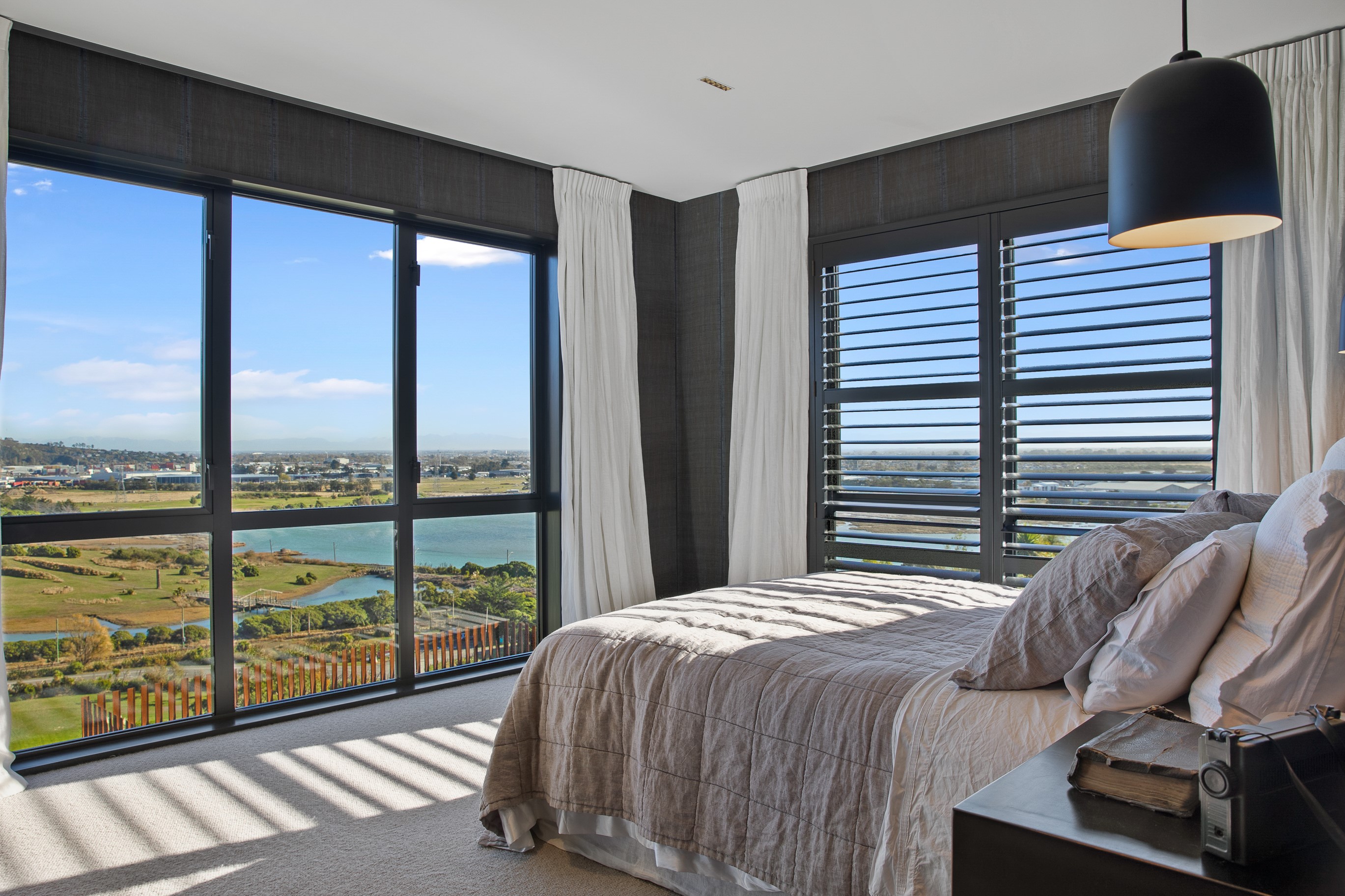 Substantial living on a small footprint is what this home carved into the hillside offers. In 280sqm, you have three levels with three bedrooms and three bathrooms. You’ll find two living areas, a mudroom and a double garage too. The house has been built with an eye to the future, with steel and zinc cladding that ensures the owners can enjoy low-maintenance living on this challenging, sloping section. This house is packed with features. Extensive glazing throughout frames views over Christchurch, the Avon Heathcote Estuary and Southern Alps in the distance. Doors to the balcony beckon the outdoors in and invite the owners outside. Exposed structural steel and timber-lined ceilings add drama to the living spaces. These materials are perfectly complemented by the sleek kitchen in gunmetal grey. Grey shades are repeated in the bathrooms and other parts of the home. A glazed panel on the first floor lets natural light flood into the entrance and throws a spotlight on the feature stairway with floating timber treads.