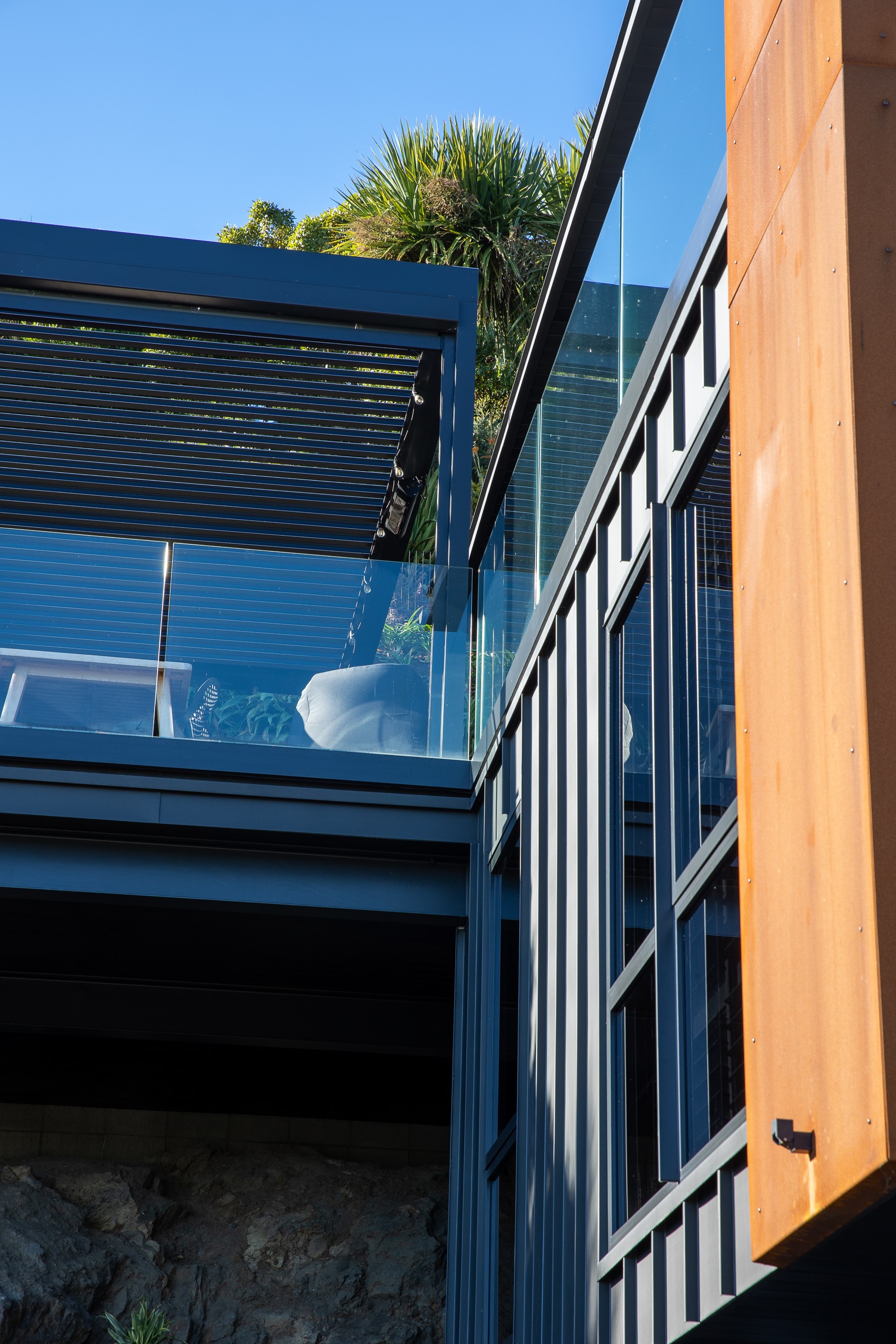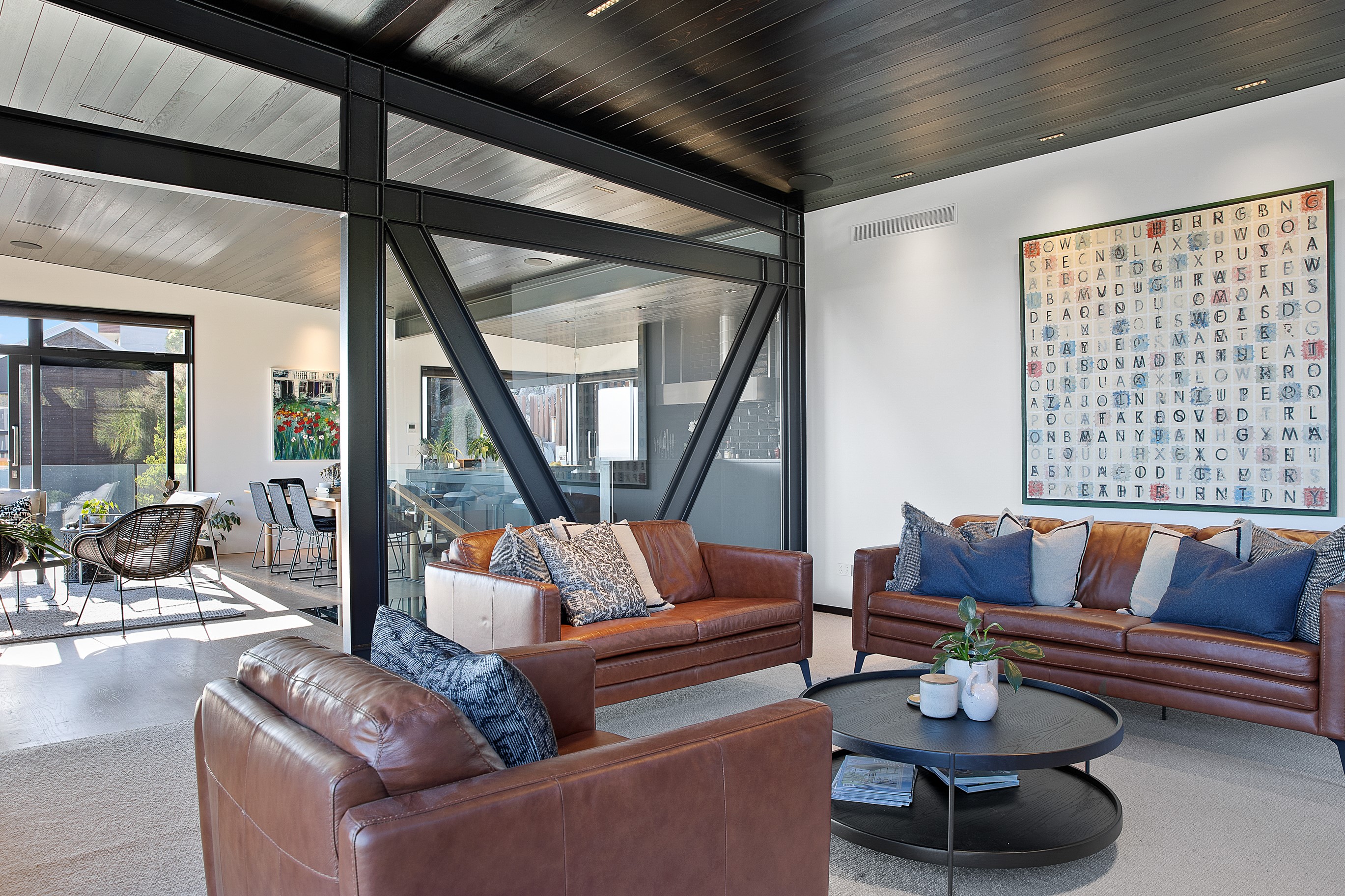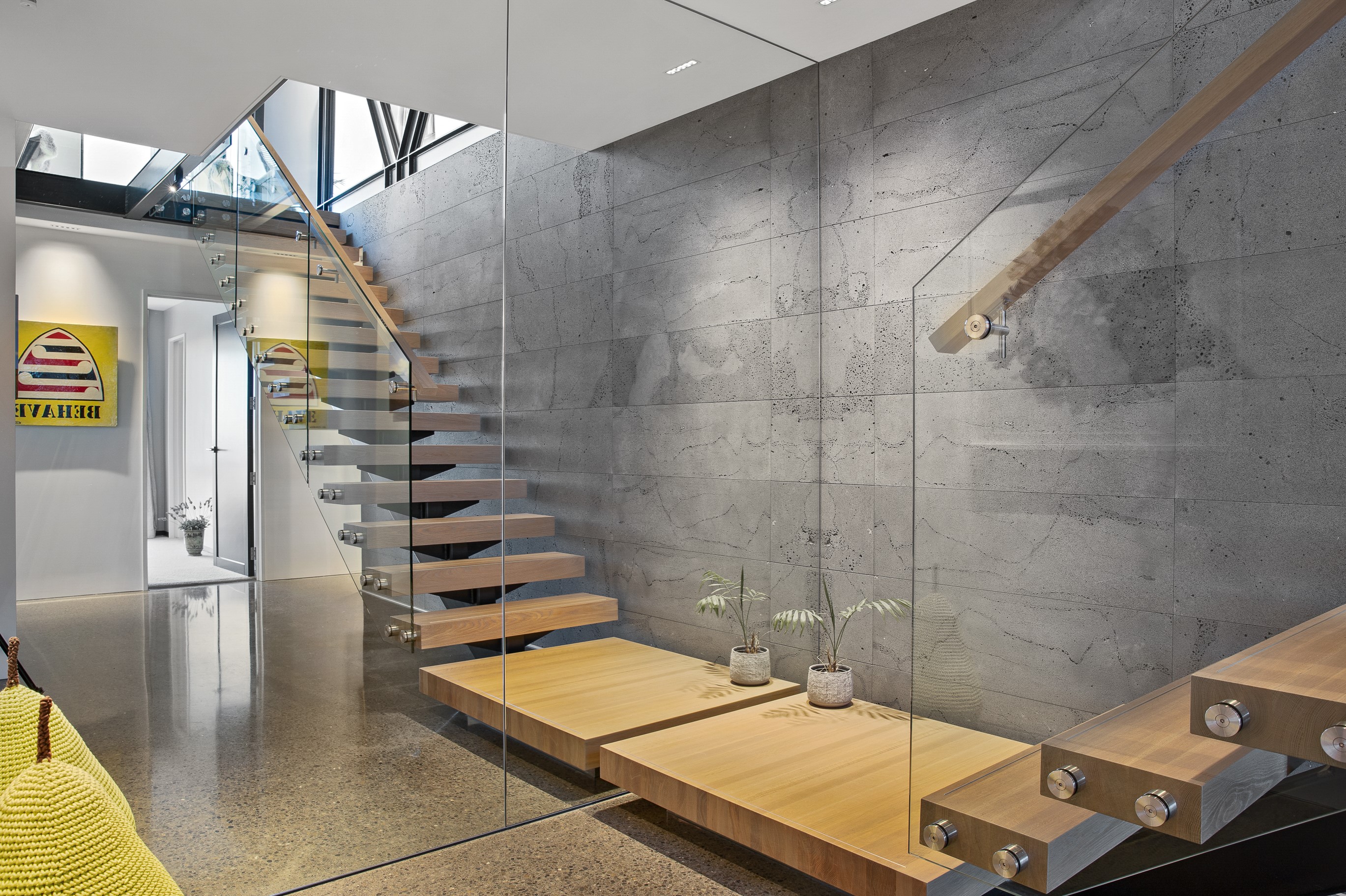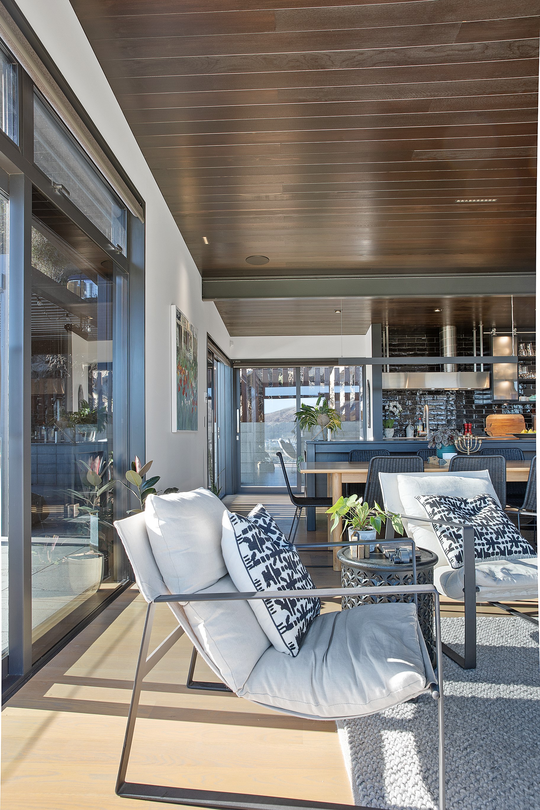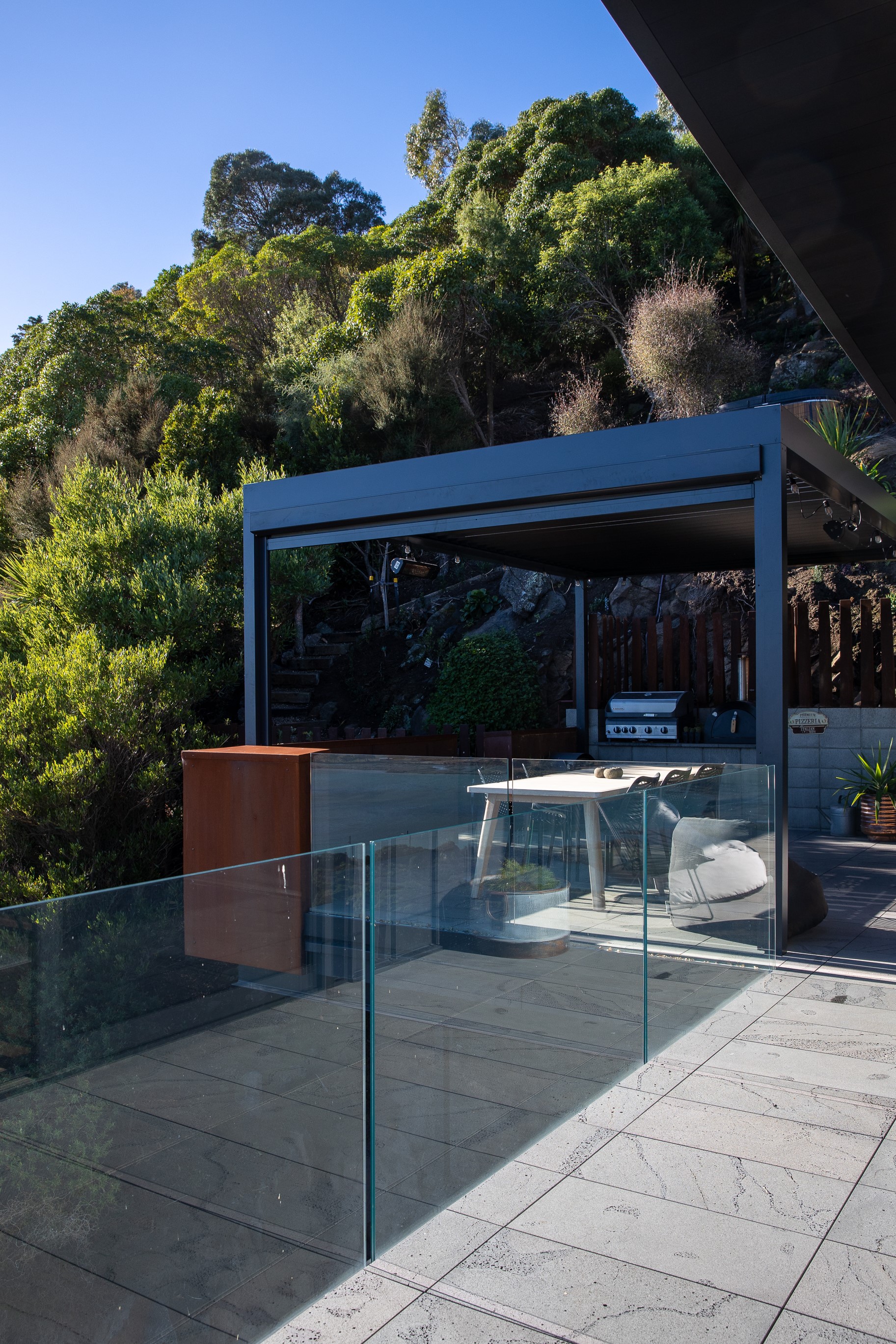 Substantial living on a small footprint is what this home carved into the hillside offers. In 280sqm, you have three levels with three bedrooms and three bathrooms. You’ll find two living areas, a mudroom and a double garage too. The house has been built with an eye to the future, with steel and zinc cladding that ensures the owners can enjoy low-maintenance living on this challenging, sloping section. This house is packed with features. Extensive glazing throughout frames views over Christchurch, the Avon Heathcote Estuary and Southern Alps in the distance. Doors to the balcony beckon the outdoors in and invite the owners outside. Exposed structural steel and timber-lined ceilings add drama to the living spaces. These materials are perfectly complemented by the sleek kitchen in gunmetal grey. Grey shades are repeated in the bathrooms and other parts of the home. A glazed panel on the first floor lets natural light flood into the entrance and throws a spotlight on the feature stairway with floating timber treads.