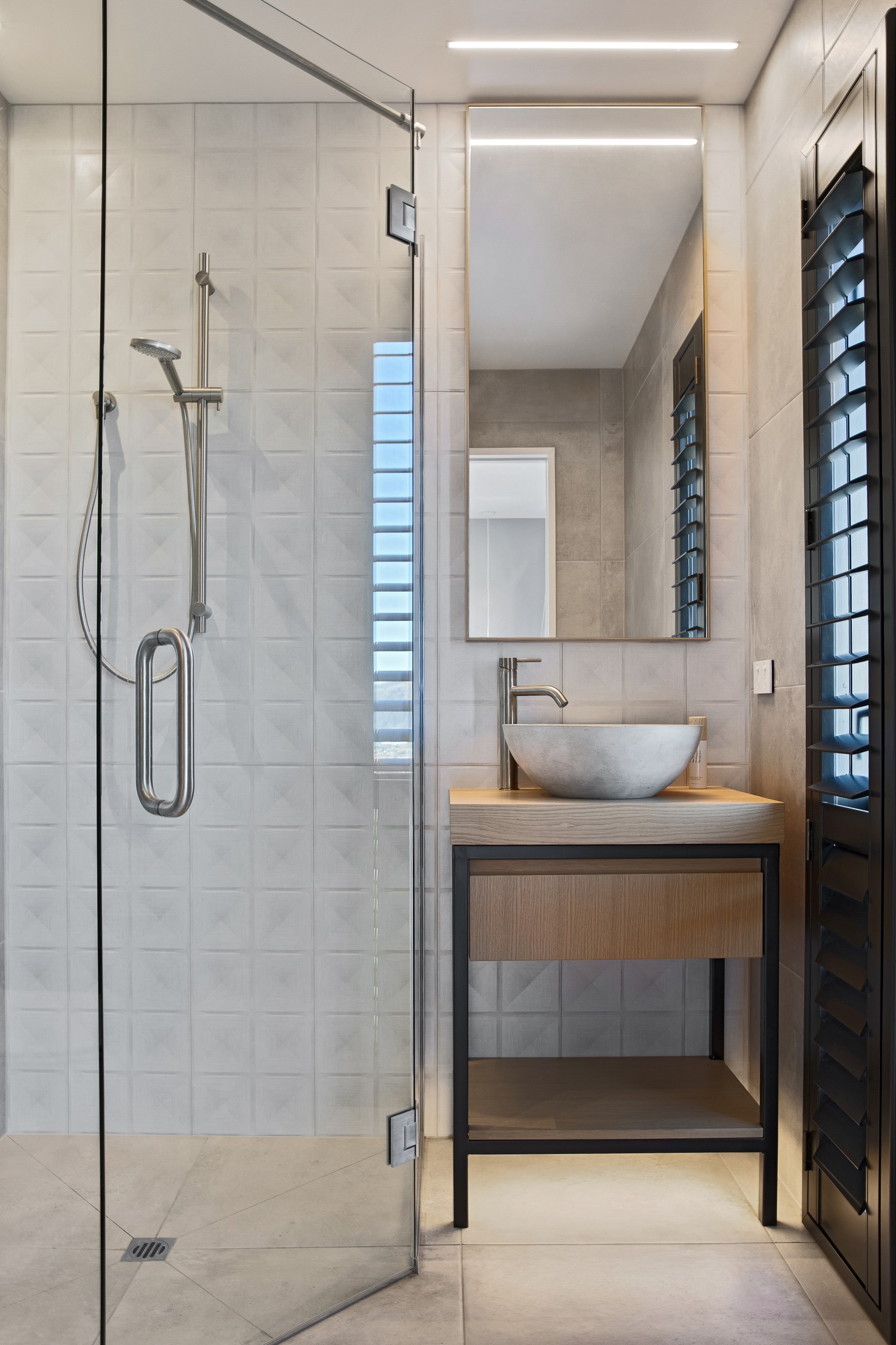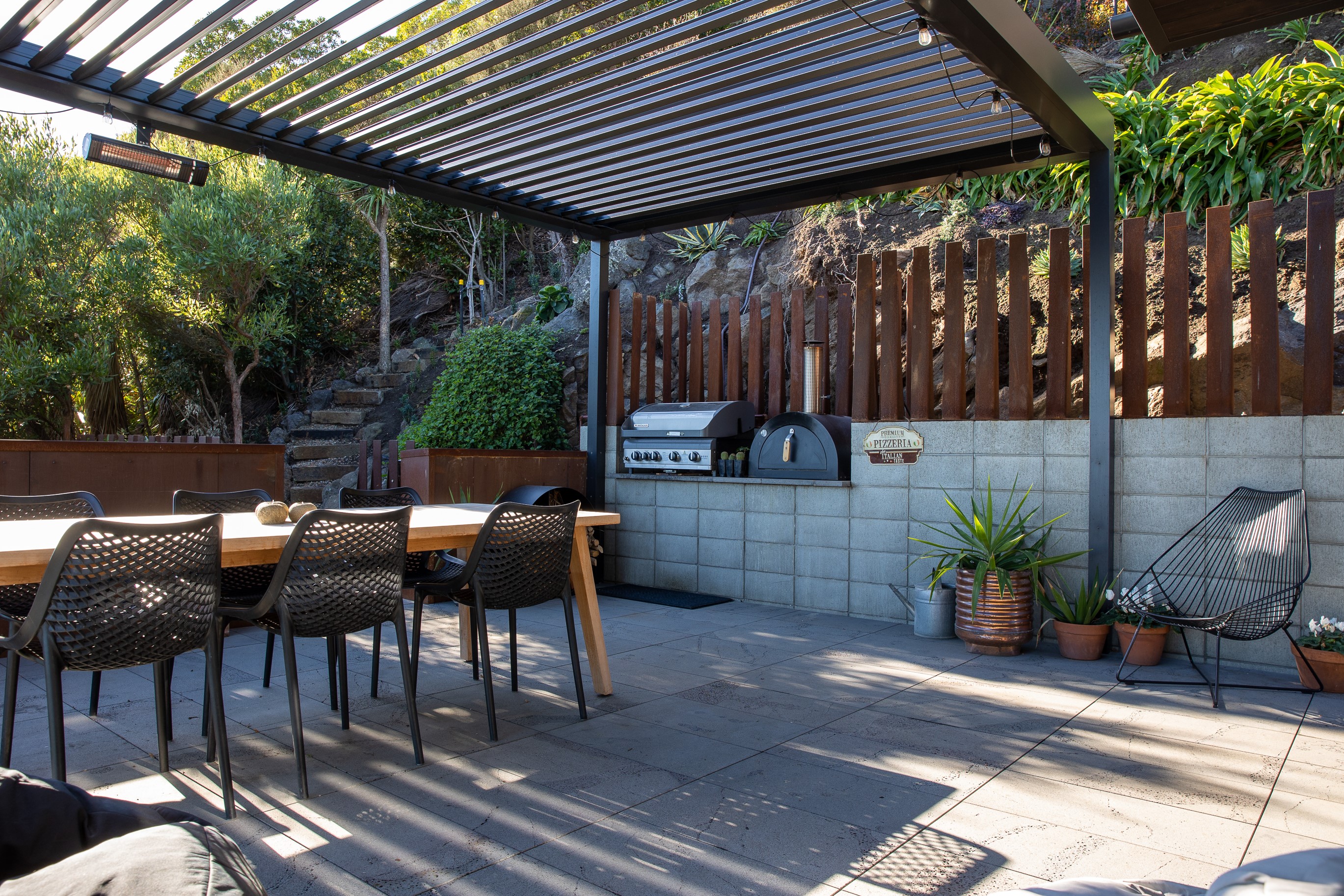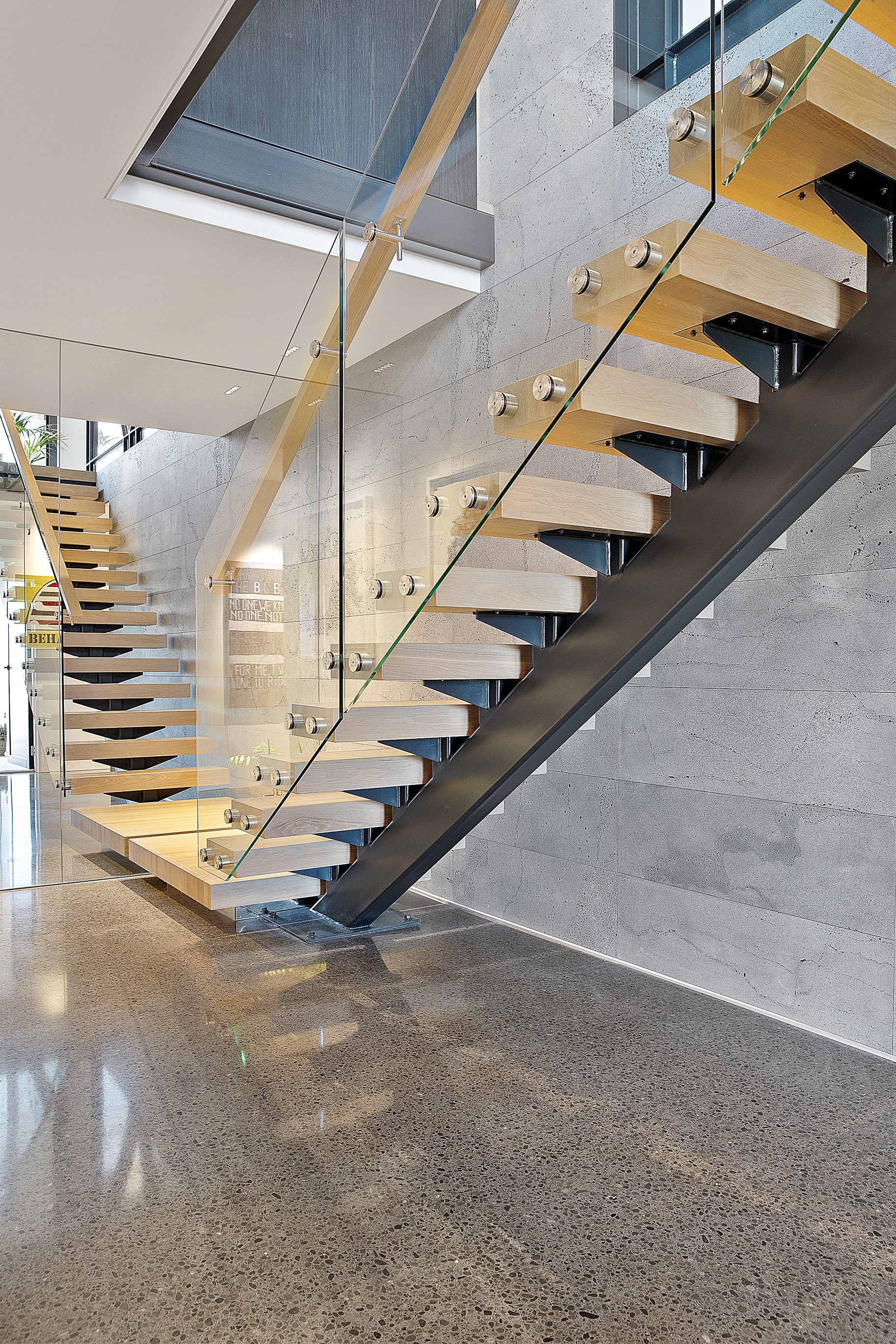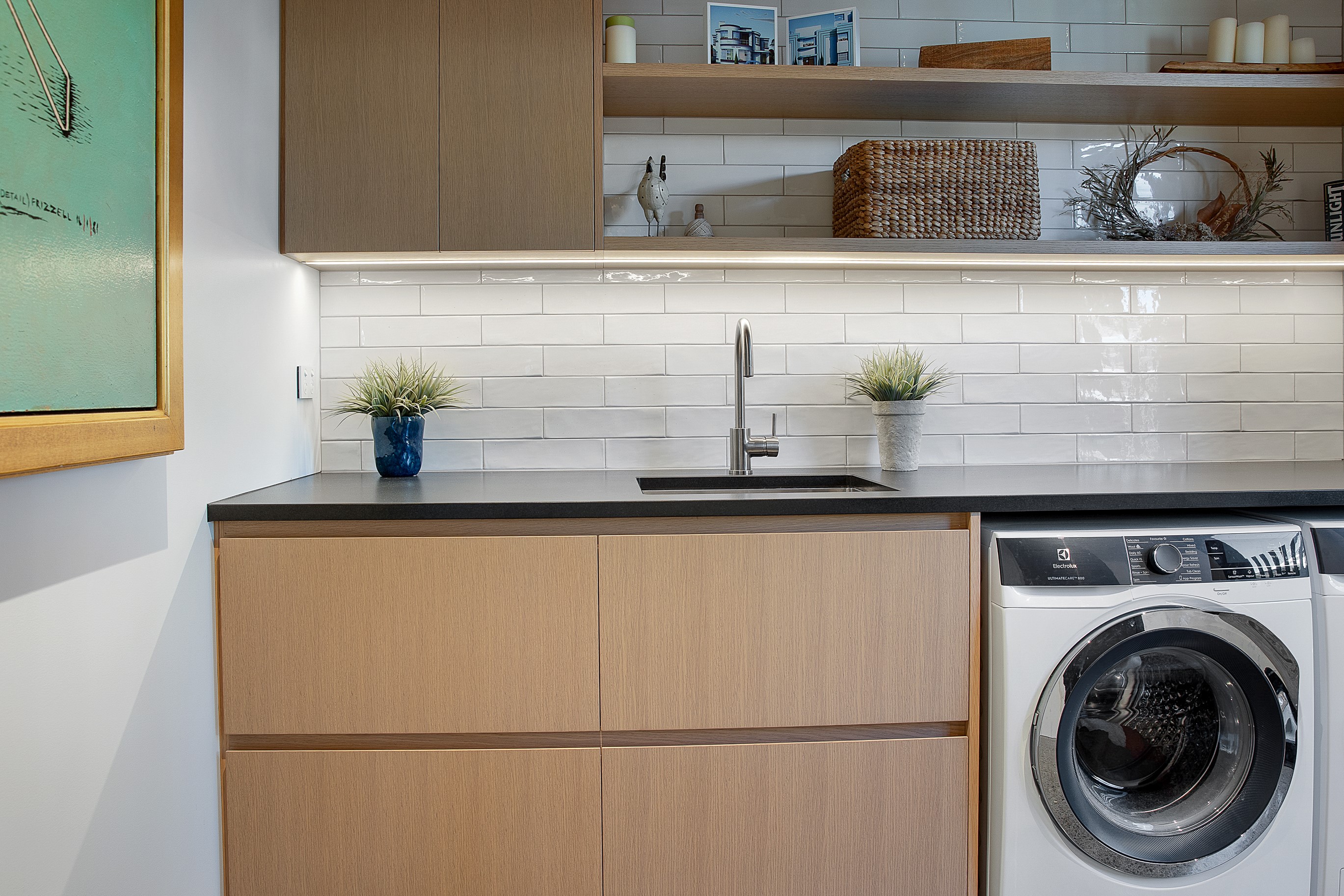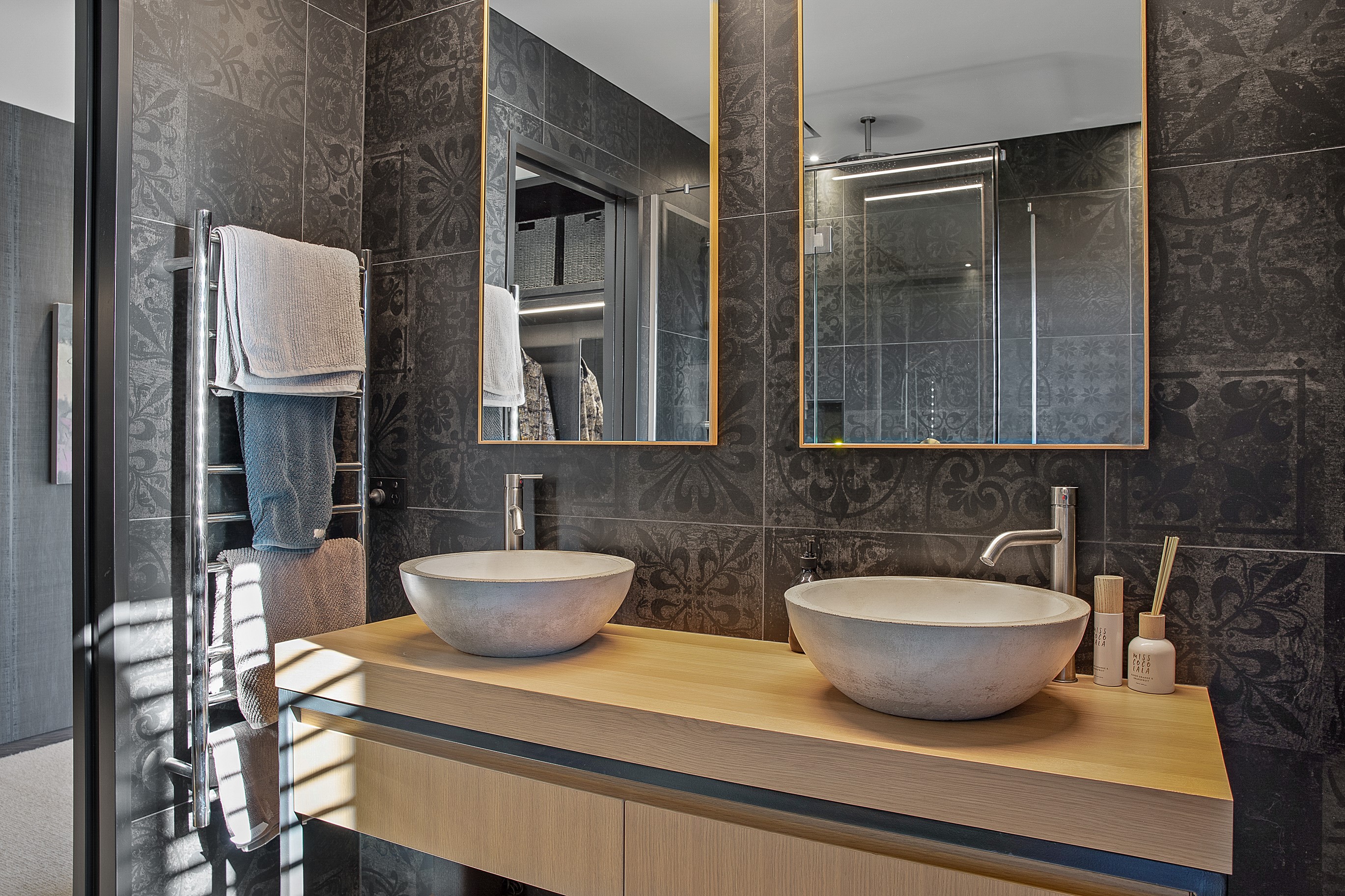 Substantial living on a small footprint is what this home carved into the hillside offers. In 280sqm, you have three levels with three bedrooms and three bathrooms. You’ll find two living areas, a mudroom and a double garage too. The house has been built with an eye to the future, with steel and zinc cladding that ensures the owners can enjoy low-maintenance living on this challenging, sloping section. This house is packed with features. Extensive glazing throughout frames views over Christchurch, the Avon Heathcote Estuary and Southern Alps in the distance. Doors to the balcony beckon the outdoors in and invite the owners outside. Exposed structural steel and timber-lined ceilings add drama to the living spaces. These materials are perfectly complemented by the sleek kitchen in gunmetal grey. Grey shades are repeated in the bathrooms and other parts of the home. A glazed panel on the first floor lets natural light flood into the entrance and throws a spotlight on the feature stairway with floating timber treads.