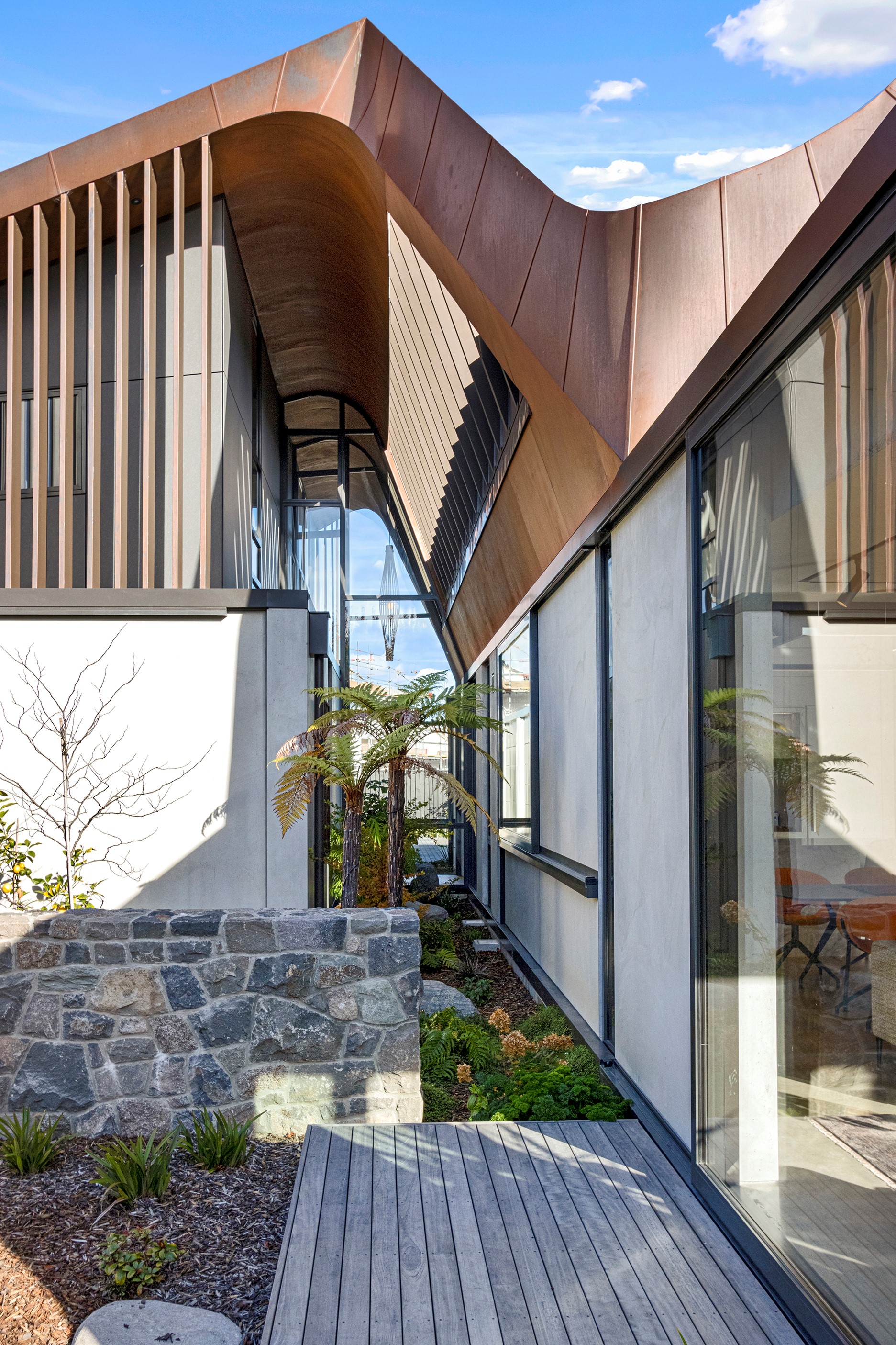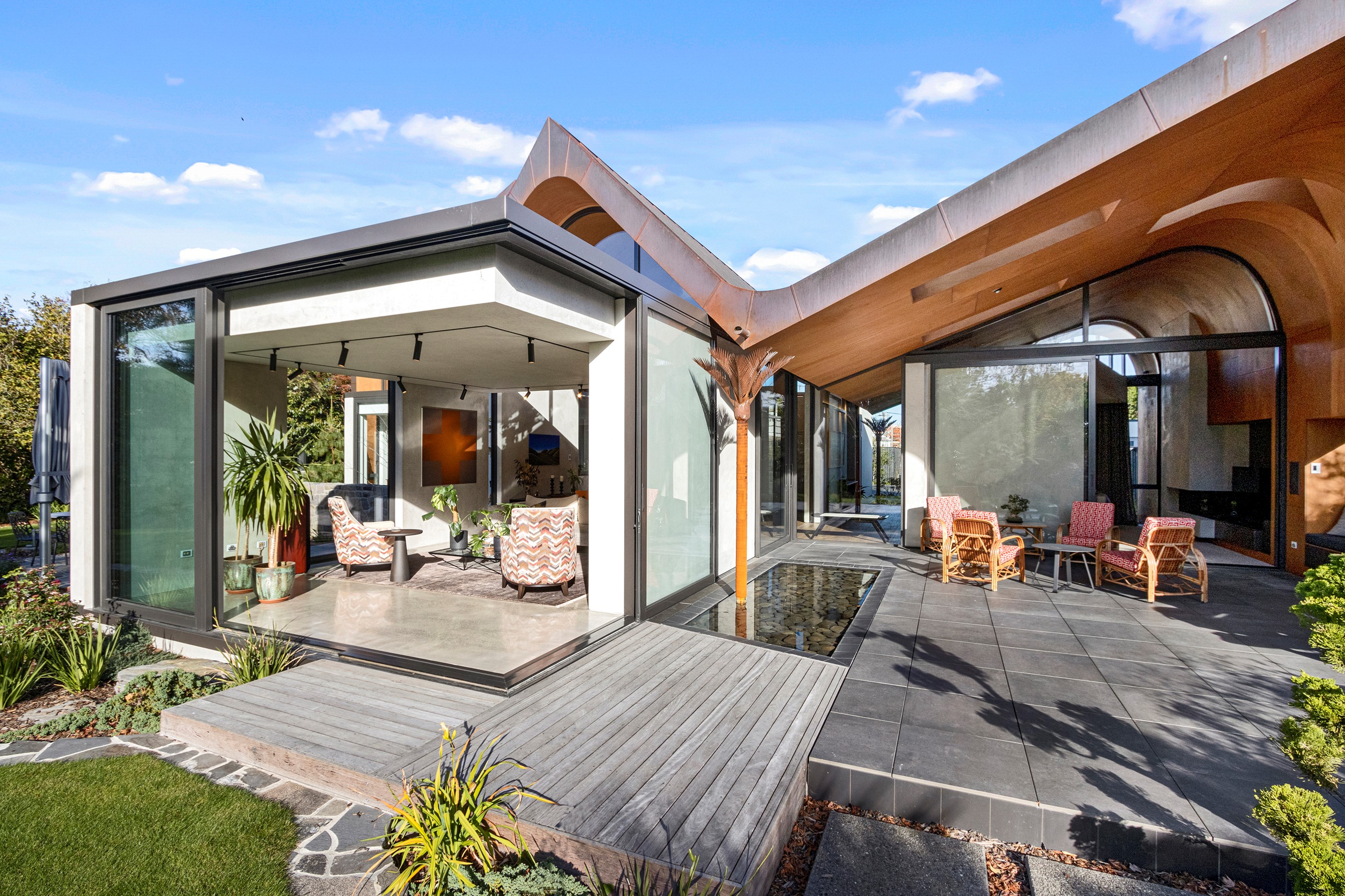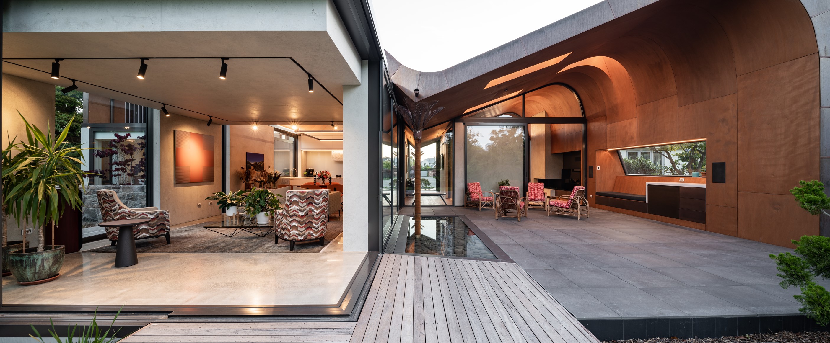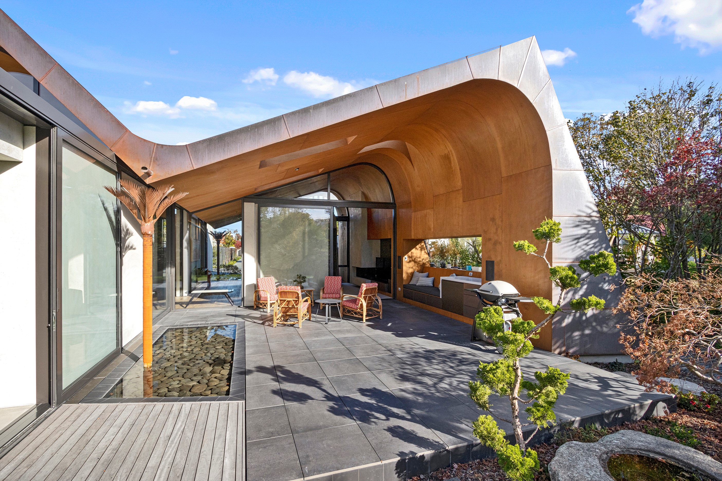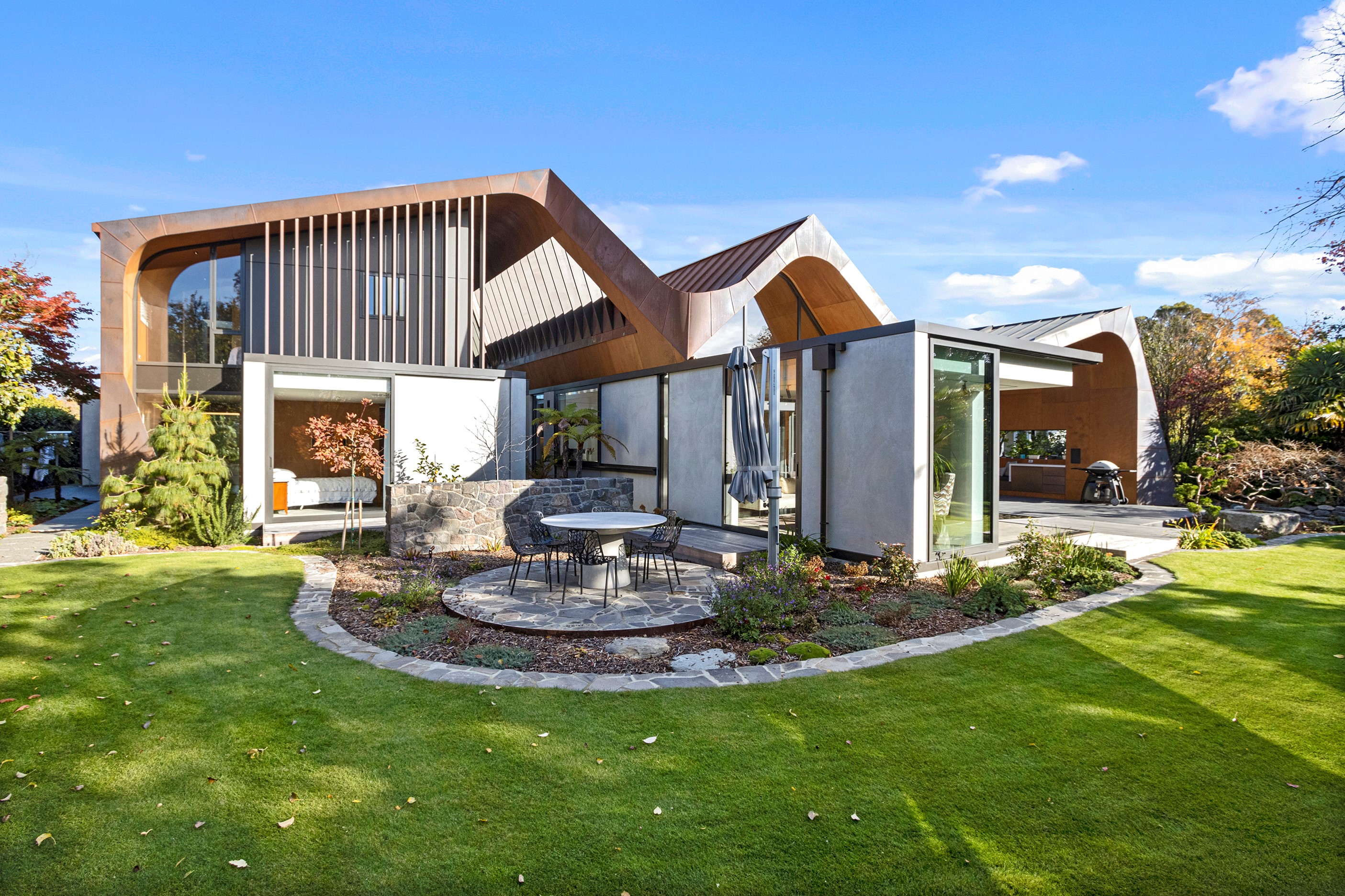 Beneath a sculptural copper roof that crests and curves like waves is a home that is expansive yet intimate, crisp yet cosy. The clients wanted gezelligheid (the Dutch term for conviviality, friendly, enjoyable and cosy) and that’s precisely what they’ve got. The roof, a complex feat of construction, rests atop a concrete structure with myriad angles that create interest for the owners as they move through the 405sqm home. Following the curved roofline is an expertly crafted ply ceiling, resulting in a deep sense of warmth and intimacy. The warmth is further enhanced by the engineered timber flooring and, more practically, by in-slab heating throughout the ground floor. Expansive curved windows fill the four-bedroom, three-bathroom home with light. Multiple living spaces, inside and out, provide plenty of spots to relax and make entertaining a breeze. The practical yet elegant kitchen spills into the dining room and then onto the patio, which is sheltered by another of those astonishing copper waves. This one-of-a-kind outdoor room further links the interior of this special home to the garden and stream beyond.