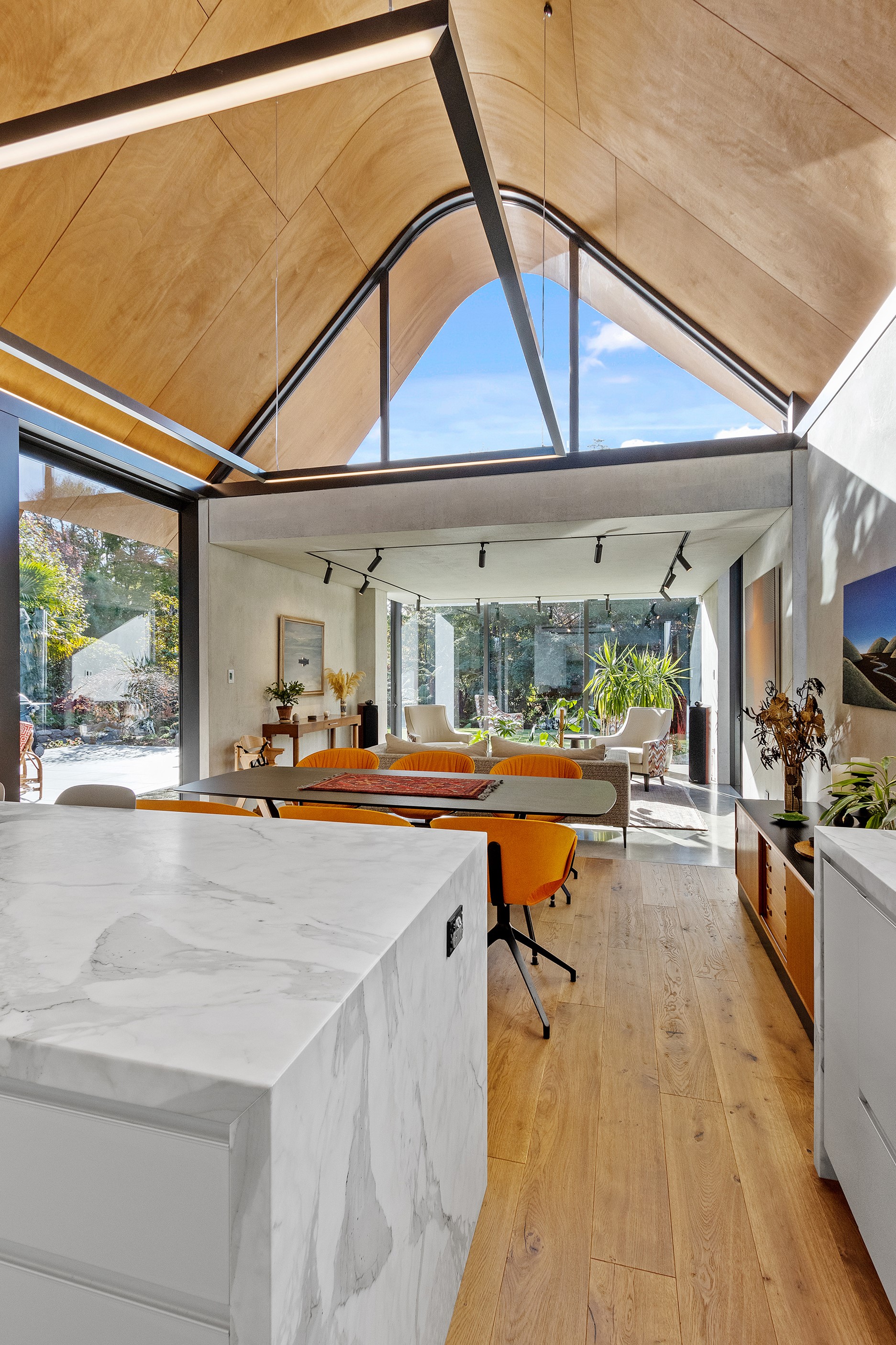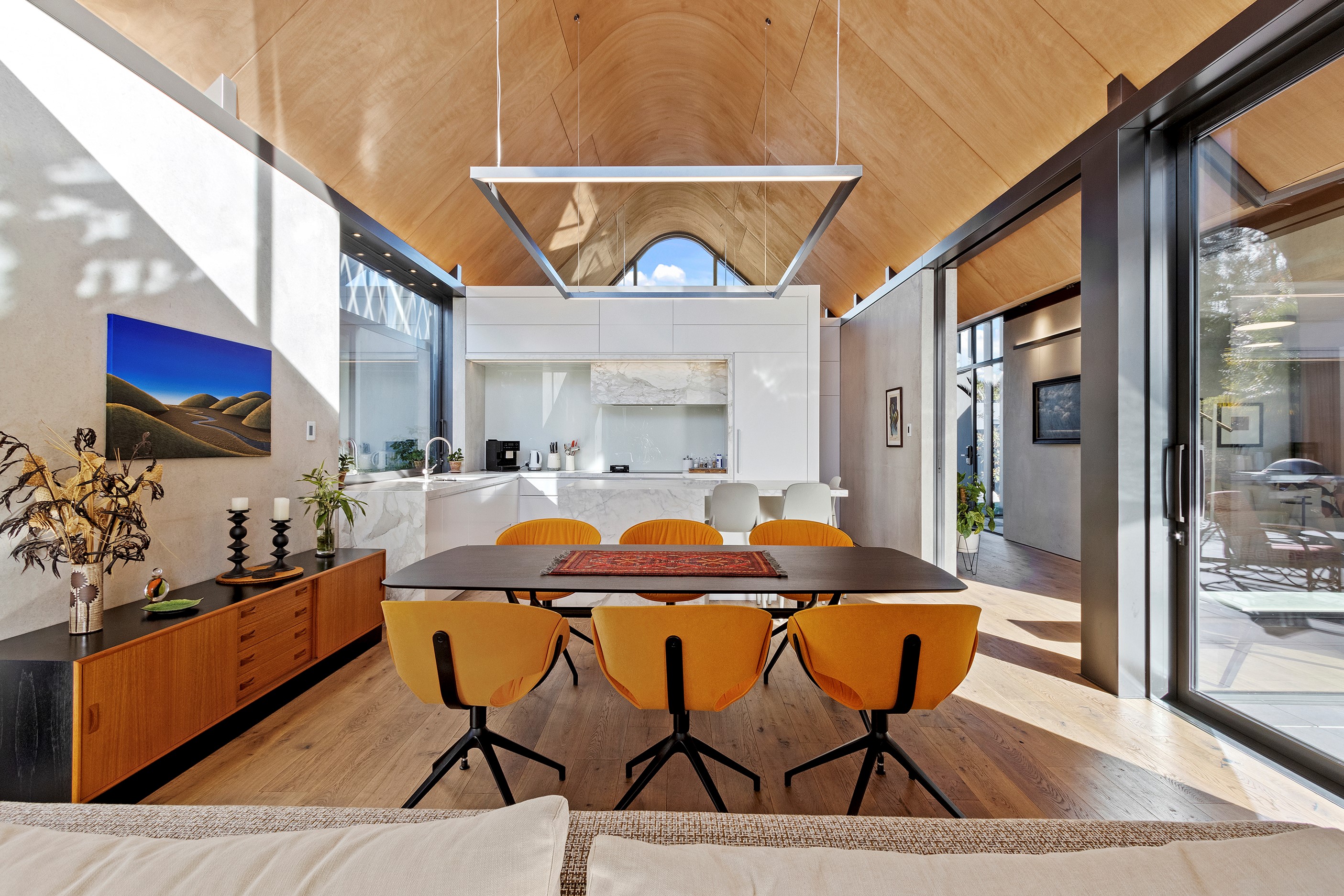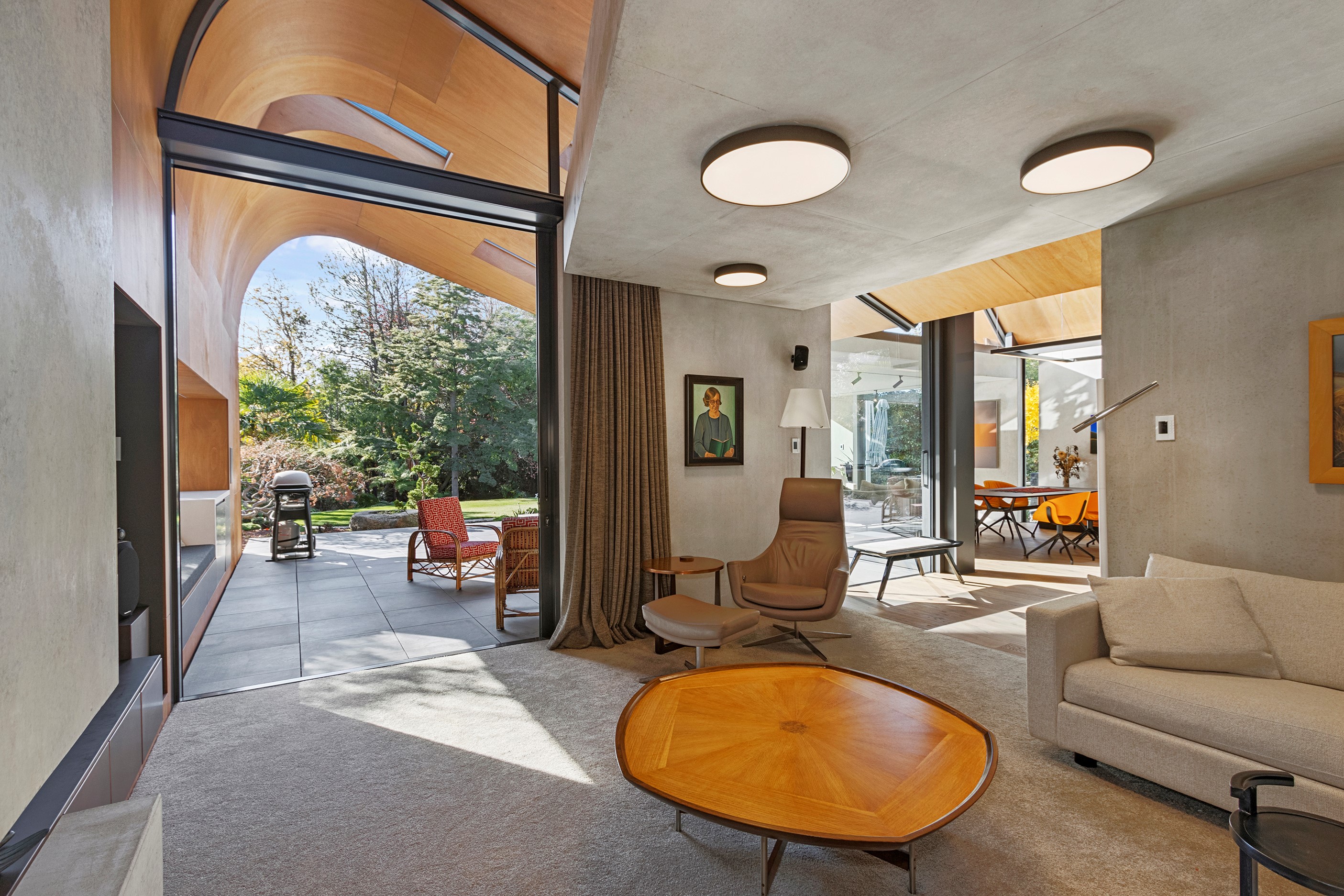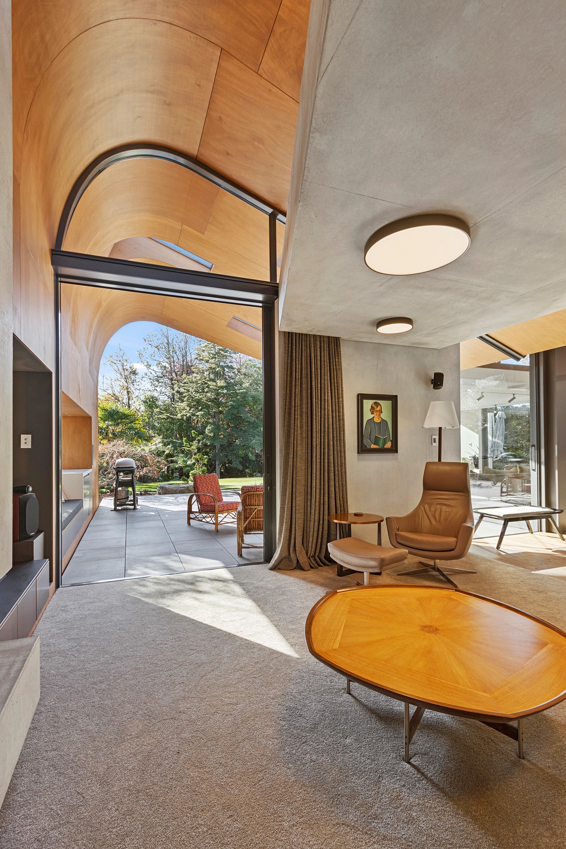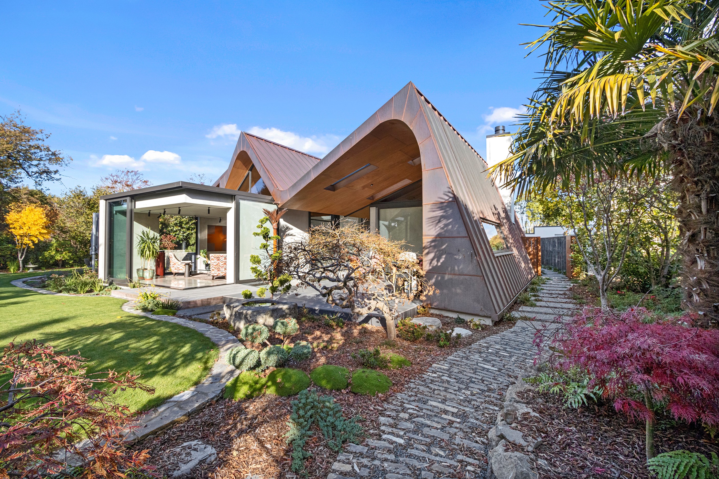 Beneath a sculptural copper roof that crests and curves like waves is a home that is expansive yet intimate, crisp yet cosy. The clients wanted gezelligheid (the Dutch term for conviviality, friendly, enjoyable and cosy) and that’s precisely what they’ve got. The roof, a complex feat of construction, rests atop a concrete structure with myriad angles that create interest for the owners as they move through the 405sqm home. Following the curved roofline is an expertly crafted ply ceiling, resulting in a deep sense of warmth and intimacy. The warmth is further enhanced by the engineered timber flooring and, more practically, by in-slab heating throughout the ground floor. Expansive curved windows fill the four-bedroom, three-bathroom home with light. Multiple living spaces, inside and out, provide plenty of spots to relax and make entertaining a breeze. The practical yet elegant kitchen spills into the dining room and then onto the patio, which is sheltered by another of those astonishing copper waves. This one-of-a-kind outdoor room further links the interior of this special home to the garden and stream beyond.