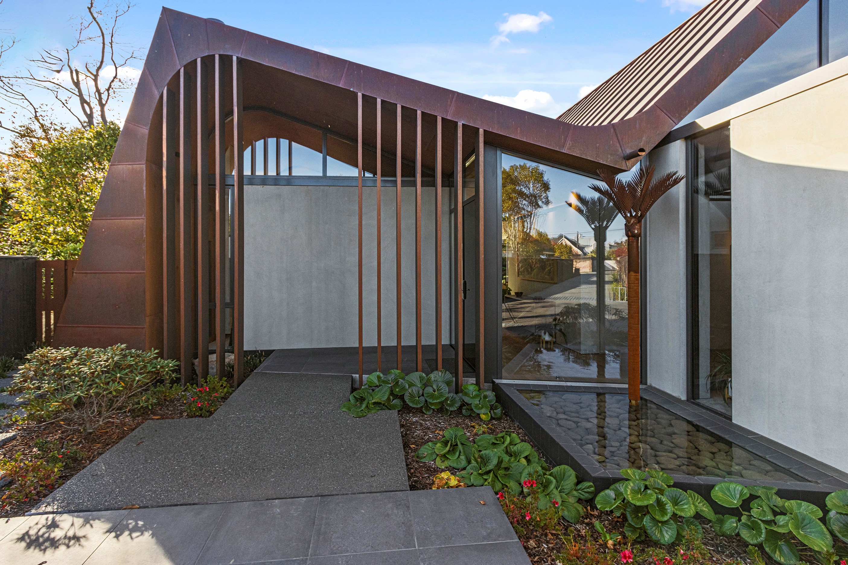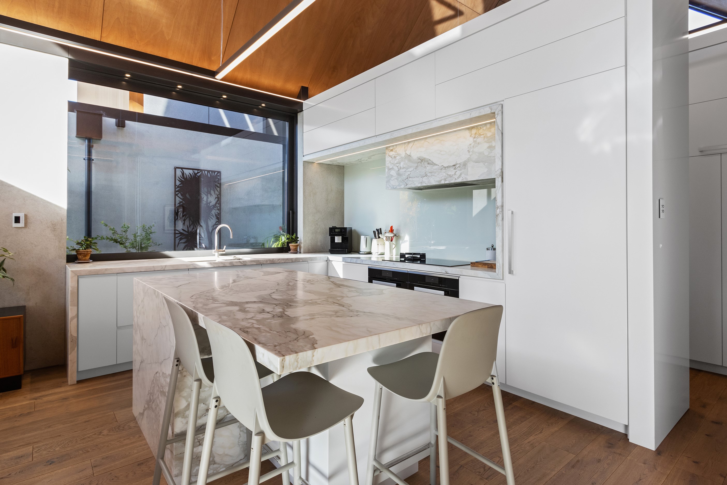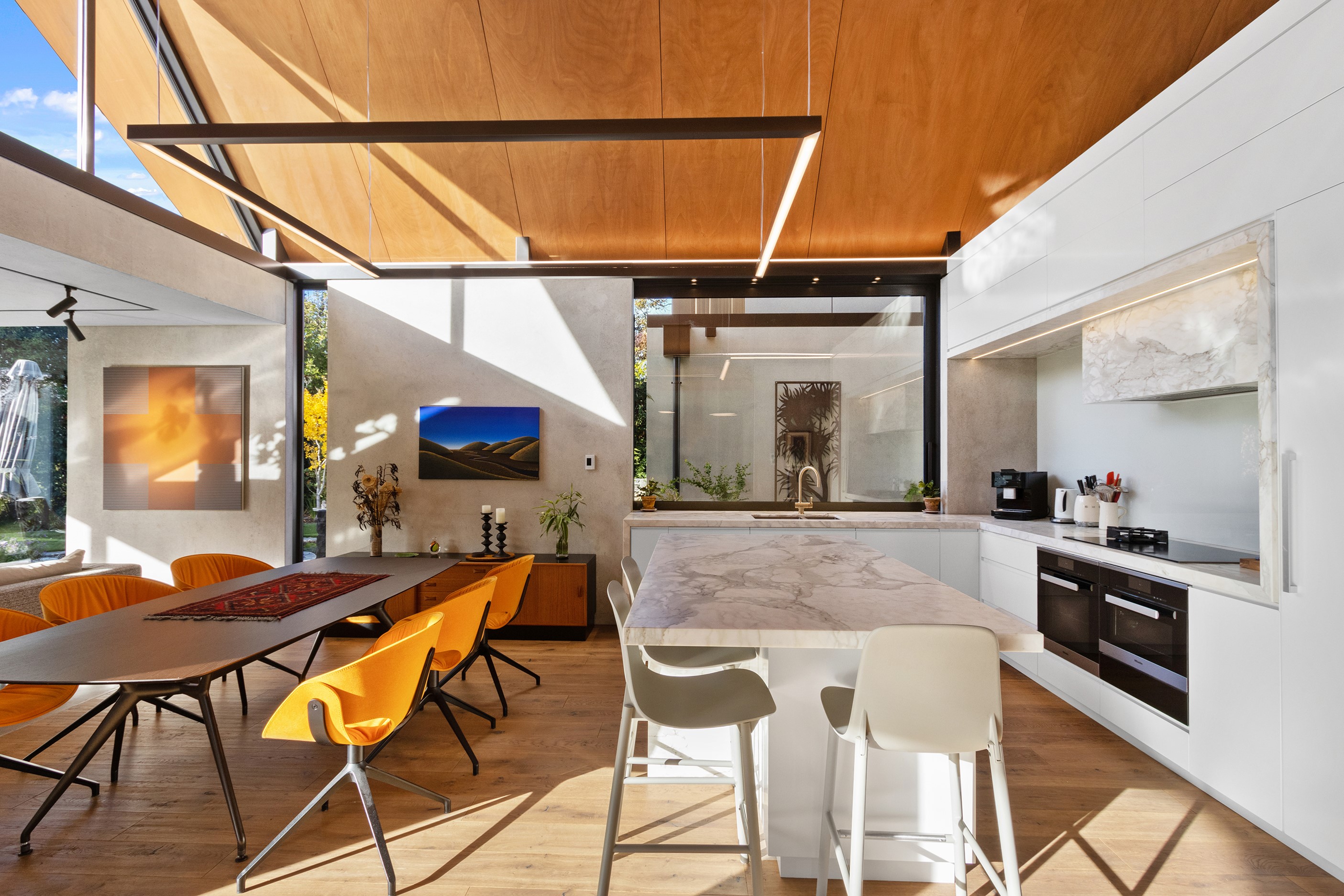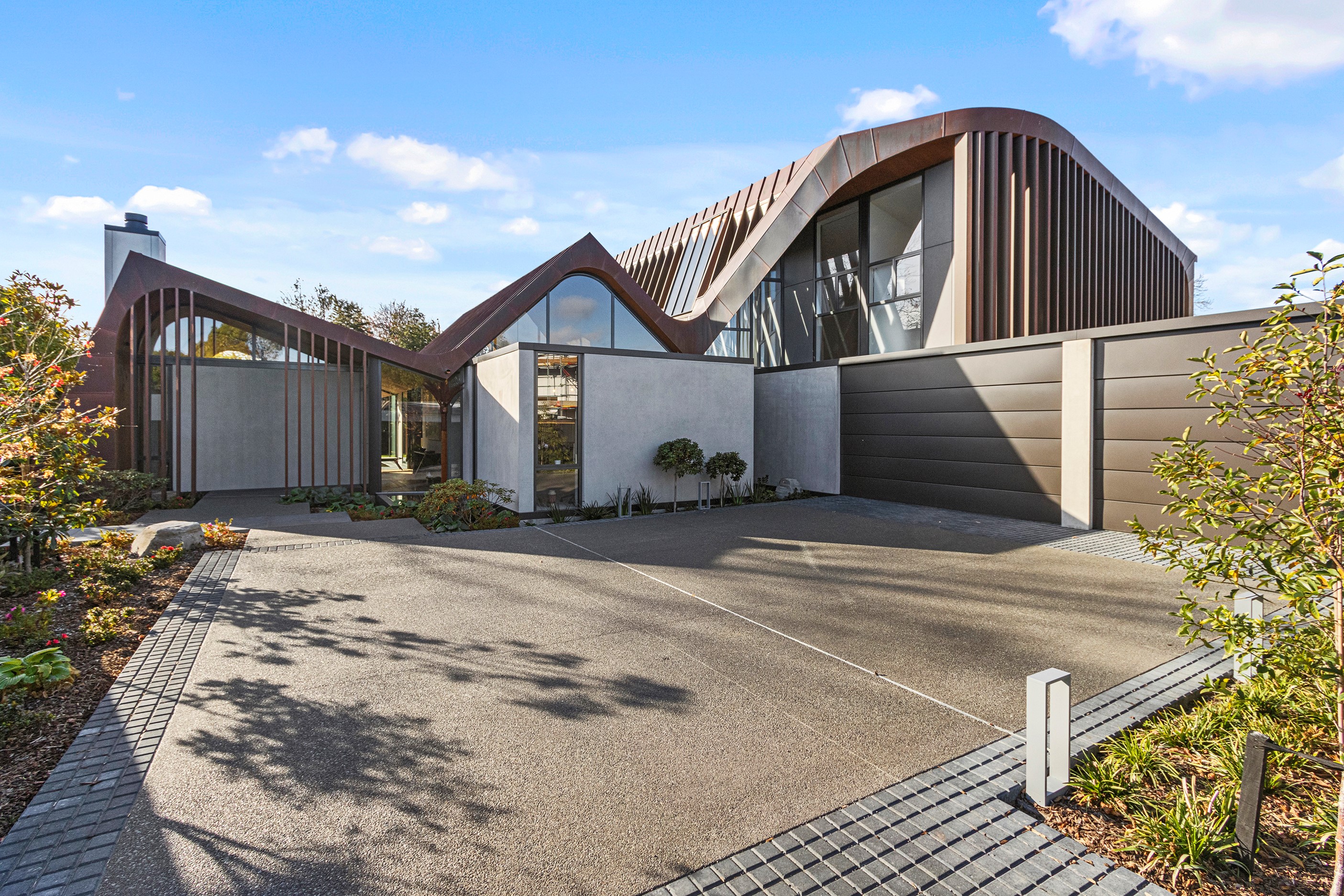 Beneath a sculptural copper roof that crests and curves like waves is a home that is expansive yet intimate, crisp yet cosy. The clients wanted gezelligheid (the Dutch term for conviviality, friendly, enjoyable and cosy) and that’s precisely what they’ve got. The roof, a complex feat of construction, rests atop a concrete structure with myriad angles that create interest for the owners as they move through the 405sqm home. Following the curved roofline is an expertly crafted ply ceiling, resulting in a deep sense of warmth and intimacy. The warmth is further enhanced by the engineered timber flooring and, more practically, by in-slab heating throughout the ground floor. Expansive curved windows fill the four-bedroom, three-bathroom home with light. Multiple living spaces, inside and out, provide plenty of spots to relax and make entertaining a breeze. The practical yet elegant kitchen spills into the dining room and then onto the patio, which is sheltered by another of those astonishing copper waves. This one-of-a-kind outdoor room further links the interior of this special home to the garden and stream beyond.