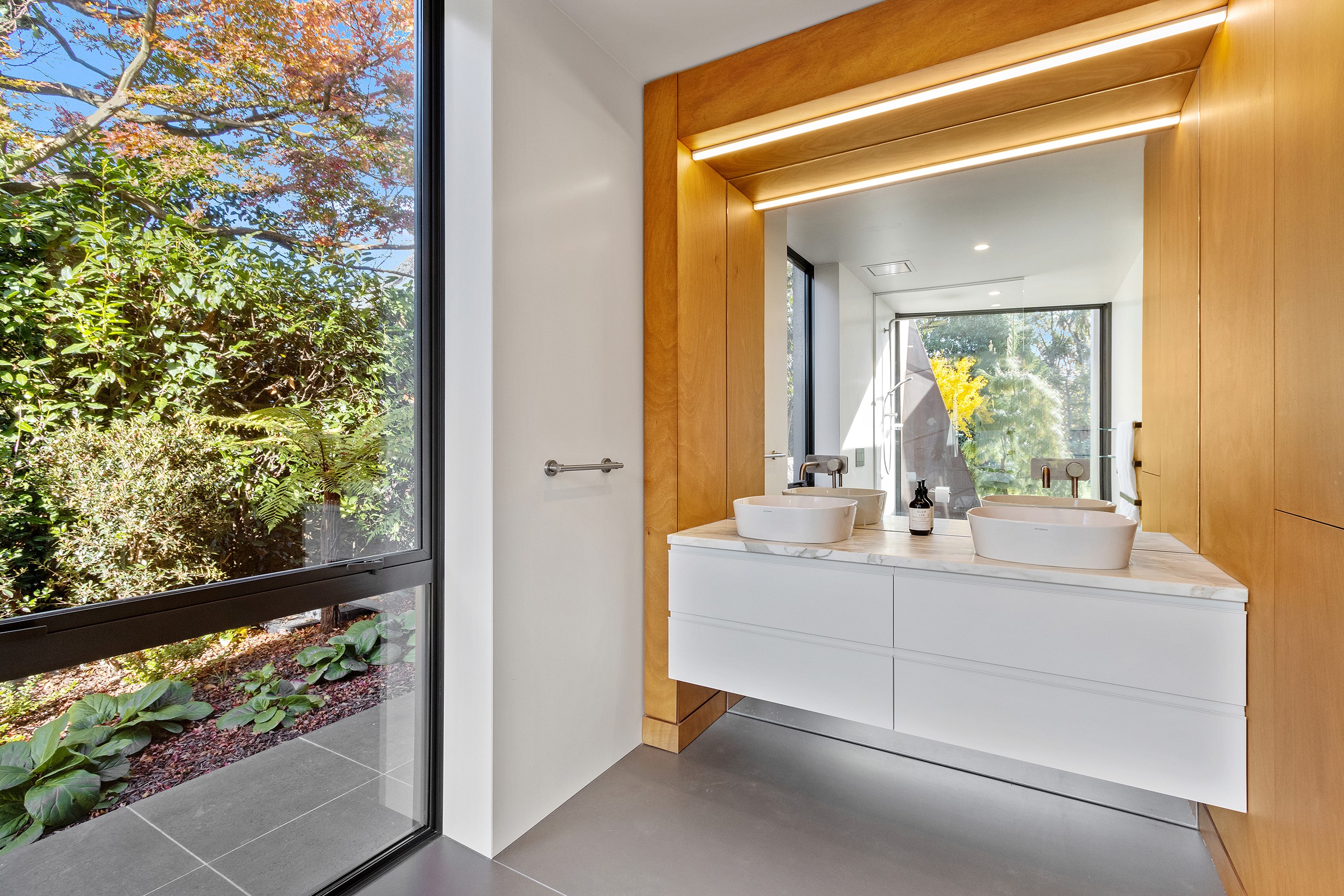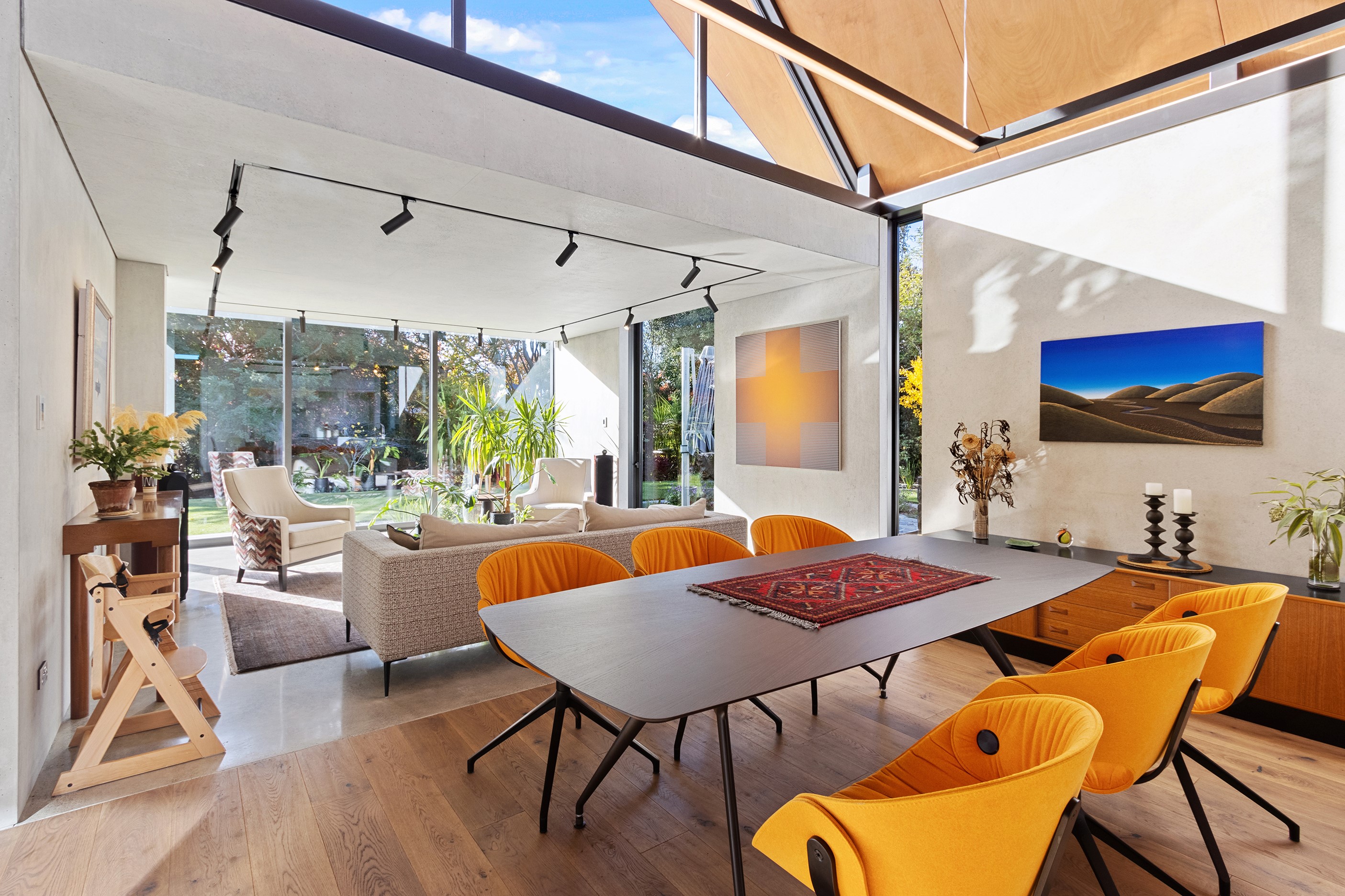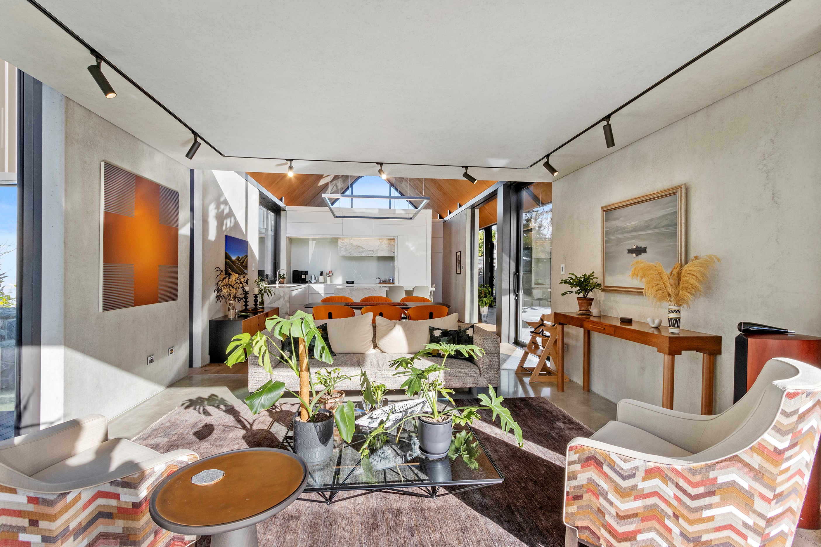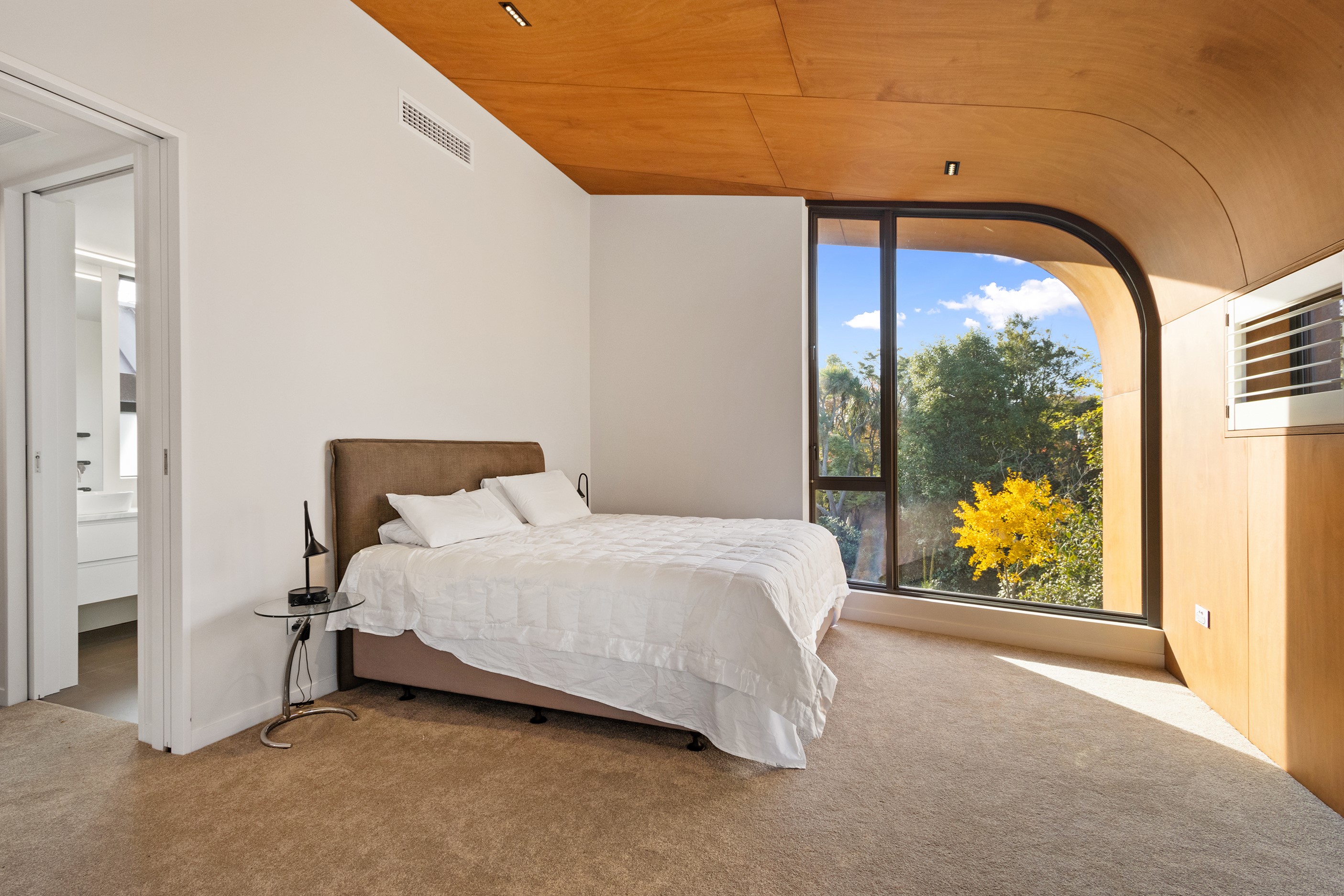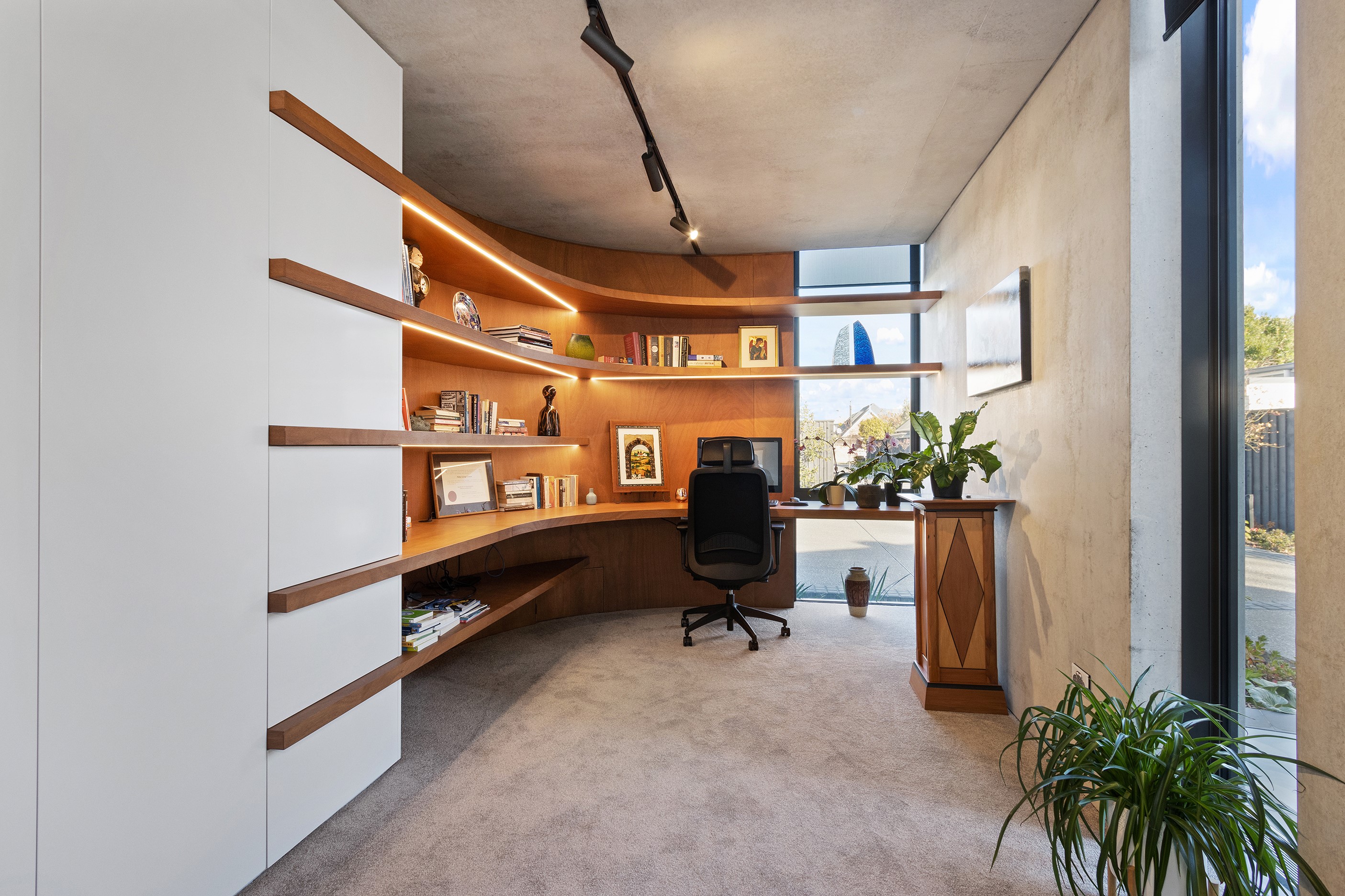 Beneath a sculptural copper roof that crests and curves like waves is a home that is expansive yet intimate, crisp yet cosy. The clients wanted gezelligheid (the Dutch term for conviviality, friendly, enjoyable and cosy) and that’s precisely what they’ve got. The roof, a complex feat of construction, rests atop a concrete structure with myriad angles that create interest for the owners as they move through the 405sqm home. Following the curved roofline is an expertly crafted ply ceiling, resulting in a deep sense of warmth and intimacy. The warmth is further enhanced by the engineered timber flooring and, more practically, by in-slab heating throughout the ground floor. Expansive curved windows fill the four-bedroom, three-bathroom home with light. Multiple living spaces, inside and out, provide plenty of spots to relax and make entertaining a breeze. The practical yet elegant kitchen spills into the dining room and then onto the patio, which is sheltered by another of those astonishing copper waves. This one-of-a-kind outdoor room further links the interior of this special home to the garden and stream beyond.