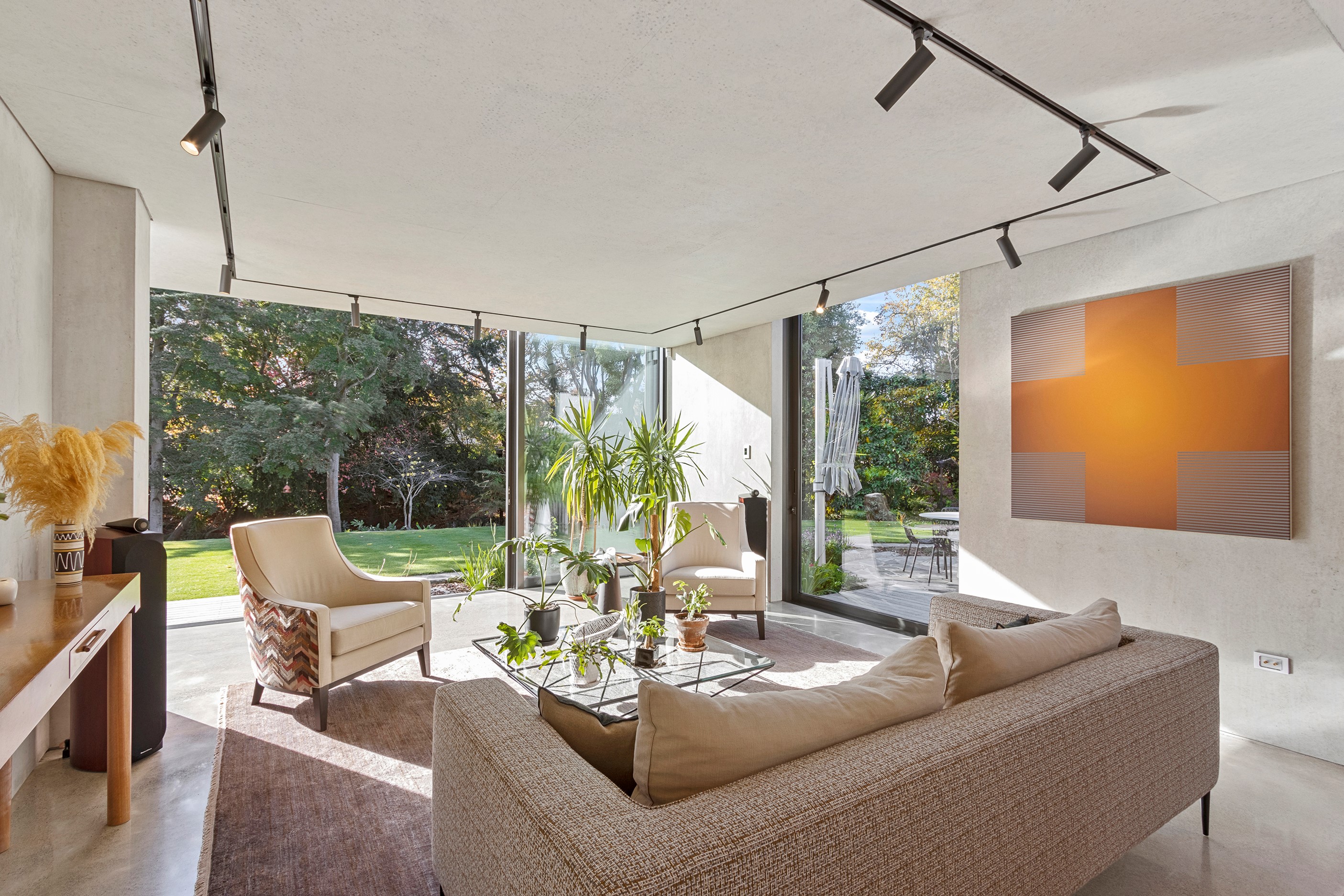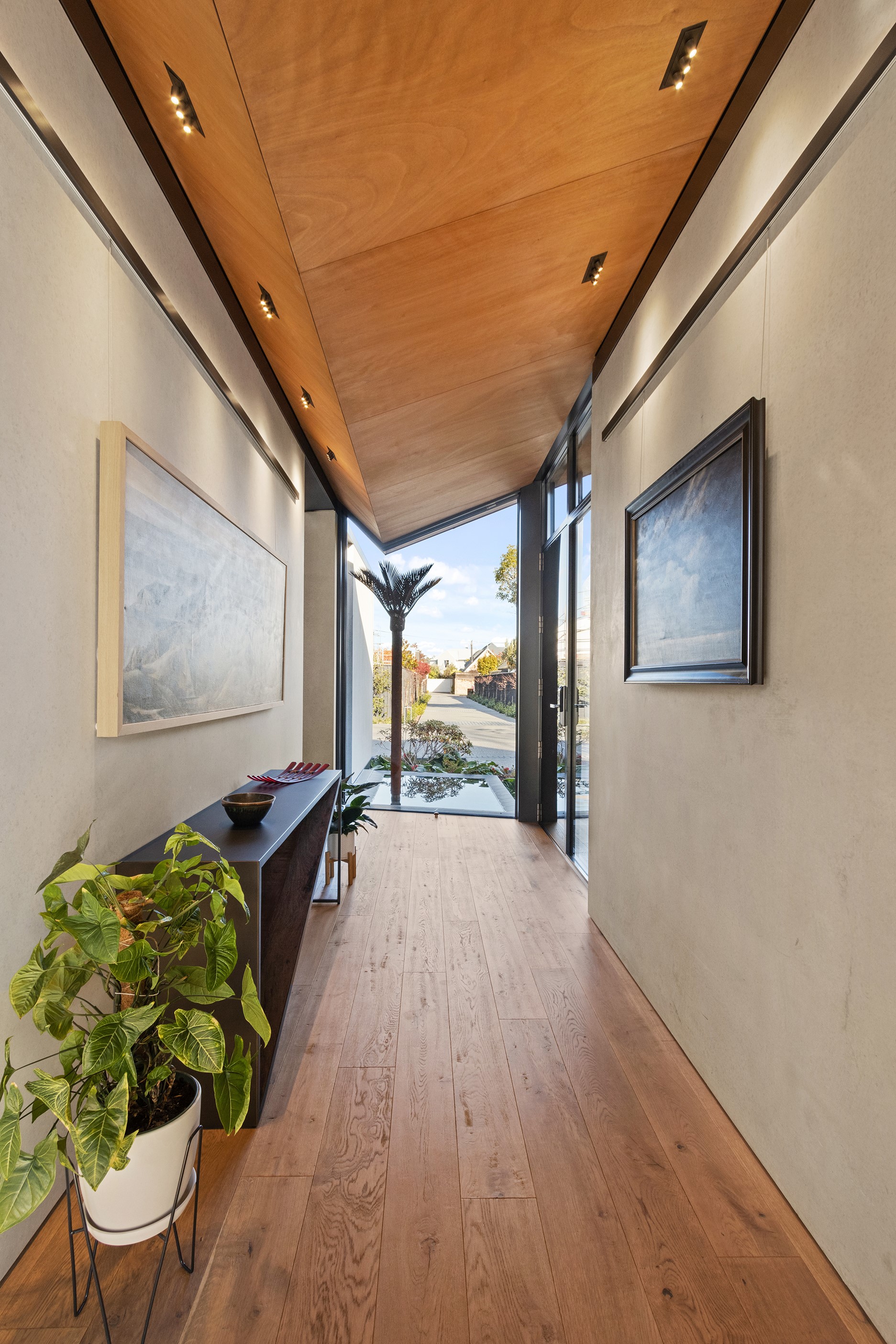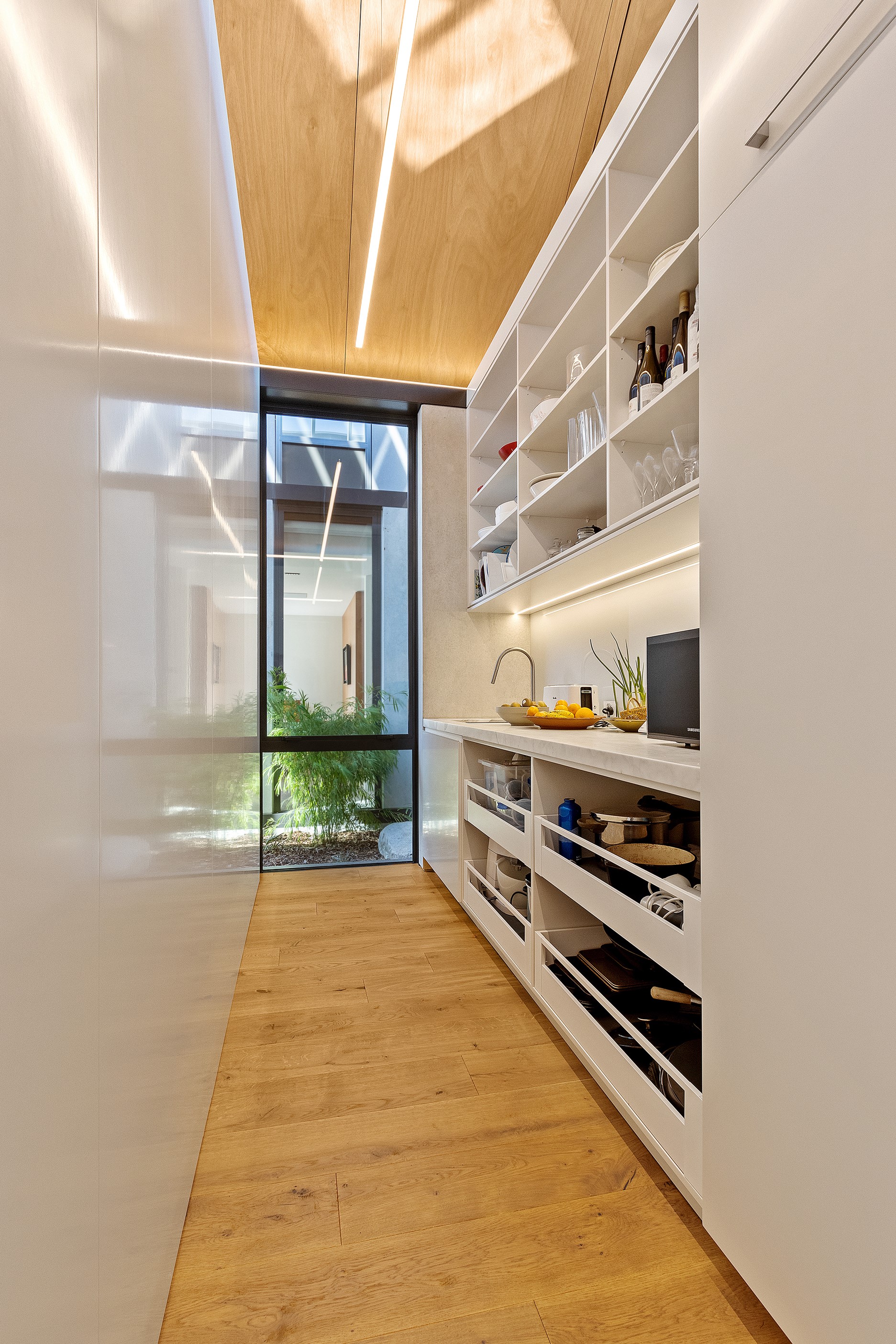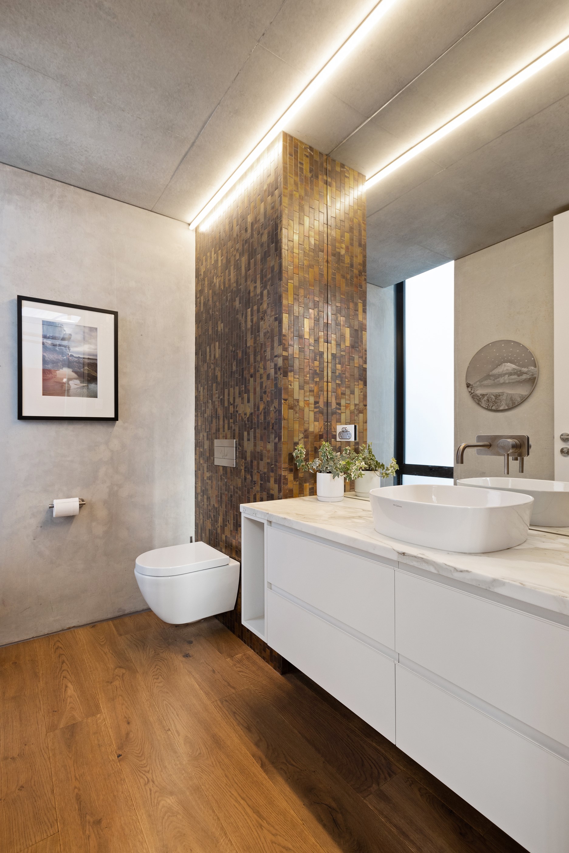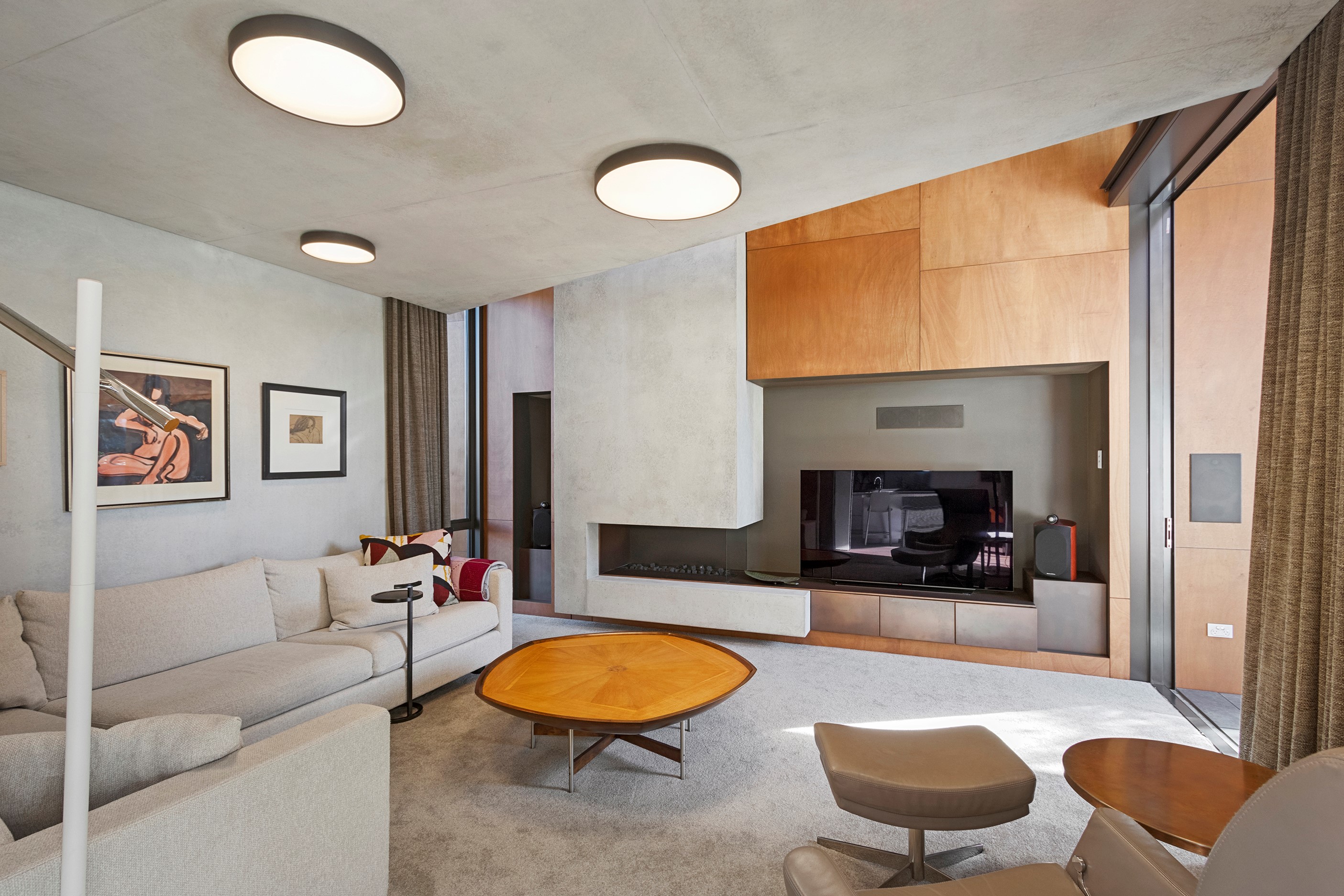 Beneath a sculptural copper roof that crests and curves like waves is a home that is expansive yet intimate, crisp yet cosy. The clients wanted gezelligheid (the Dutch term for conviviality, friendly, enjoyable and cosy) and that’s precisely what they’ve got. The roof, a complex feat of construction, rests atop a concrete structure with myriad angles that create interest for the owners as they move through the 405sqm home. Following the curved roofline is an expertly crafted ply ceiling, resulting in a deep sense of warmth and intimacy. The warmth is further enhanced by the engineered timber flooring and, more practically, by in-slab heating throughout the ground floor. Expansive curved windows fill the four-bedroom, three-bathroom home with light. Multiple living spaces, inside and out, provide plenty of spots to relax and make entertaining a breeze. The practical yet elegant kitchen spills into the dining room and then onto the patio, which is sheltered by another of those astonishing copper waves. This one-of-a-kind outdoor room further links the interior of this special home to the garden and stream beyond.