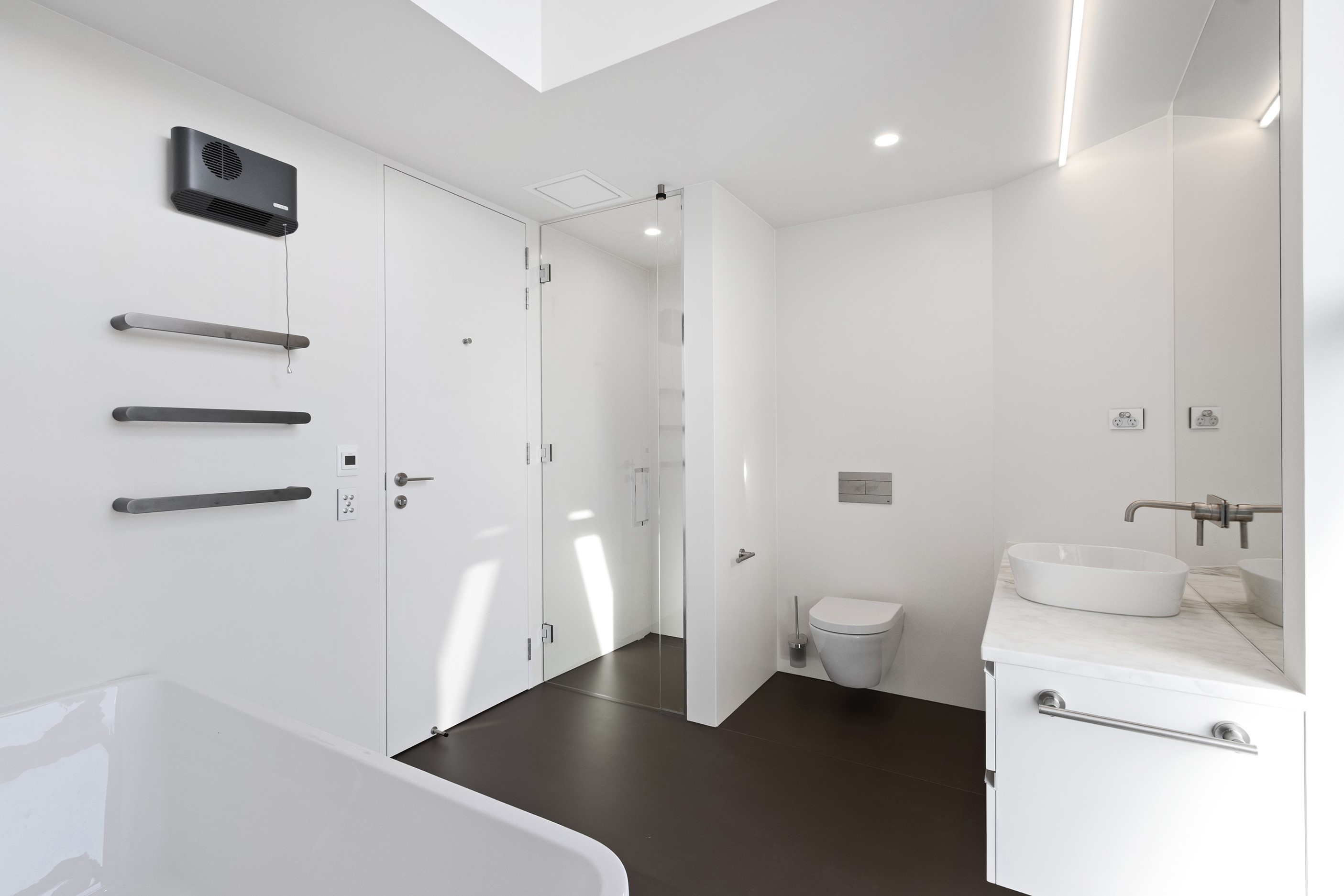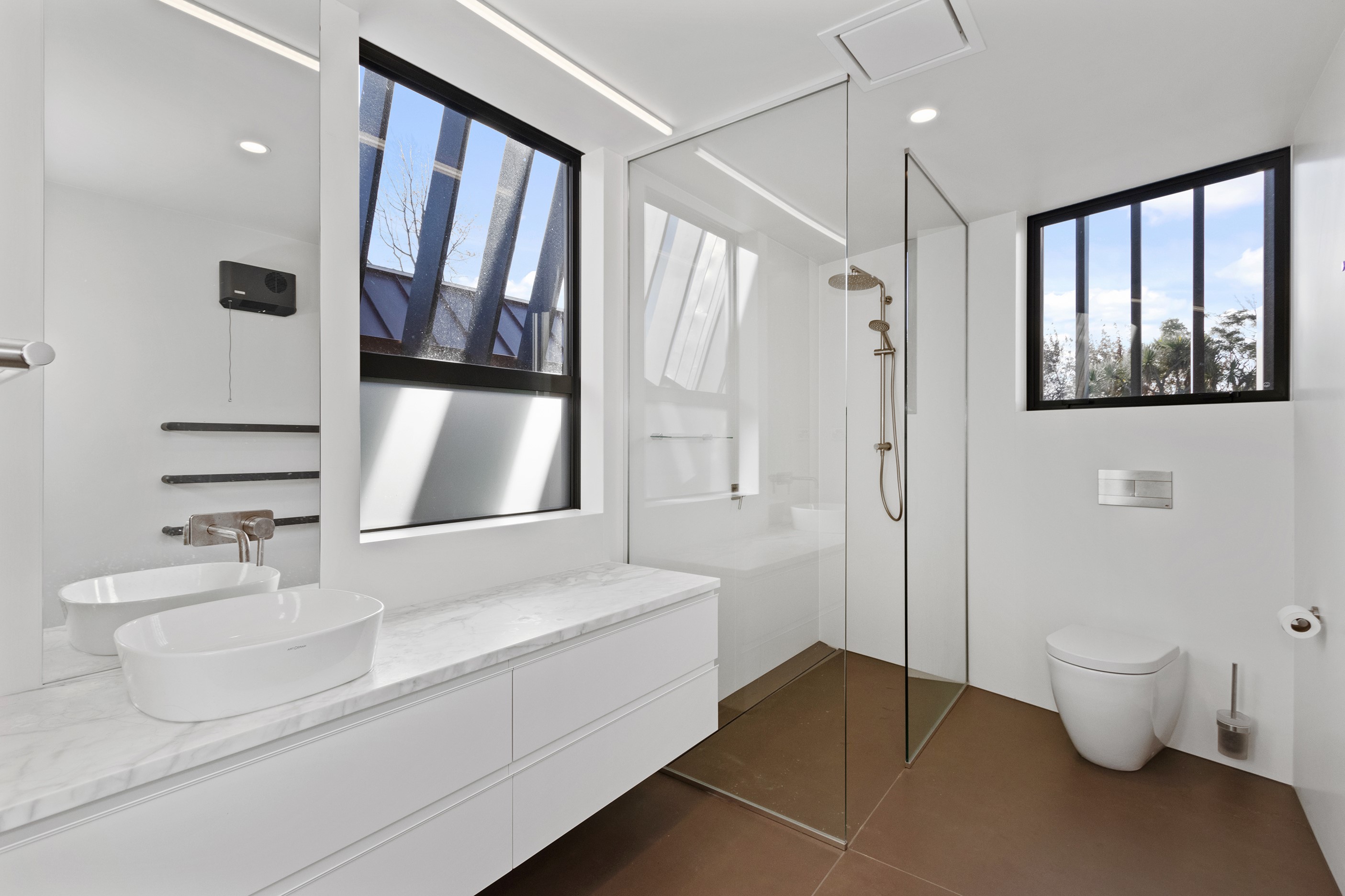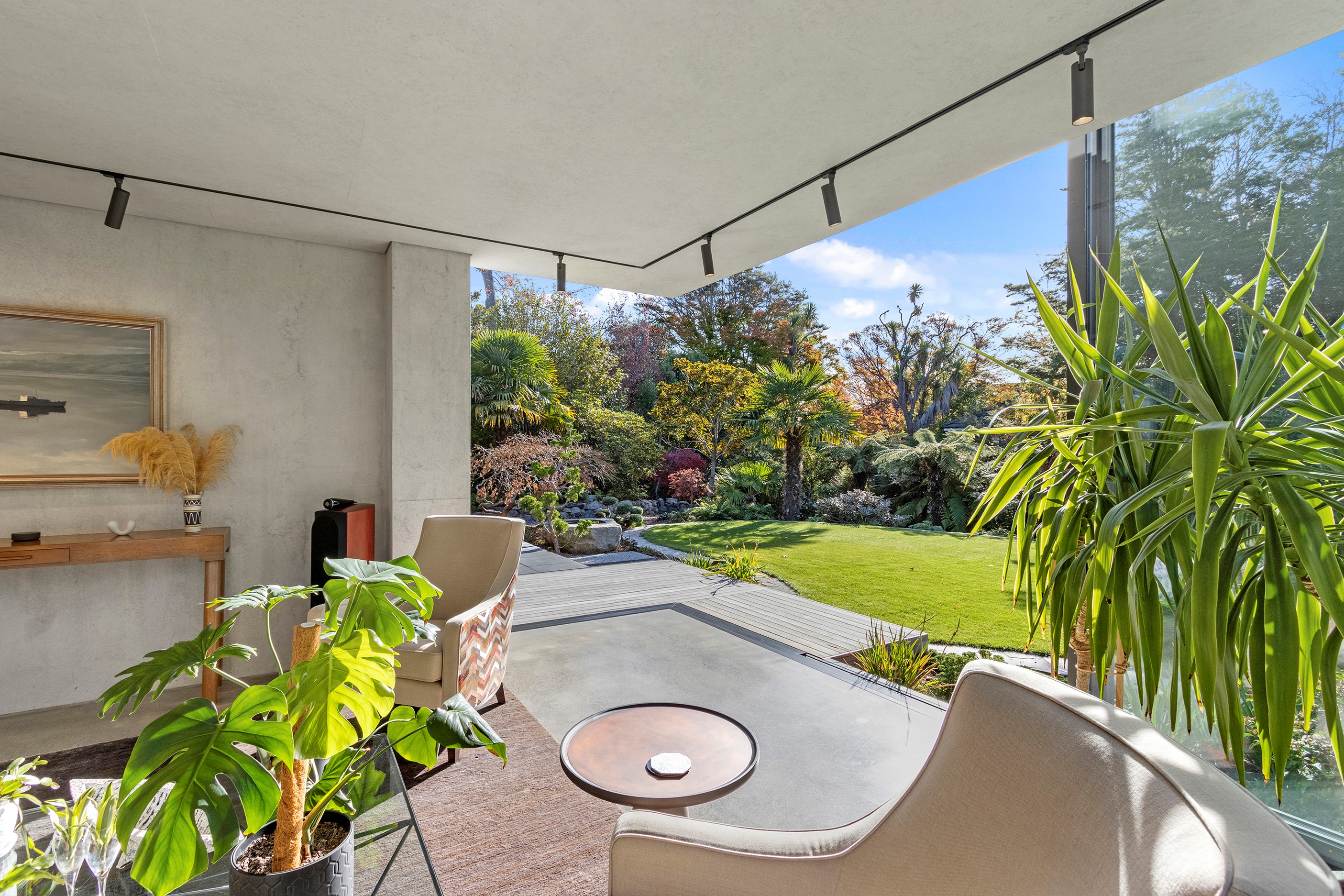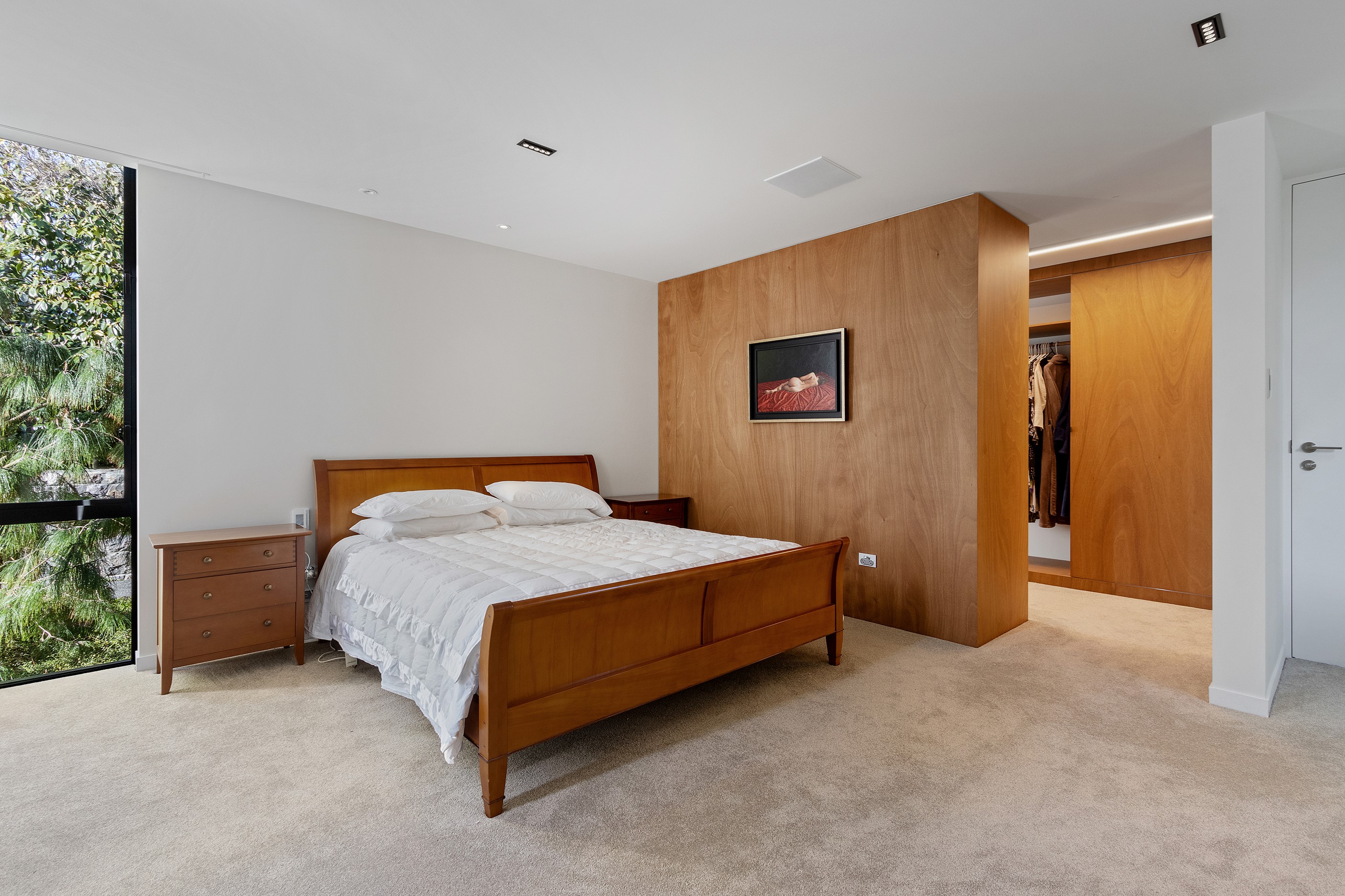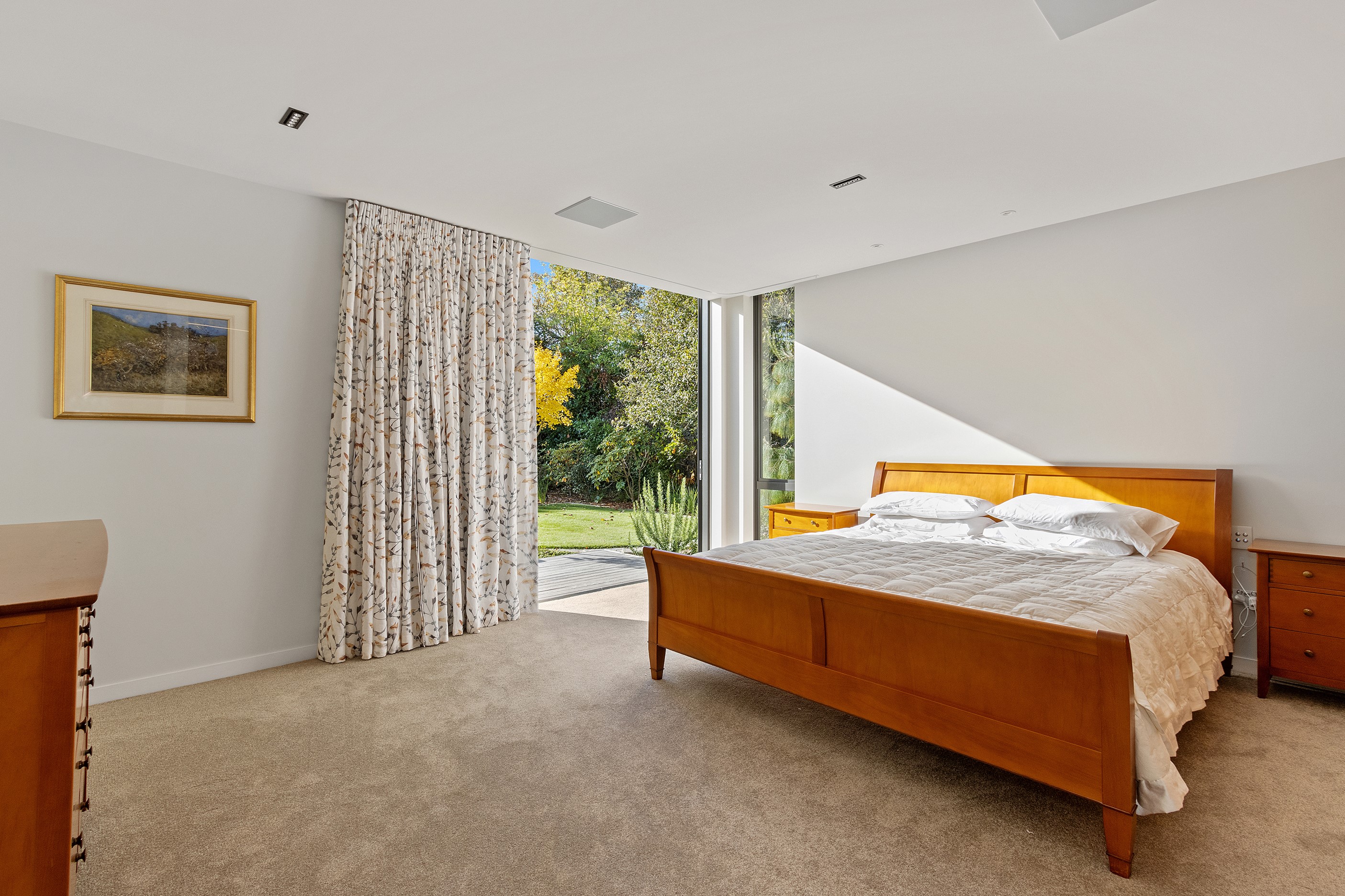Beneath a sculptural copper roof that crests and curves like waves is a home that is expansive yet intimate, crisp yet cosy. The clients wanted gezelligheid (the Dutch term for conviviality, friendly, enjoyable and cosy) and that’s precisely what they’ve got. The roof, a complex feat of construction, rests atop a concrete structure with myriad angles that create interest for the owners as they move through the 405sqm home. Following the curved roofline is an expertly crafted ply ceiling, resulting in a deep sense of warmth and intimacy. The warmth is further enhanced by the engineered timber flooring and, more practically, by in-slab heating throughout the ground floor. Expansive curved windows fill the four-bedroom, three-bathroom home with light. Multiple living spaces, inside and out, provide plenty of spots to relax and make entertaining a breeze. The practical yet elegant kitchen spills into the dining room and then onto the patio, which is sheltered by another of those astonishing copper waves. This one-of-a-kind outdoor room further links the interior of this special home to the garden and stream beyond.