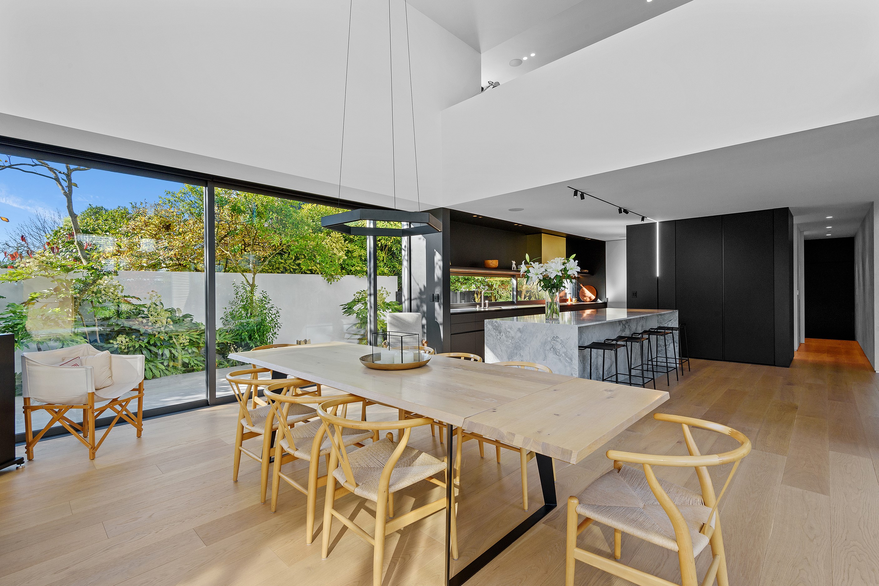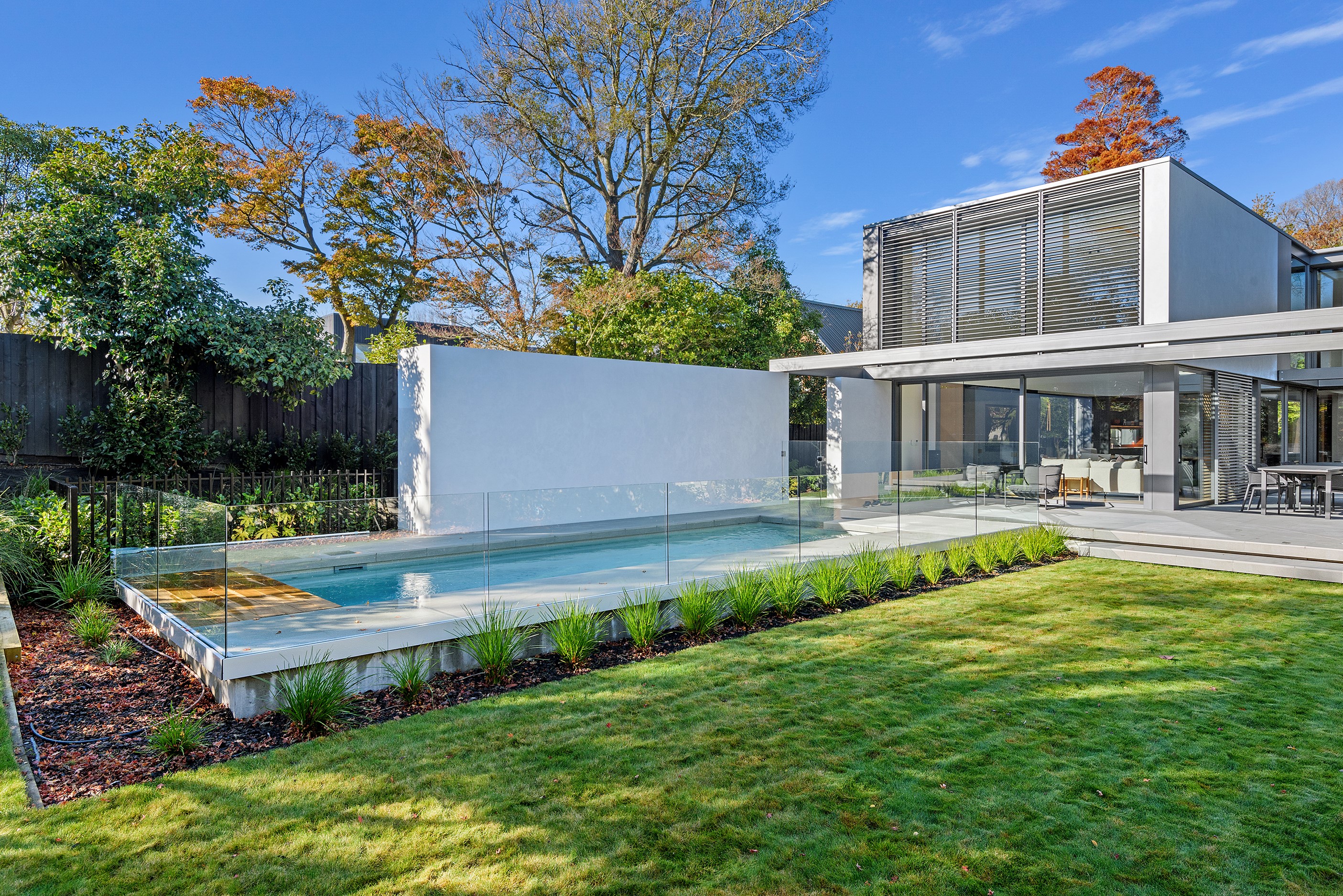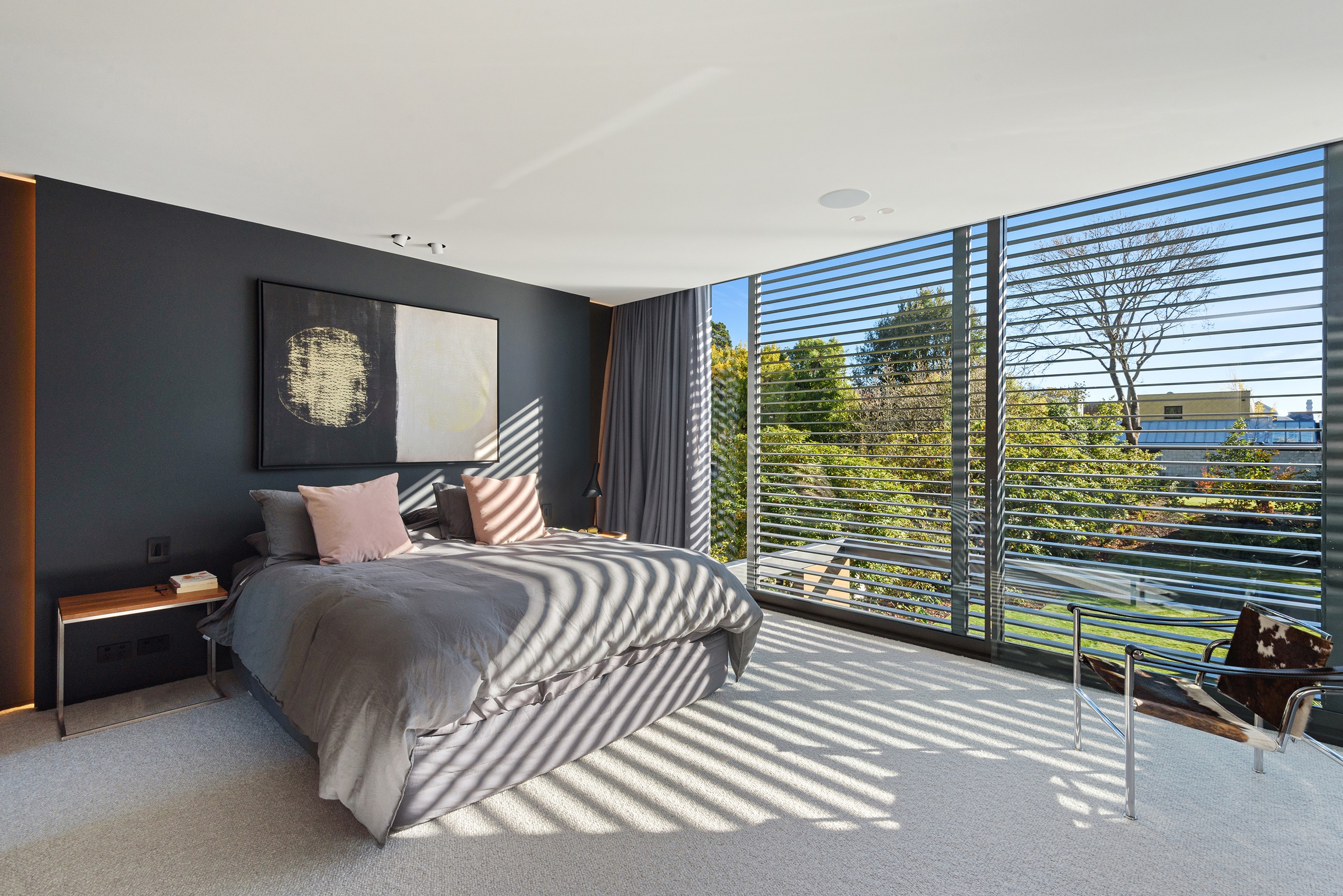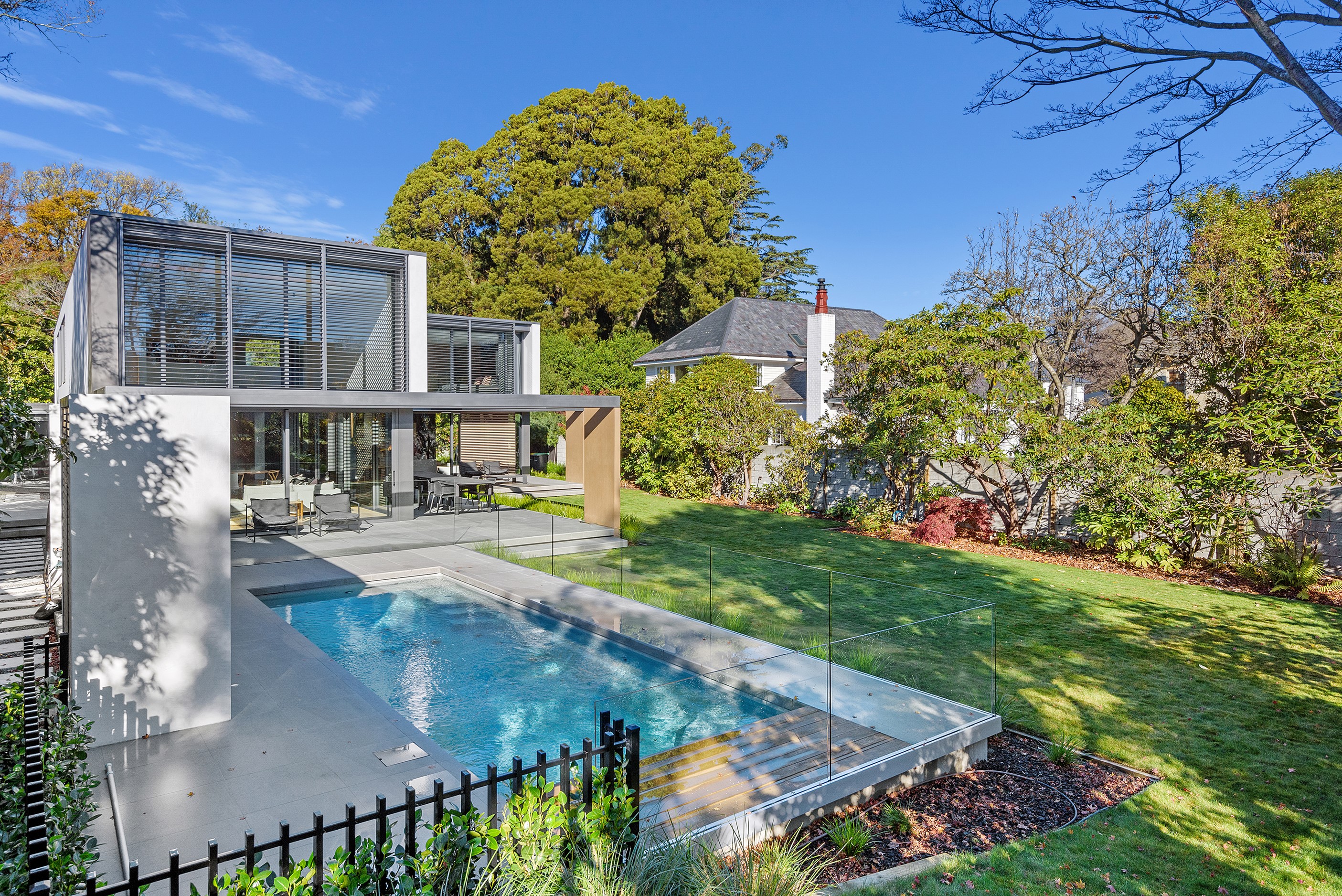 The architect-owner of this stunning modernist-style home was the ideal candidate to craft exactly what he wanted for himself and his family. The long north-south orientated site is surrounded by an established garden and has Hagley Park as its backdrop. Expansive lengths of thermally broken glazing connect the house with large external terraces, gardens and a pool. Coupled with double-height volumes, the extensive glazing ensures uninterrupted views to the immaculate landscaping, established trees and park beyond. The home has a social focus, with large retractable doors and a layout that places the kitchen at its core. A highly considered palette of luxurious finishes is revealed throughout, and includes engineered oak flooring, wool carpets, Italian polished plaster, natural stone, high-end joinery and integrated LED lighting. The house includes hydronic-water and space-heating systems, the latest solar technology, integrated heat pumps and automated lighting and audio systems – all seamlessly amalgamated into the design.