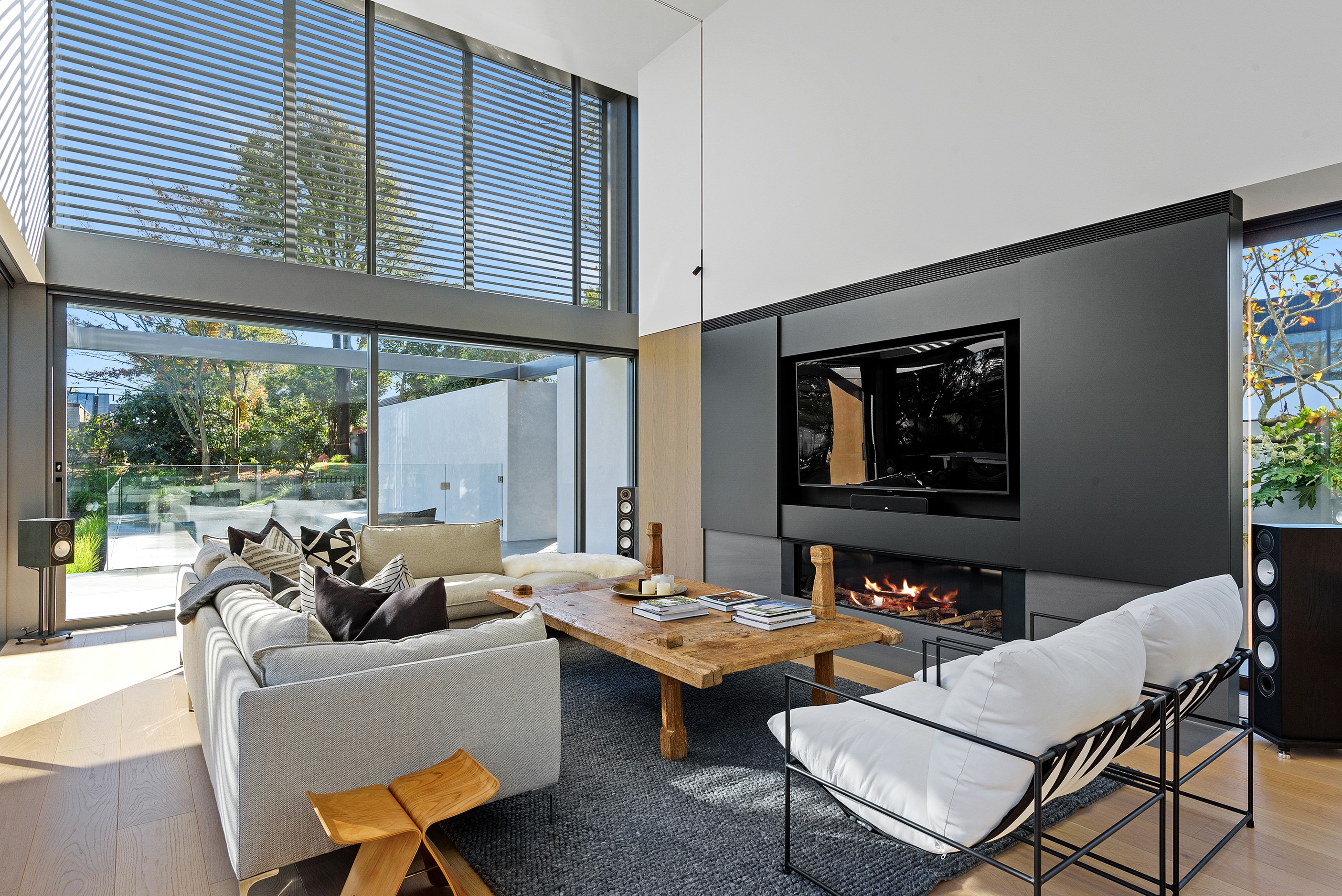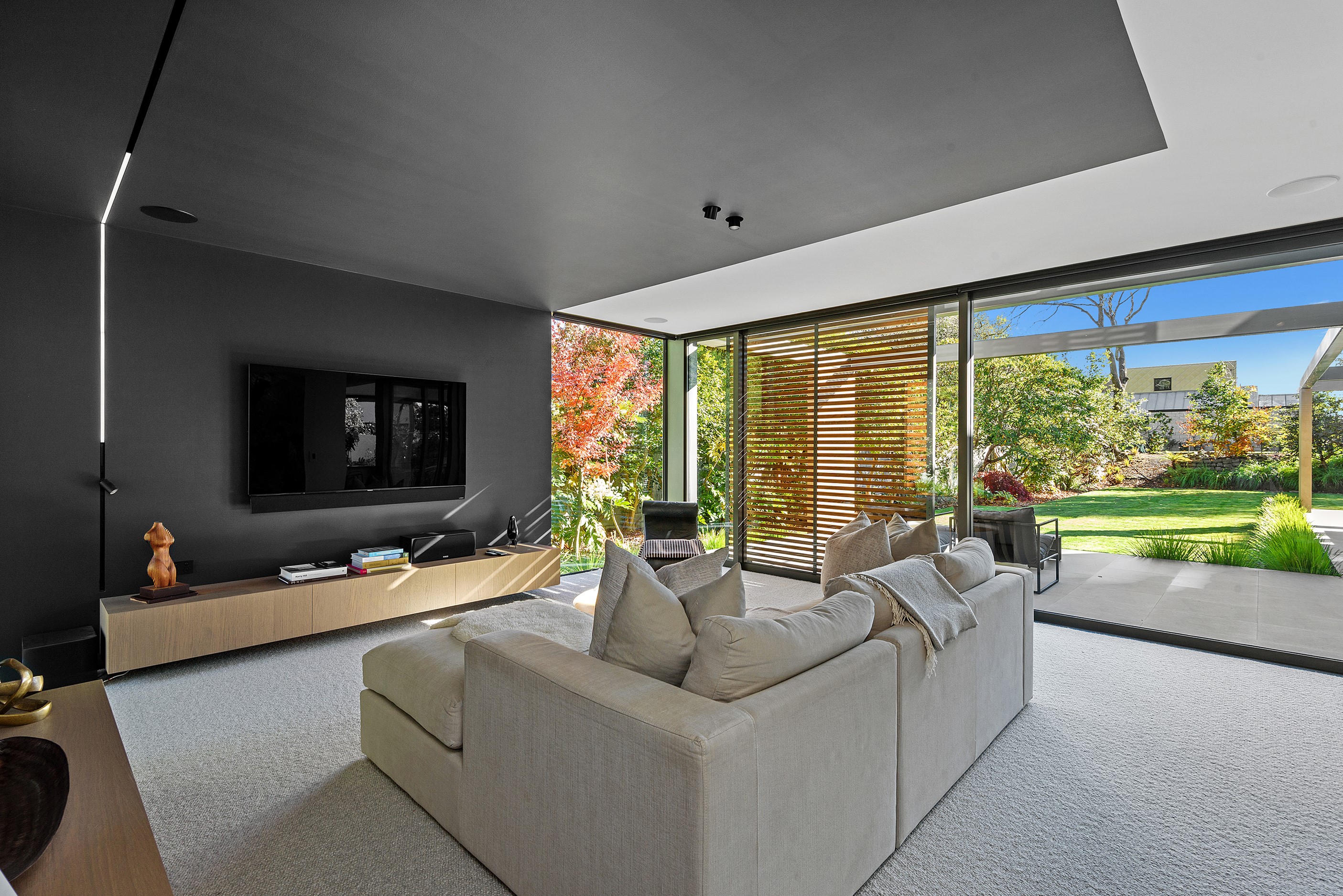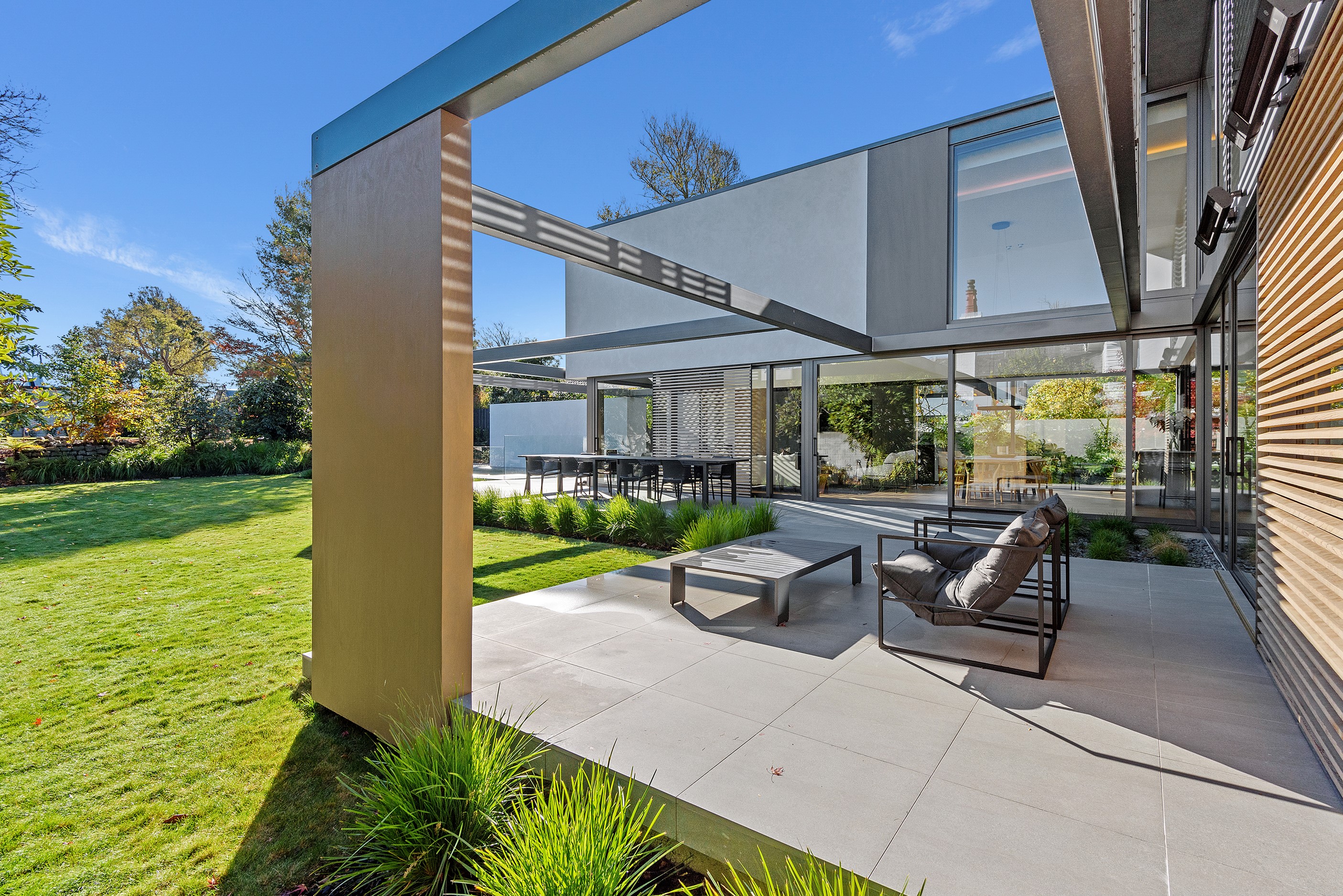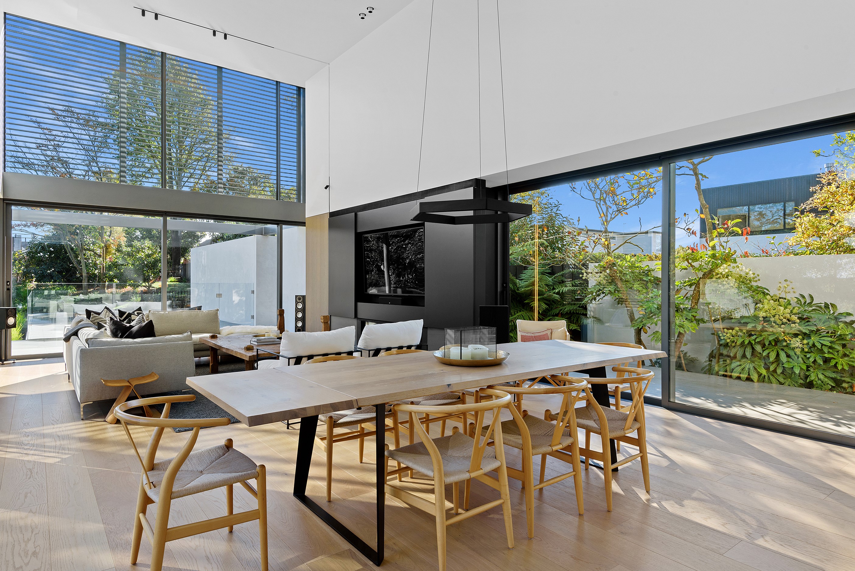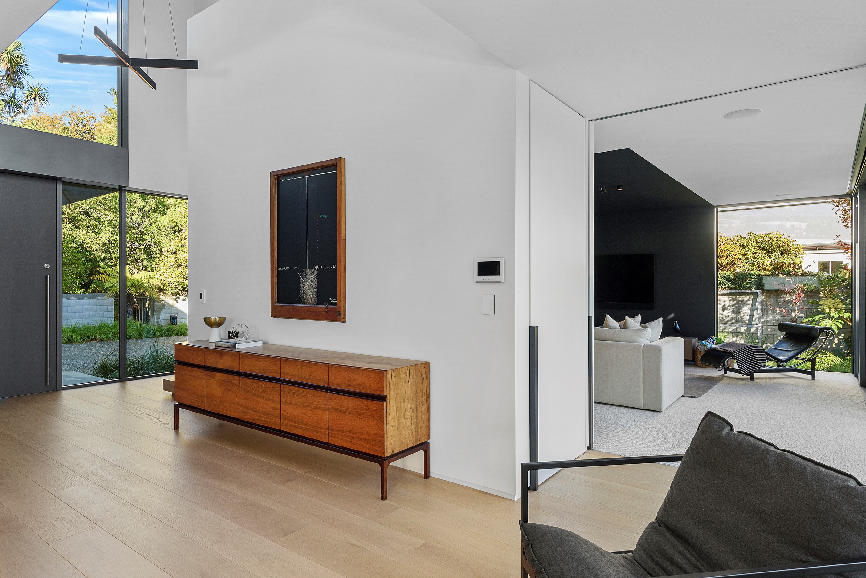 The architect-owner of this stunning modernist-style home was the ideal candidate to craft exactly what he wanted for himself and his family. The long north-south orientated site is surrounded by an established garden and has Hagley Park as its backdrop. Expansive lengths of thermally broken glazing connect the house with large external terraces, gardens and a pool. Coupled with double-height volumes, the extensive glazing ensures uninterrupted views to the immaculate landscaping, established trees and park beyond. The home has a social focus, with large retractable doors and a layout that places the kitchen at its core. A highly considered palette of luxurious finishes is revealed throughout, and includes engineered oak flooring, wool carpets, Italian polished plaster, natural stone, high-end joinery and integrated LED lighting. The house includes hydronic-water and space-heating systems, the latest solar technology, integrated heat pumps and automated lighting and audio systems – all seamlessly amalgamated into the design.