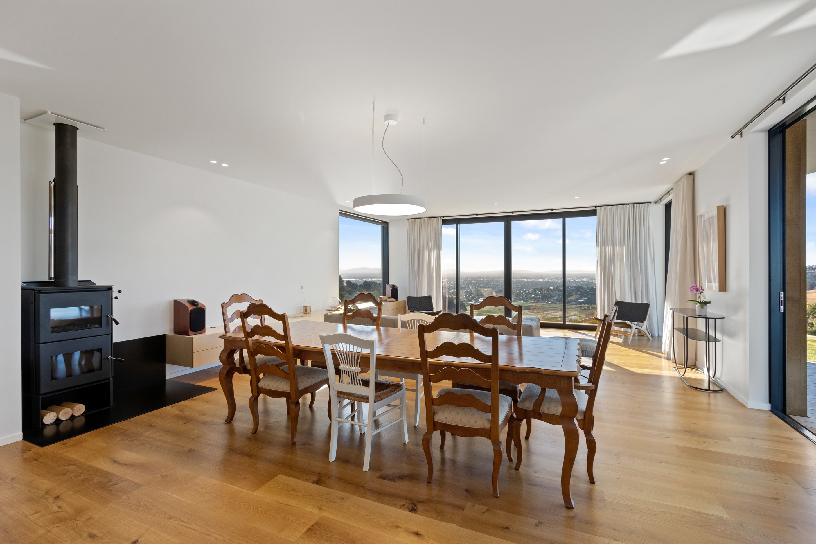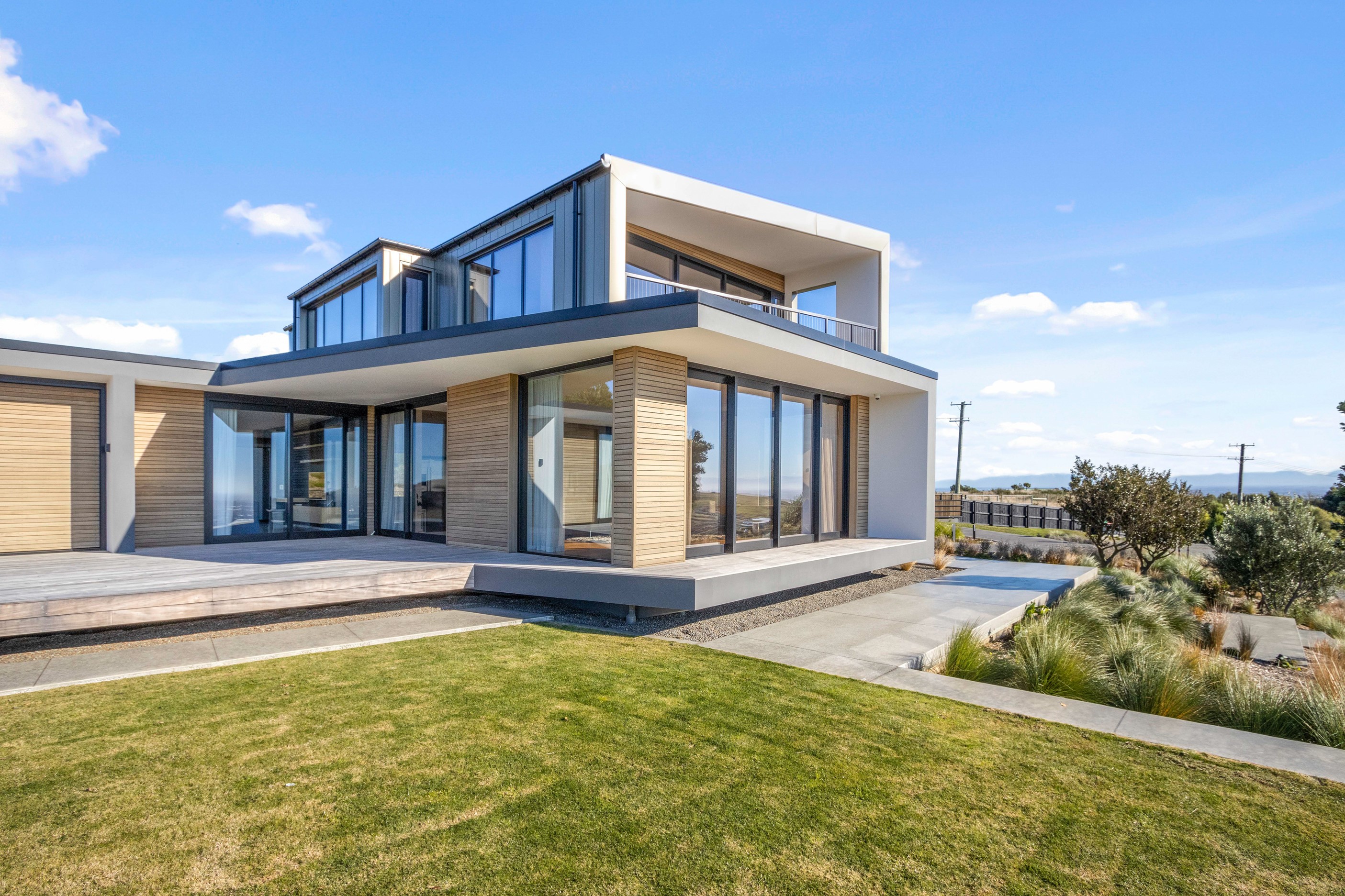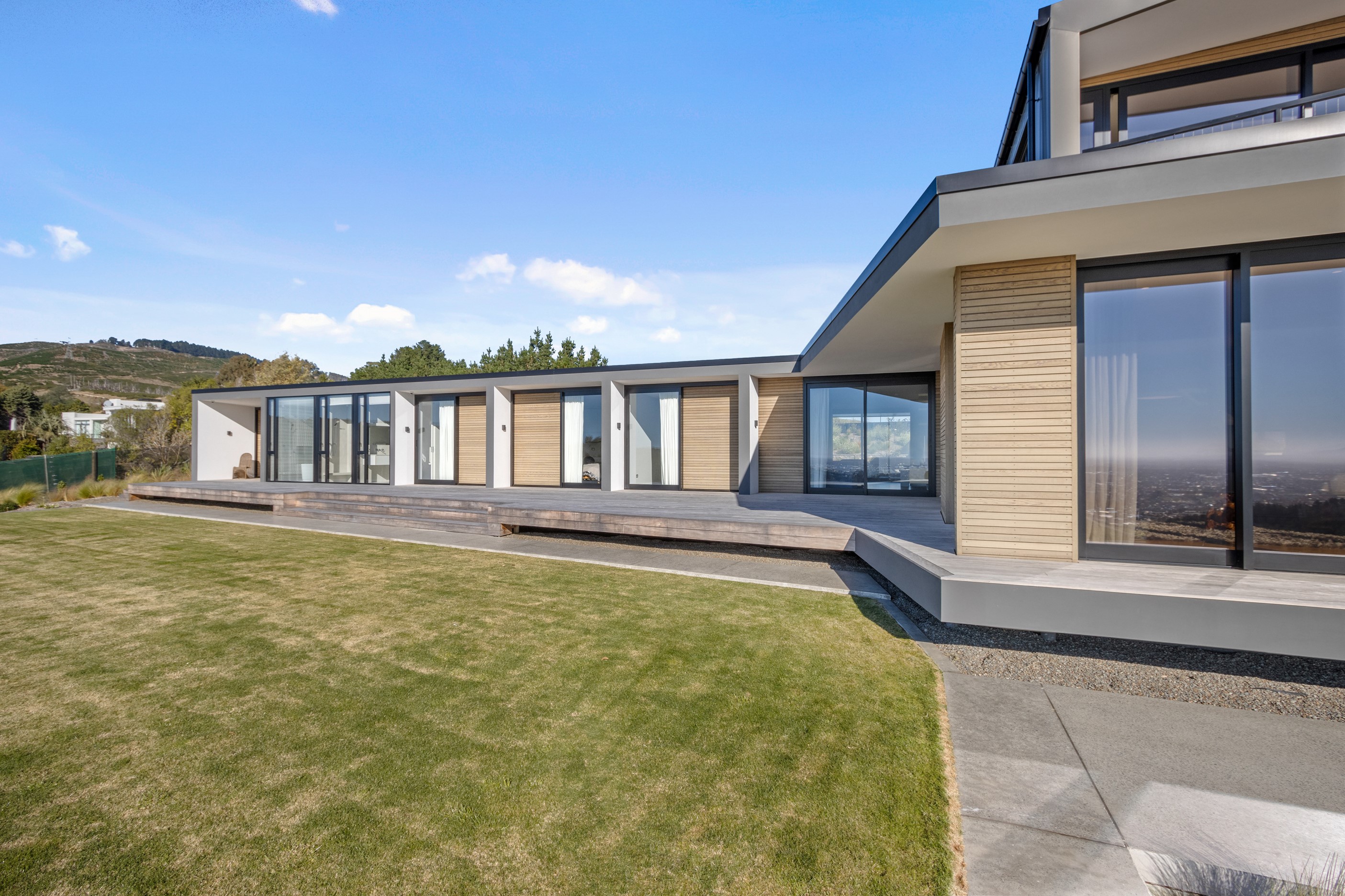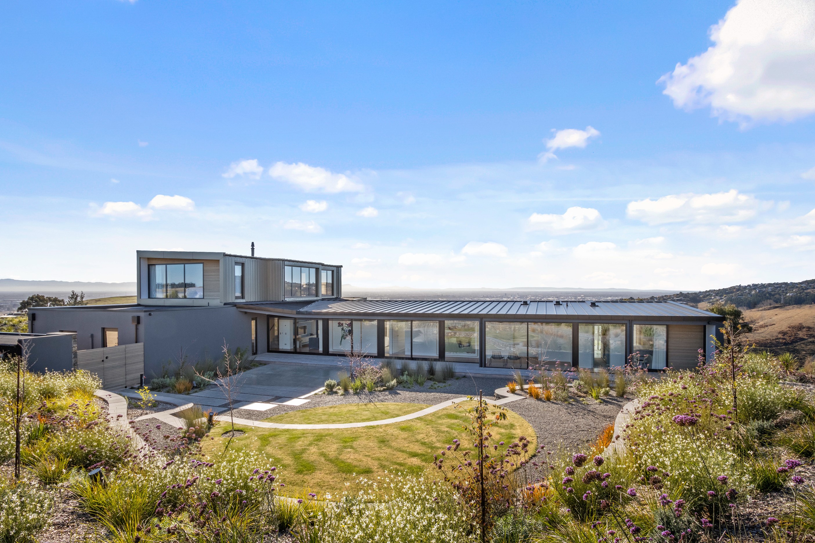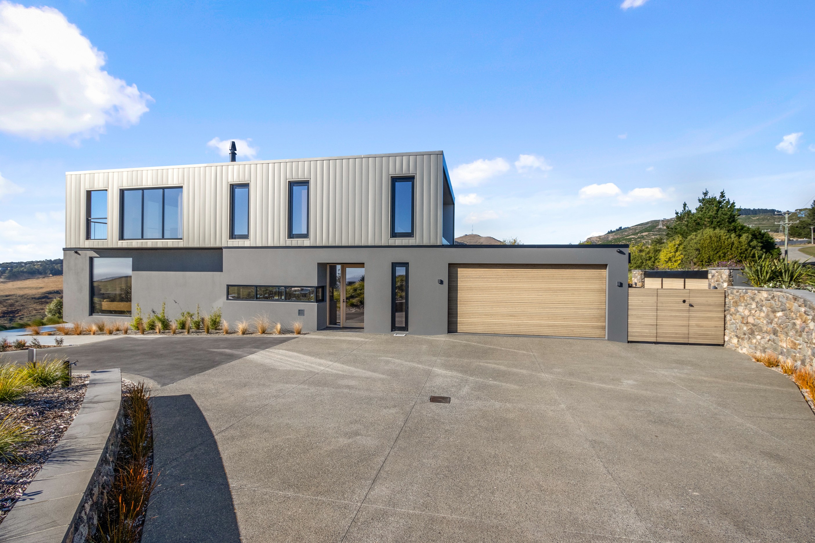 Perched high in the Port Hills, this magnificent house commands a panoramic outlook, spanning from the Southern Alps to the Kaikōura Range. Built to replace the owner’s previous home – lost in the Port Hills fires – the 405sqm layout comprises four bedrooms, three bathrooms and generous open-plan living on the first level. Upstairs is a retreat with the main bedroom and ensuite, plus a relaxing second living area. A contemporary palette of white and soft neutrals marries perfectly with birch plywood joinery and Mont Blanc granite benchtops in the kitchen and bathrooms. The striking entrance contains a quartzite slate wall and full-height cedar pivot doors. Warm oak flooring extends throughout, while full-height glazing flows seamlessly to the exterior. The dark-hued ground floor, contrasted with elements of cedar, anchors the house while the bronzed anodised top box floats above like a lantern. There are multiple sheltered outdoor spaces and extensive landscaping featuring rock walls, paving and gravel paths softened with lawn, shrubs and trees.