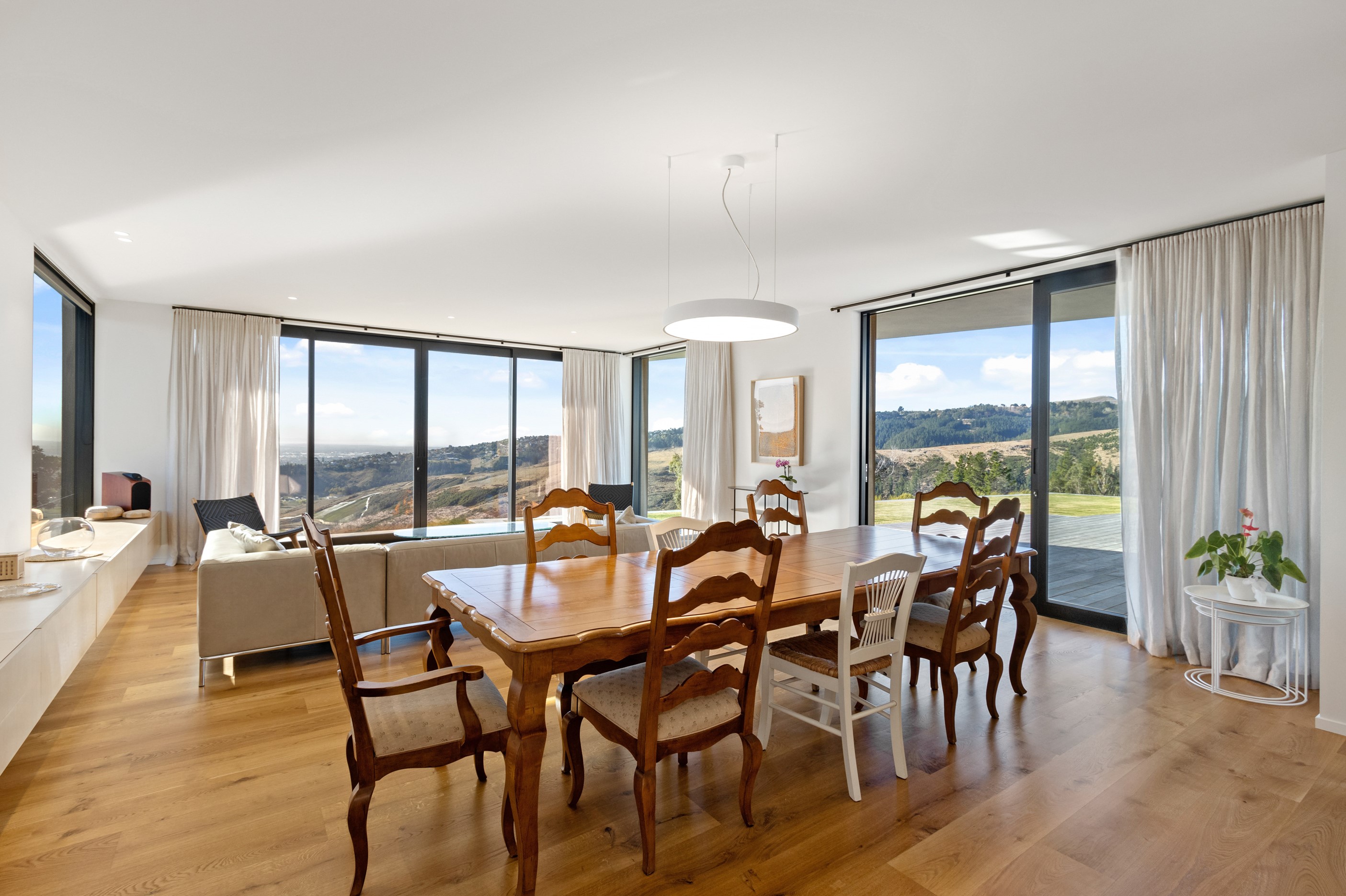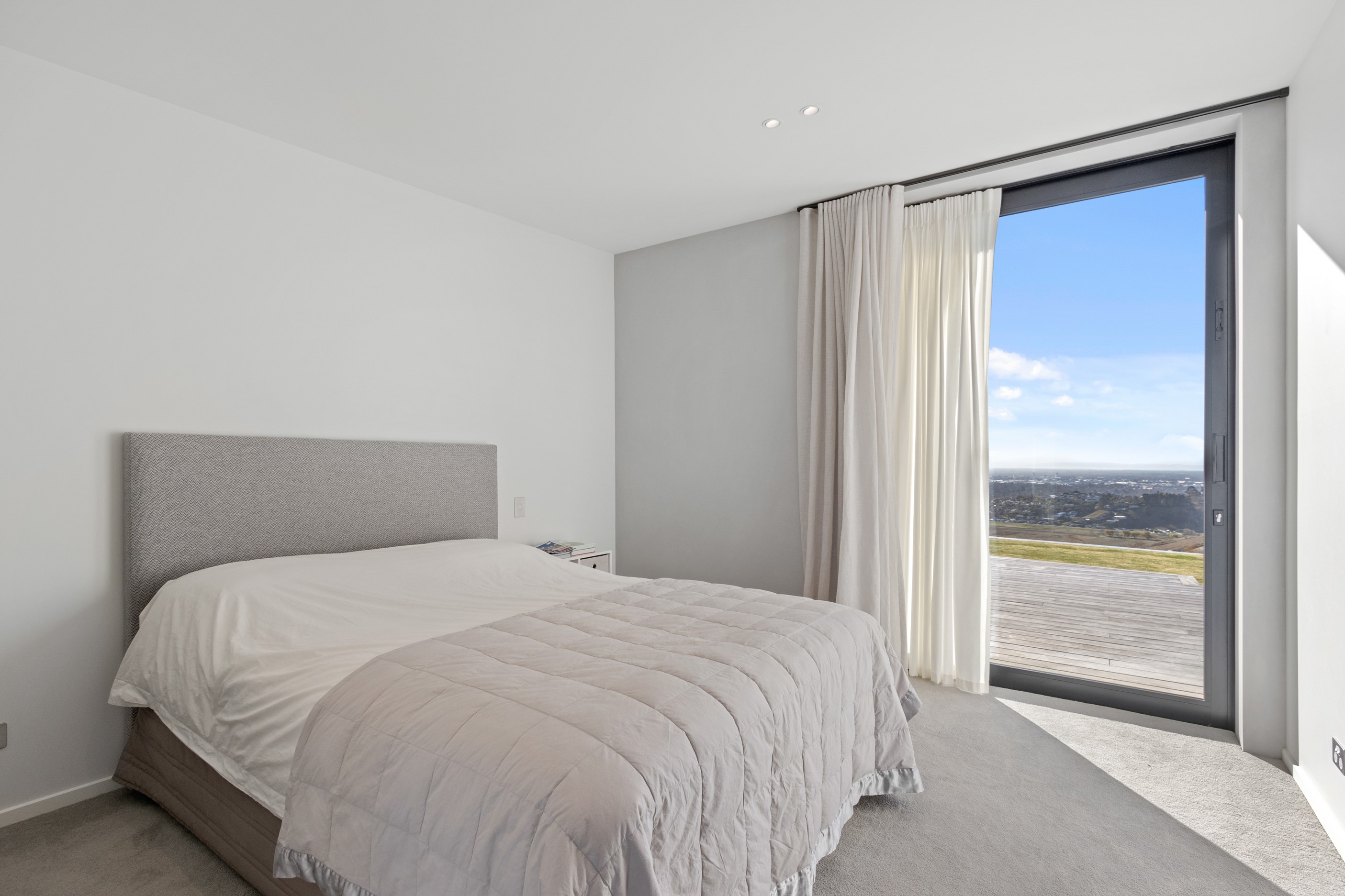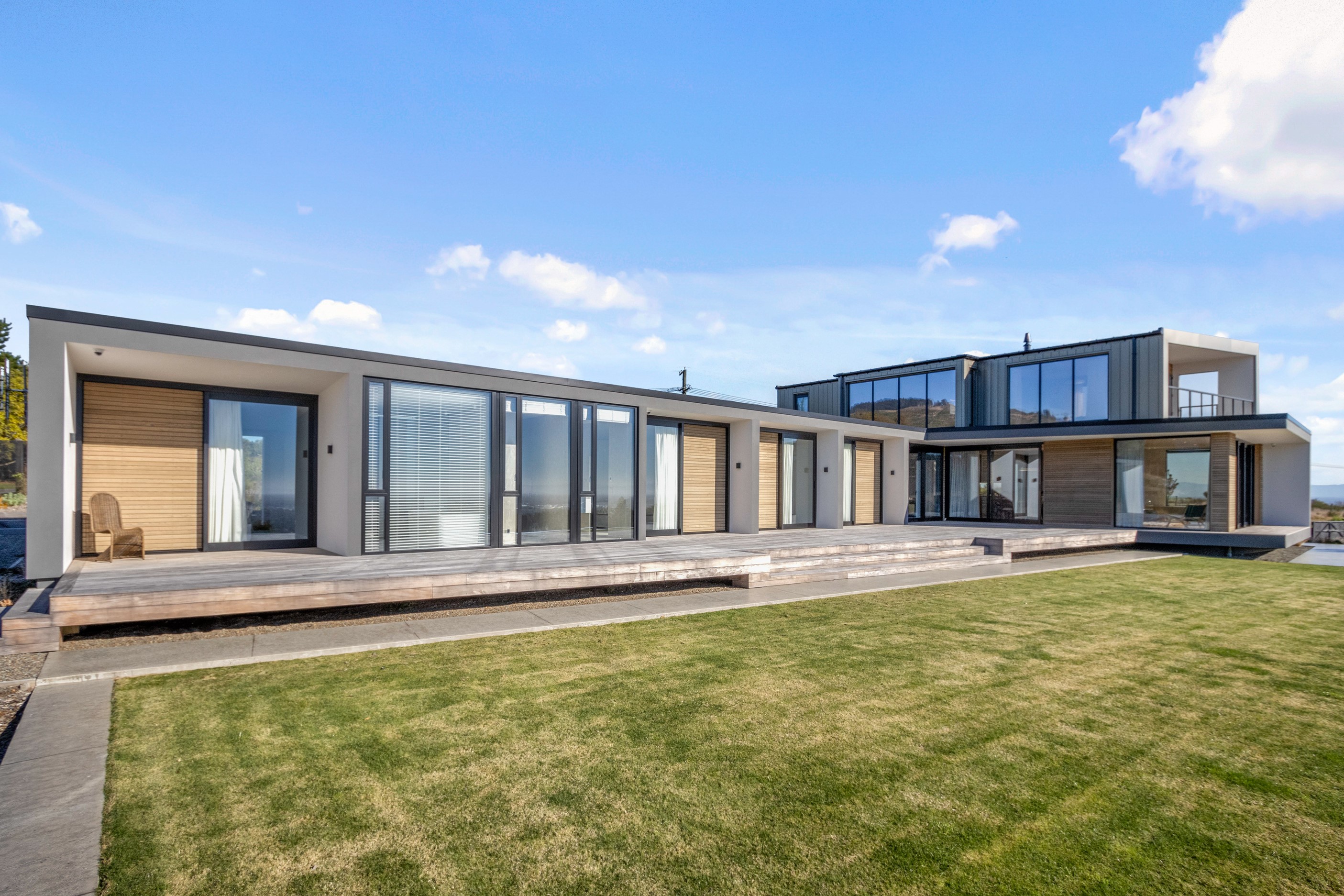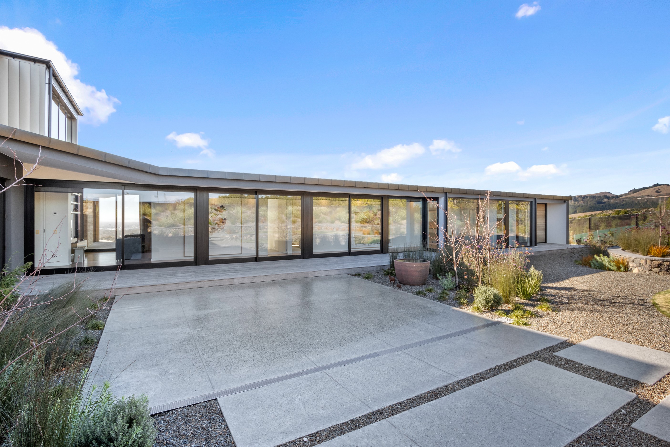 Perched high in the Port Hills, this magnificent house commands a panoramic outlook, spanning from the Southern Alps to the Kaikōura Range. Built to replace the owner’s previous home – lost in the Port Hills fires – the 405sqm layout comprises four bedrooms, three bathrooms and generous open-plan living on the first level. Upstairs is a retreat with the main bedroom and ensuite, plus a relaxing second living area. A contemporary palette of white and soft neutrals marries perfectly with birch plywood joinery and Mont Blanc granite benchtops in the kitchen and bathrooms. The striking entrance contains a quartzite slate wall and full-height cedar pivot doors. Warm oak flooring extends throughout, while full-height glazing flows seamlessly to the exterior. The dark-hued ground floor, contrasted with elements of cedar, anchors the house while the bronzed anodised top box floats above like a lantern. There are multiple sheltered outdoor spaces and extensive landscaping featuring rock walls, paving and gravel paths softened with lawn, shrubs and trees.