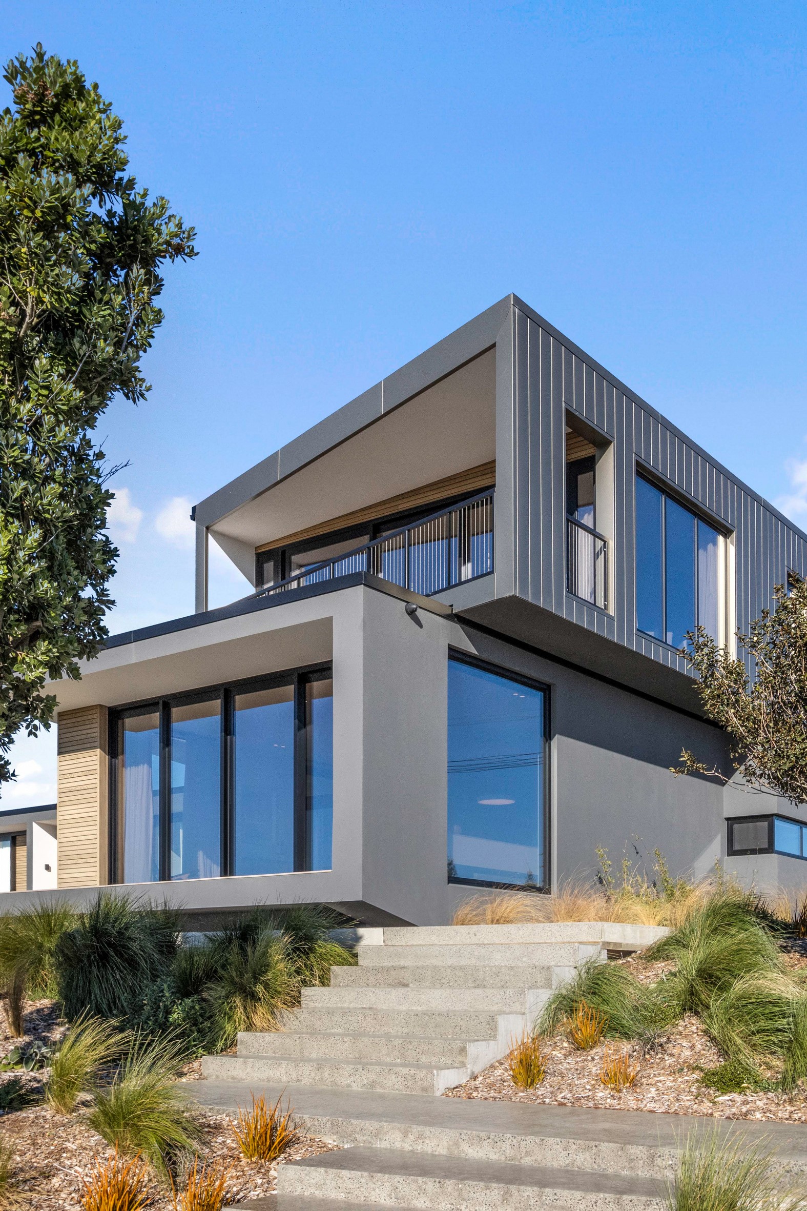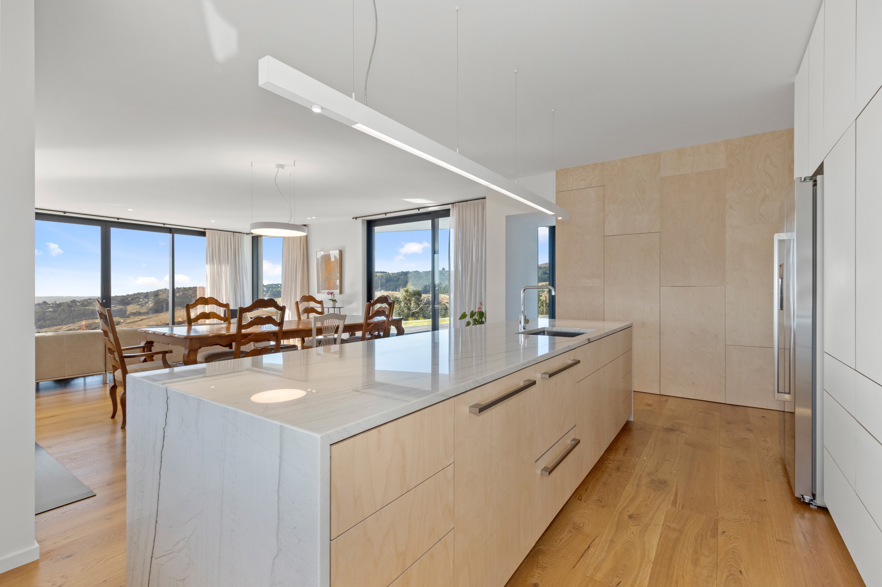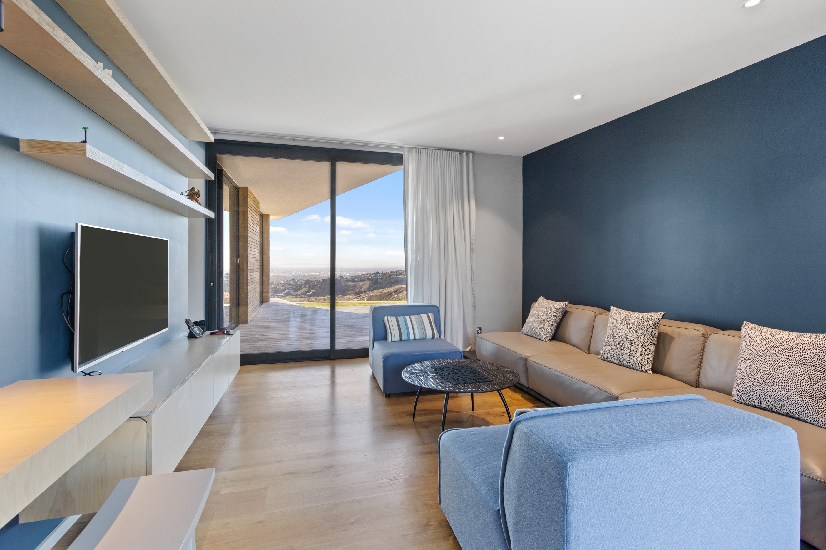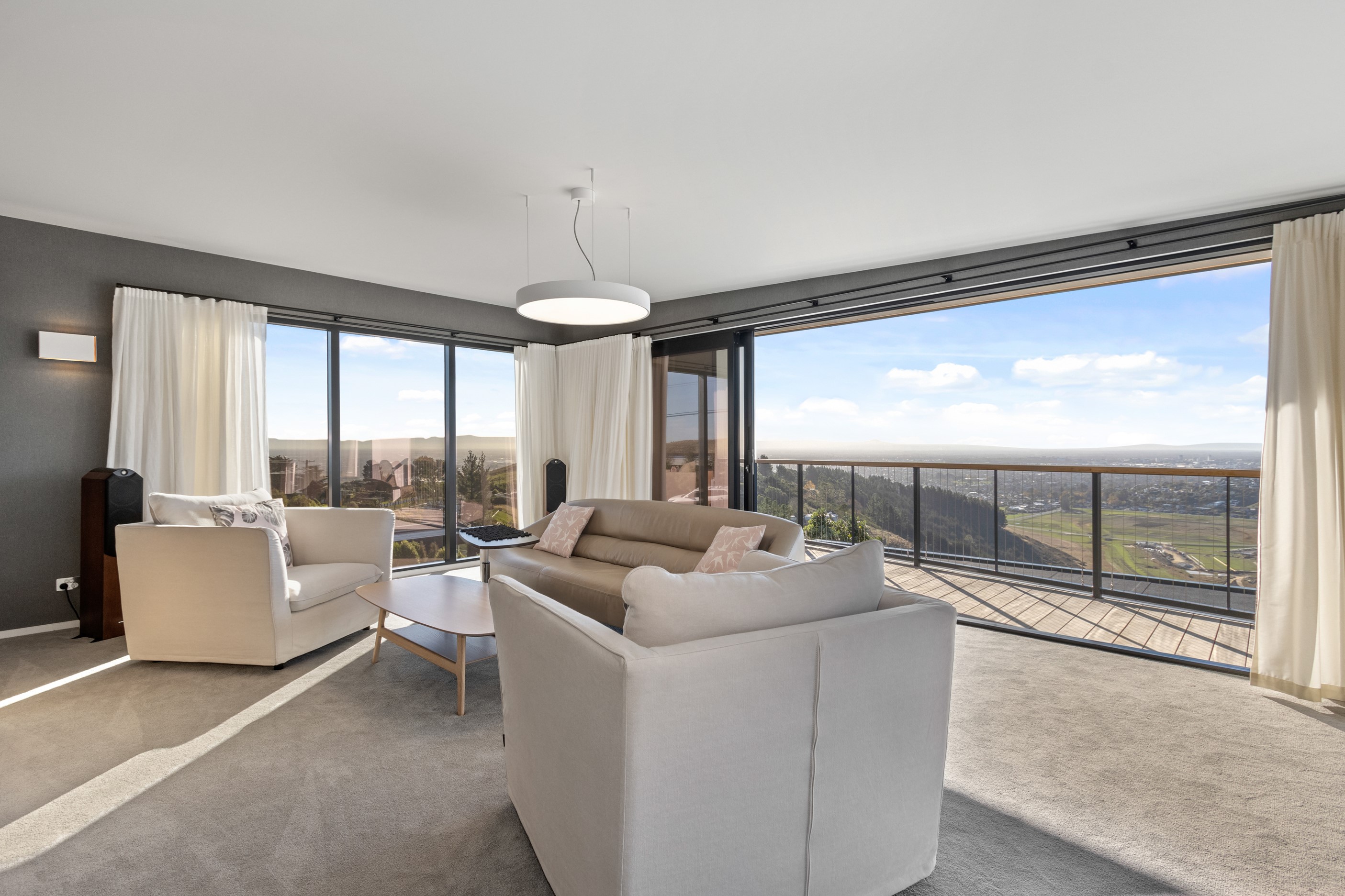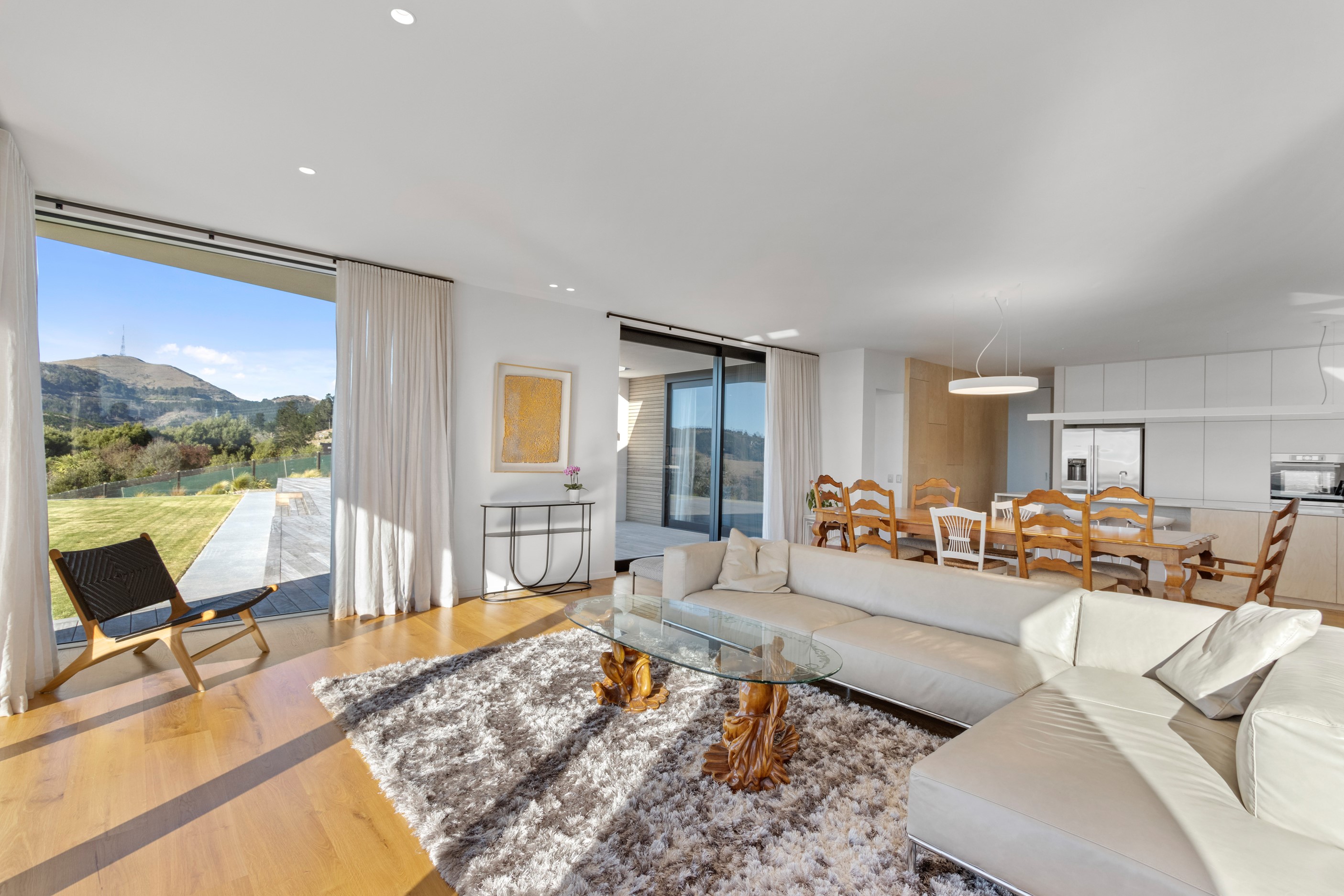 Perched high in the Port Hills, this magnificent house commands a panoramic outlook, spanning from the Southern Alps to the Kaikōura Range. Built to replace the owner’s previous home – lost in the Port Hills fires – the 405sqm layout comprises four bedrooms, three bathrooms and generous open-plan living on the first level. Upstairs is a retreat with the main bedroom and ensuite, plus a relaxing second living area. A contemporary palette of white and soft neutrals marries perfectly with birch plywood joinery and Mont Blanc granite benchtops in the kitchen and bathrooms. The striking entrance contains a quartzite slate wall and full-height cedar pivot doors. Warm oak flooring extends throughout, while full-height glazing flows seamlessly to the exterior. The dark-hued ground floor, contrasted with elements of cedar, anchors the house while the bronzed anodised top box floats above like a lantern. There are multiple sheltered outdoor spaces and extensive landscaping featuring rock walls, paving and gravel paths softened with lawn, shrubs and trees.