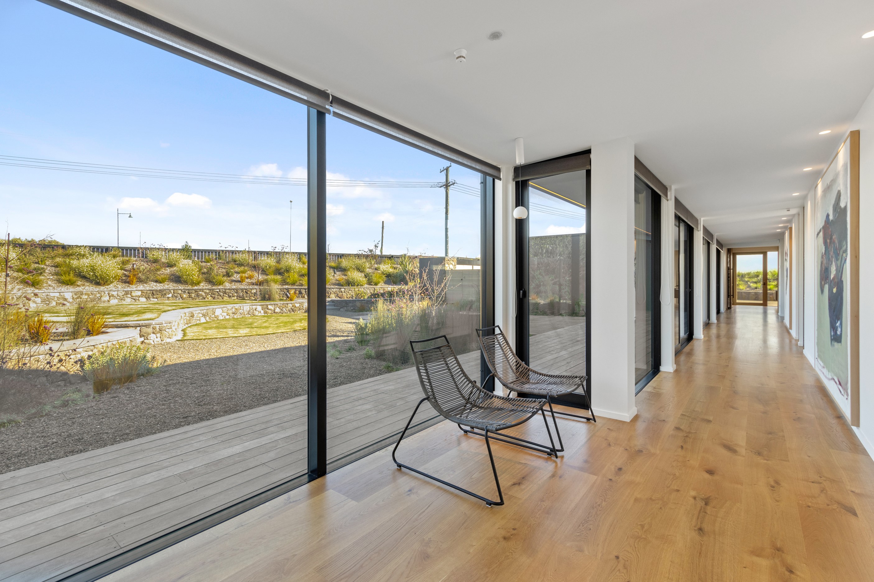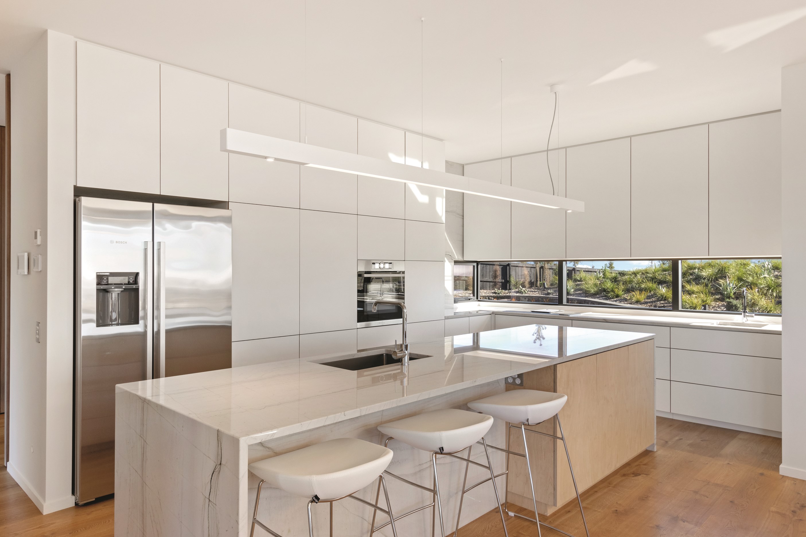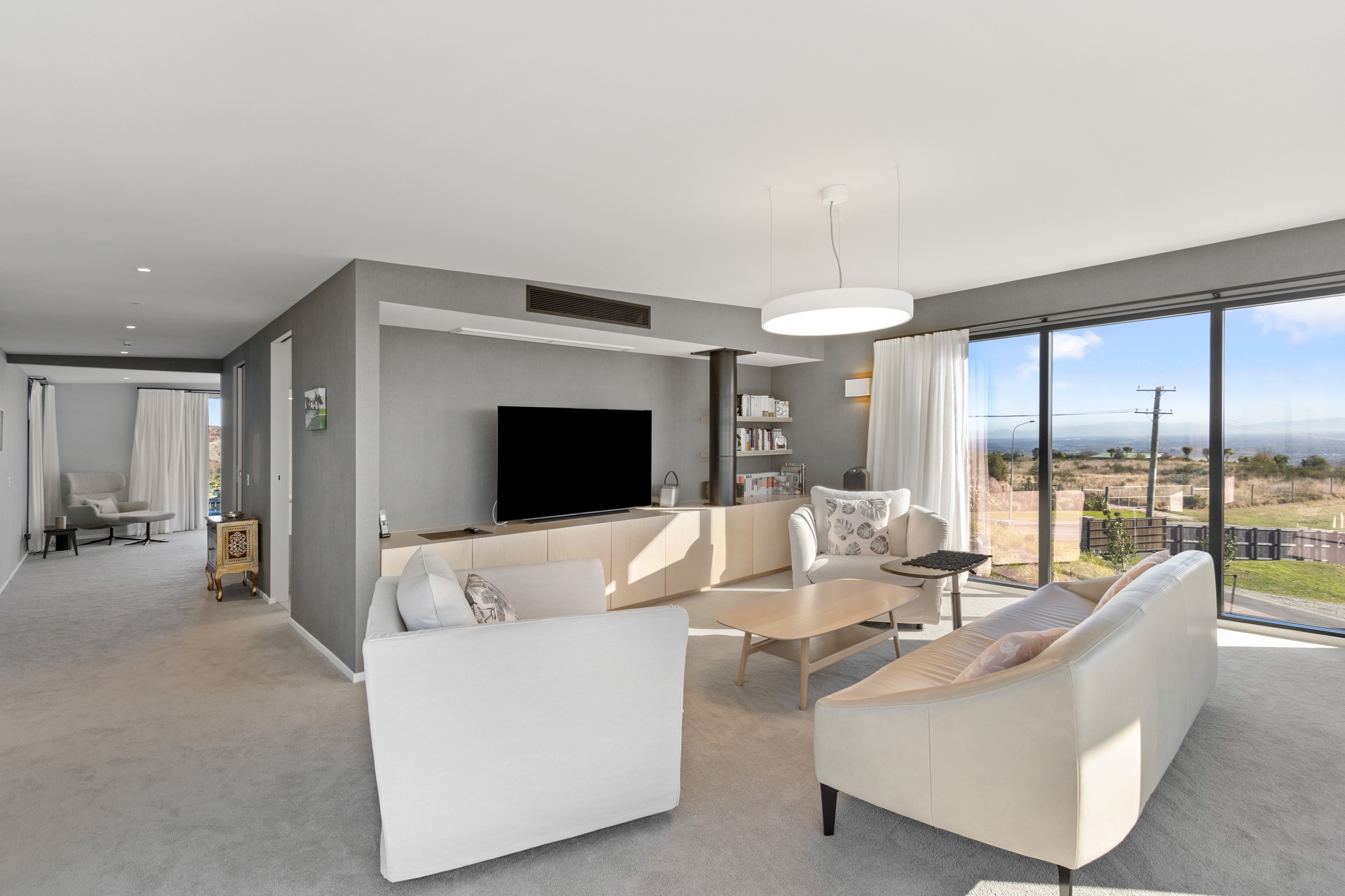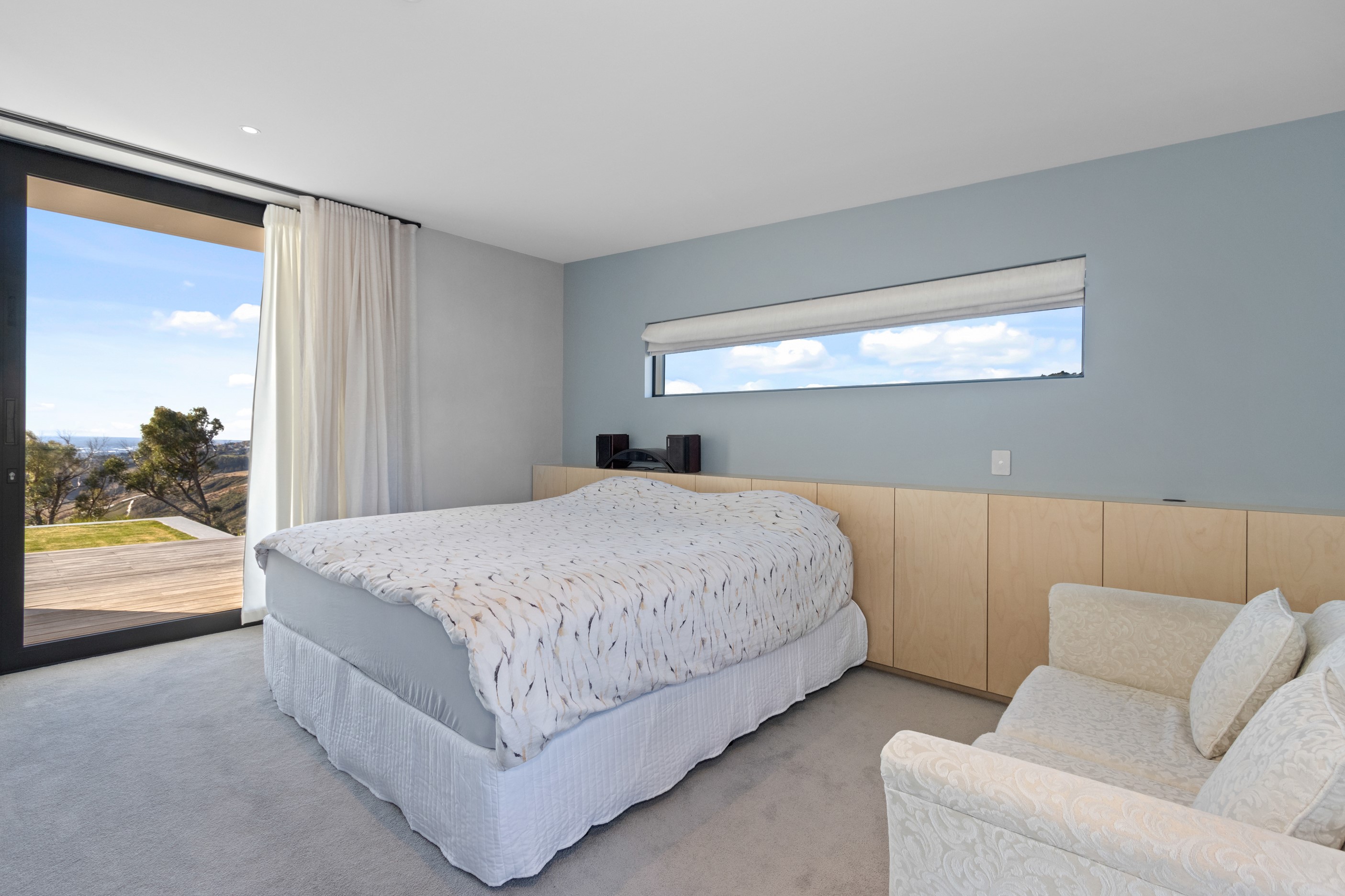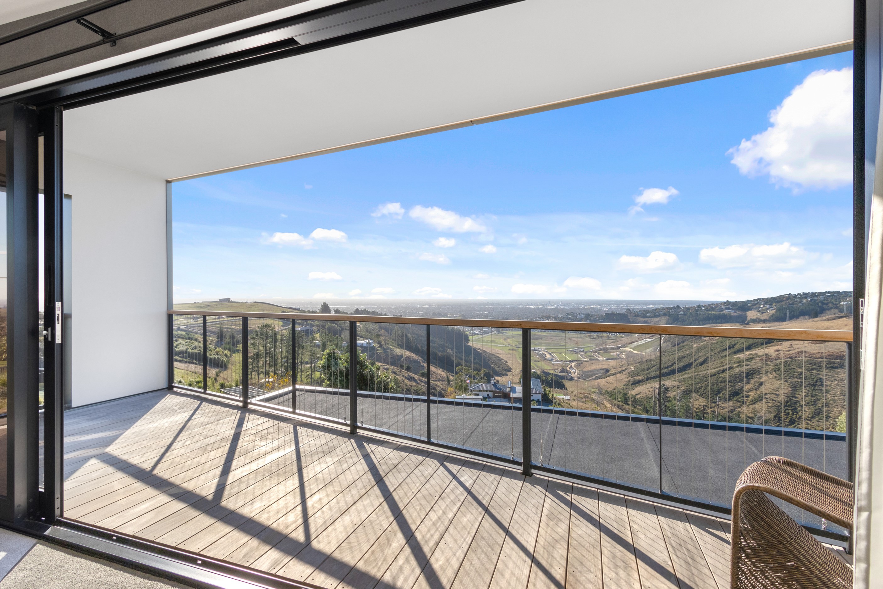 Perched high in the Port Hills, this magnificent house commands a panoramic outlook, spanning from the Southern Alps to the Kaikōura Range. Built to replace the owner’s previous home – lost in the Port Hills fires – the 405sqm layout comprises four bedrooms, three bathrooms and generous open-plan living on the first level. Upstairs is a retreat with the main bedroom and ensuite, plus a relaxing second living area. A contemporary palette of white and soft neutrals marries perfectly with birch plywood joinery and Mont Blanc granite benchtops in the kitchen and bathrooms. The striking entrance contains a quartzite slate wall and full-height cedar pivot doors. Warm oak flooring extends throughout, while full-height glazing flows seamlessly to the exterior. The dark-hued ground floor, contrasted with elements of cedar, anchors the house while the bronzed anodised top box floats above like a lantern. There are multiple sheltered outdoor spaces and extensive landscaping featuring rock walls, paving and gravel paths softened with lawn, shrubs and trees.