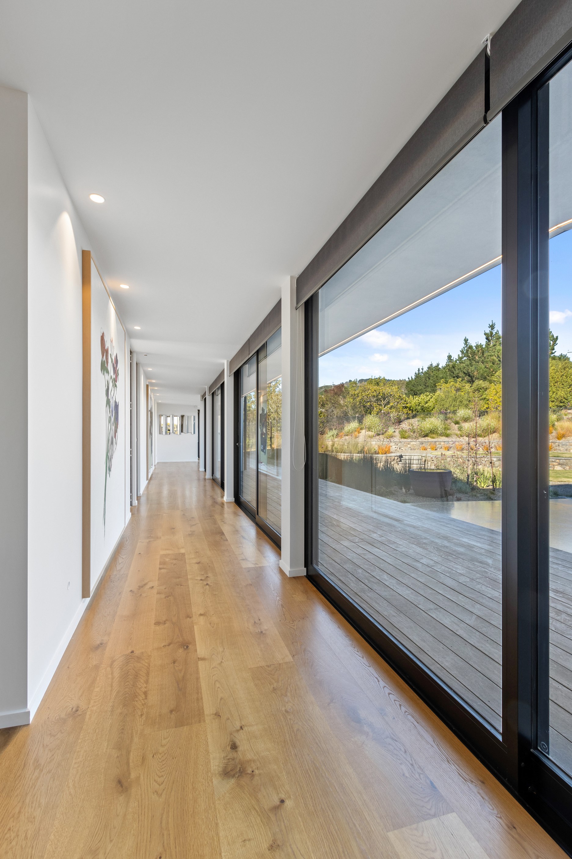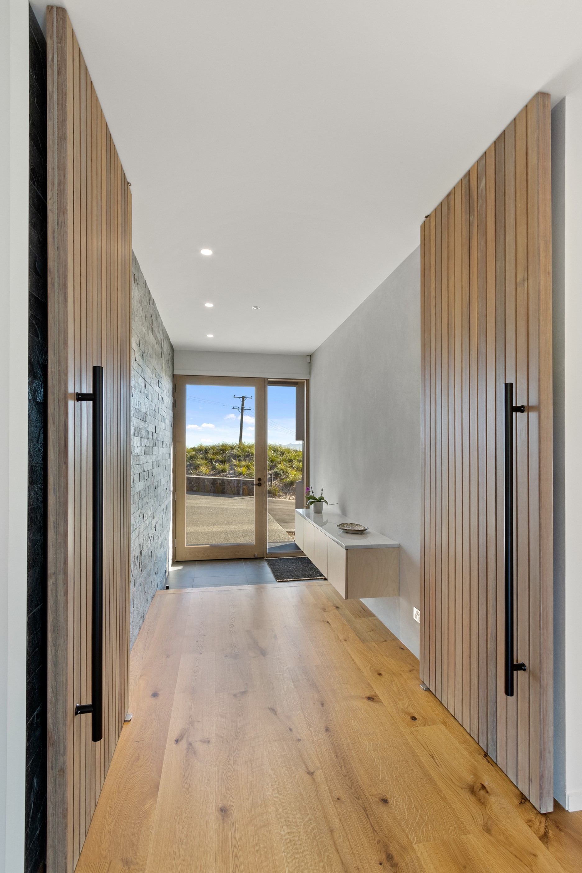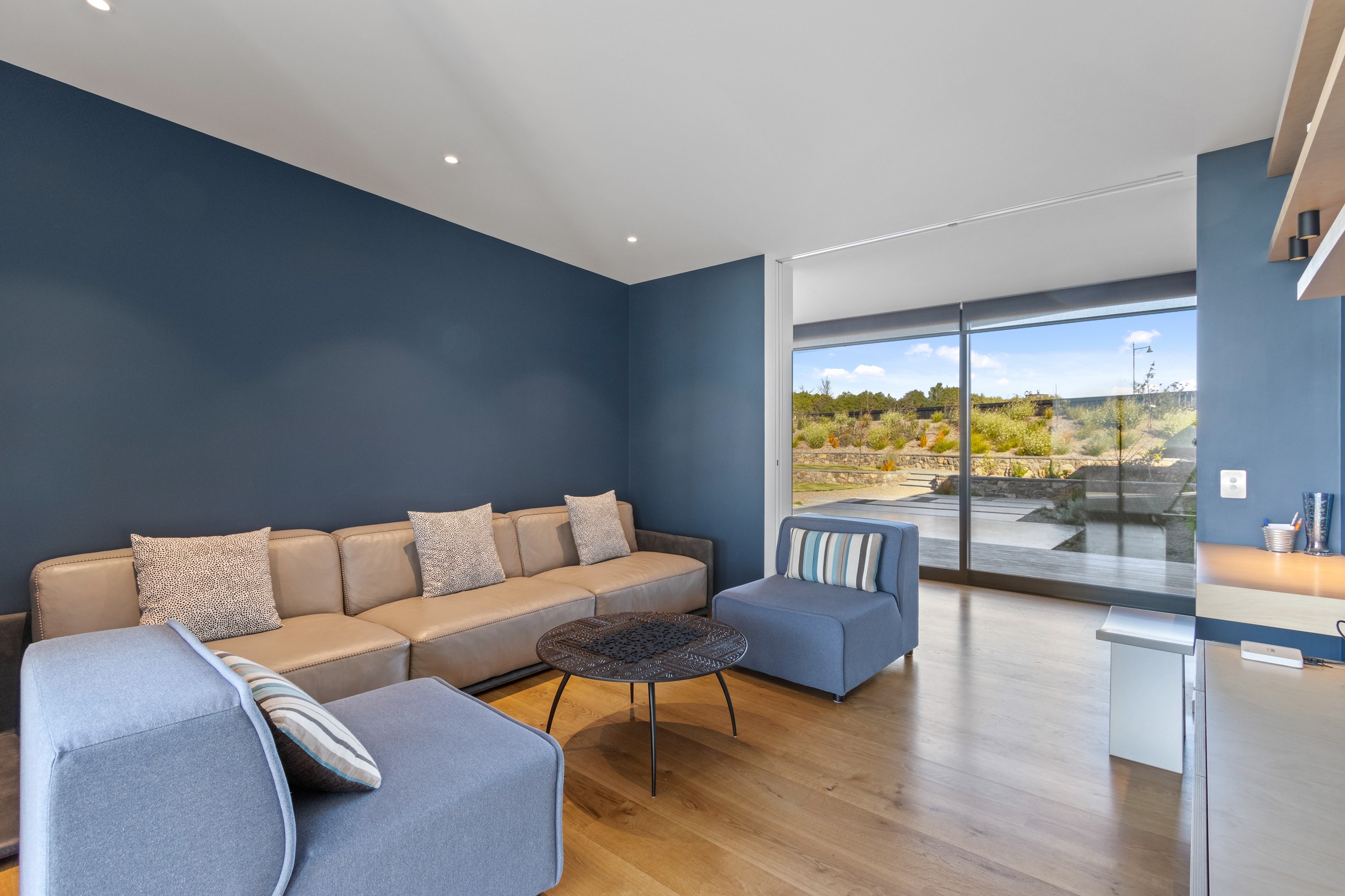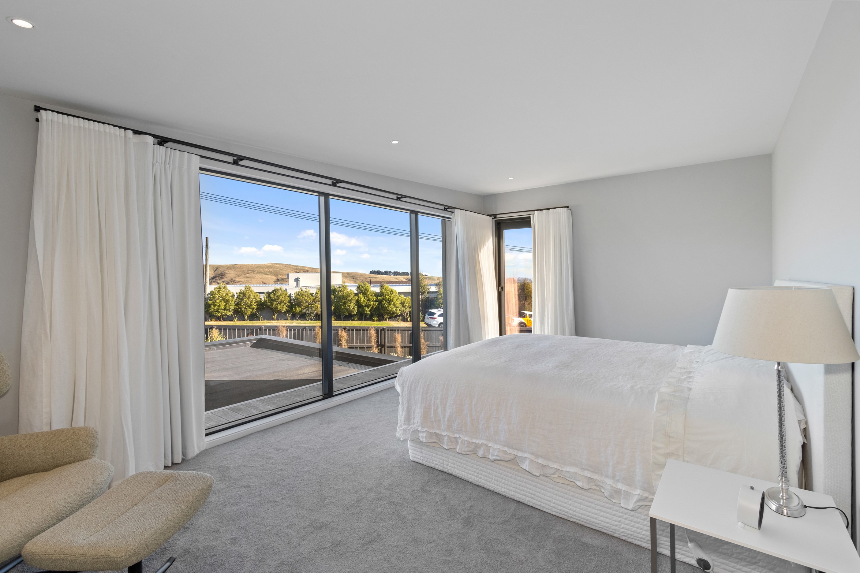 Perched high in the Port Hills, this magnificent house commands a panoramic outlook, spanning from the Southern Alps to the Kaikōura Range. Built to replace the owner’s previous home – lost in the Port Hills fires – the 405sqm layout comprises four bedrooms, three bathrooms and generous open-plan living on the first level. Upstairs is a retreat with the main bedroom and ensuite, plus a relaxing second living area. A contemporary palette of white and soft neutrals marries perfectly with birch plywood joinery and Mont Blanc granite benchtops in the kitchen and bathrooms. The striking entrance contains a quartzite slate wall and full-height cedar pivot doors. Warm oak flooring extends throughout, while full-height glazing flows seamlessly to the exterior. The dark-hued ground floor, contrasted with elements of cedar, anchors the house while the bronzed anodised top box floats above like a lantern. There are multiple sheltered outdoor spaces and extensive landscaping featuring rock walls, paving and gravel paths softened with lawn, shrubs and trees.