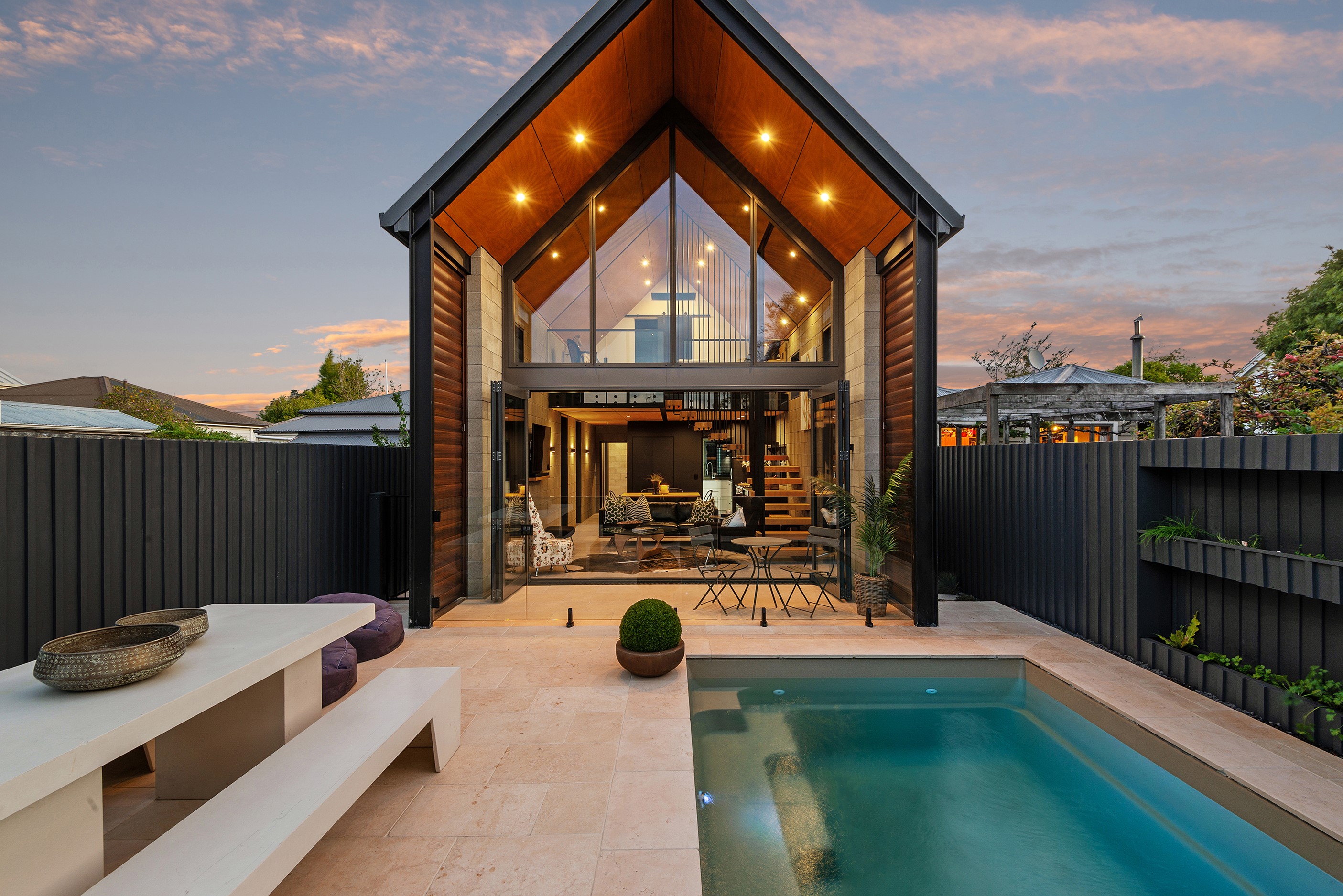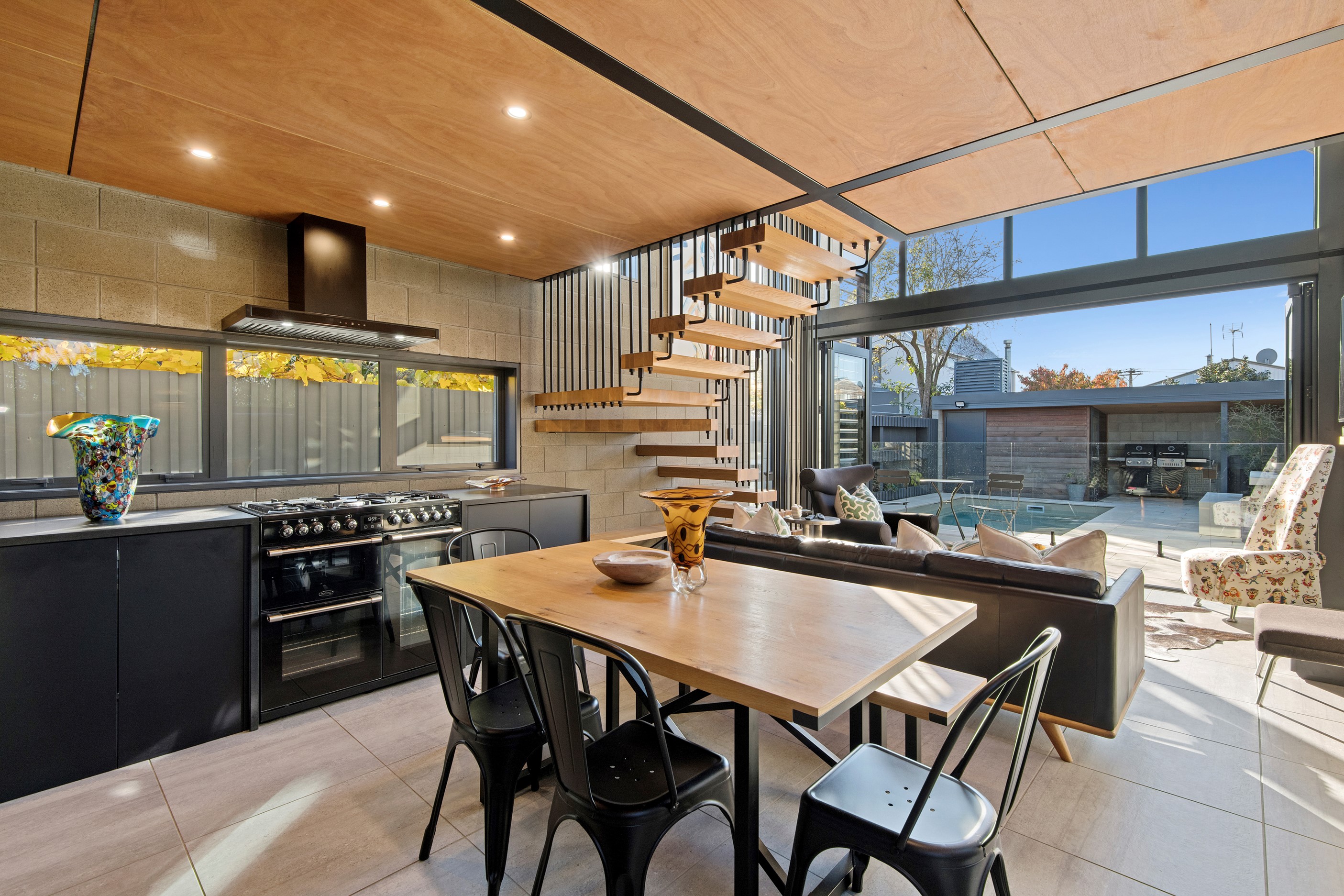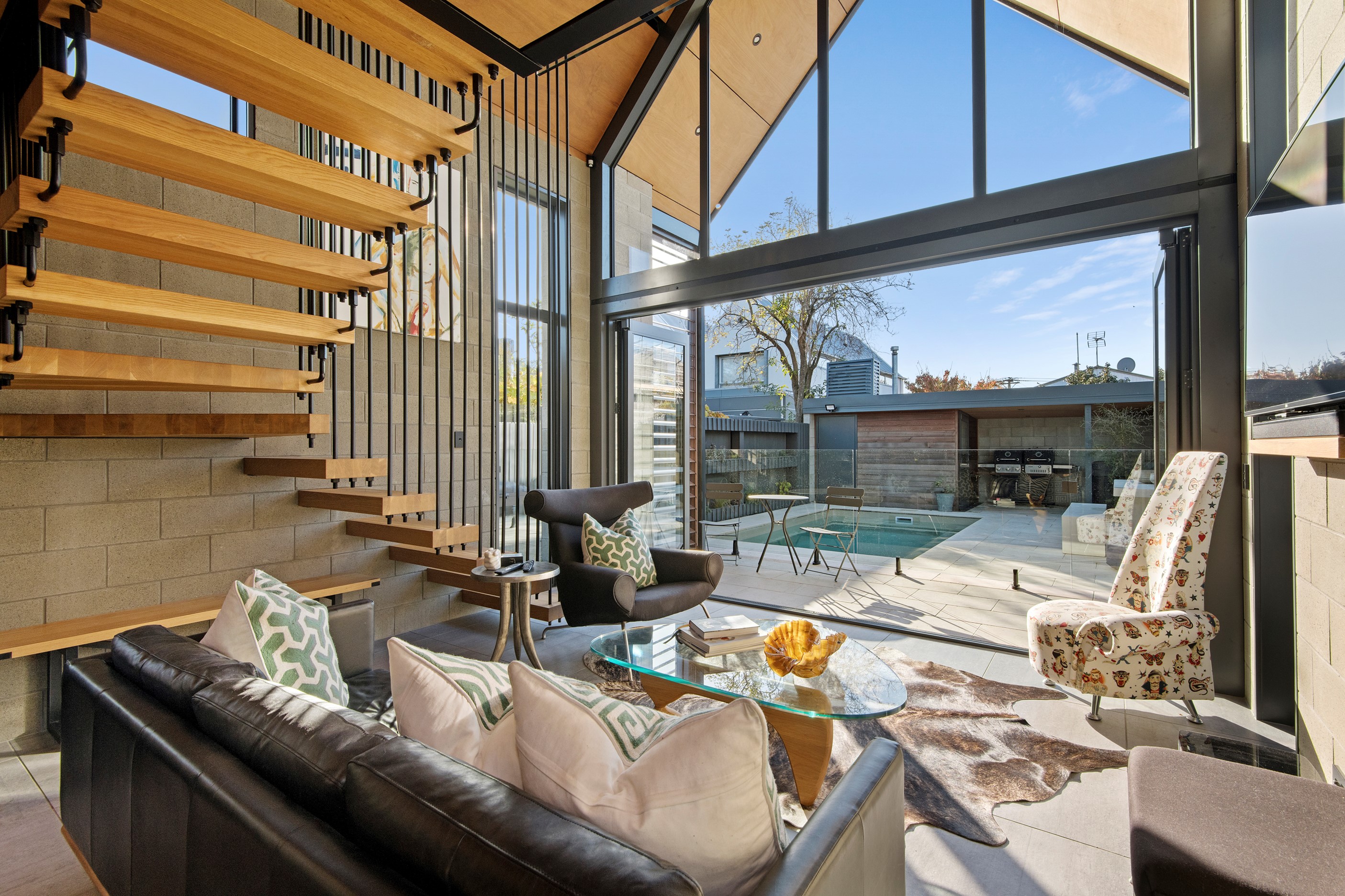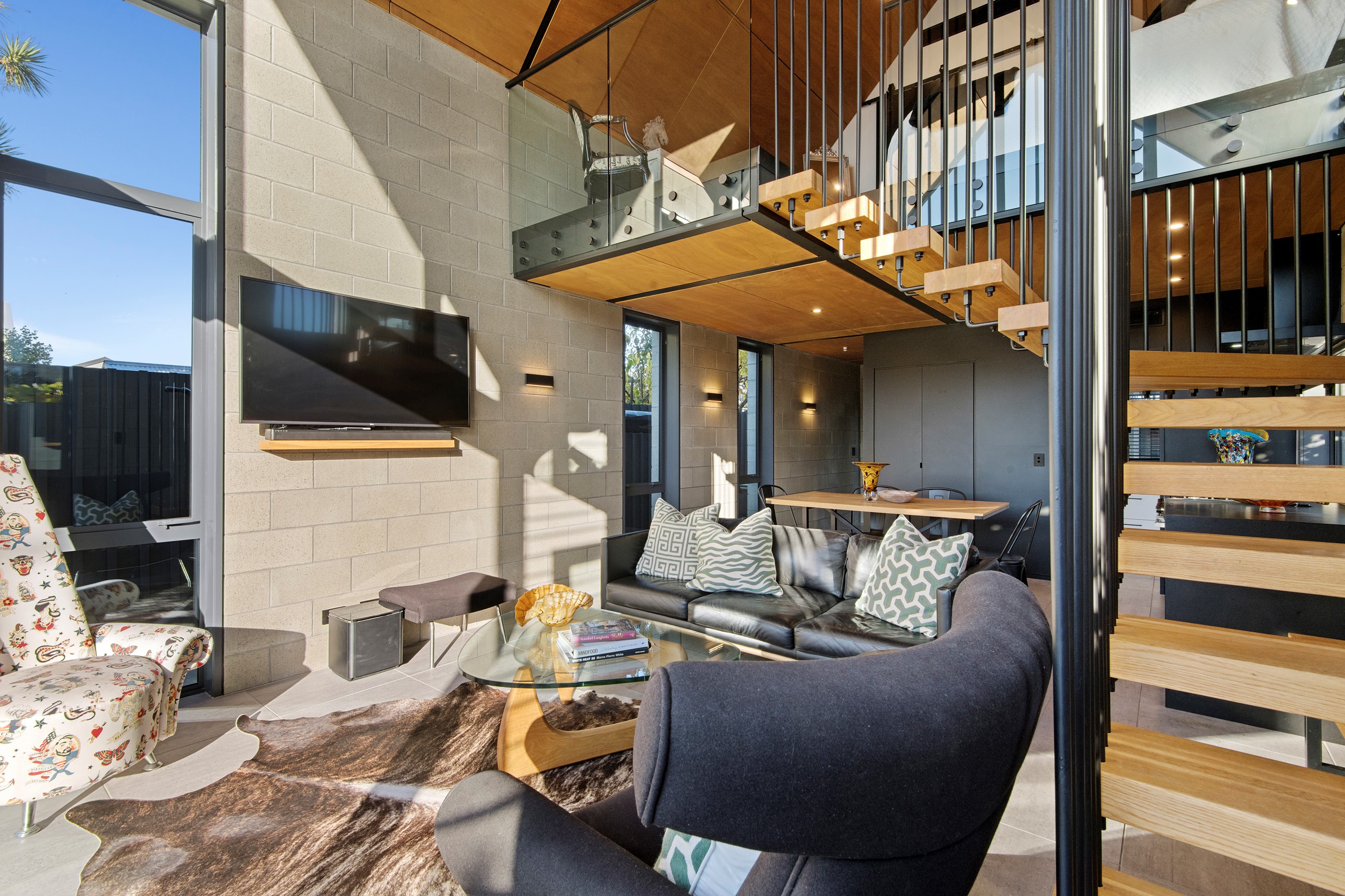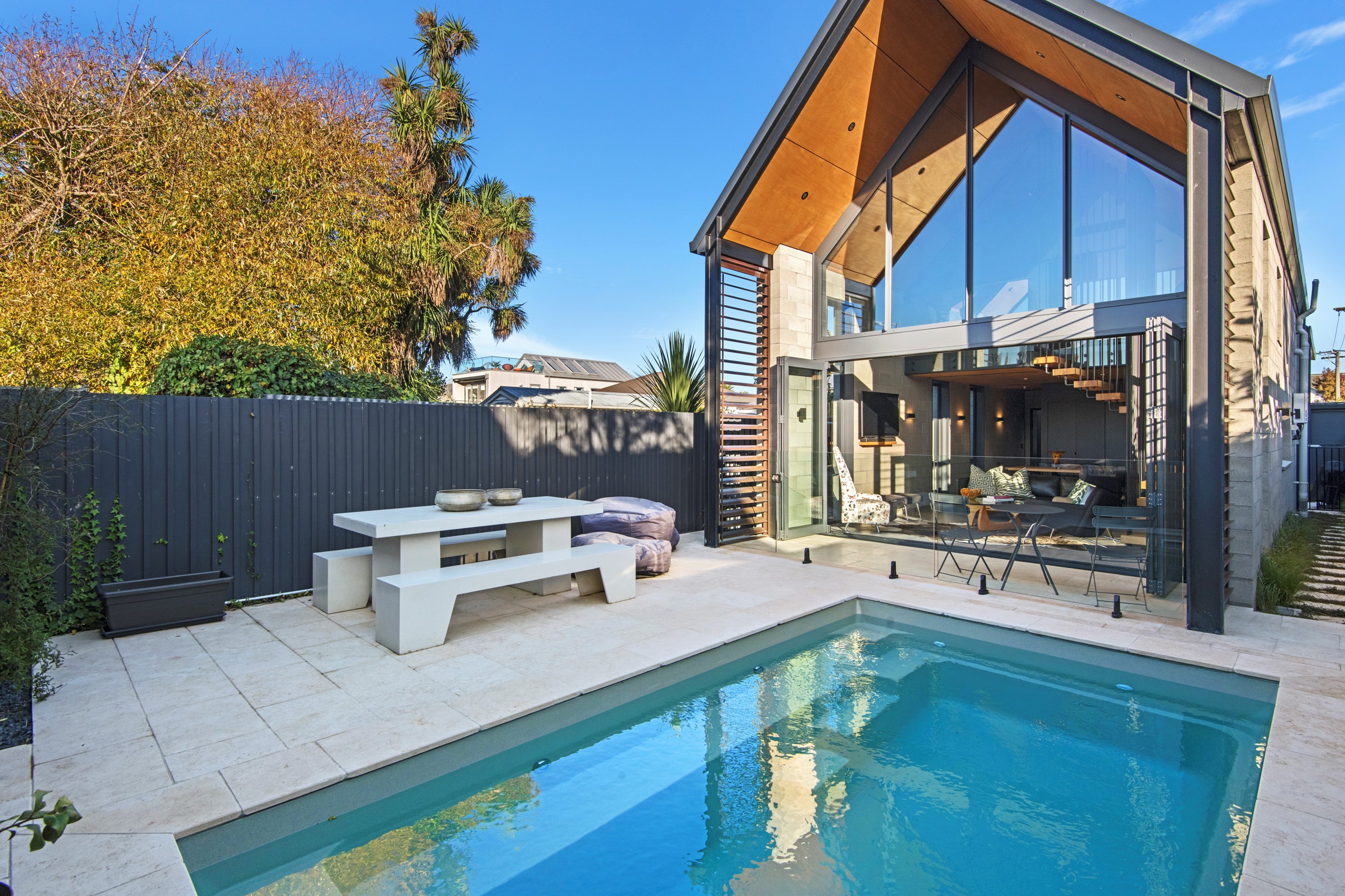 Built on a narrow site, the architectural design of this three-bedroom home is clever and the results are classy. The home is split across two fully self-contained pods connected with a secluded courtyard. Bold and beautiful concrete blockwork features throughout, setting the tone for industrial-style decor, including ply ceilings, exposed steel beams, and a fabulous floating staircase. The contemporary kitchen includes a butler’s pantry, which leaves the main preparation space sleek and unobtrusive. The open-plan living and dining space below the main-suite mezzanine extends into the spectacular outdoor living zone, which encompasses the pool and dining space. And for those chilly winter months, the spa pool and sauna are just the ticket for a soothing warm up. The uber-functional ‘south pod’ is also set over two levels, with two large bedrooms and ensuites, plus a self-contained living area. Thanks to the cleverly partitioned design, this home is ideal for extended families or Airbnb guests.