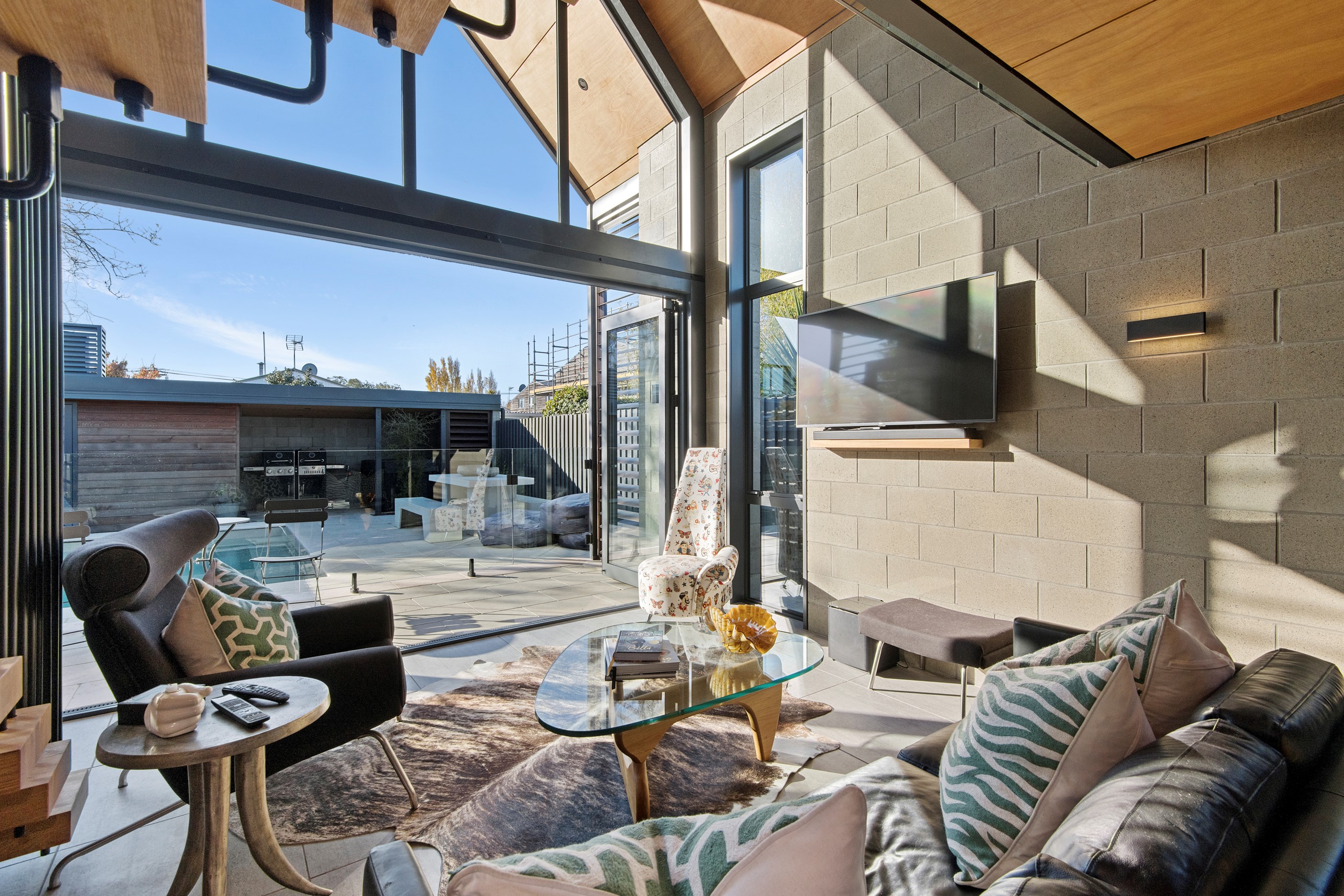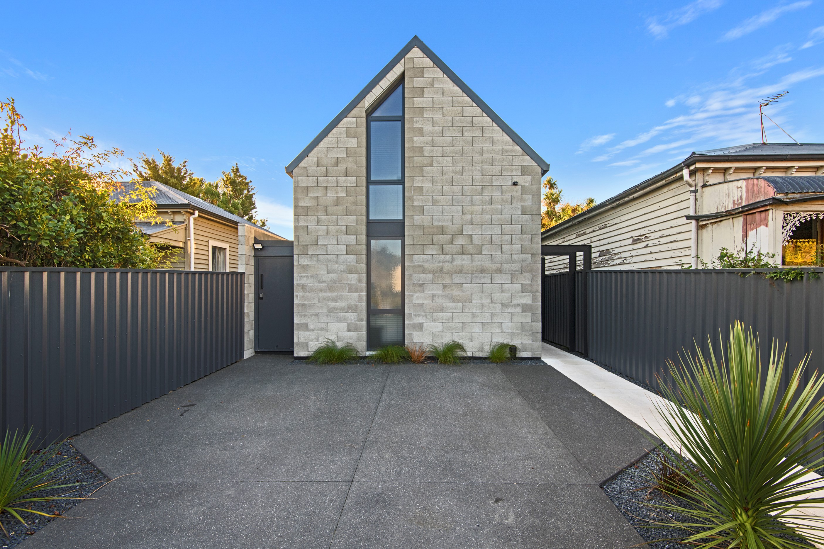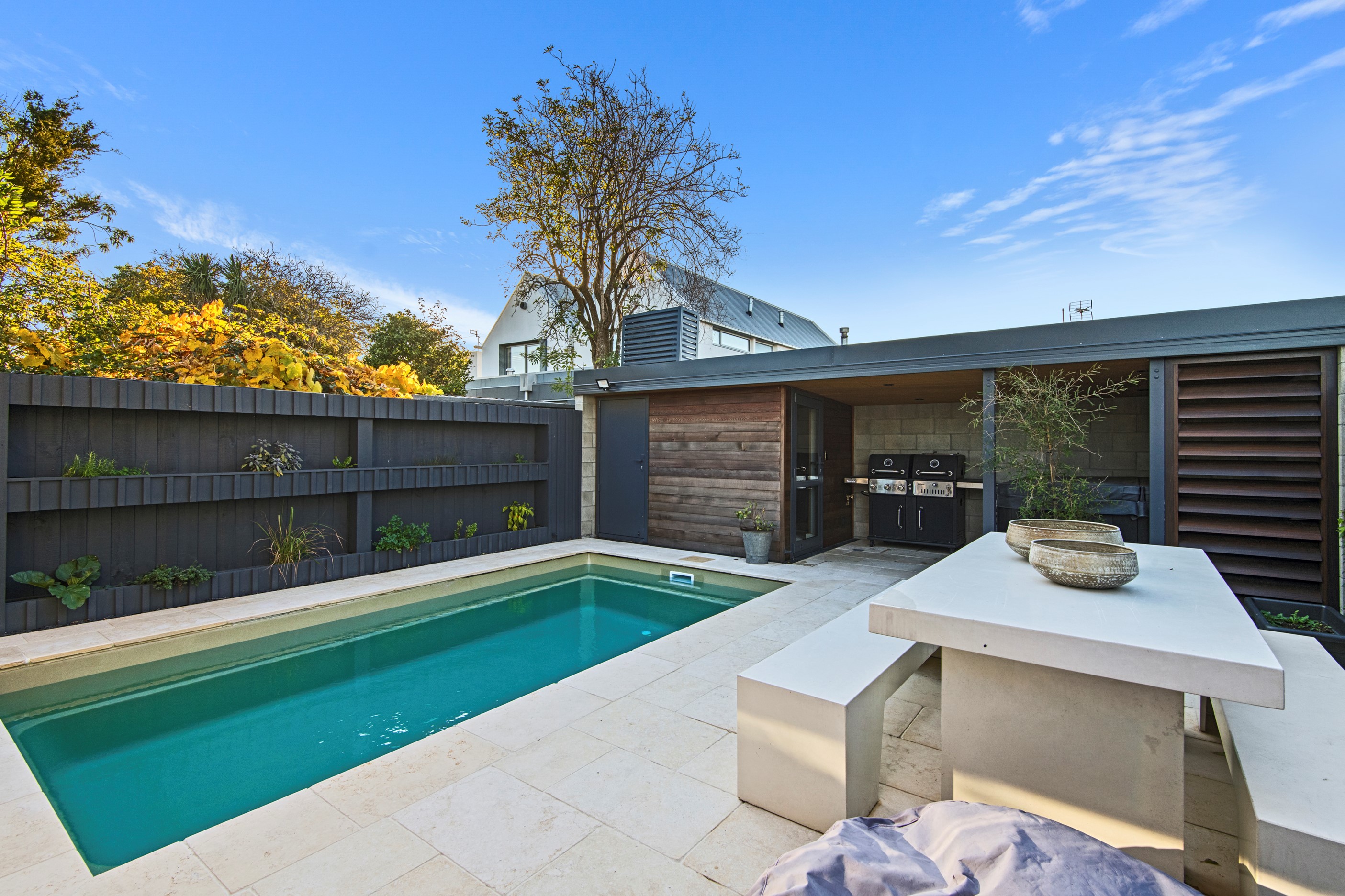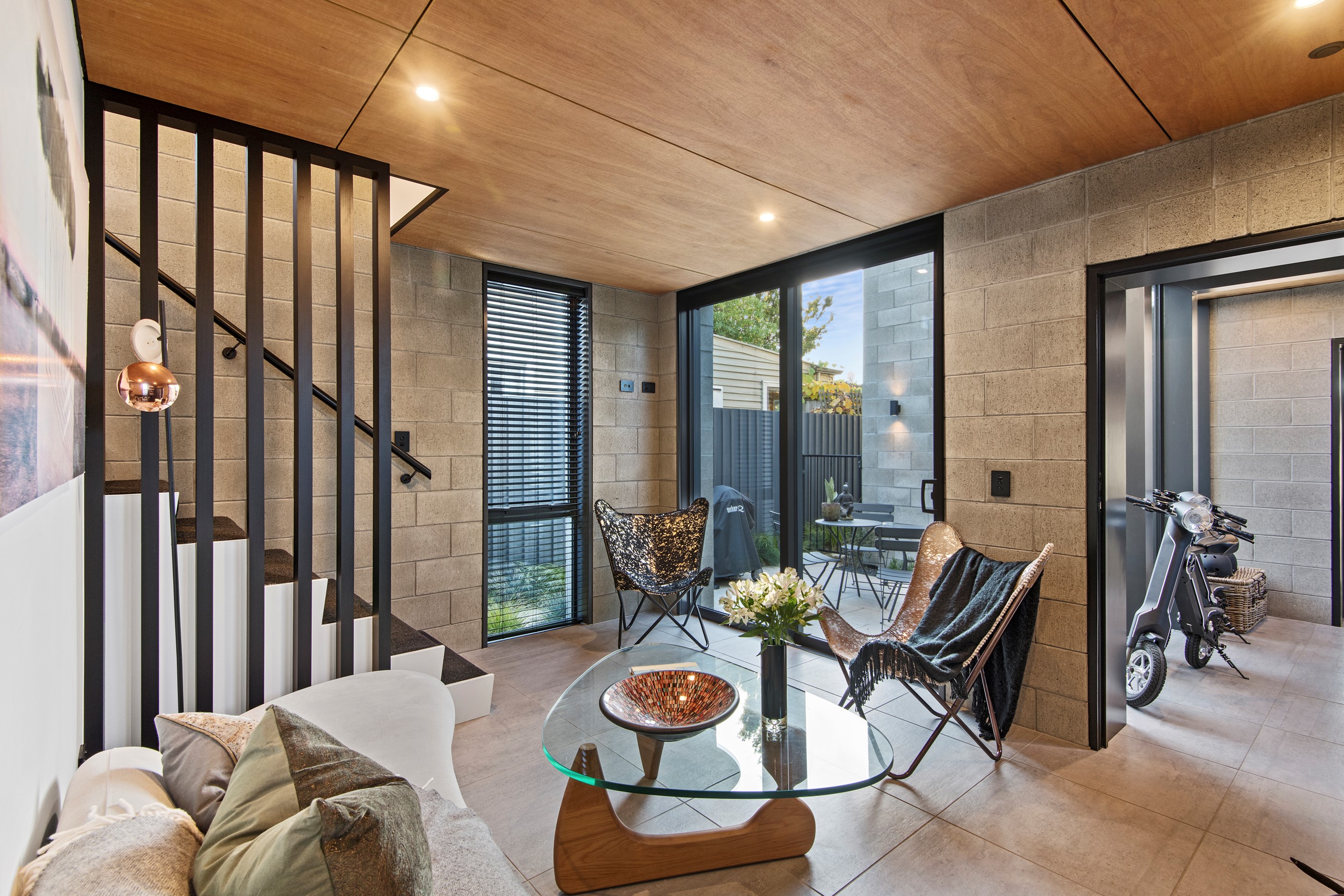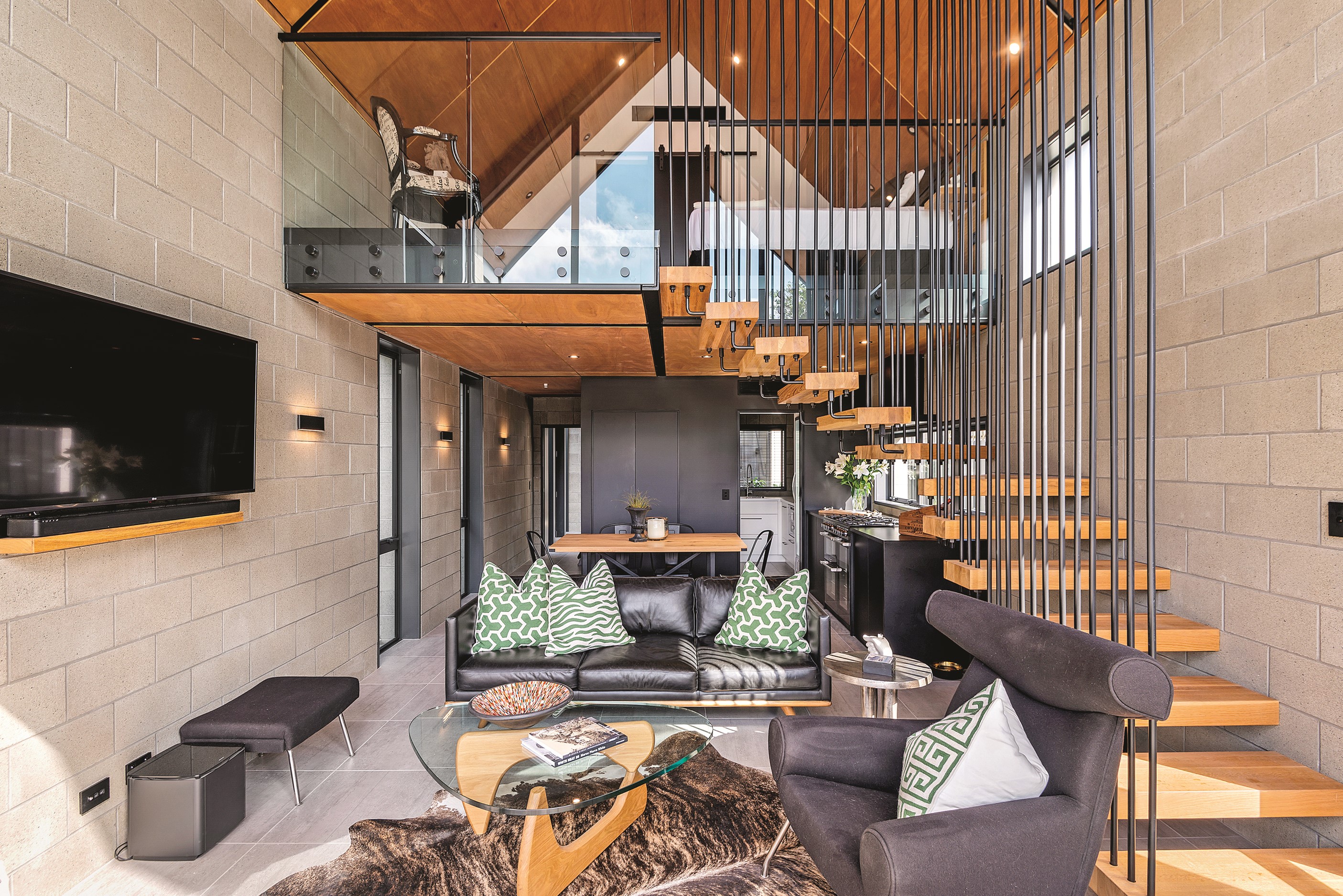 Built on a narrow site, the architectural design of this three-bedroom home is clever and the results are classy. The home is split across two fully self-contained pods connected with a secluded courtyard. Bold and beautiful concrete blockwork features throughout, setting the tone for industrial-style decor, including ply ceilings, exposed steel beams, and a fabulous floating staircase. The contemporary kitchen includes a butler’s pantry, which leaves the main preparation space sleek and unobtrusive. The open-plan living and dining space below the main-suite mezzanine extends into the spectacular outdoor living zone, which encompasses the pool and dining space. And for those chilly winter months, the spa pool and sauna are just the ticket for a soothing warm up. The uber-functional ‘south pod’ is also set over two levels, with two large bedrooms and ensuites, plus a self-contained living area. Thanks to the cleverly partitioned design, this home is ideal for extended families or Airbnb guests.