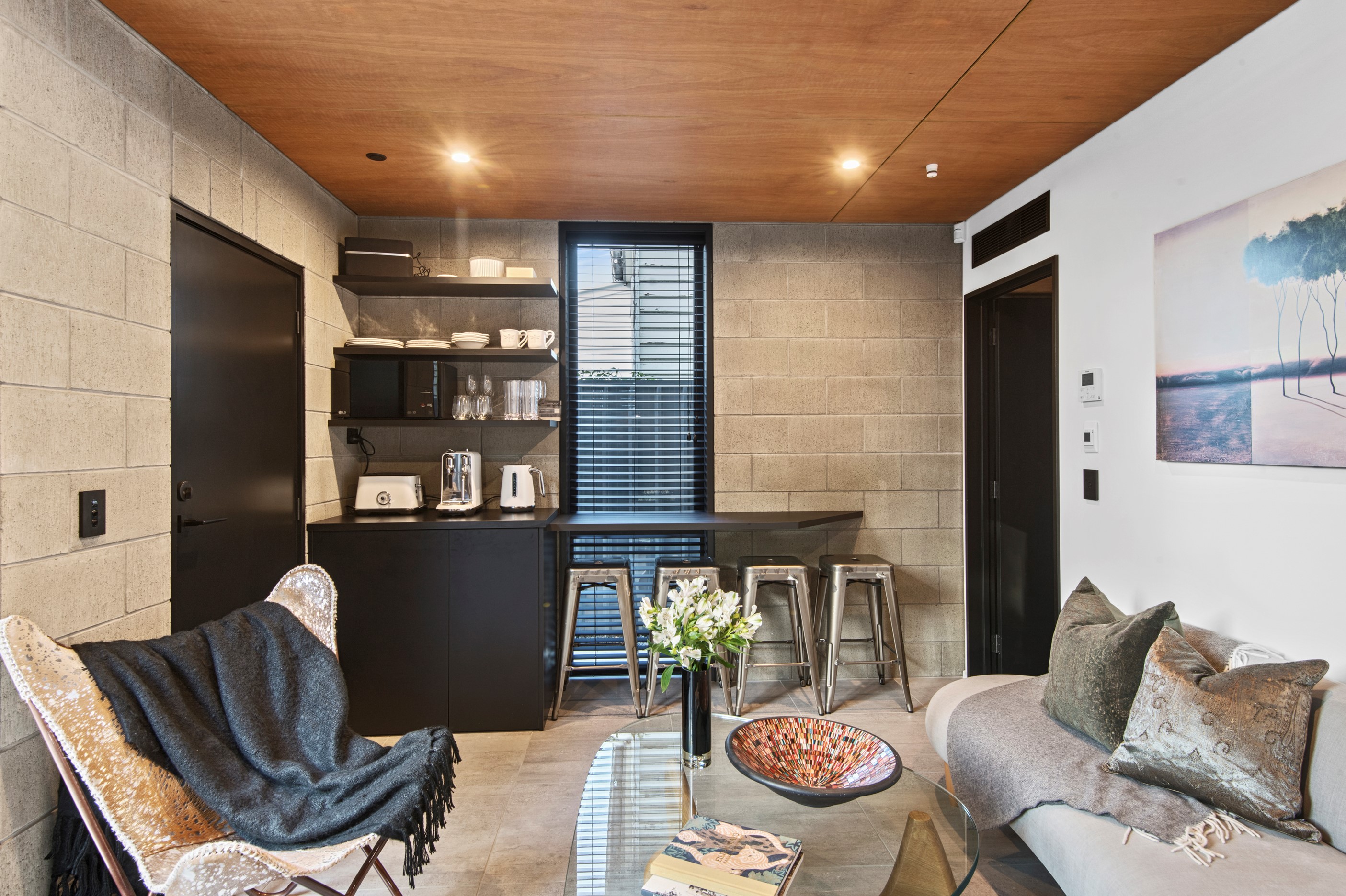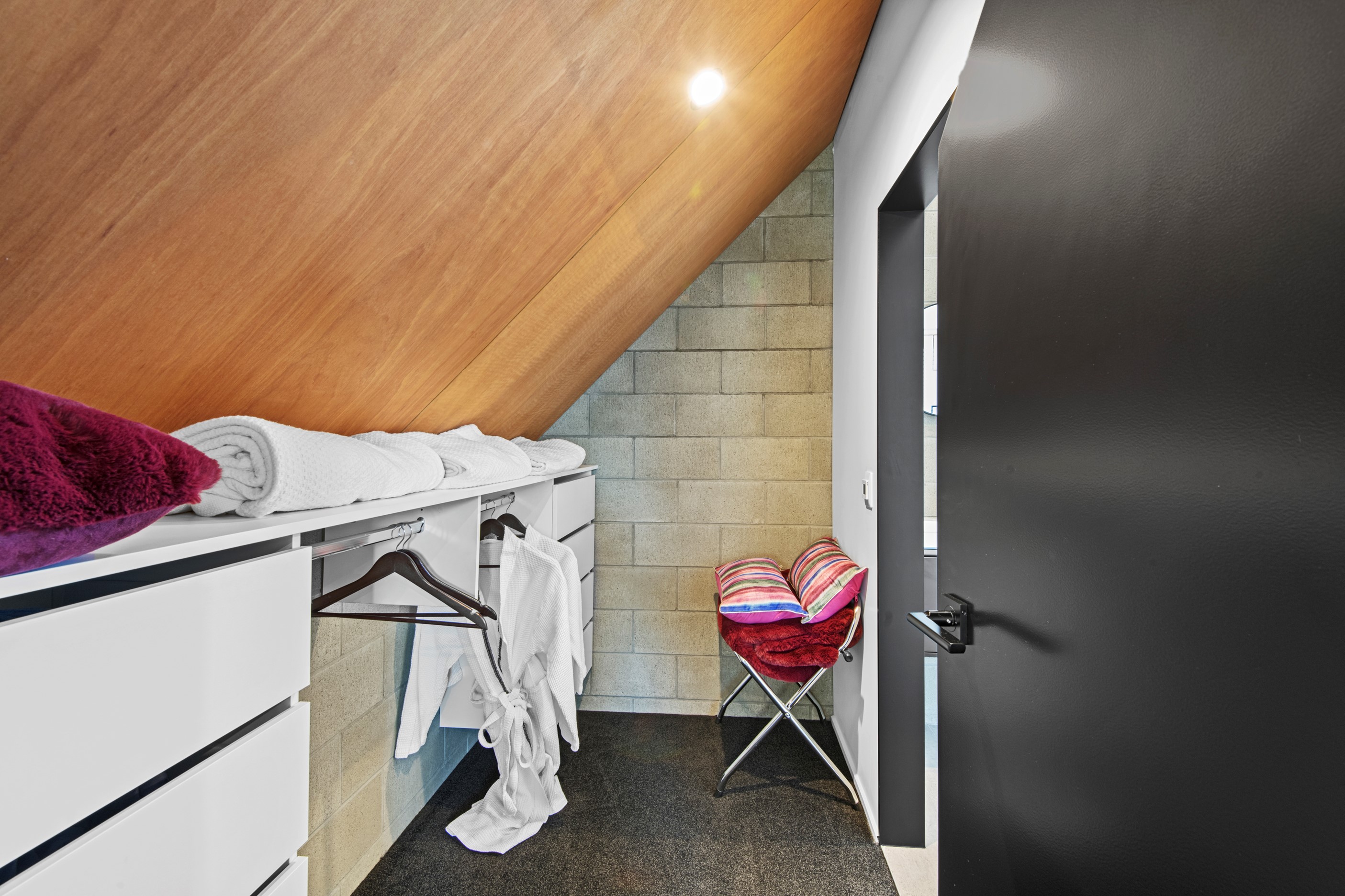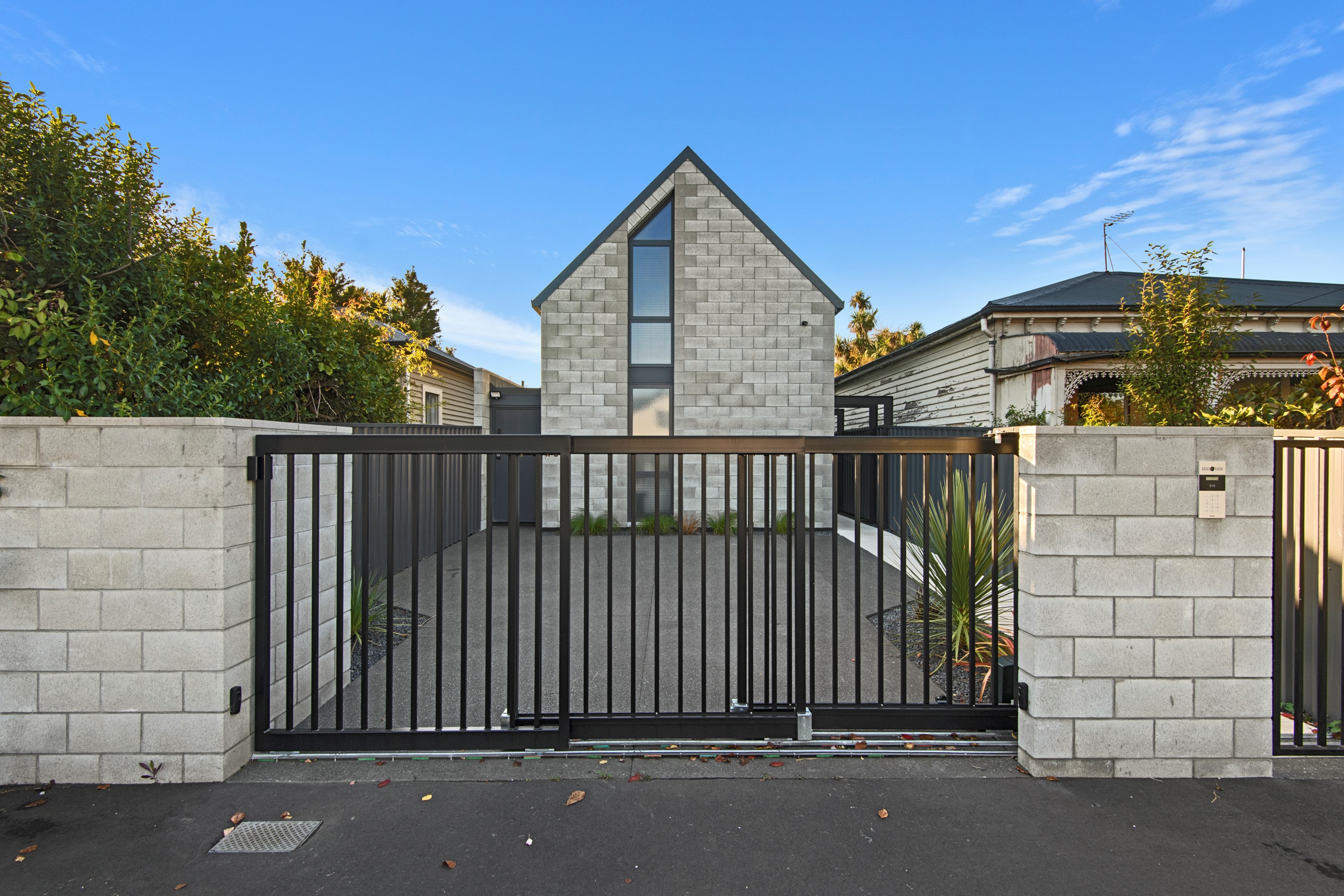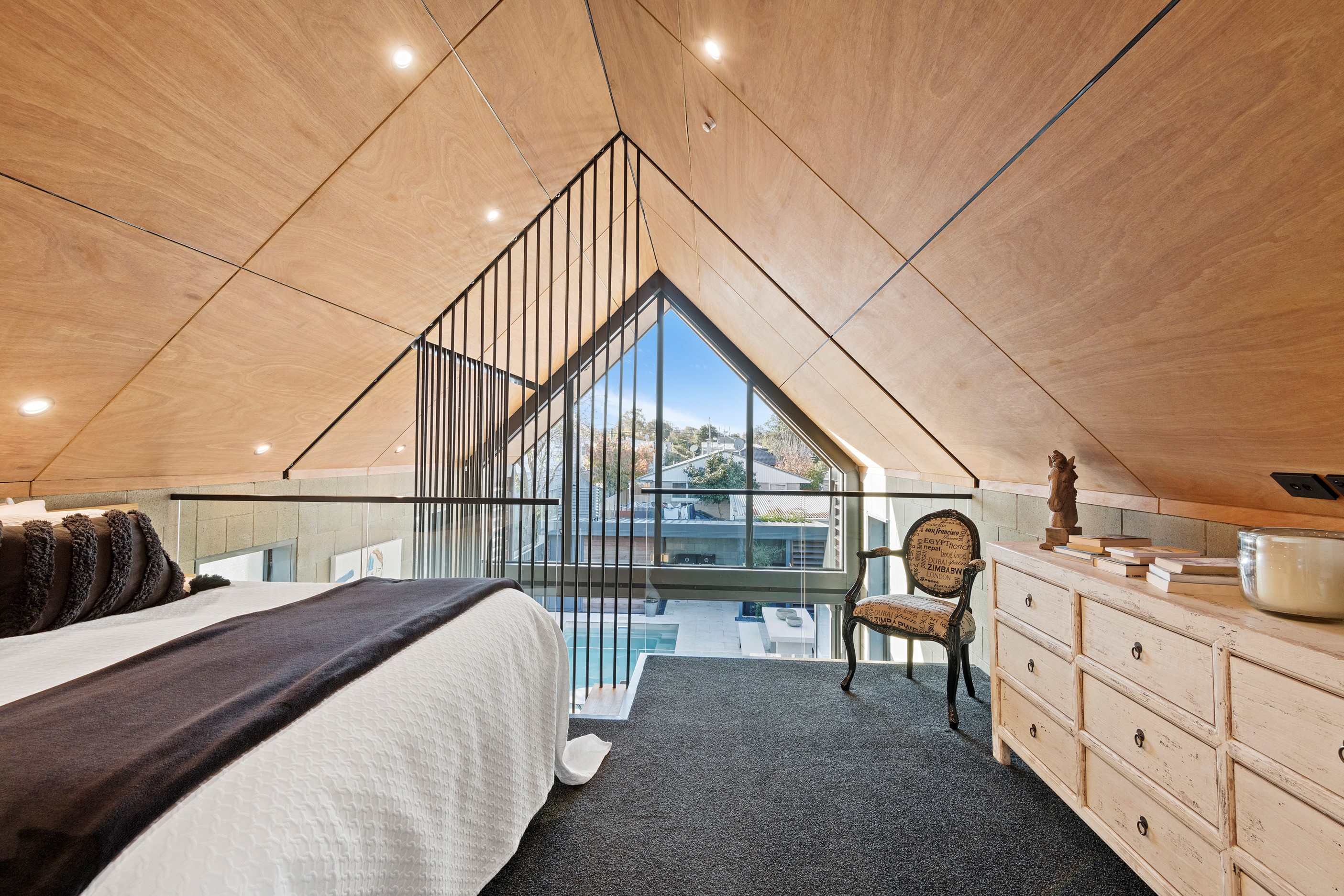 Built on a narrow site, the architectural design of this three-bedroom home is clever and the results are classy. The home is split across two fully self-contained pods connected with a secluded courtyard. Bold and beautiful concrete blockwork features throughout, setting the tone for industrial-style decor, including ply ceilings, exposed steel beams, and a fabulous floating staircase. The contemporary kitchen includes a butler’s pantry, which leaves the main preparation space sleek and unobtrusive. The open-plan living and dining space below the main-suite mezzanine extends into the spectacular outdoor living zone, which encompasses the pool and dining space. And for those chilly winter months, the spa pool and sauna are just the ticket for a soothing warm up. The uber-functional ‘south pod’ is also set over two levels, with two large bedrooms and ensuites, plus a self-contained living area. Thanks to the cleverly partitioned design, this home is ideal for extended families or Airbnb guests.
