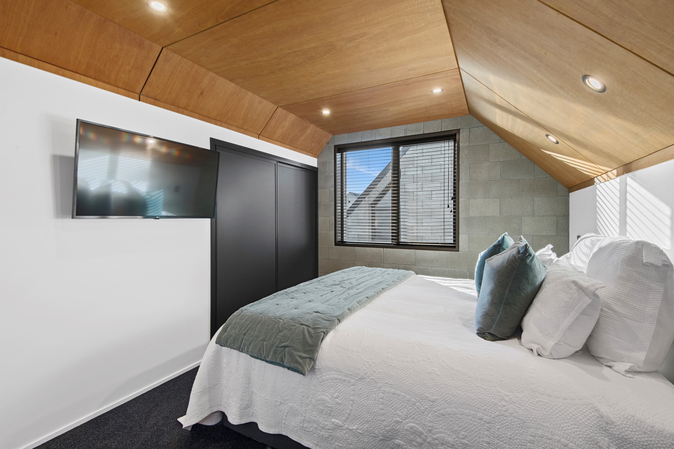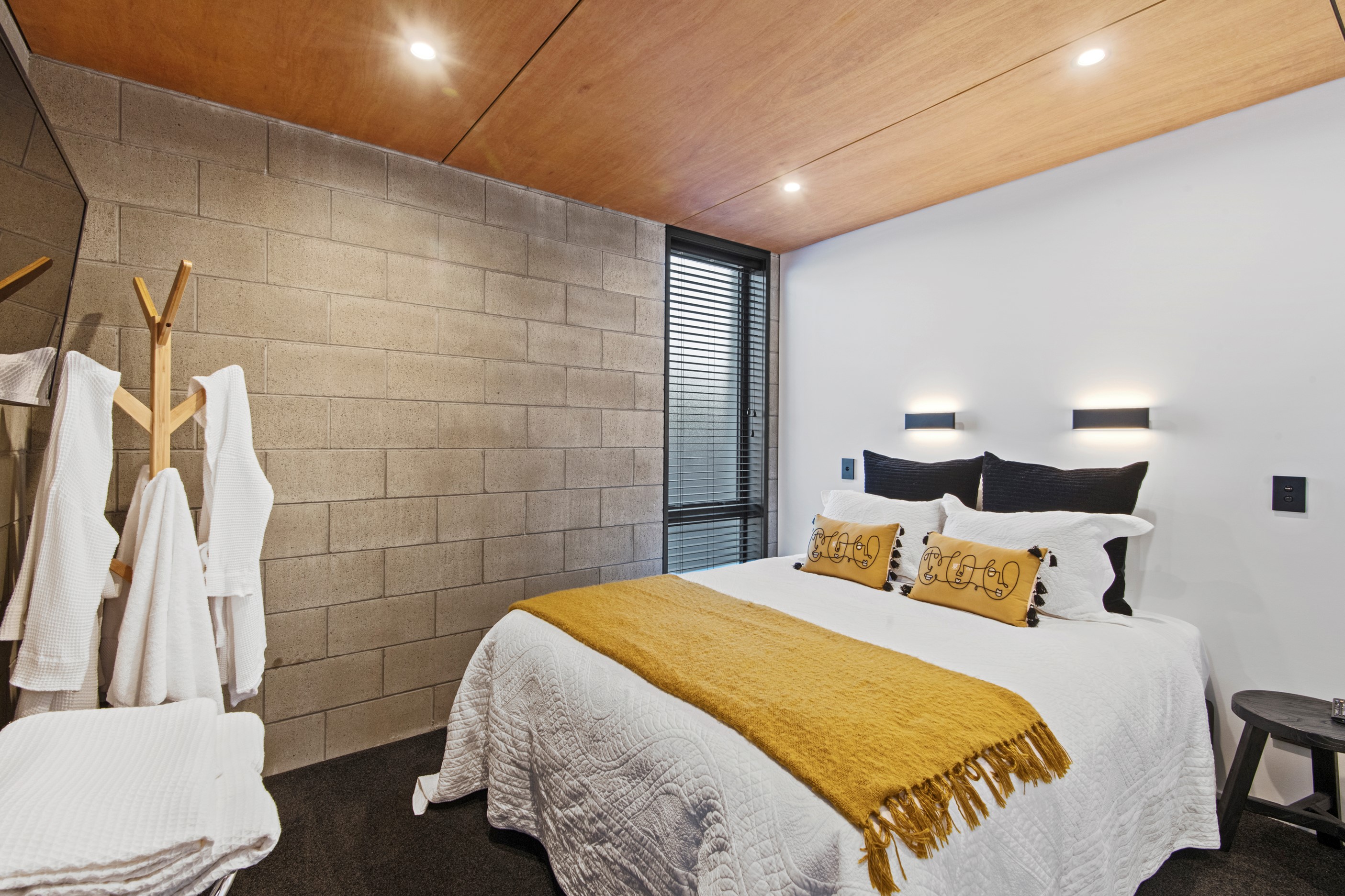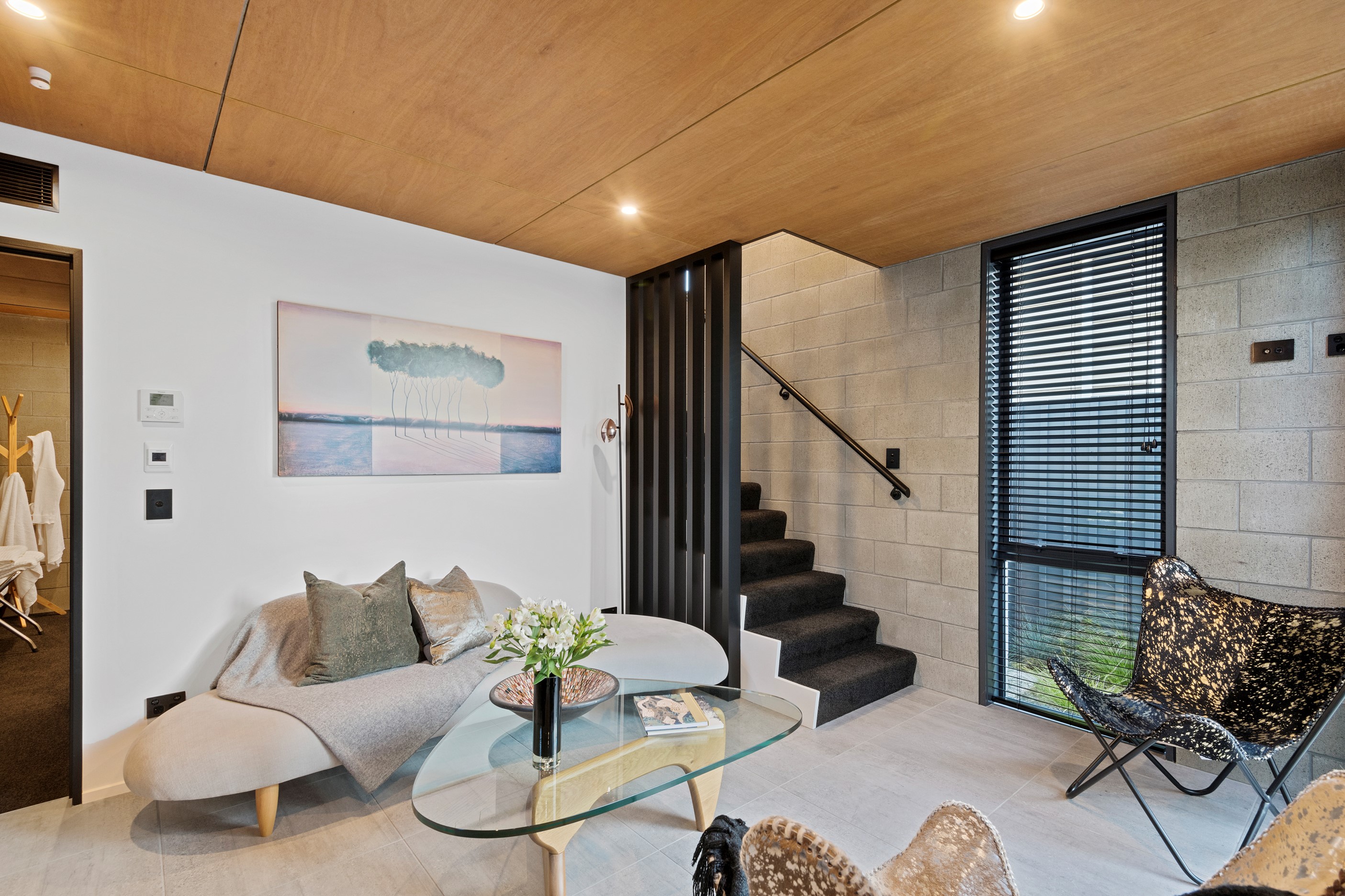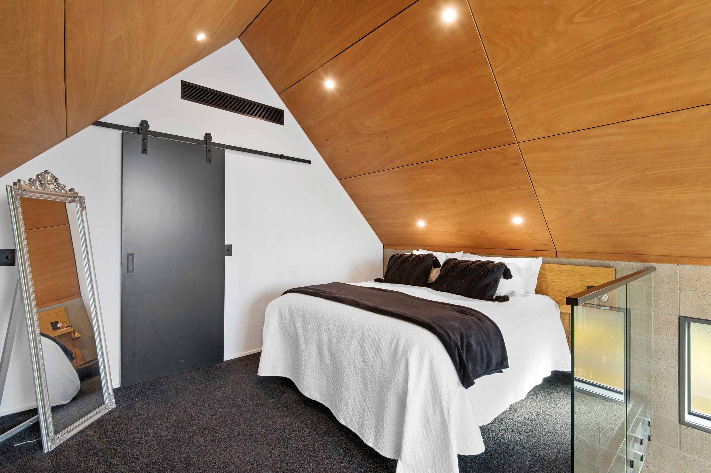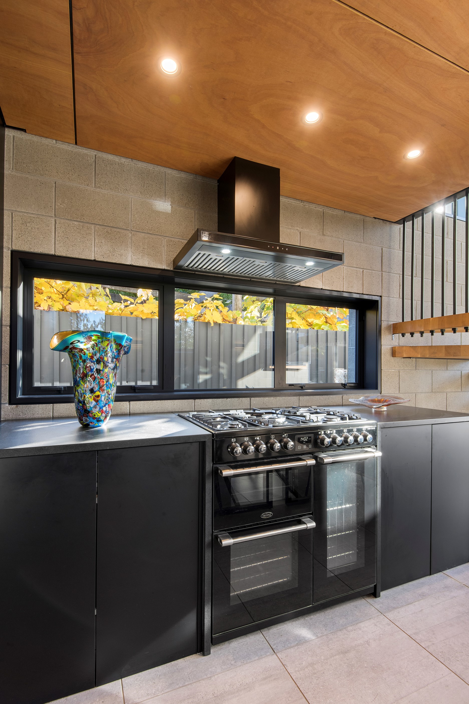 Built on a narrow site, the architectural design of this three-bedroom home is clever and the results are classy. The home is split across two fully self-contained pods connected with a secluded courtyard. Bold and beautiful concrete blockwork features throughout, setting the tone for industrial-style decor, including ply ceilings, exposed steel beams, and a fabulous floating staircase. The contemporary kitchen includes a butler’s pantry, which leaves the main preparation space sleek and unobtrusive. The open-plan living and dining space below the main-suite mezzanine extends into the spectacular outdoor living zone, which encompasses the pool and dining space. And for those chilly winter months, the spa pool and sauna are just the ticket for a soothing warm up. The uber-functional ‘south pod’ is also set over two levels, with two large bedrooms and ensuites, plus a self-contained living area. Thanks to the cleverly partitioned design, this home is ideal for extended families or Airbnb guests.