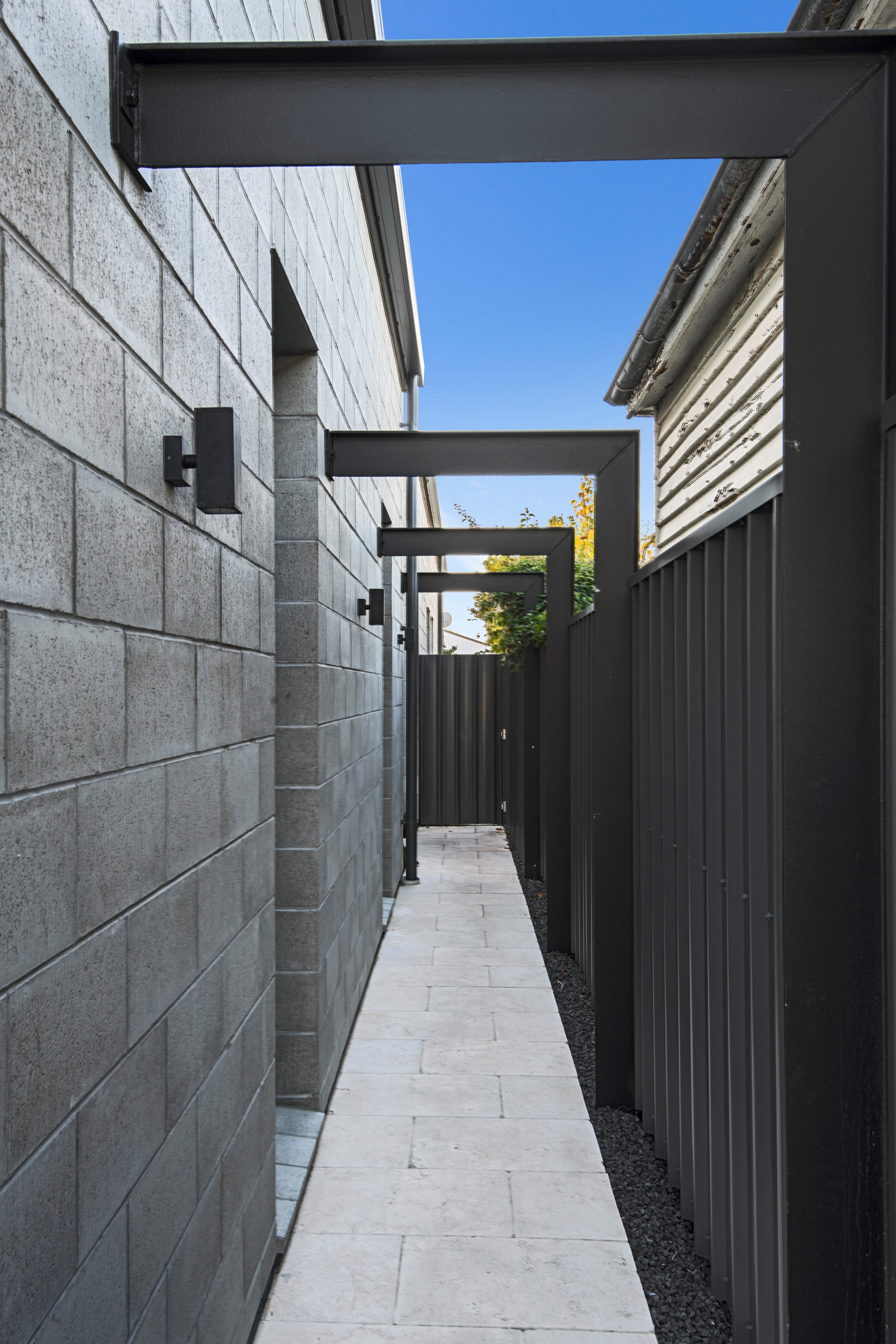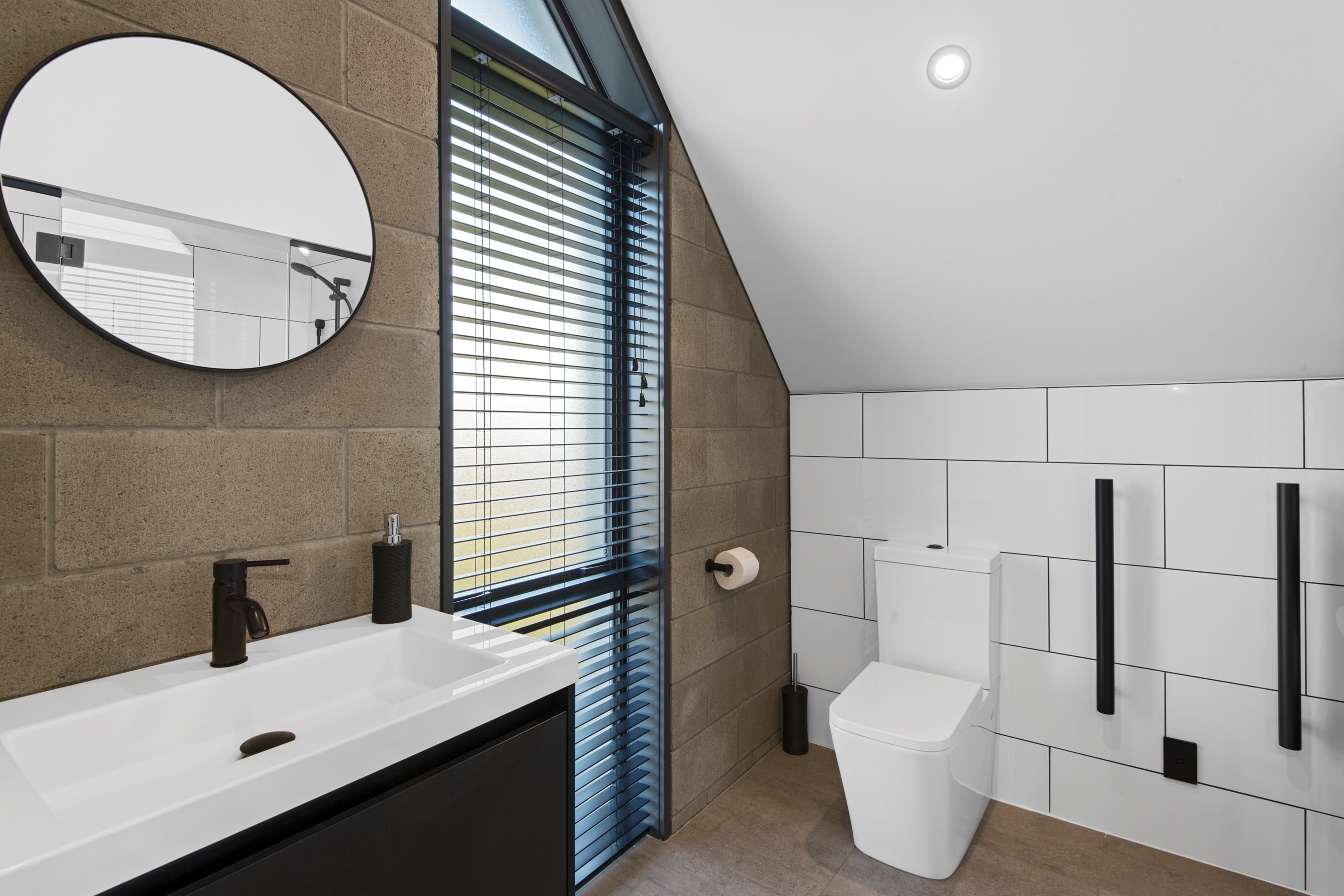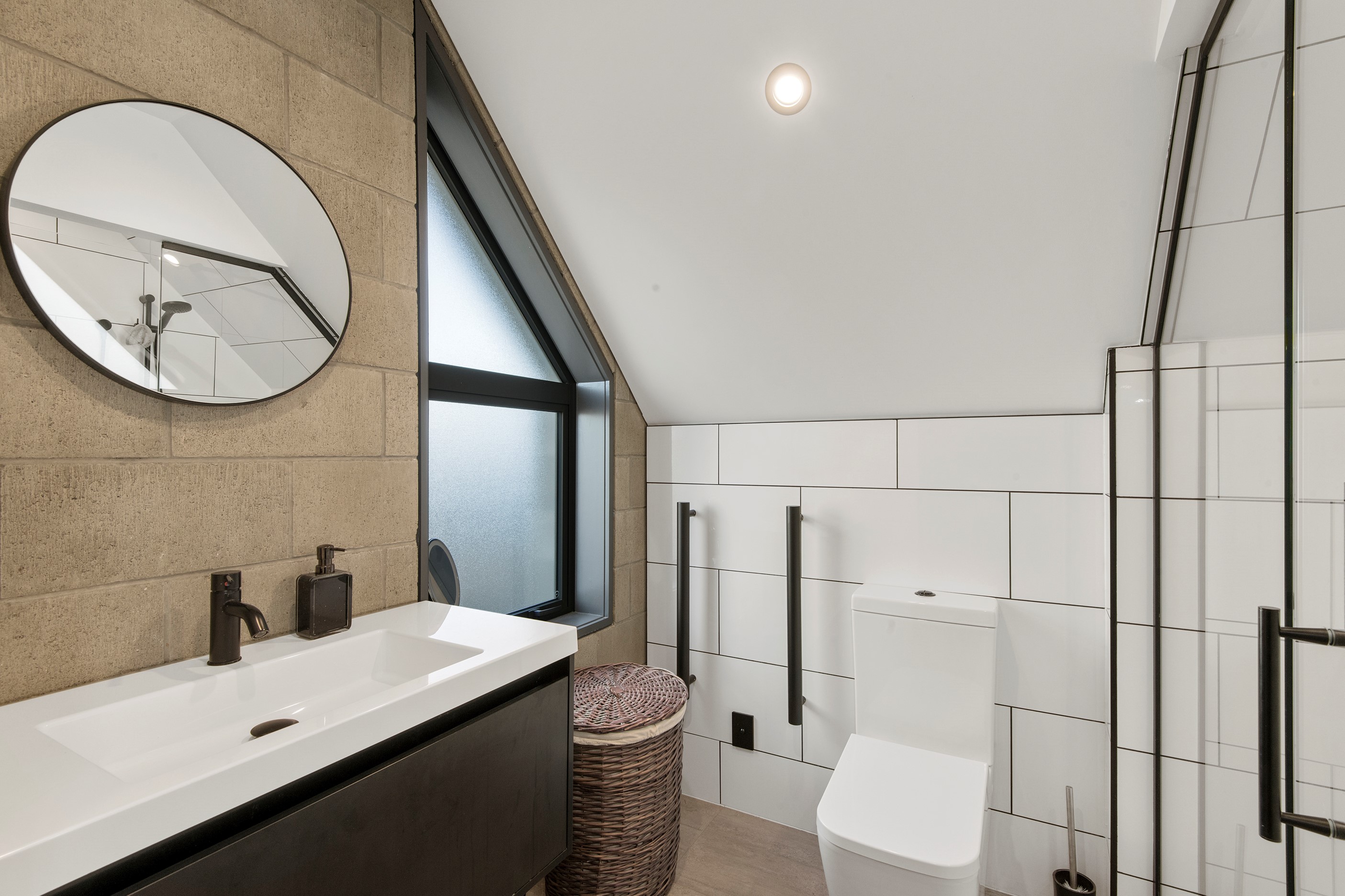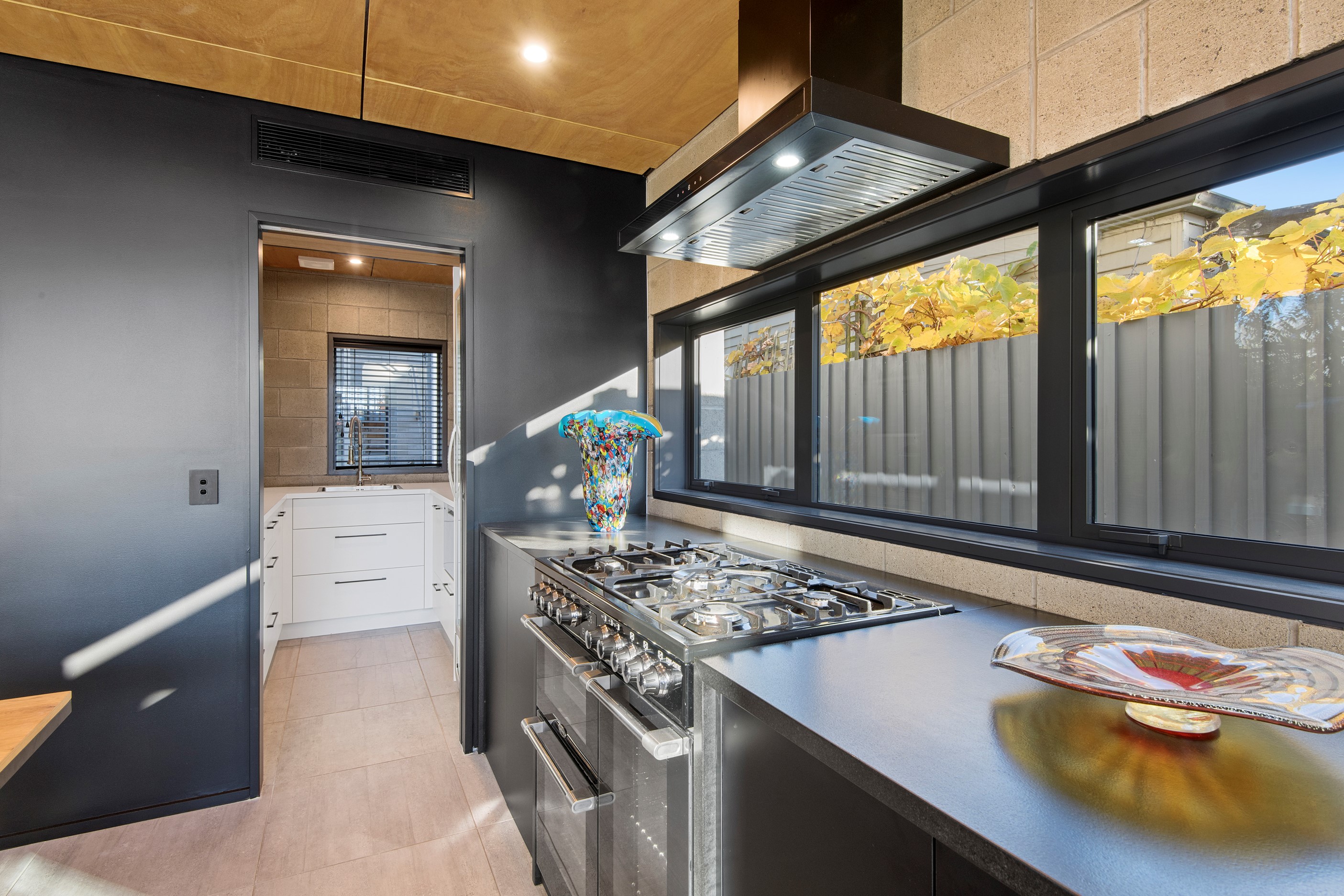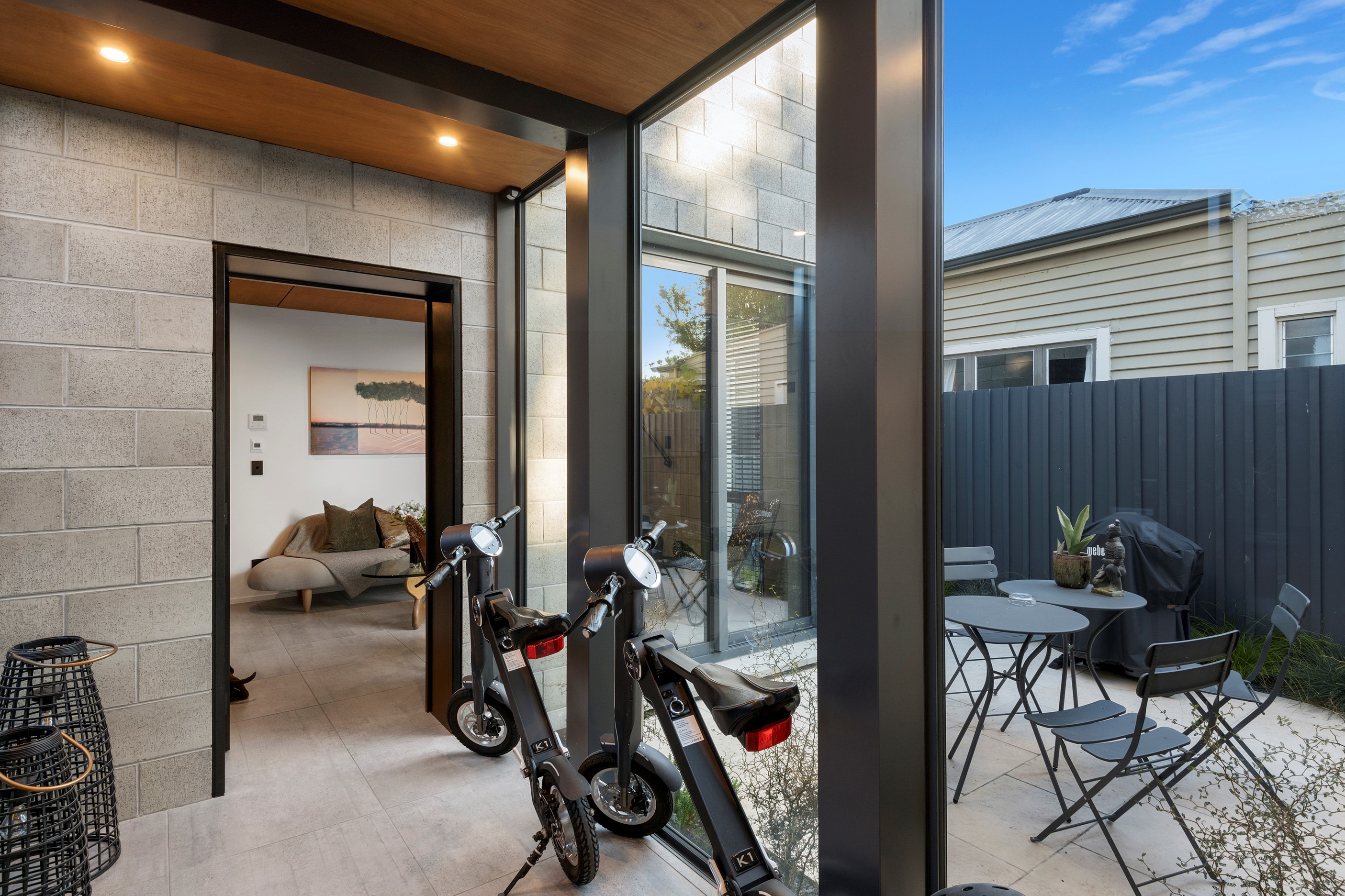 Built on a narrow site, the architectural design of this three-bedroom home is clever and the results are classy. The home is split across two fully self-contained pods connected with a secluded courtyard. Bold and beautiful concrete blockwork features throughout, setting the tone for industrial-style decor, including ply ceilings, exposed steel beams, and a fabulous floating staircase. The contemporary kitchen includes a butler’s pantry, which leaves the main preparation space sleek and unobtrusive. The open-plan living and dining space below the main-suite mezzanine extends into the spectacular outdoor living zone, which encompasses the pool and dining space. And for those chilly winter months, the spa pool and sauna are just the ticket for a soothing warm up. The uber-functional ‘south pod’ is also set over two levels, with two large bedrooms and ensuites, plus a self-contained living area. Thanks to the cleverly partitioned design, this home is ideal for extended families or Airbnb guests.
