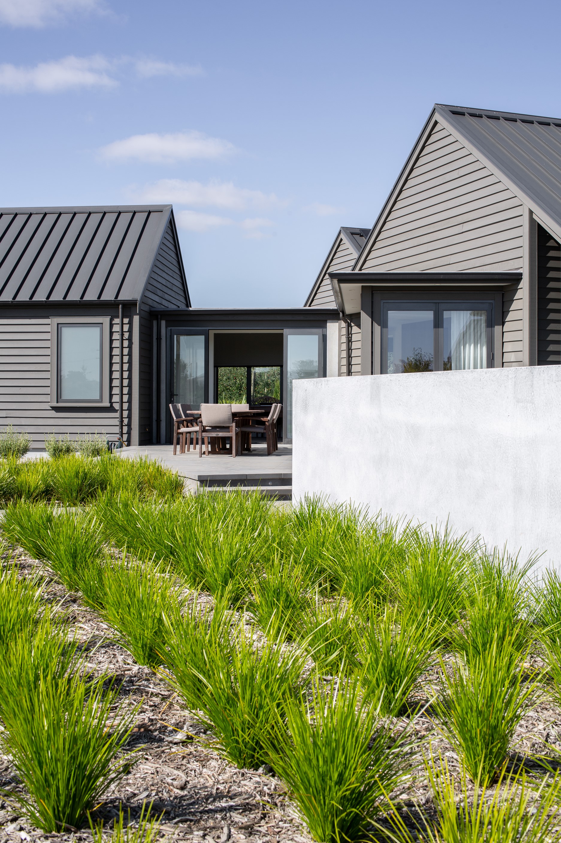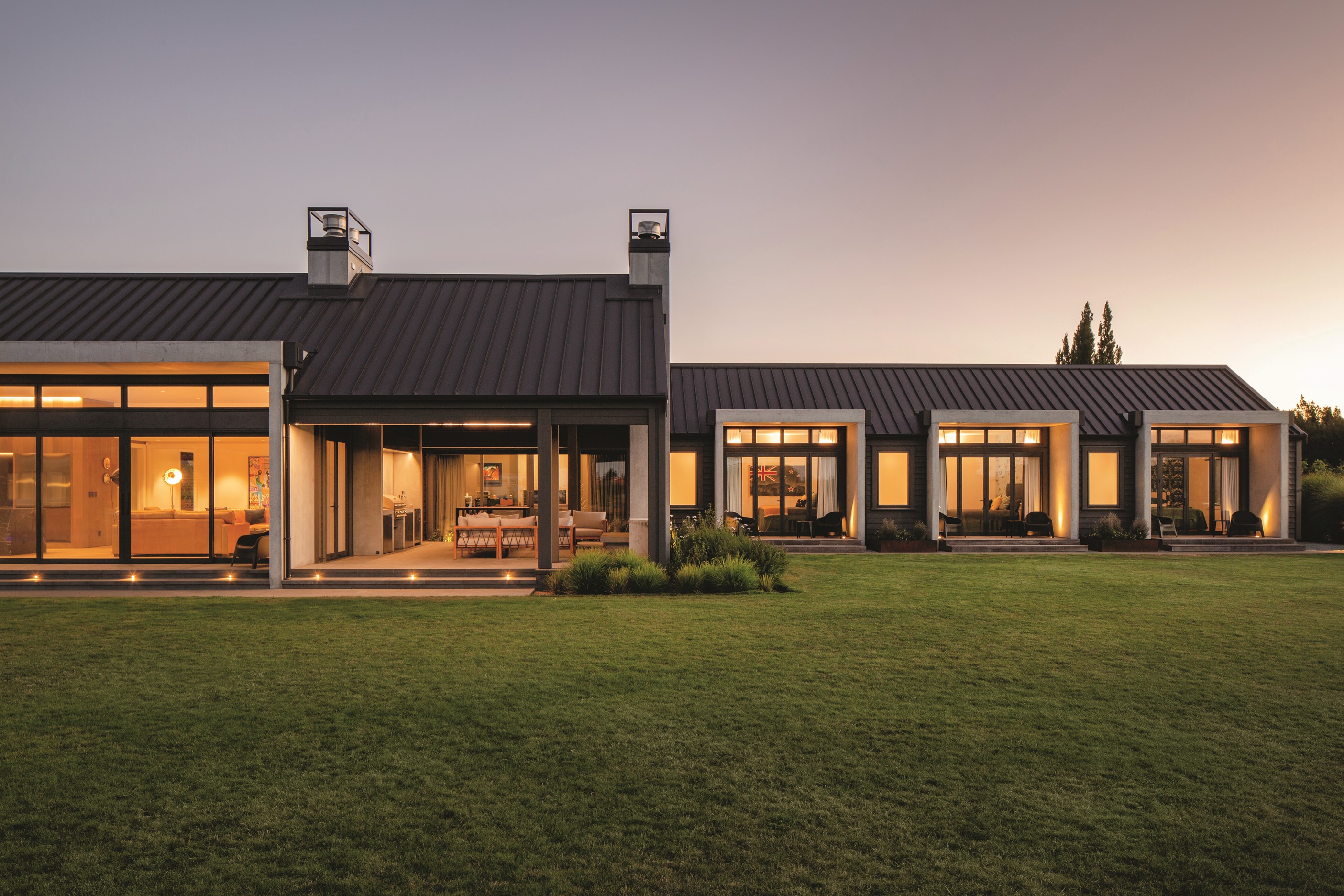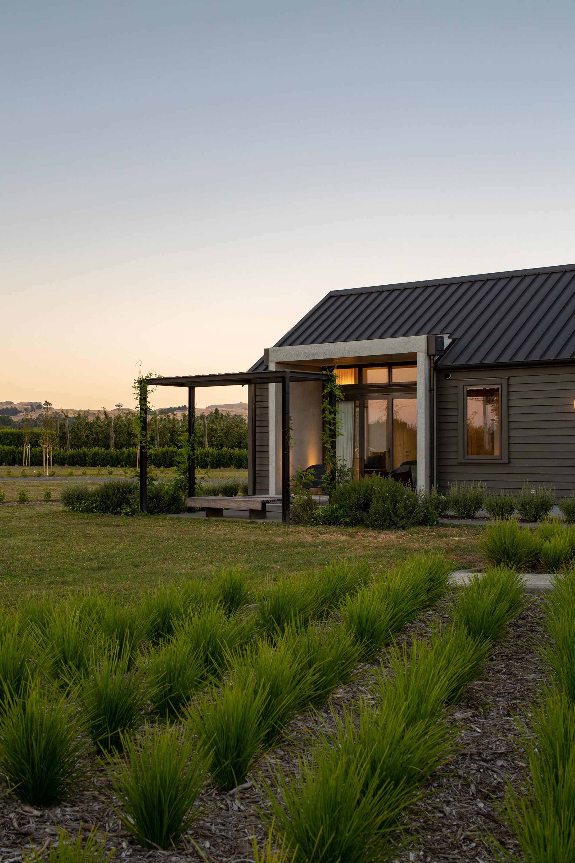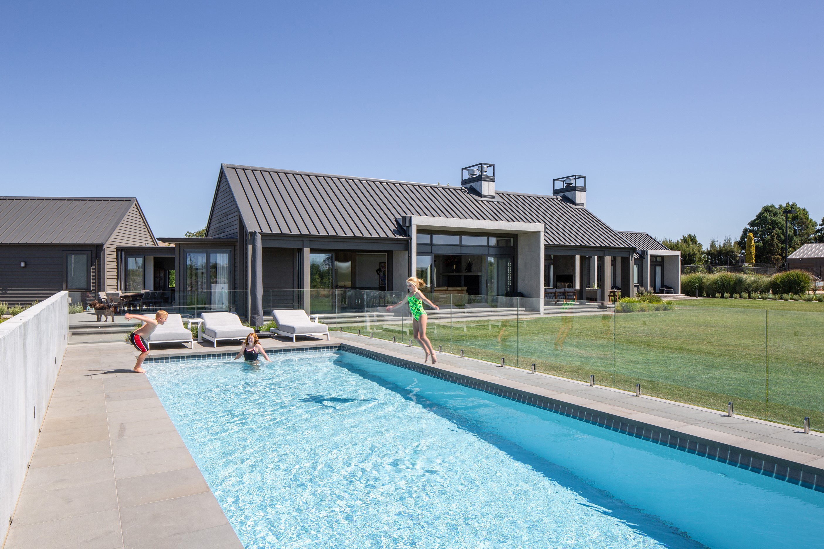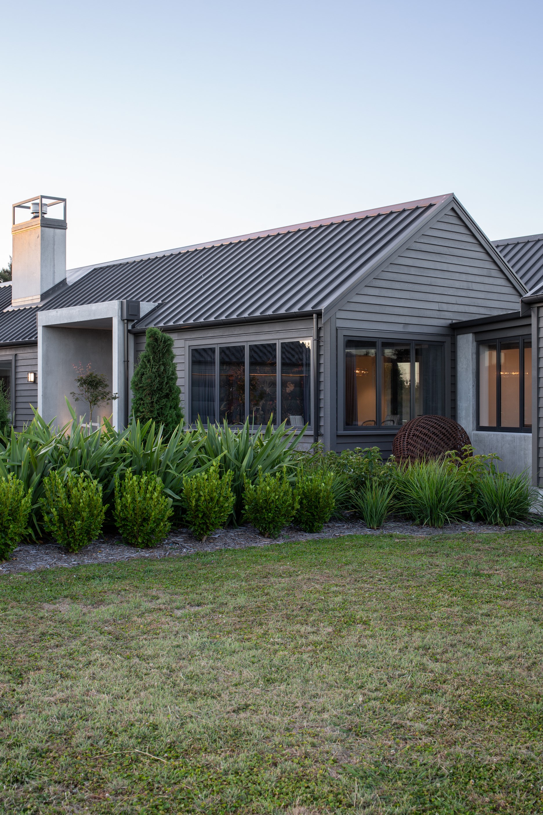 The builders thoroughly enjoyed working on this luxurious architecturally designed home, which is set among orchards on the edge of Havelock North. Within its floorplan are four large bedrooms, each with ensuite and walk-in wardrobe; two spacious living areas; and a formal dining area. The cedar-clad residence was designed to function either as a 550sqm family home, or a 250sqm home for two, with a guest wing. Precast concrete chimneys and portals over doorways are elegant, while the high-seamed roof profile adds a touch of class. High gables with no soffits as well as boxed corners and facings around the windows, required significant exterior trim, which has been achieved to the highest level. Three log burners keep the whole home cosy in winter, while solar panels on the roof help generate energy. The interior features natural materials, which are carried through to the outdoor entertaining area. Designer lighting, high-end fittings and well-placed windows top off this beautiful, bespoke home.