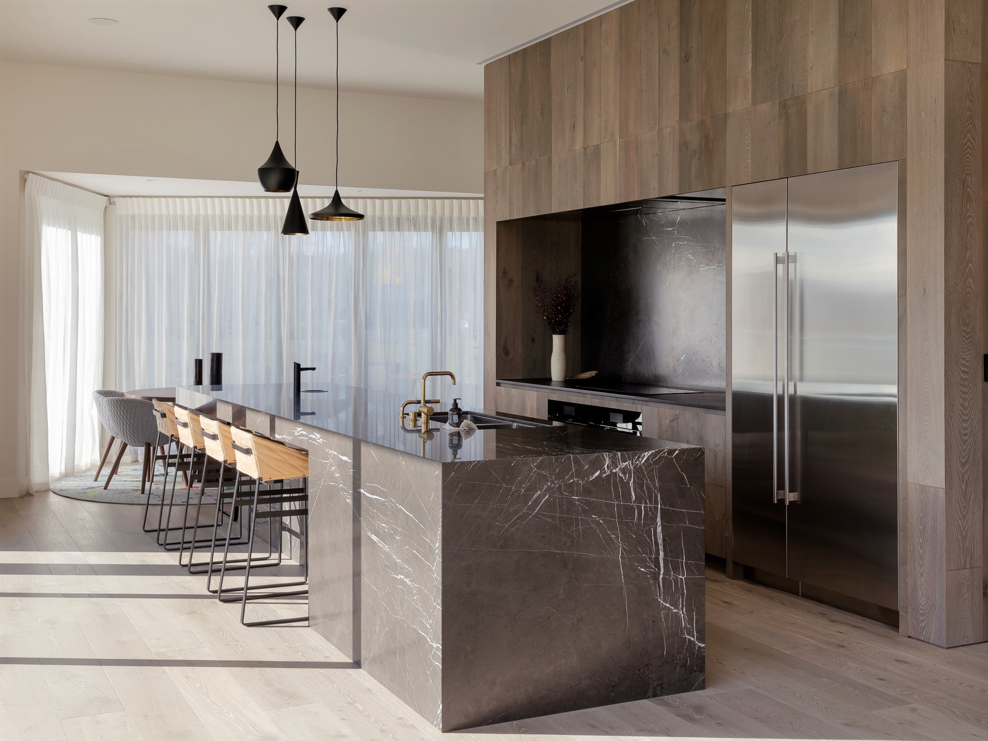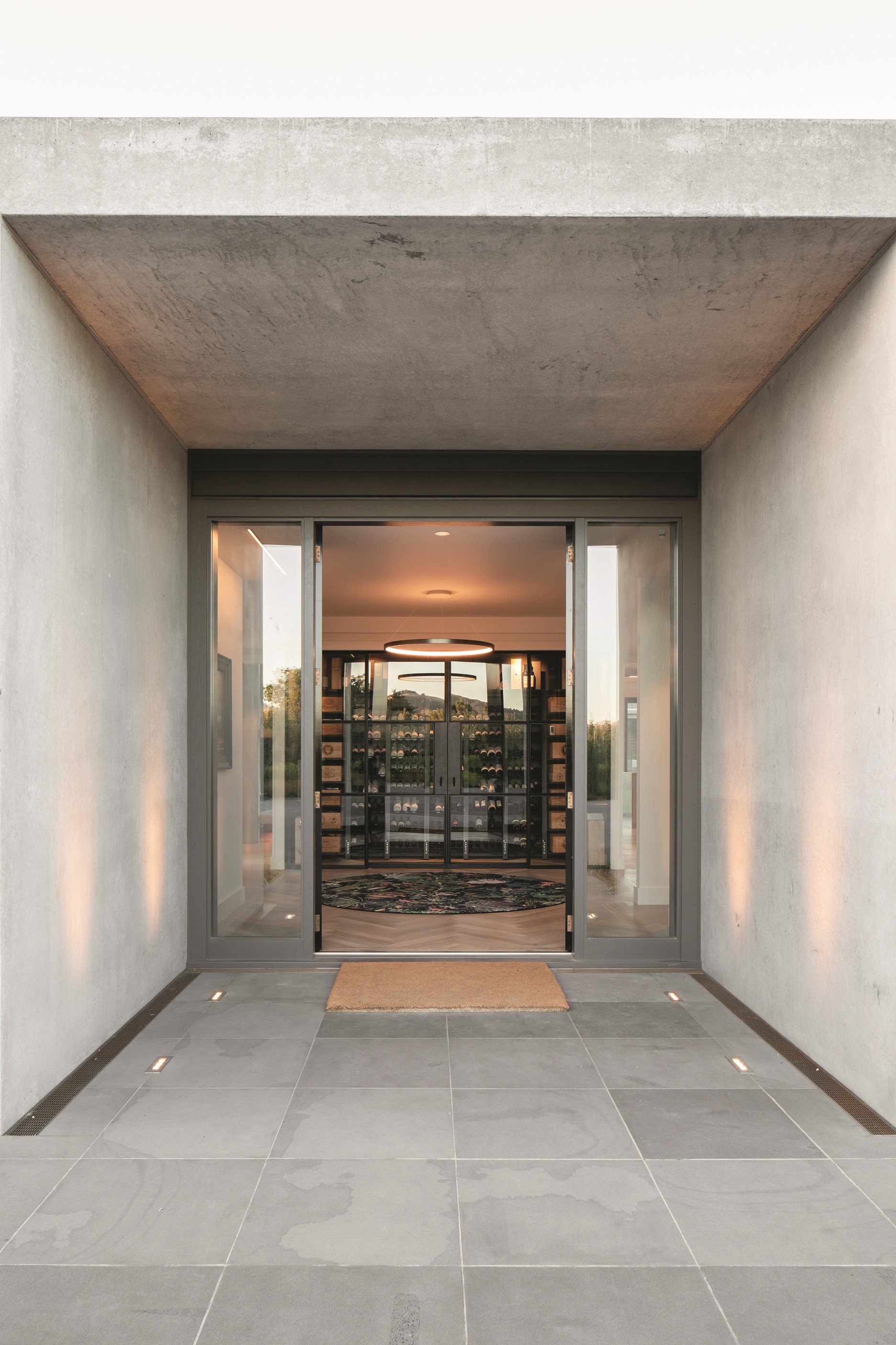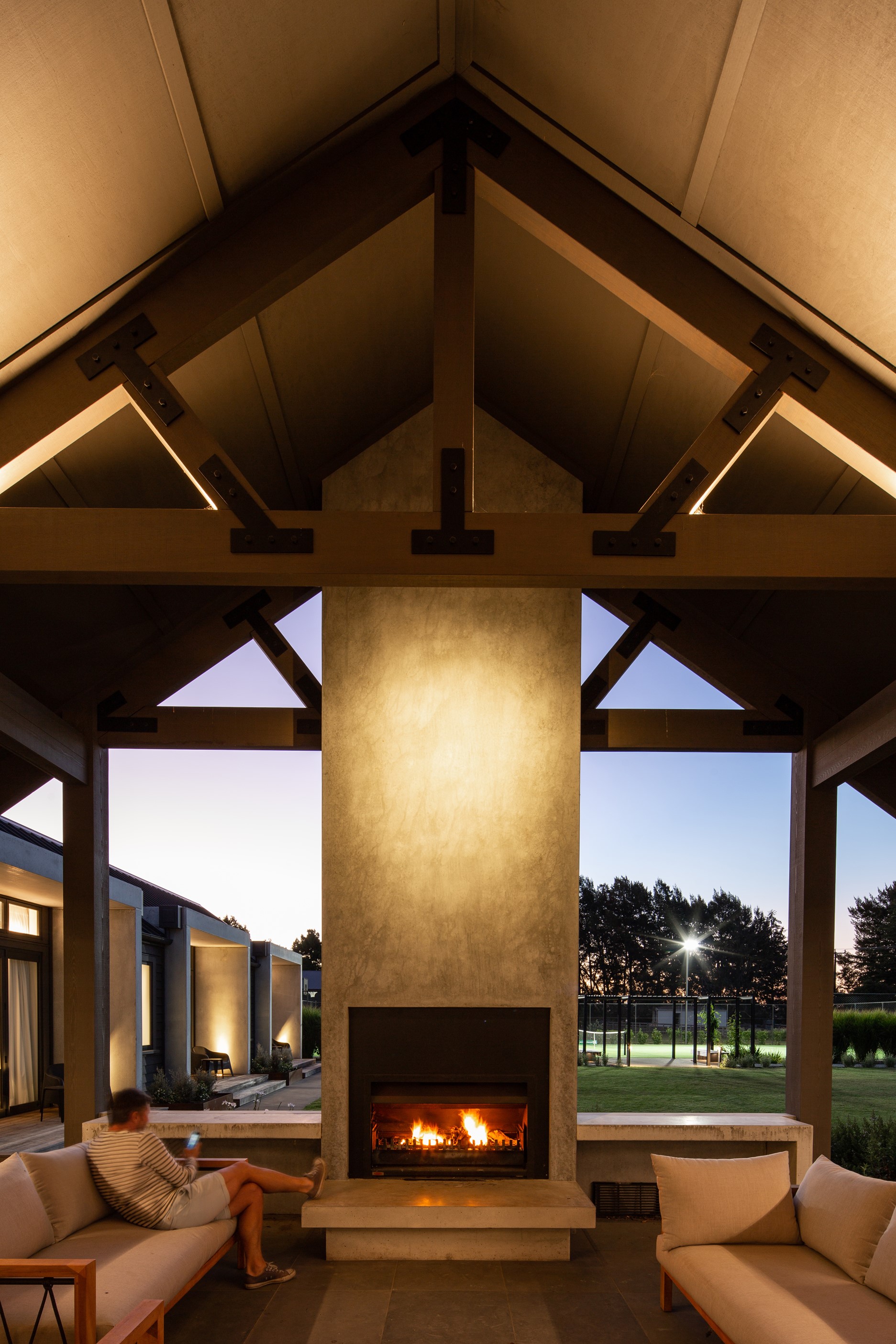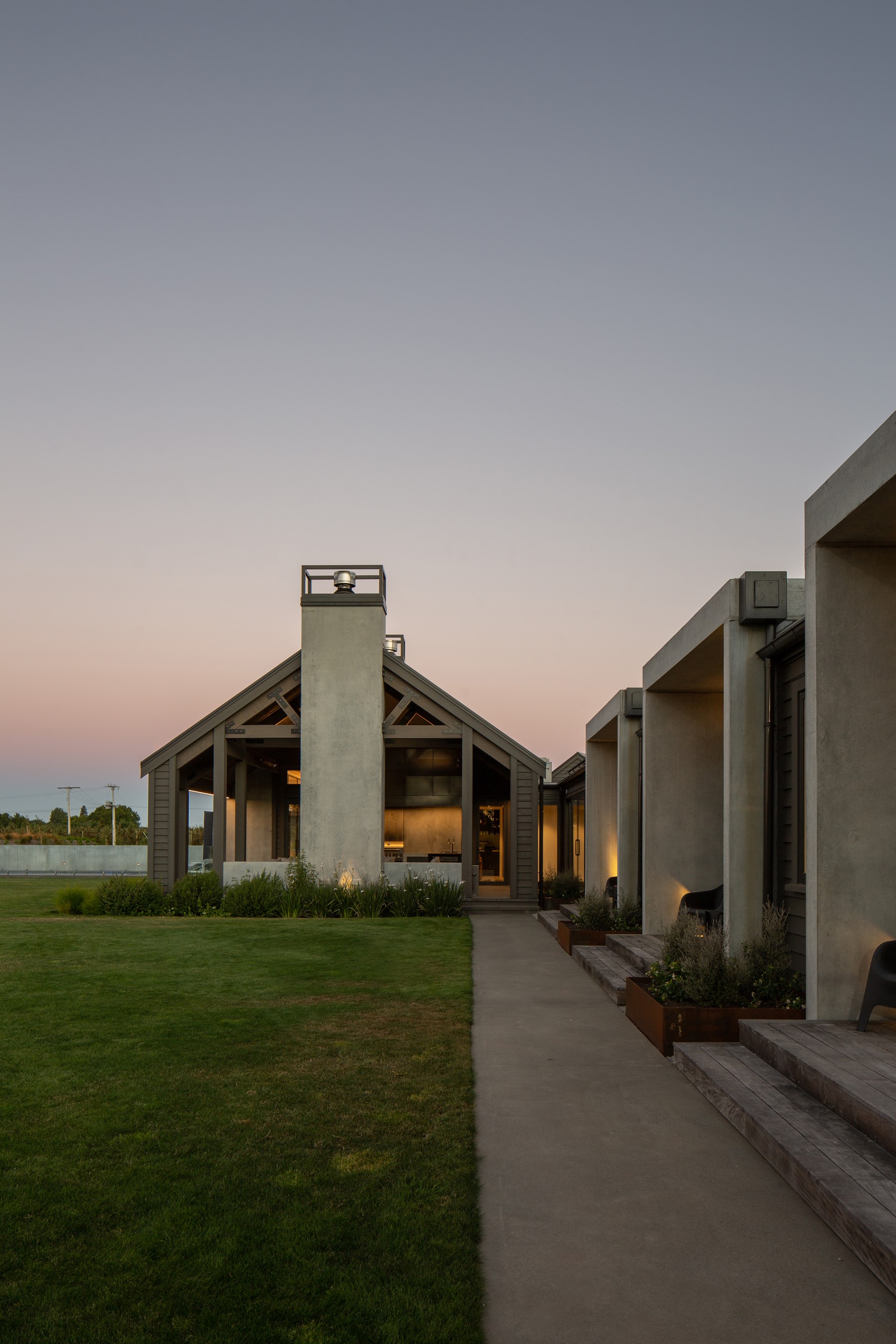 The builders thoroughly enjoyed working on this luxurious architecturally designed home, which is set among orchards on the edge of Havelock North. Within its floorplan are four large bedrooms, each with ensuite and walk-in wardrobe; two spacious living areas; and a formal dining area. The cedar-clad residence was designed to function either as a 550sqm family home, or a 250sqm home for two, with a guest wing. Precast concrete chimneys and portals over doorways are elegant, while the high-seamed roof profile adds a touch of class. High gables with no soffits as well as boxed corners and facings around the windows, required significant exterior trim, which has been achieved to the highest level. Three log burners keep the whole home cosy in winter, while solar panels on the roof help generate energy. The interior features natural materials, which are carried through to the outdoor entertaining area. Designer lighting, high-end fittings and well-placed windows top off this beautiful, bespoke home.