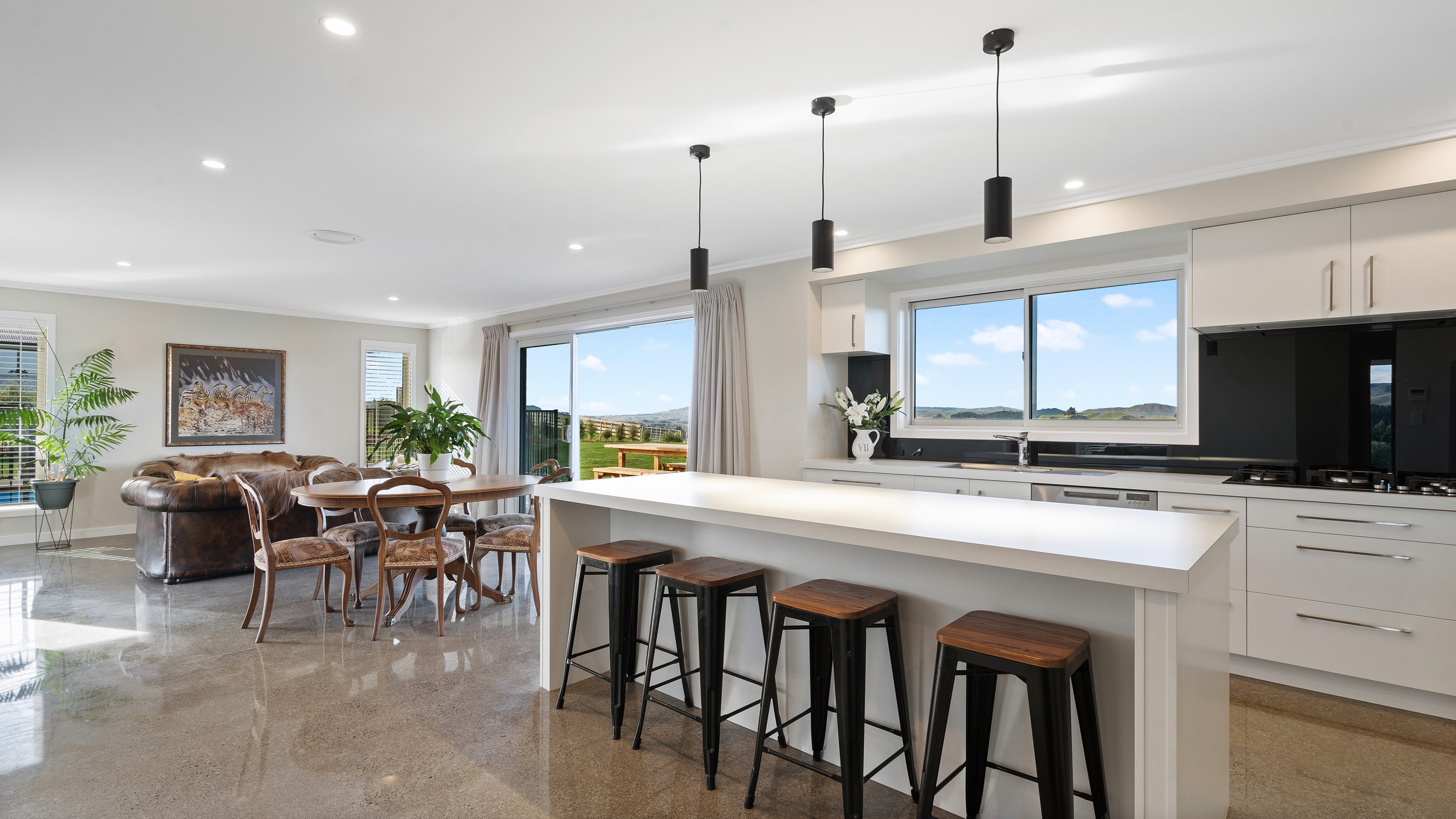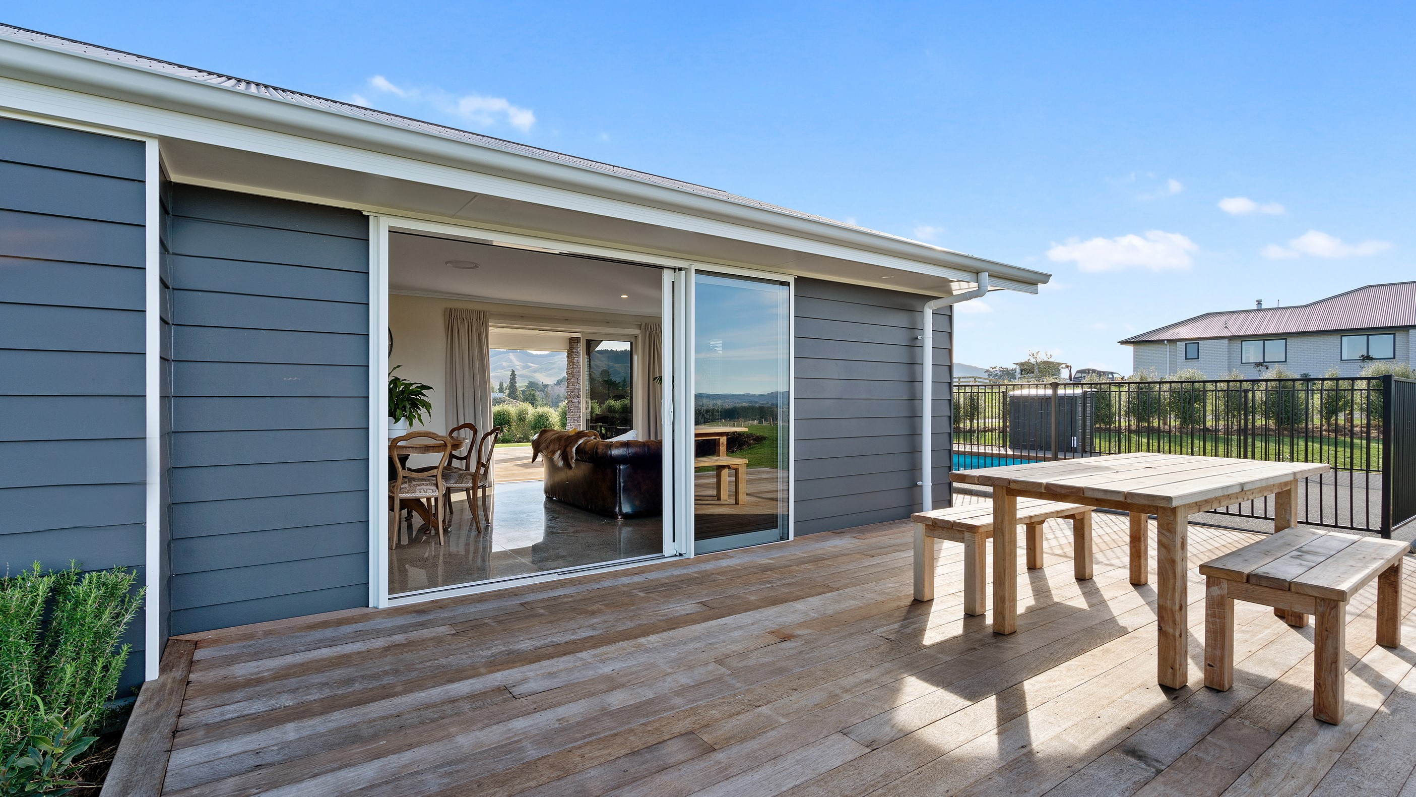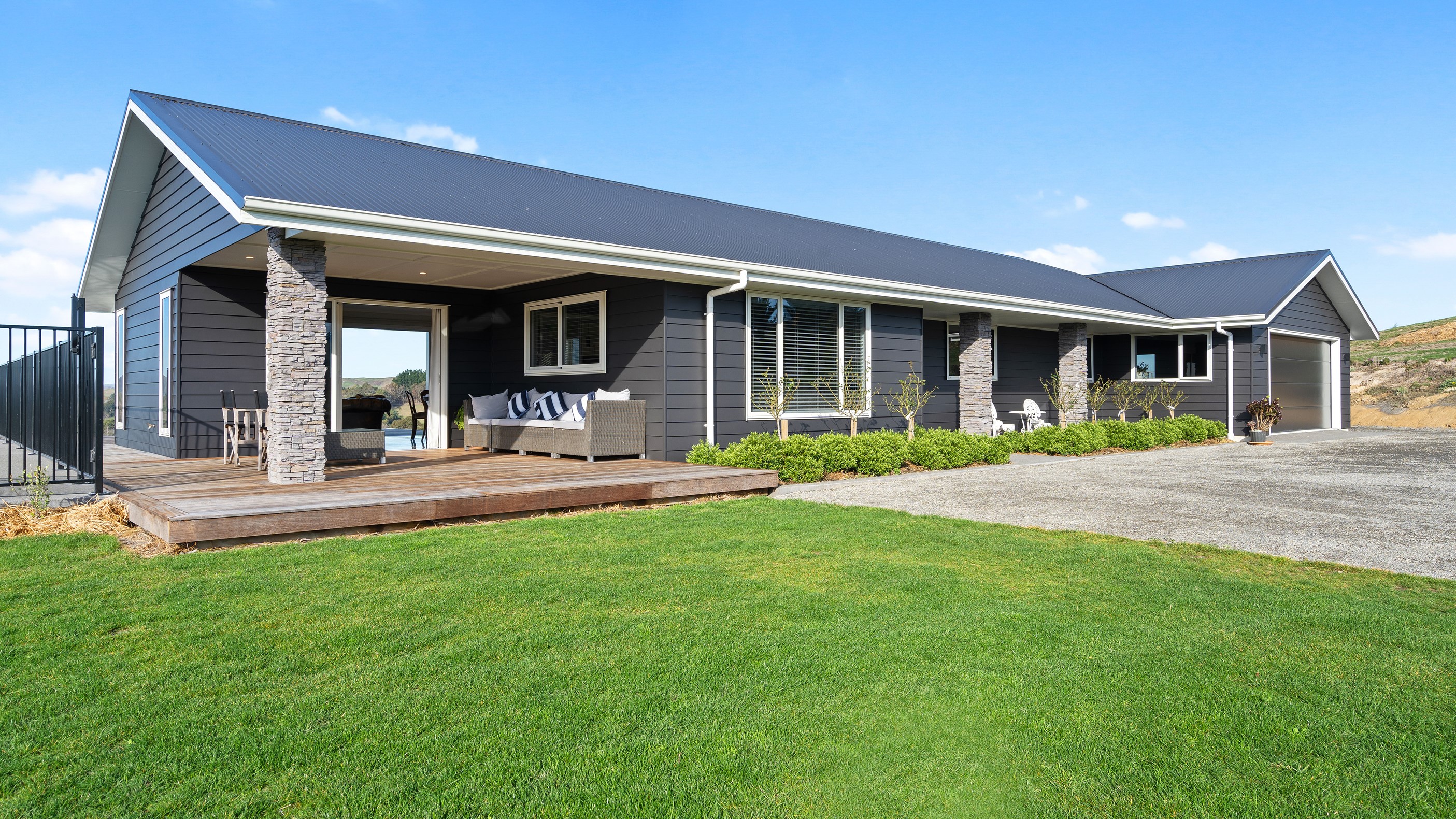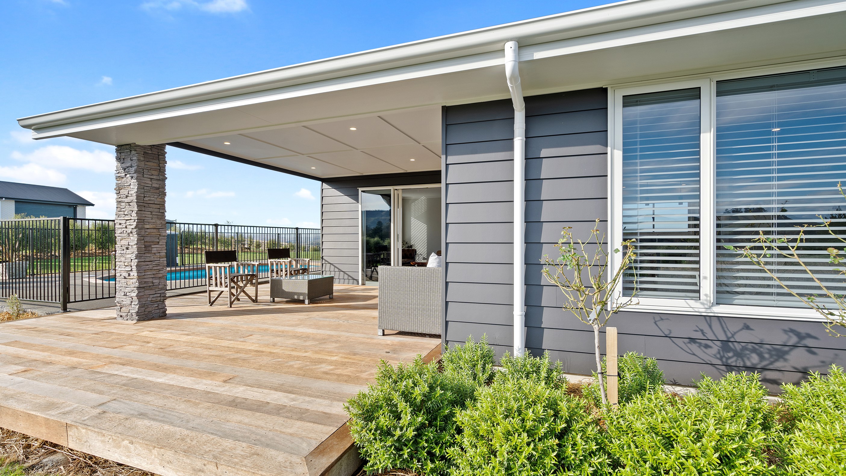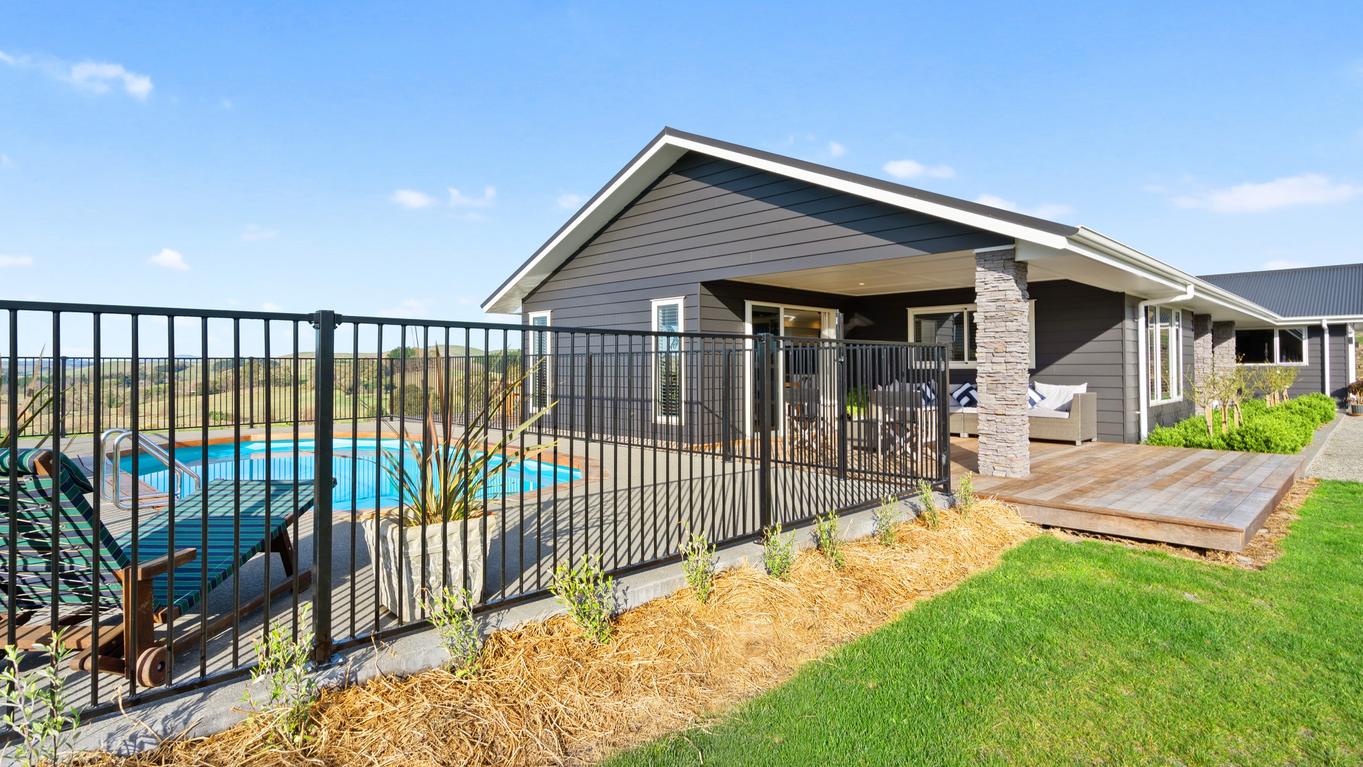 Perched on an elevated site overlooking the scenic hills and valleys of Central Hawke’s Bay, this four-bedroom home is all about location, views and relaxed family living. Constructed from quality, low-maintenance materials with schist pillars and exposed aggregate concrete footpaths, the 210sqm home fits like a glove within the landscape. The positioning was carefully considered to make the most of its idyllic location, with service areas to the south and living to the north. Practical, easy-care polished concrete flooring in the open-plan dining space and kitchen traps warmth from sunlight flooding in through the glazing. With the addition of ducted heating and cooling systems, the home stays comfortably temperate all year round. A separate media room can be closed off with cavity sliders to create a quiet, private space for getting stuck into a good movie or book. The carpeted and fully insulated garage has been set up with a pool table and table tennis for family games nights. In summer, the hot Hawke’s Bay days provide a welcome excuse to spend the afternoon in the swimming pool.