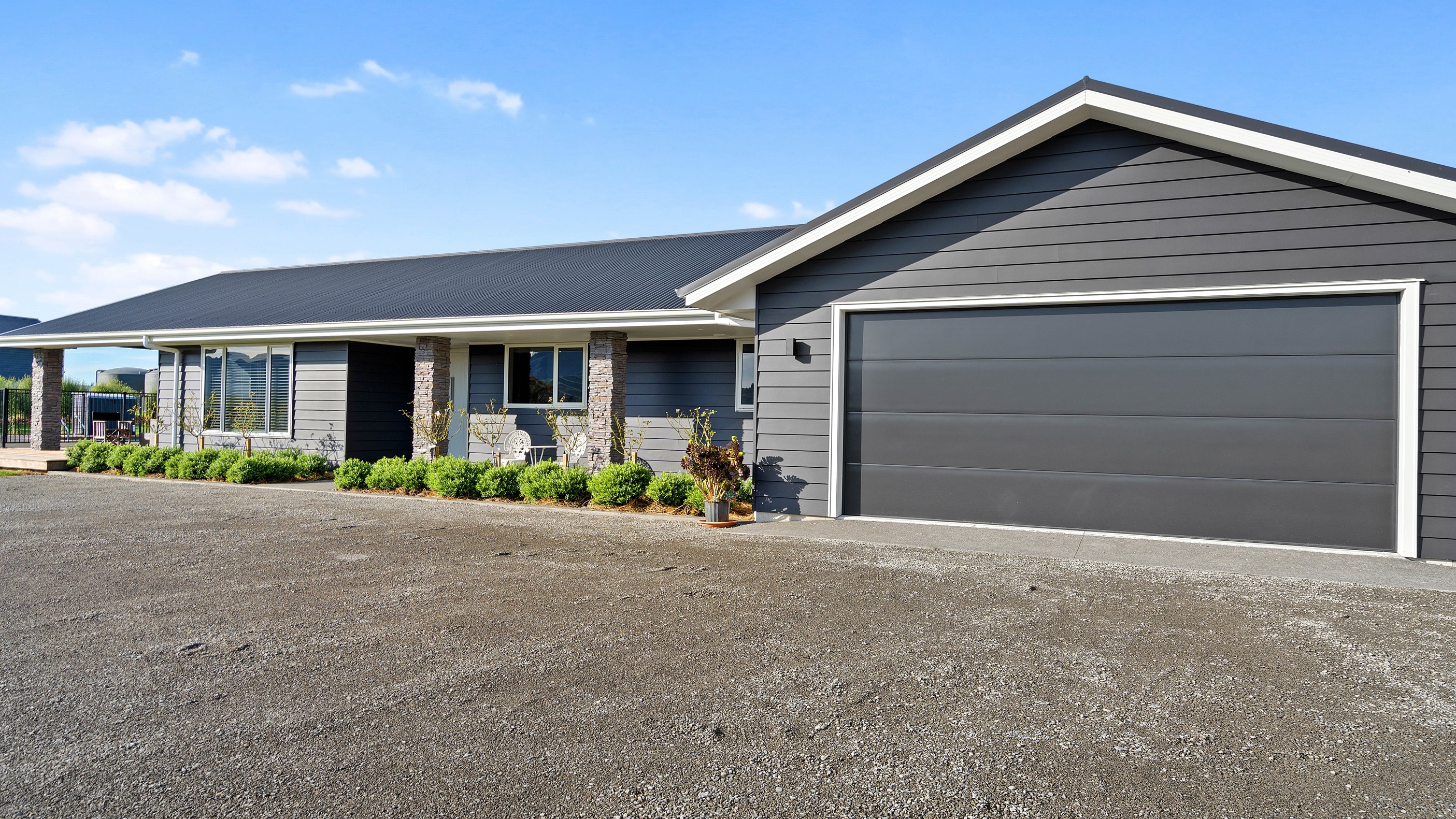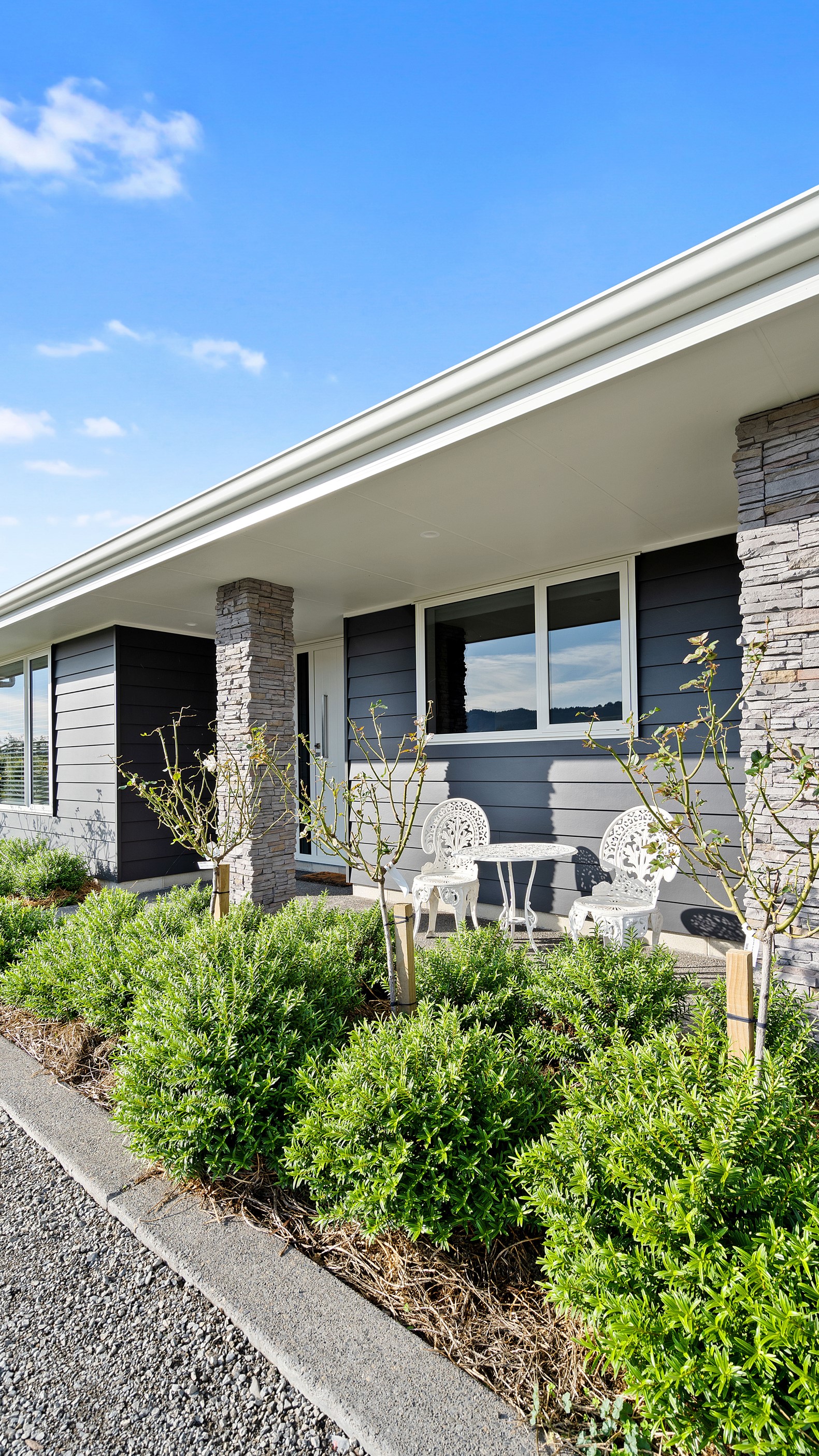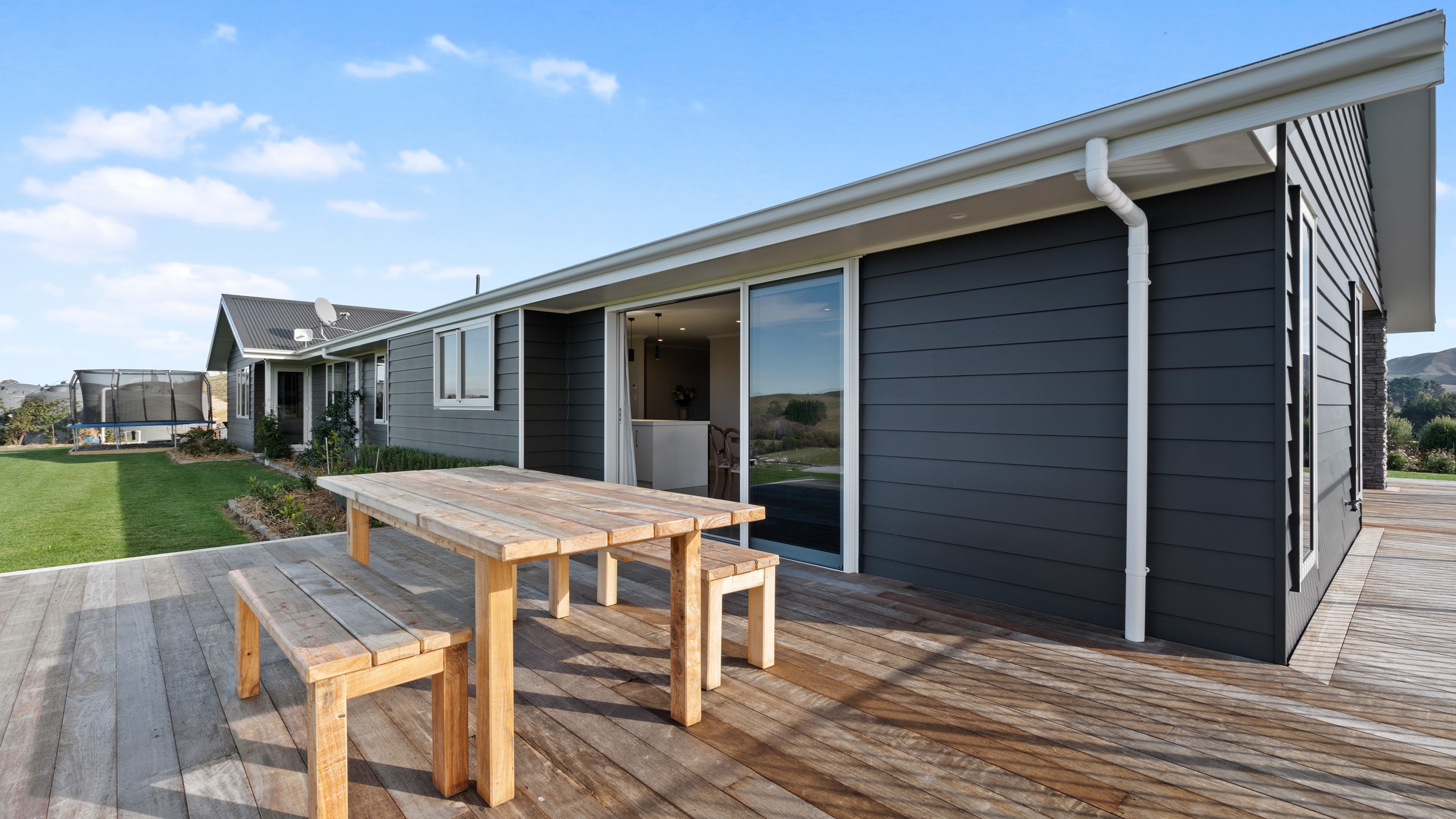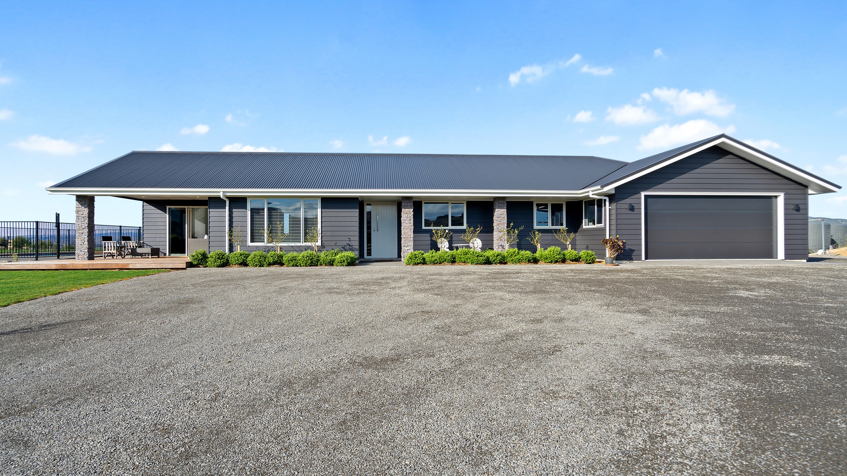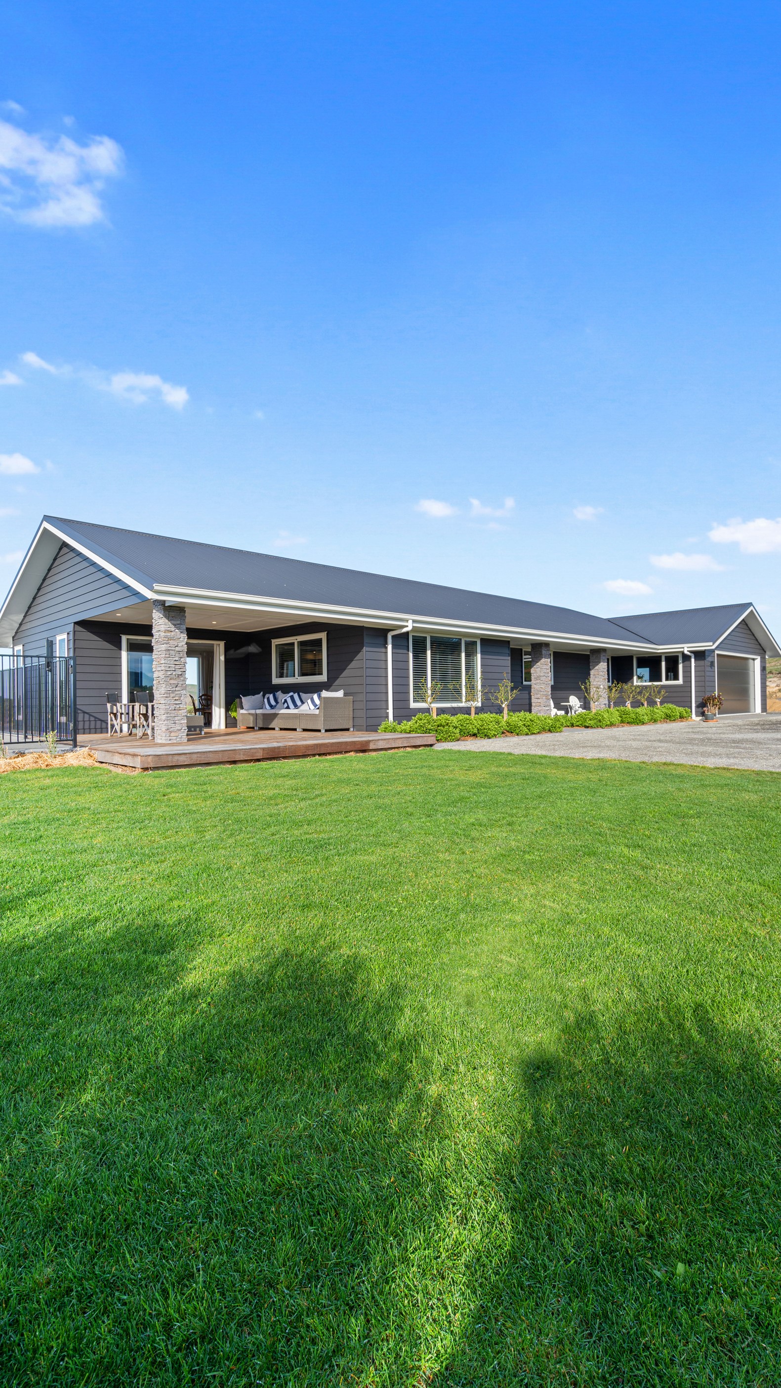 Perched on an elevated site overlooking the scenic hills and valleys of Central Hawke’s Bay, this four-bedroom home is all about location, views and relaxed family living. Constructed from quality, low-maintenance materials with schist pillars and exposed aggregate concrete footpaths, the 210sqm home fits like a glove within the landscape. The positioning was carefully considered to make the most of its idyllic location, with service areas to the south and living to the north. Practical, easy-care polished concrete flooring in the open-plan dining space and kitchen traps warmth from sunlight flooding in through the glazing. With the addition of ducted heating and cooling systems, the home stays comfortably temperate all year round. A separate media room can be closed off with cavity sliders to create a quiet, private space for getting stuck into a good movie or book. The carpeted and fully insulated garage has been set up with a pool table and table tennis for family games nights. In summer, the hot Hawke’s Bay days provide a welcome excuse to spend the afternoon in the swimming pool.