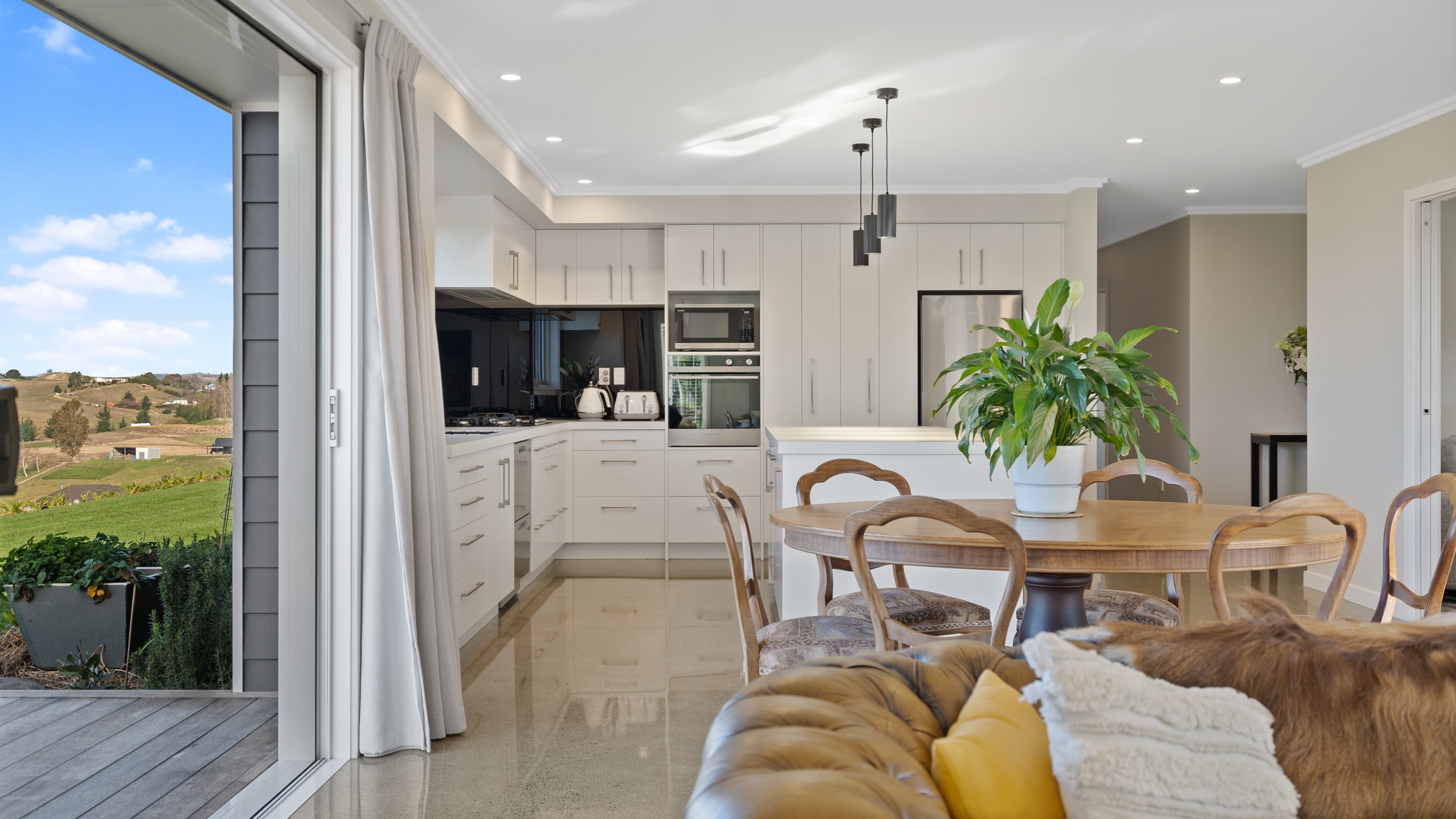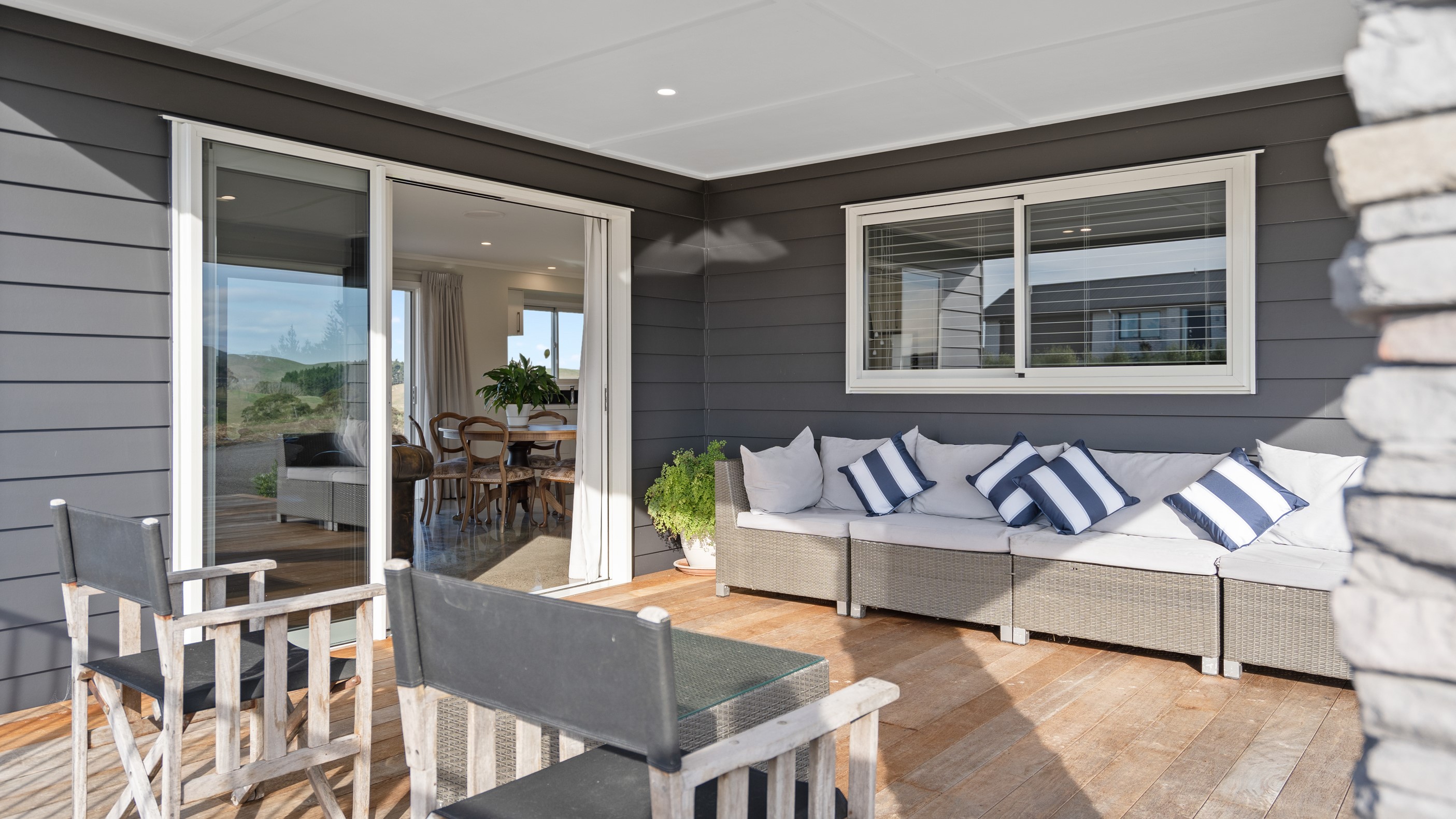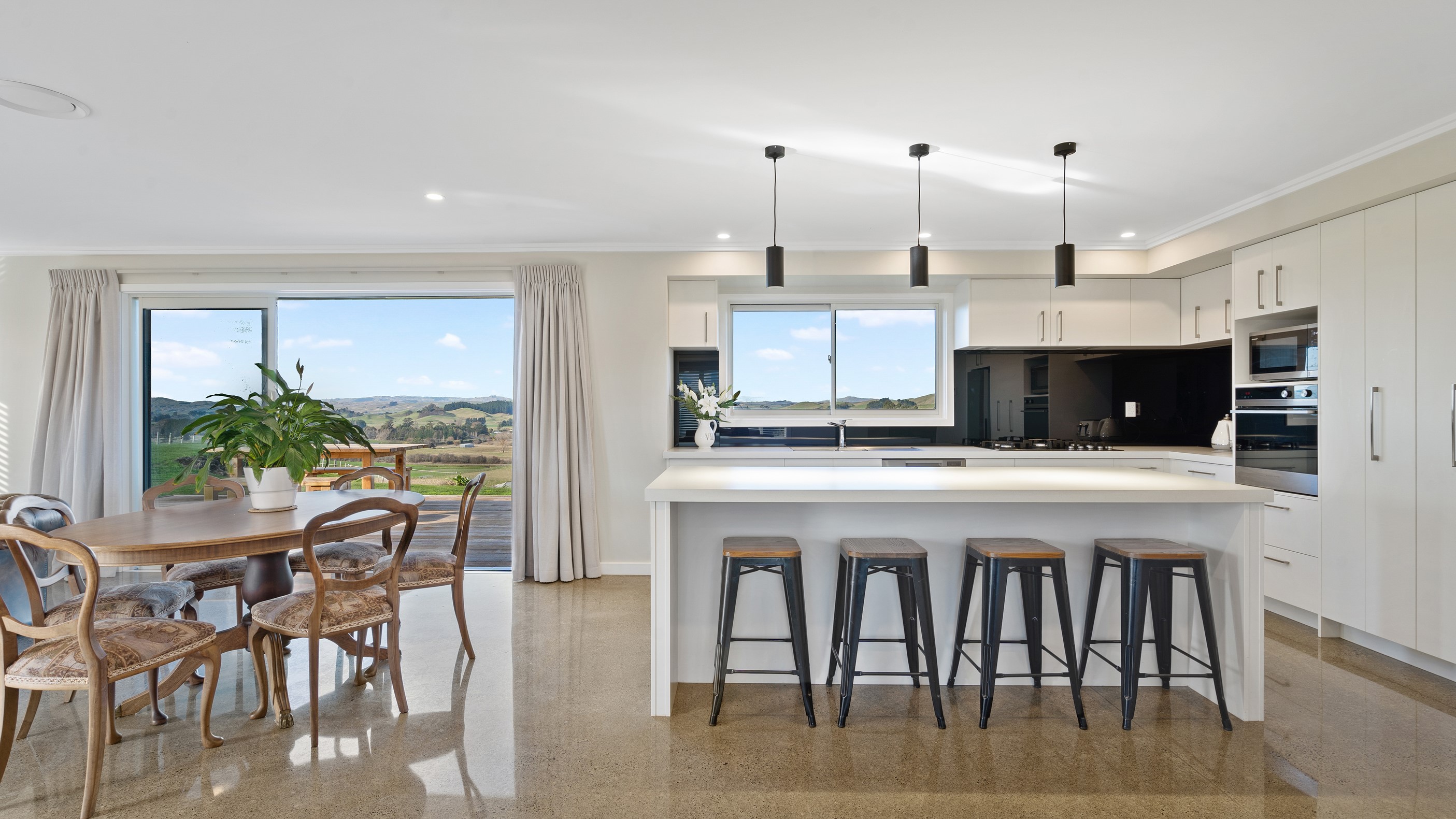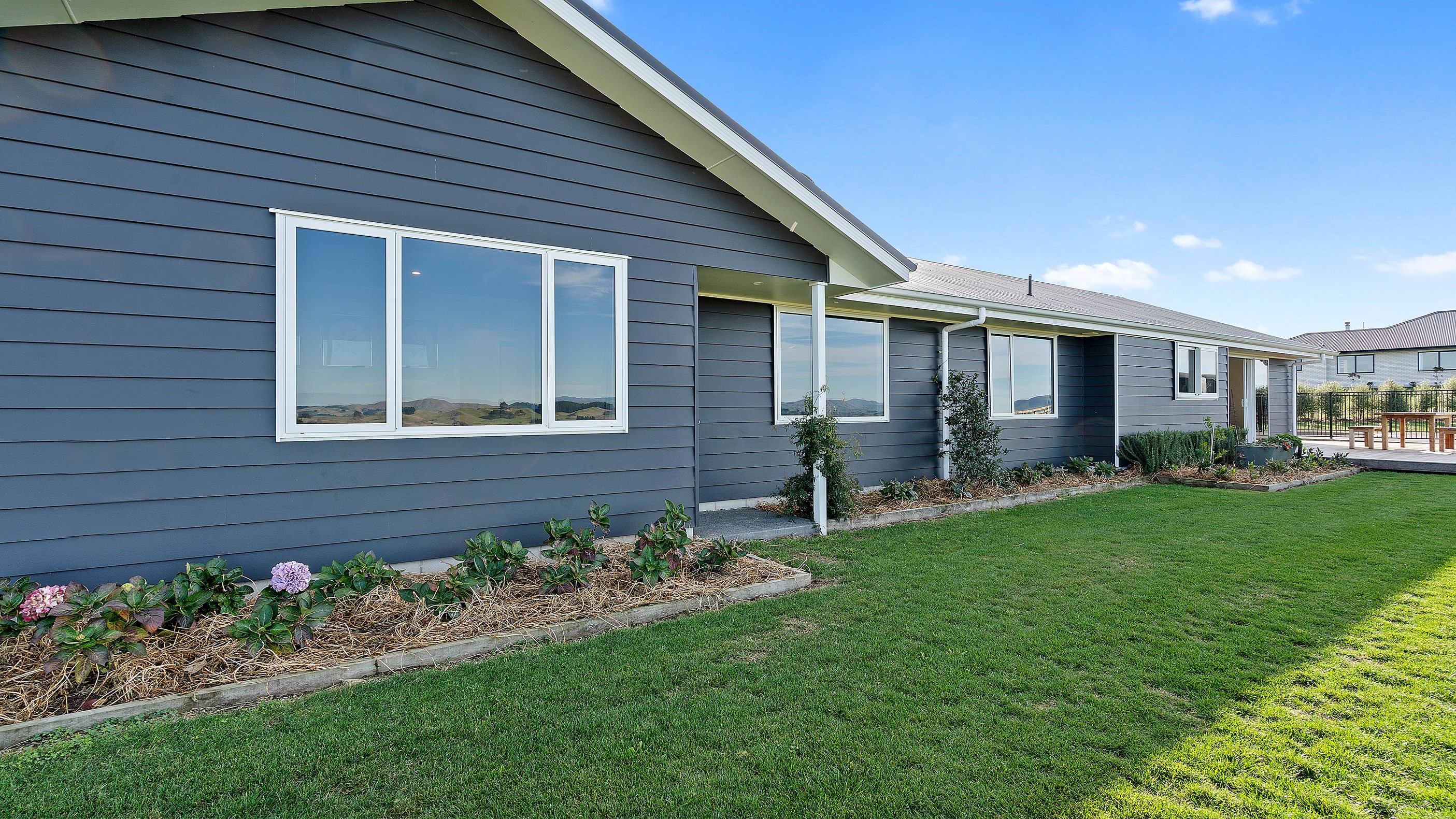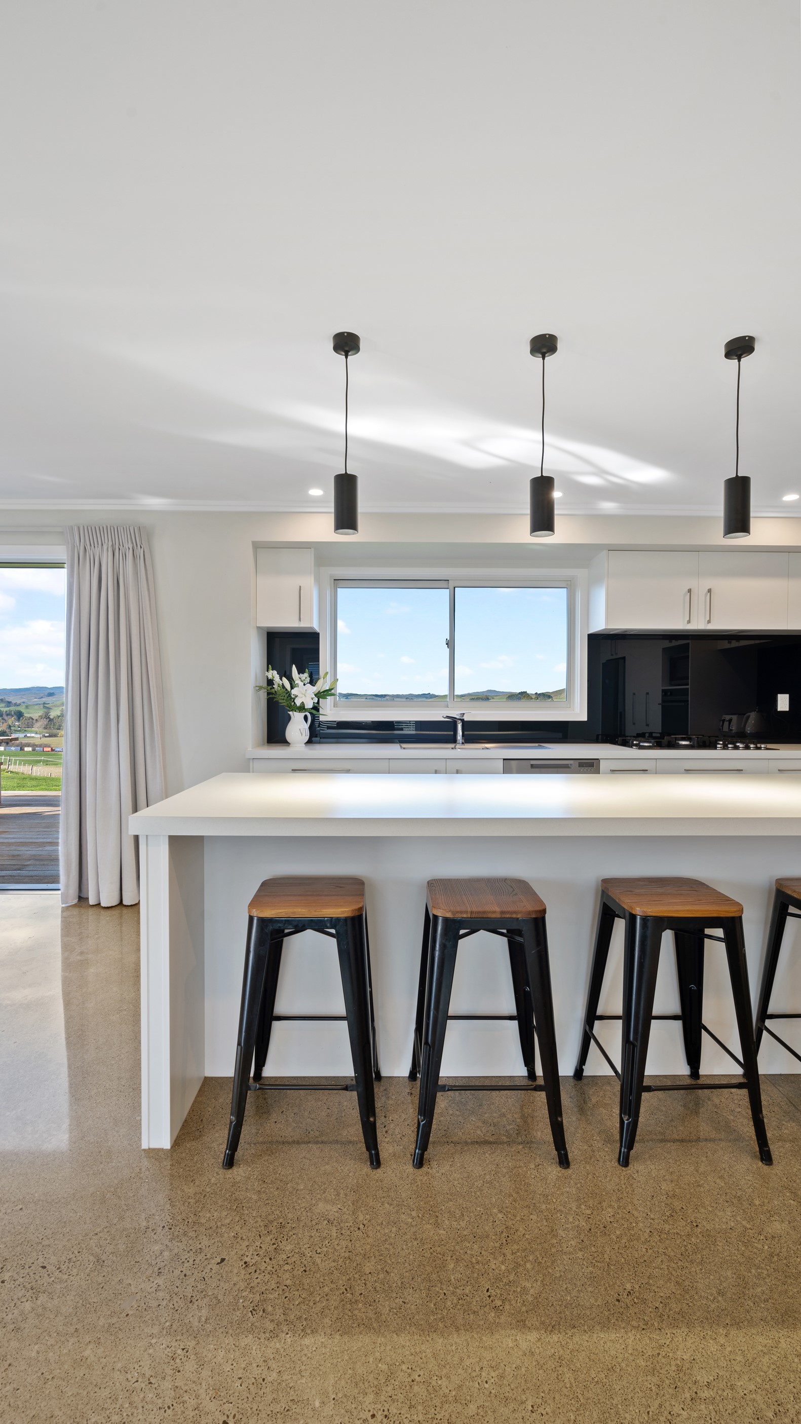 Perched on an elevated site overlooking the scenic hills and valleys of Central Hawke’s Bay, this four-bedroom home is all about location, views and relaxed family living. Constructed from quality, low-maintenance materials with schist pillars and exposed aggregate concrete footpaths, the 210sqm home fits like a glove within the landscape. The positioning was carefully considered to make the most of its idyllic location, with service areas to the south and living to the north. Practical, easy-care polished concrete flooring in the open-plan dining space and kitchen traps warmth from sunlight flooding in through the glazing. With the addition of ducted heating and cooling systems, the home stays comfortably temperate all year round. A separate media room can be closed off with cavity sliders to create a quiet, private space for getting stuck into a good movie or book. The carpeted and fully insulated garage has been set up with a pool table and table tennis for family games nights. In summer, the hot Hawke’s Bay days provide a welcome excuse to spend the afternoon in the swimming pool.