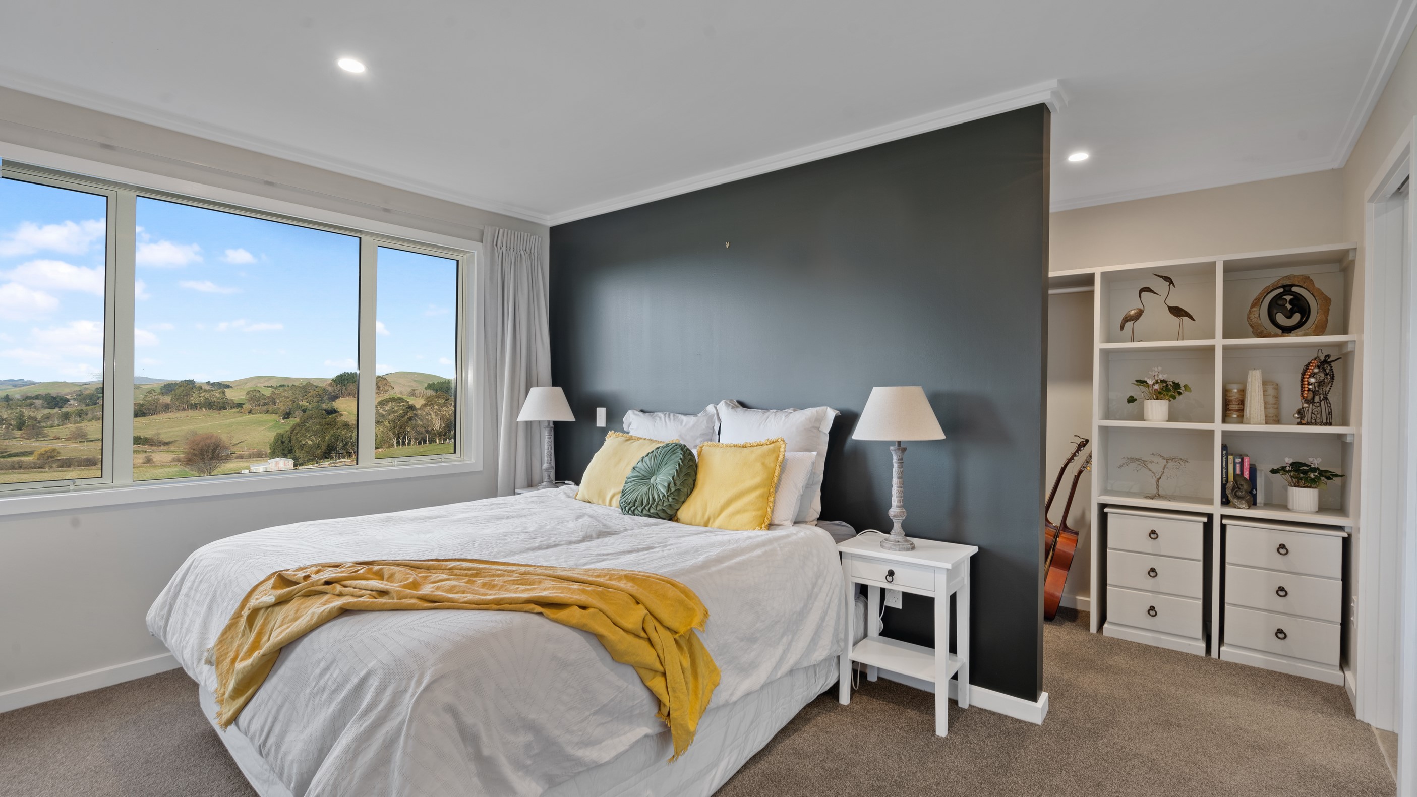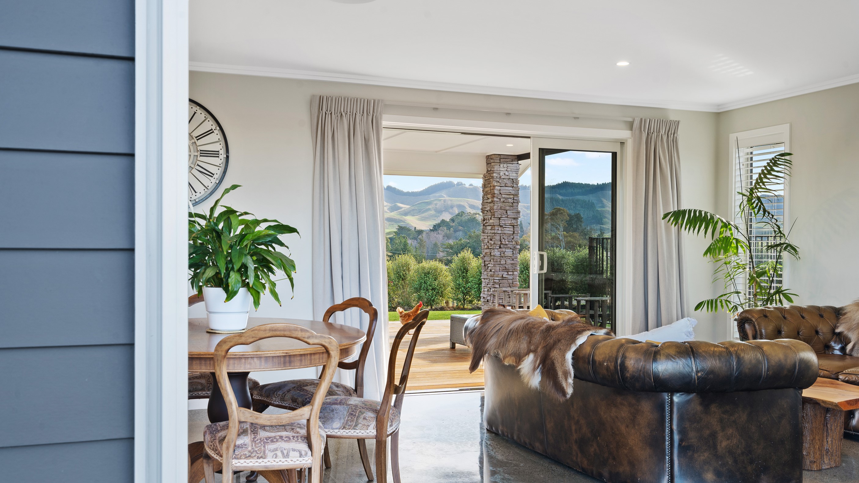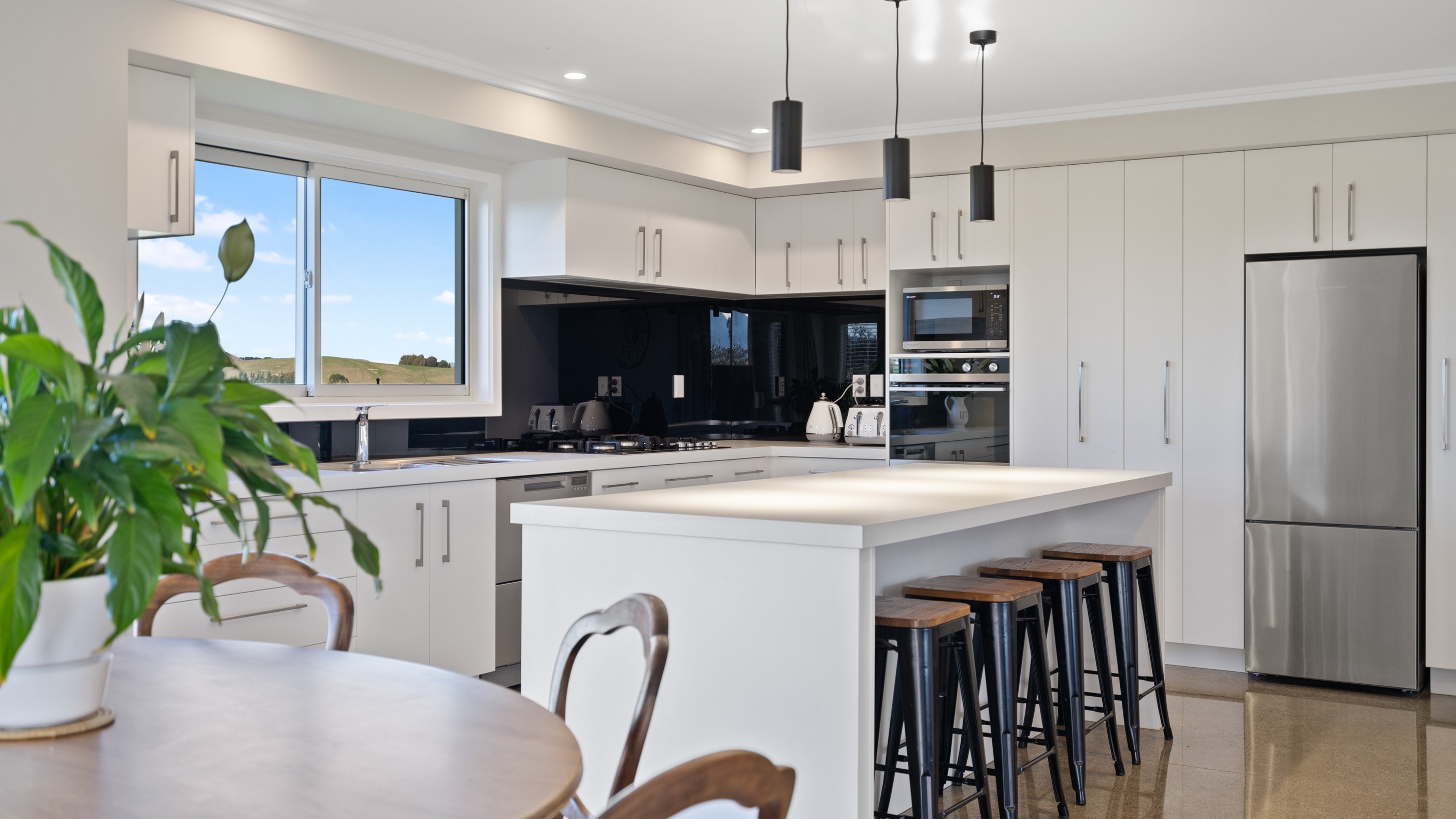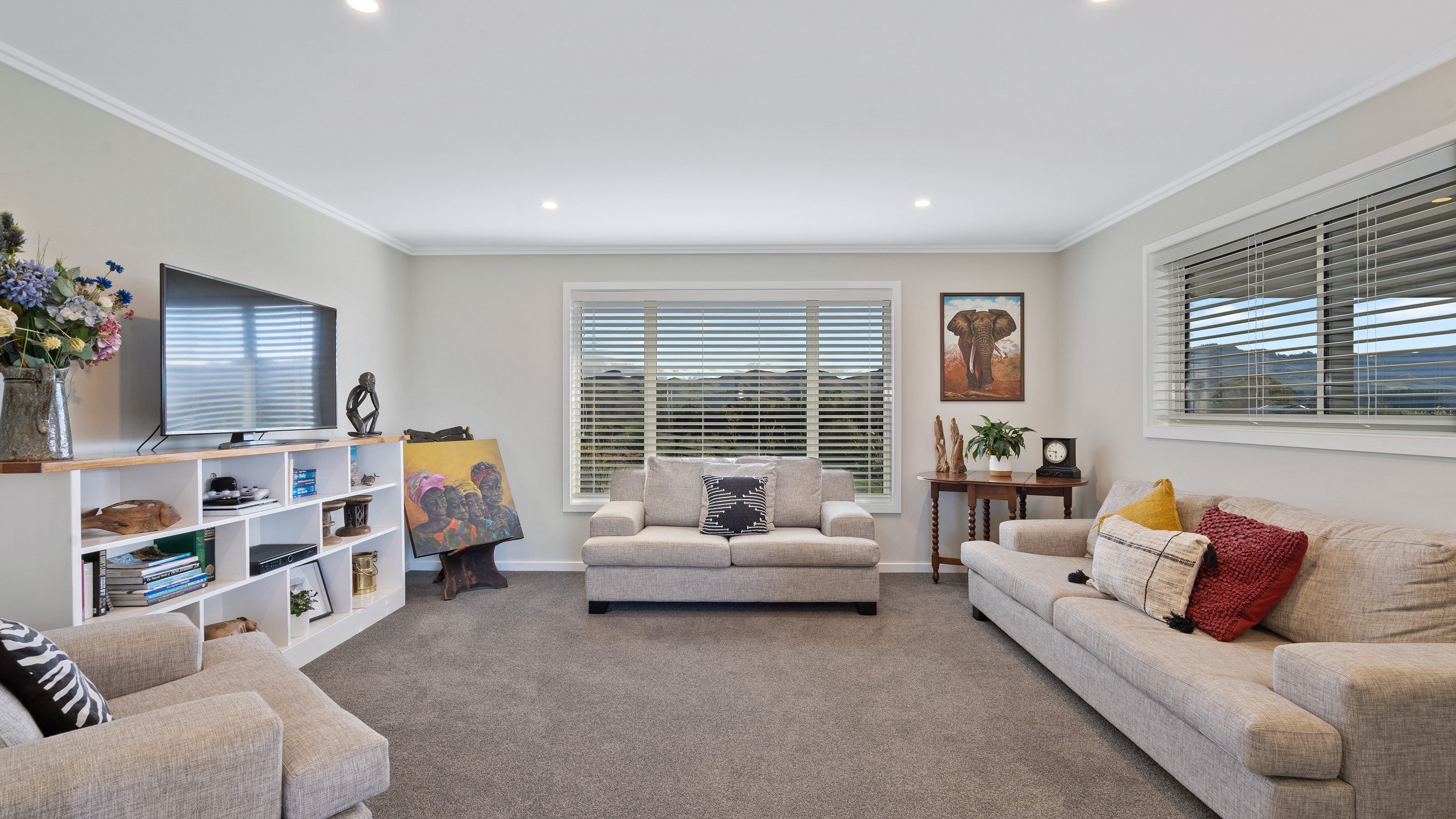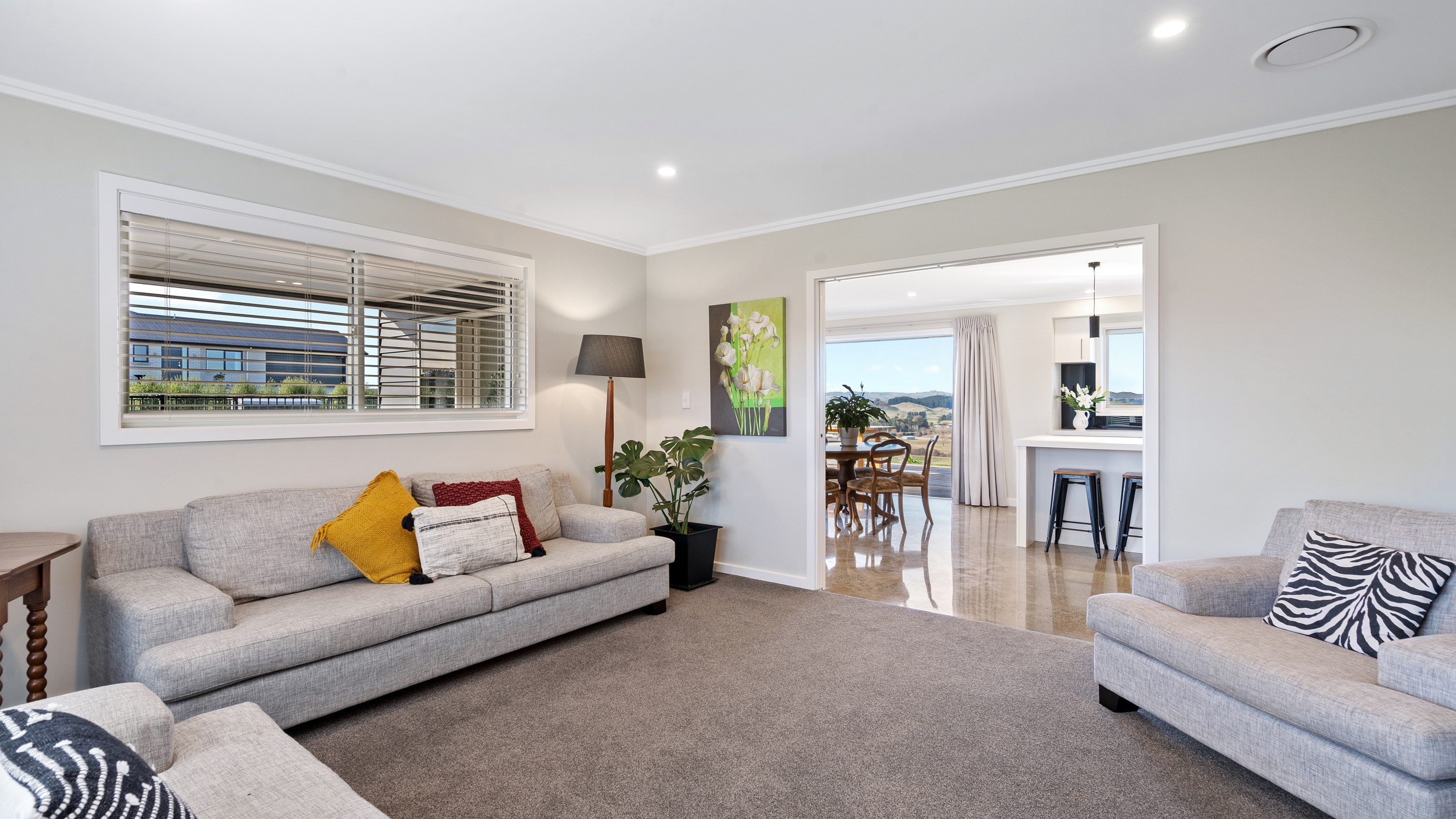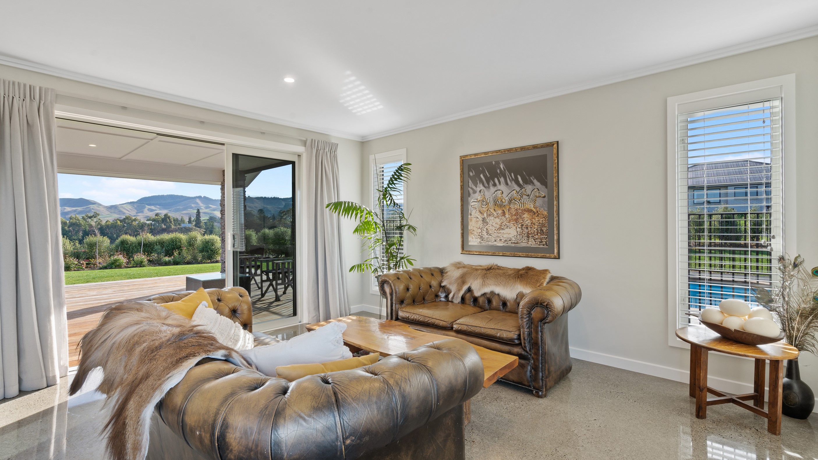 Perched on an elevated site overlooking the scenic hills and valleys of Central Hawke’s Bay, this four-bedroom home is all about location, views and relaxed family living. Constructed from quality, low-maintenance materials with schist pillars and exposed aggregate concrete footpaths, the 210sqm home fits like a glove within the landscape. The positioning was carefully considered to make the most of its idyllic location, with service areas to the south and living to the north. Practical, easy-care polished concrete flooring in the open-plan dining space and kitchen traps warmth from sunlight flooding in through the glazing. With the addition of ducted heating and cooling systems, the home stays comfortably temperate all year round. A separate media room can be closed off with cavity sliders to create a quiet, private space for getting stuck into a good movie or book. The carpeted and fully insulated garage has been set up with a pool table and table tennis for family games nights. In summer, the hot Hawke’s Bay days provide a welcome excuse to spend the afternoon in the swimming pool.