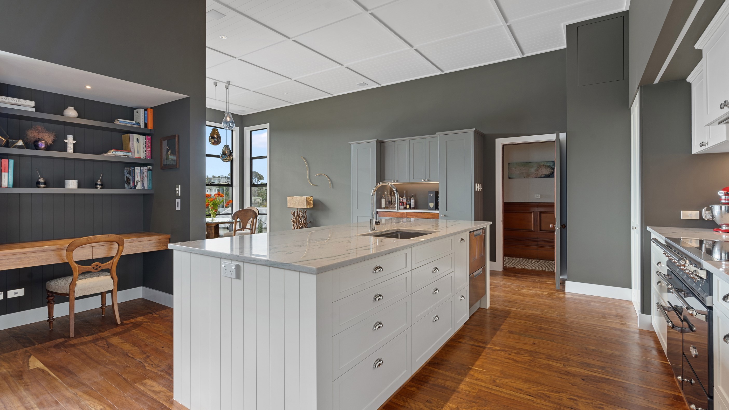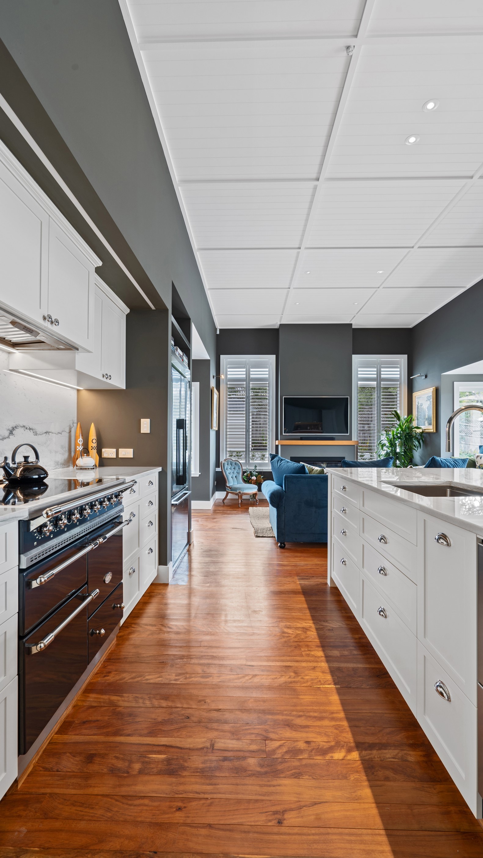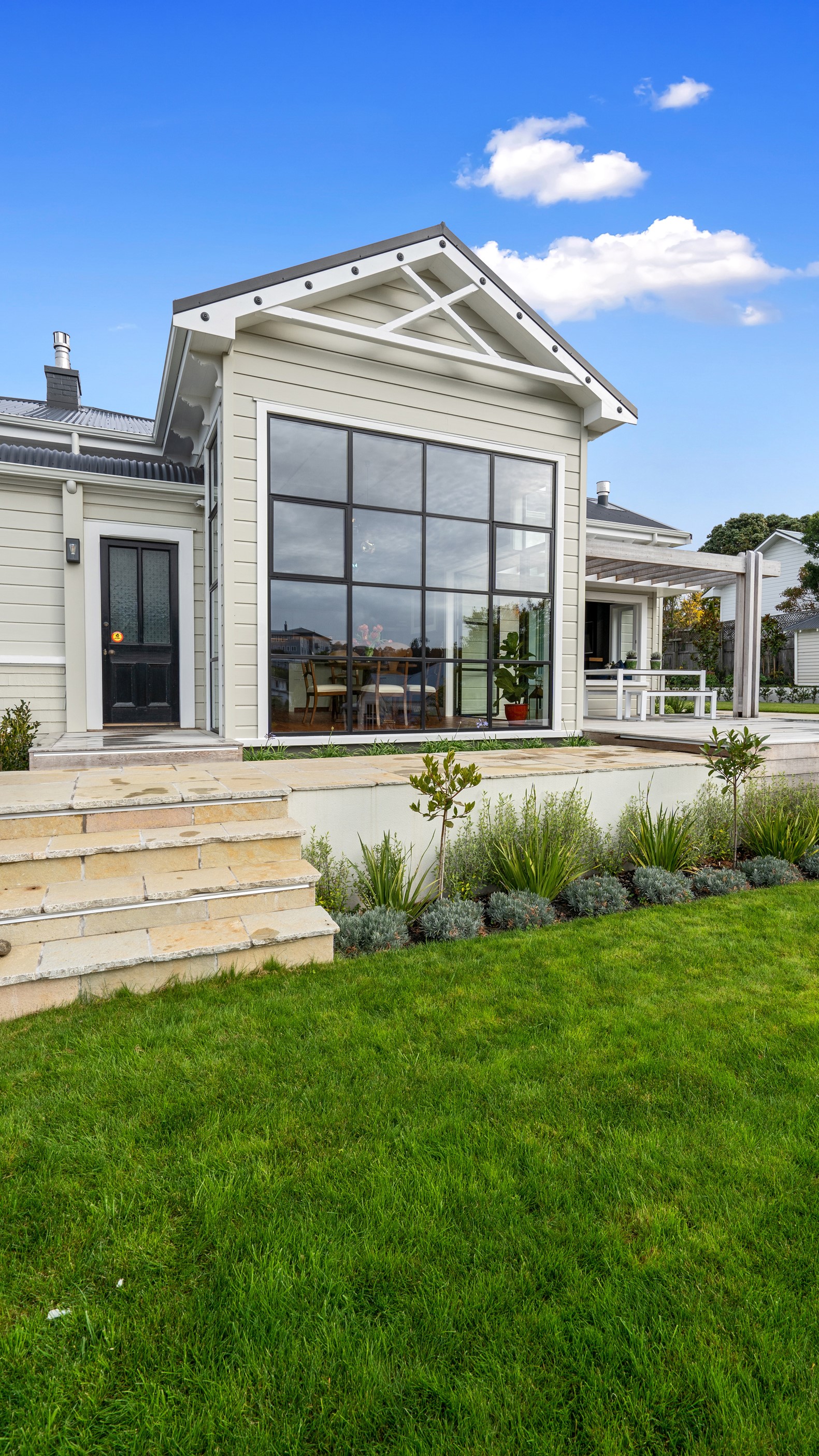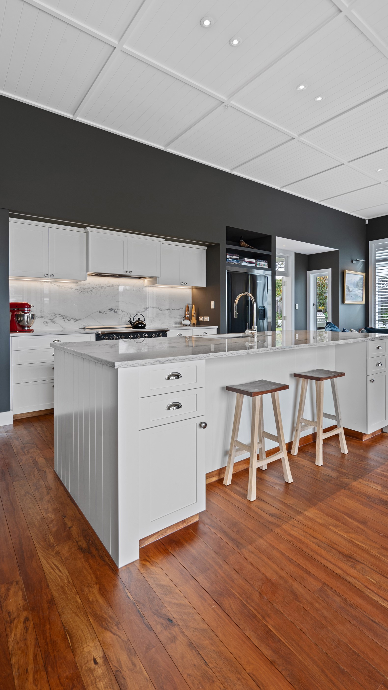 This much-loved century-old home has been infused with new life thanks to a carefully planned renovation that seamlessly connects with, and enhances, its original character. The primary purpose of the reno was to provide the family of four with a better flow within the home and to the outdoors. The project entailed a new kitchen, family and dining rooms, laundry, toilet and covered decks. In keeping with its 1900s charm, timber has been used throughout the renovation, including the floors, window and door joinery, ceilings, weatherboards and decking. The large windows that wrap the dining room are encased in steel units, slimmer profiles than the timber equivalent, to maximise the views. In the heart of the home, the kitchen is finished with Shaker-style cabinetry, a gas stove and stone benchtops that collectively complement the era of the house. With 60sqm of much-need extra space, an easy flow from the living area out to decking, and immaculately landscaped surrounds, this cherished home works perfectly for its modern family.