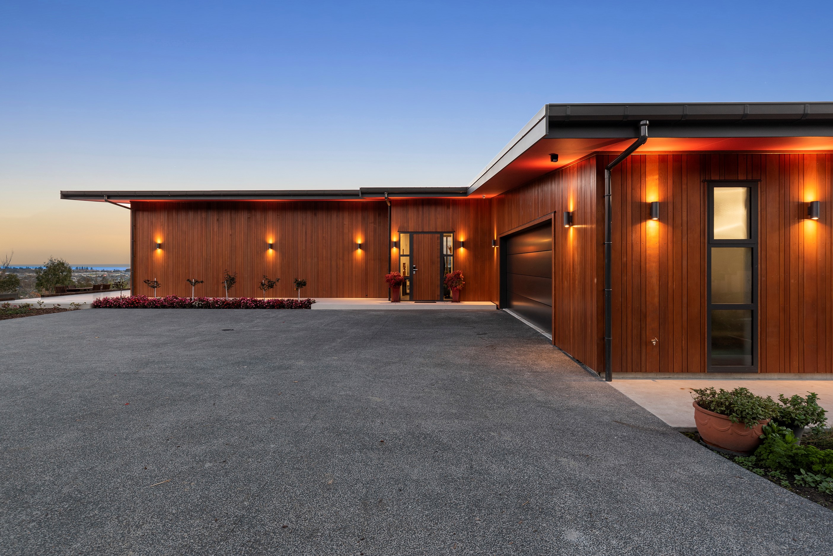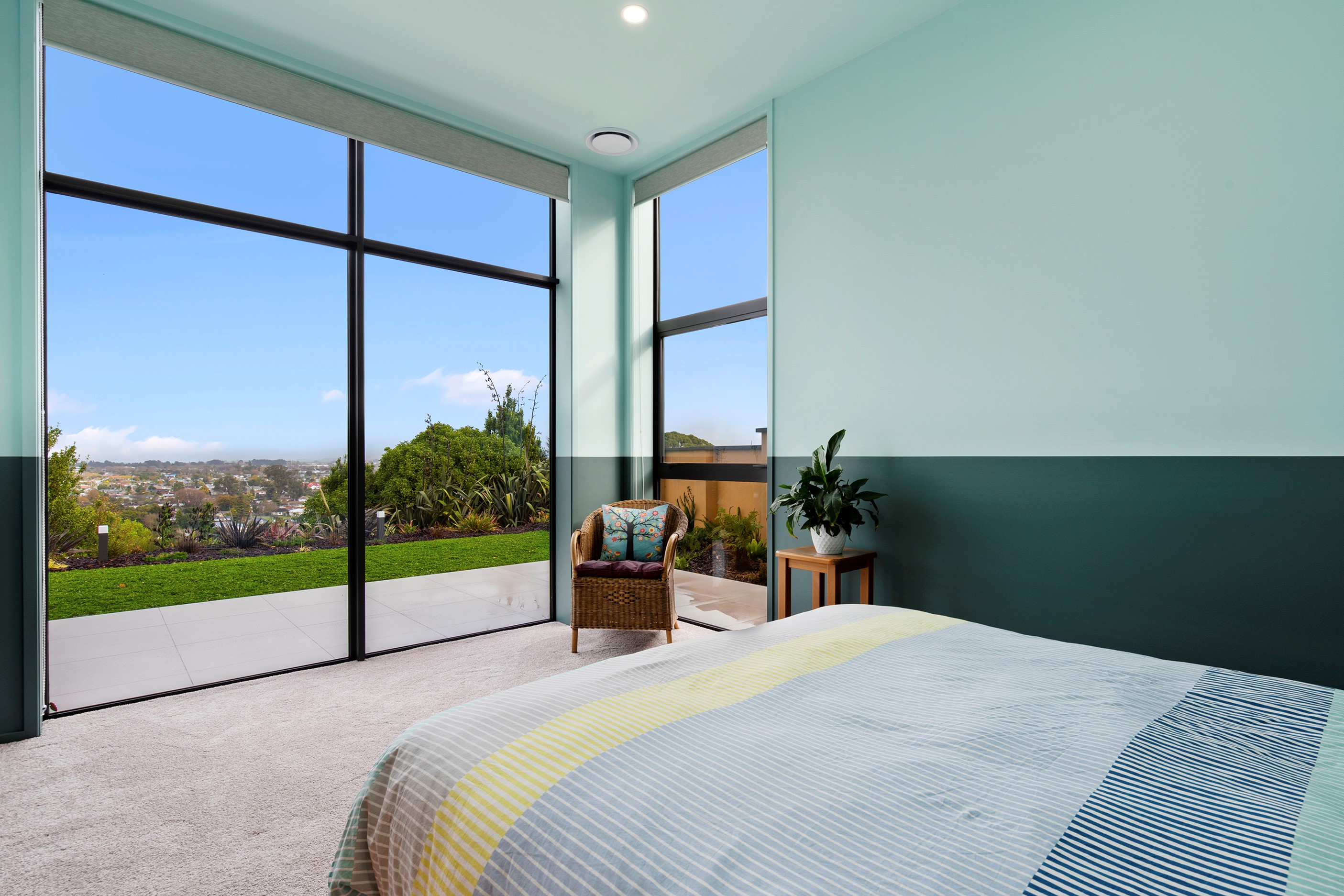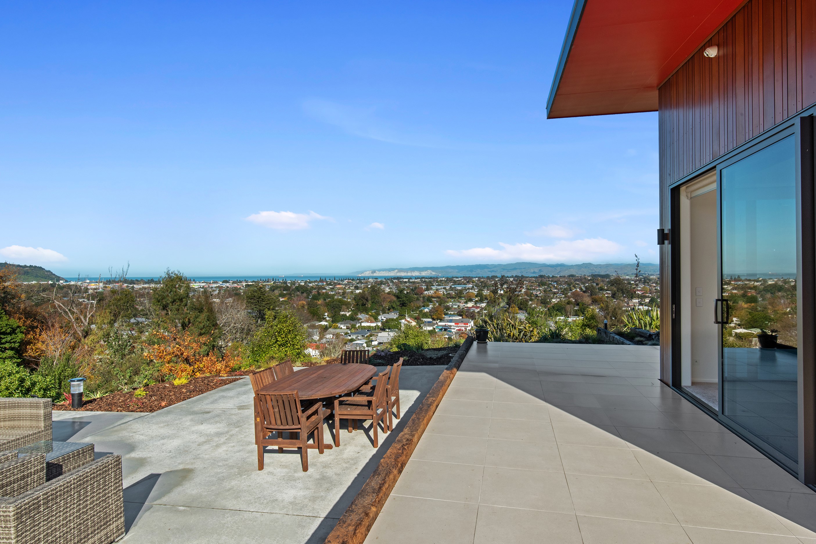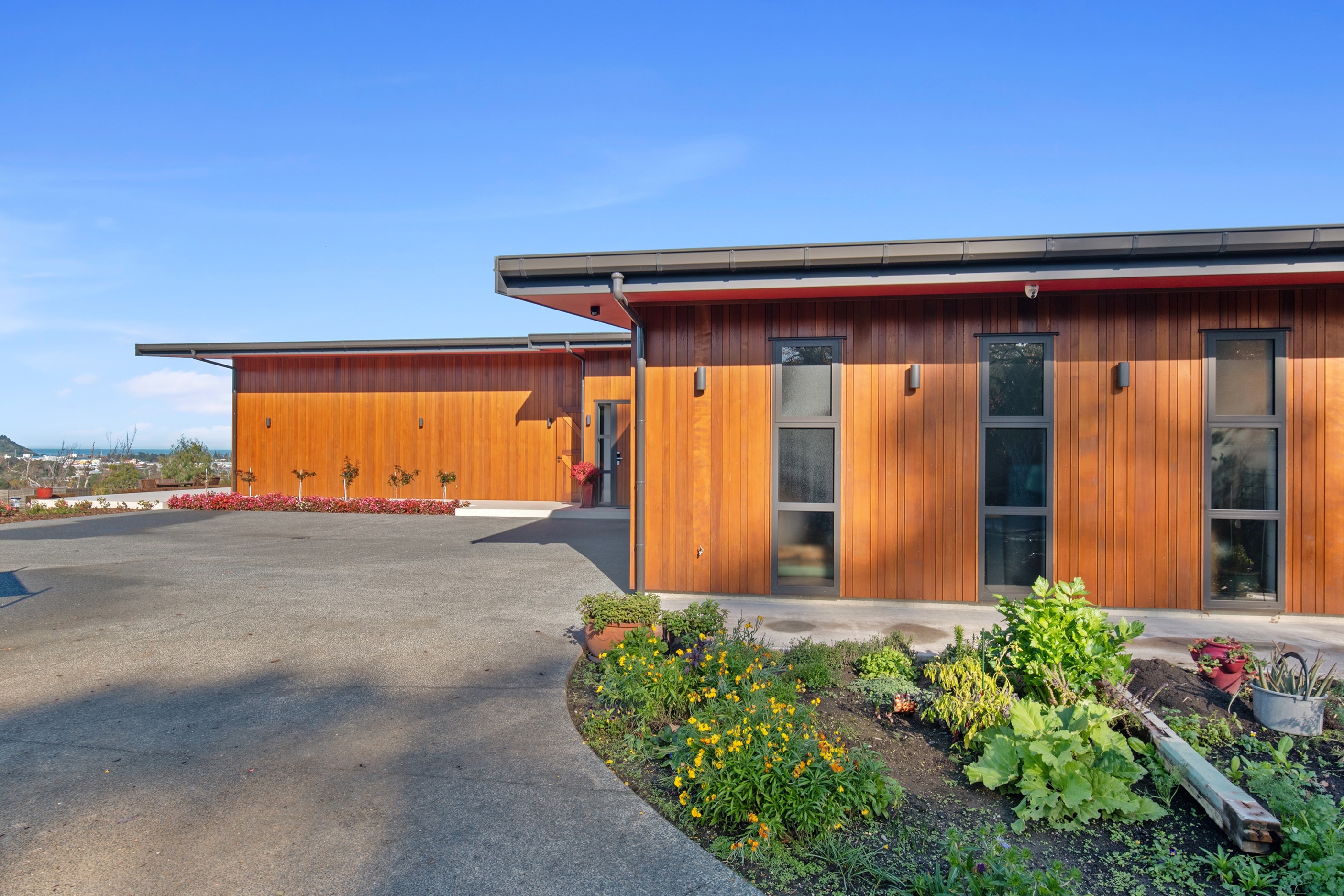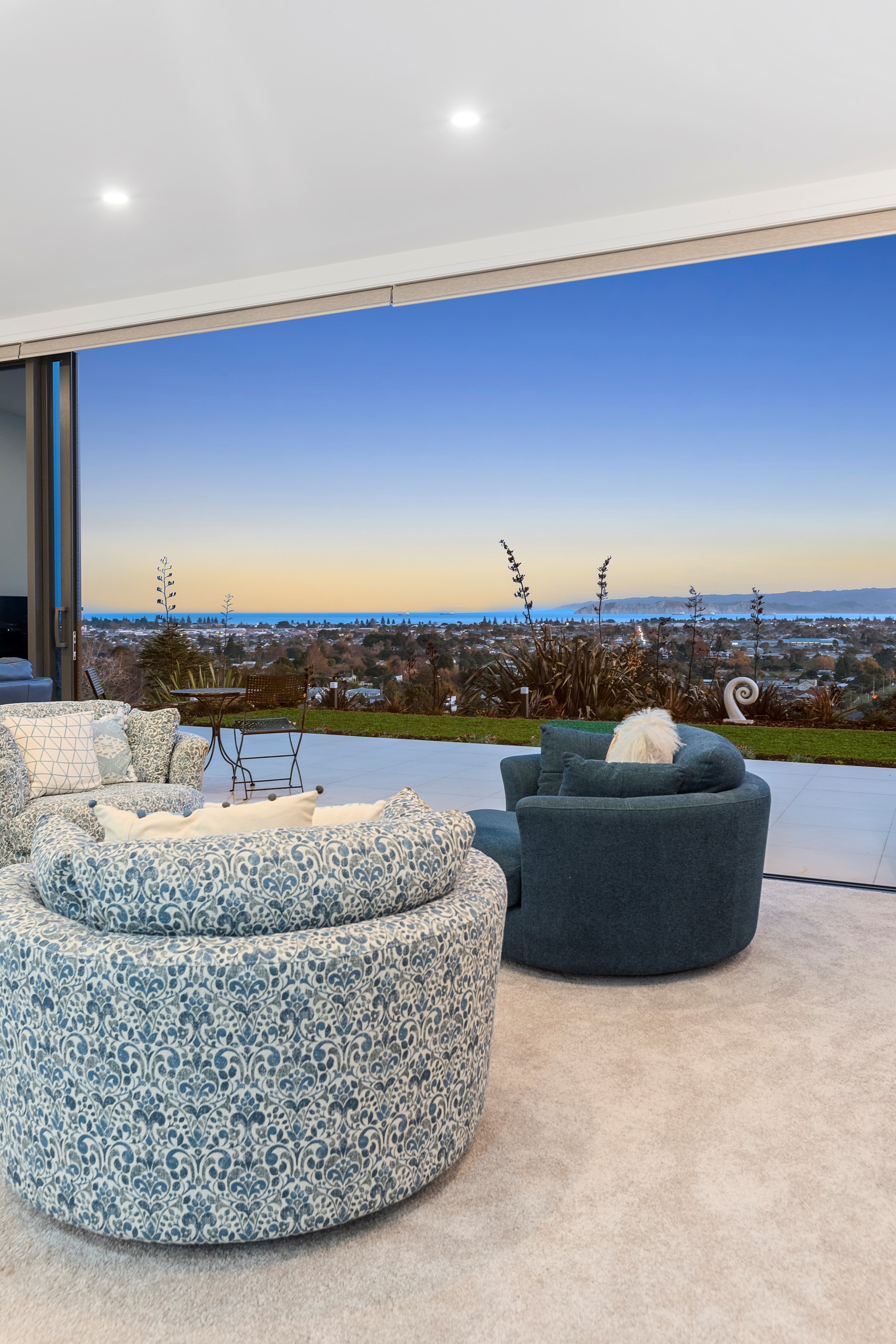 Enjoying hilltop positioning, this striking three-bedroom home has been built to capture picturesque views overlooking Tūranganui-a-Kiwa, Poverty Bay. Generously proportioned and precisely engineered glazing makes the most of the tranquil vista, while ample eaves provide shelter. Designed solely for two, the majority of the home’s 272sqm floorplan has been dedicated to the kitchen, living area and main bedroom wing. Two spare bedrooms and a large office allow ample space for the owners to work from home. Surrounded on two sides with panoramic views, the main bedroom wing is a haven. Floor-to-ceiling full-width glazing opens onto the attractively paved outdoor living area, which wraps its way around the home. The main suite is perfectly partitioned with a dressing room in the centre and the generous ensuite – complete with a freestanding bath – taking up full width at the back. Bold designer tiles, pops of colour in the kitchen and feature wallpaper add interesting touches and express the owners’ creative personalities.