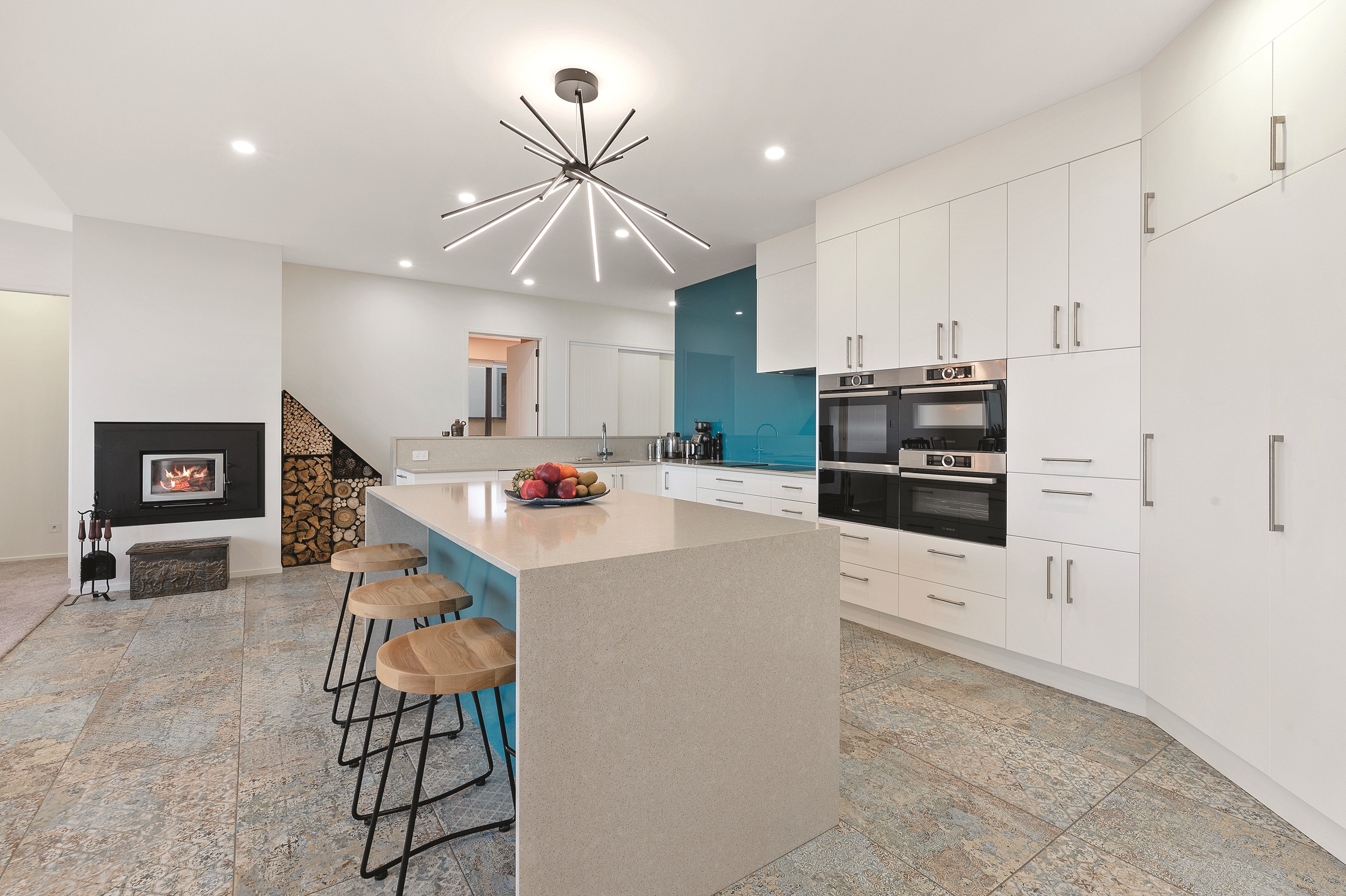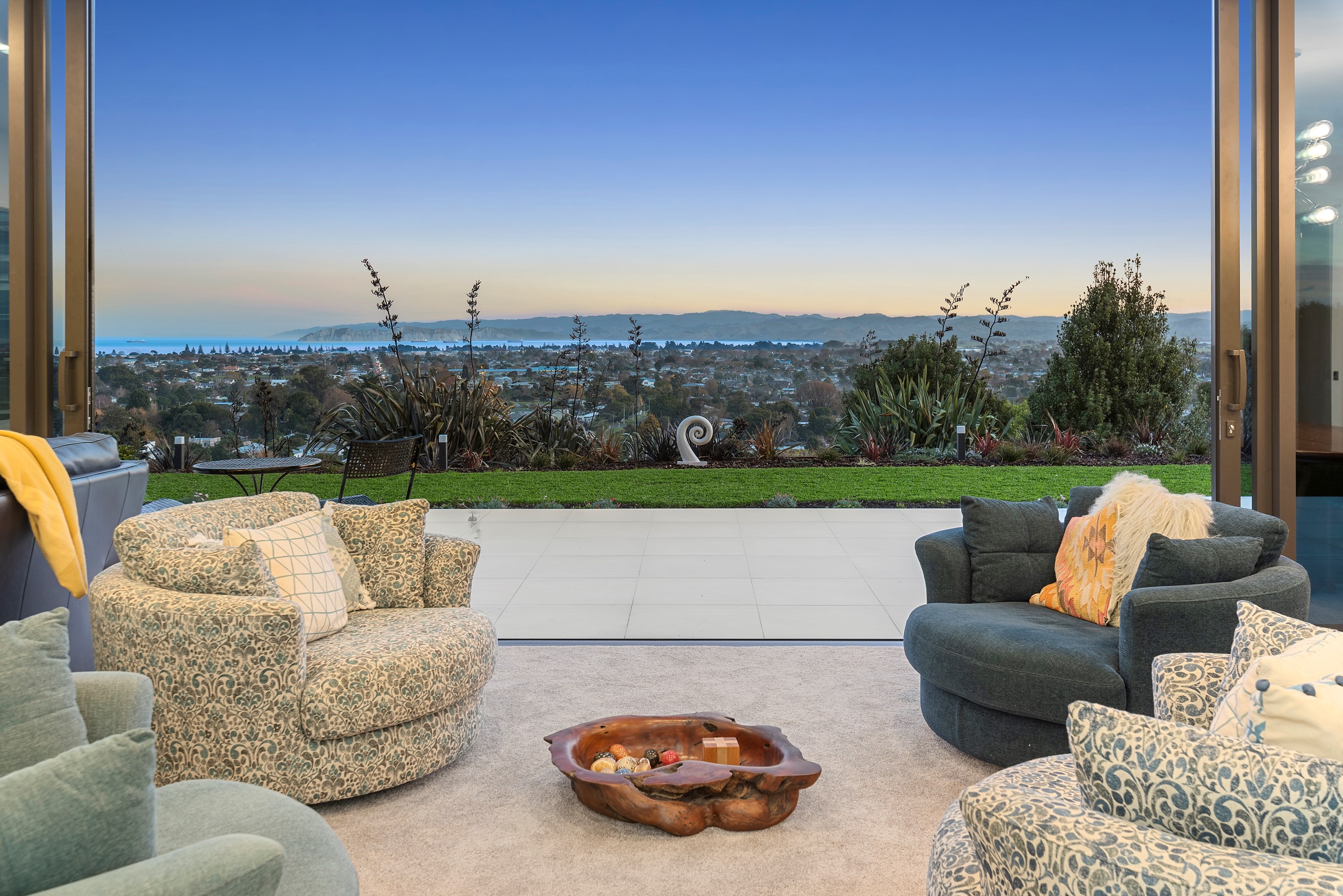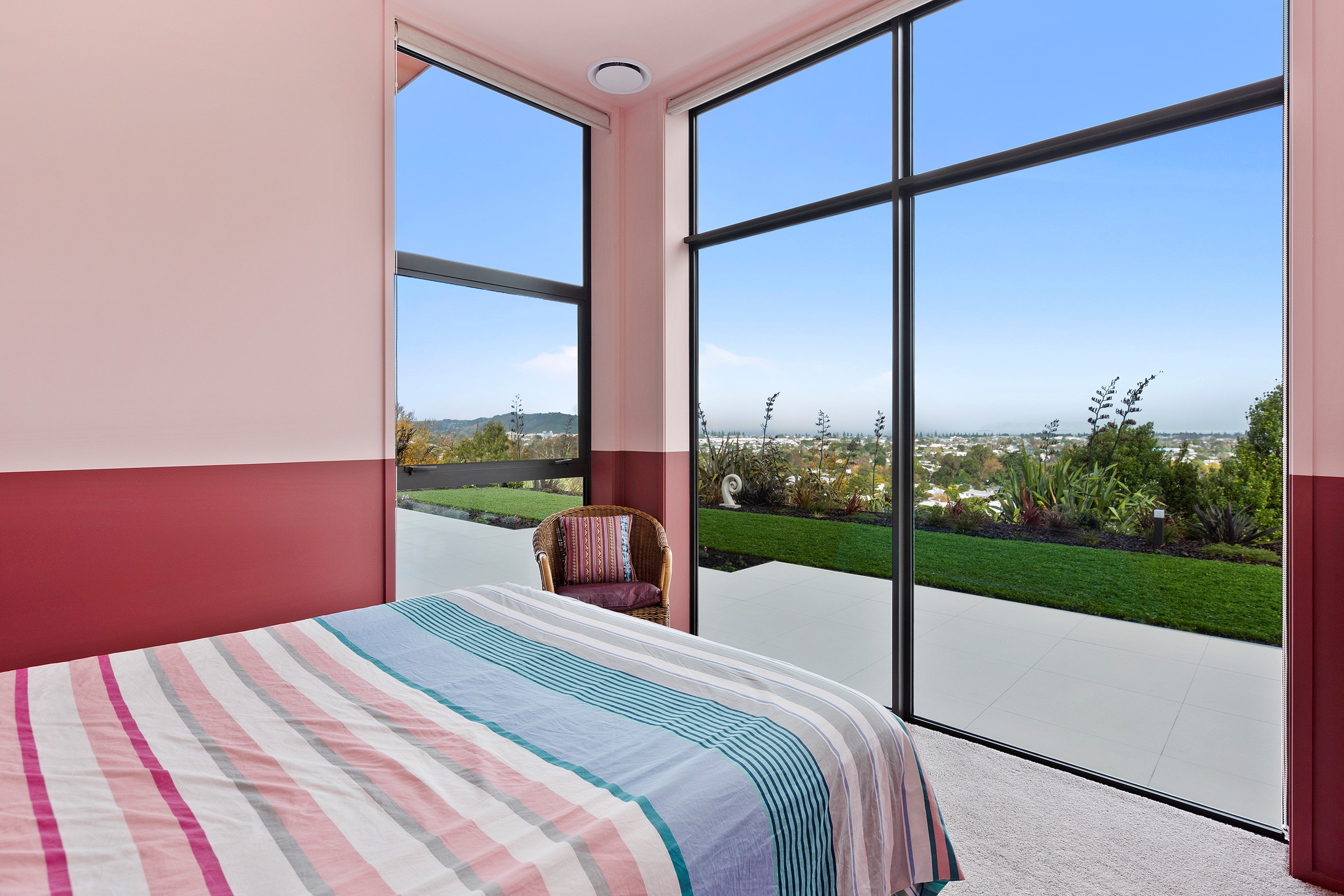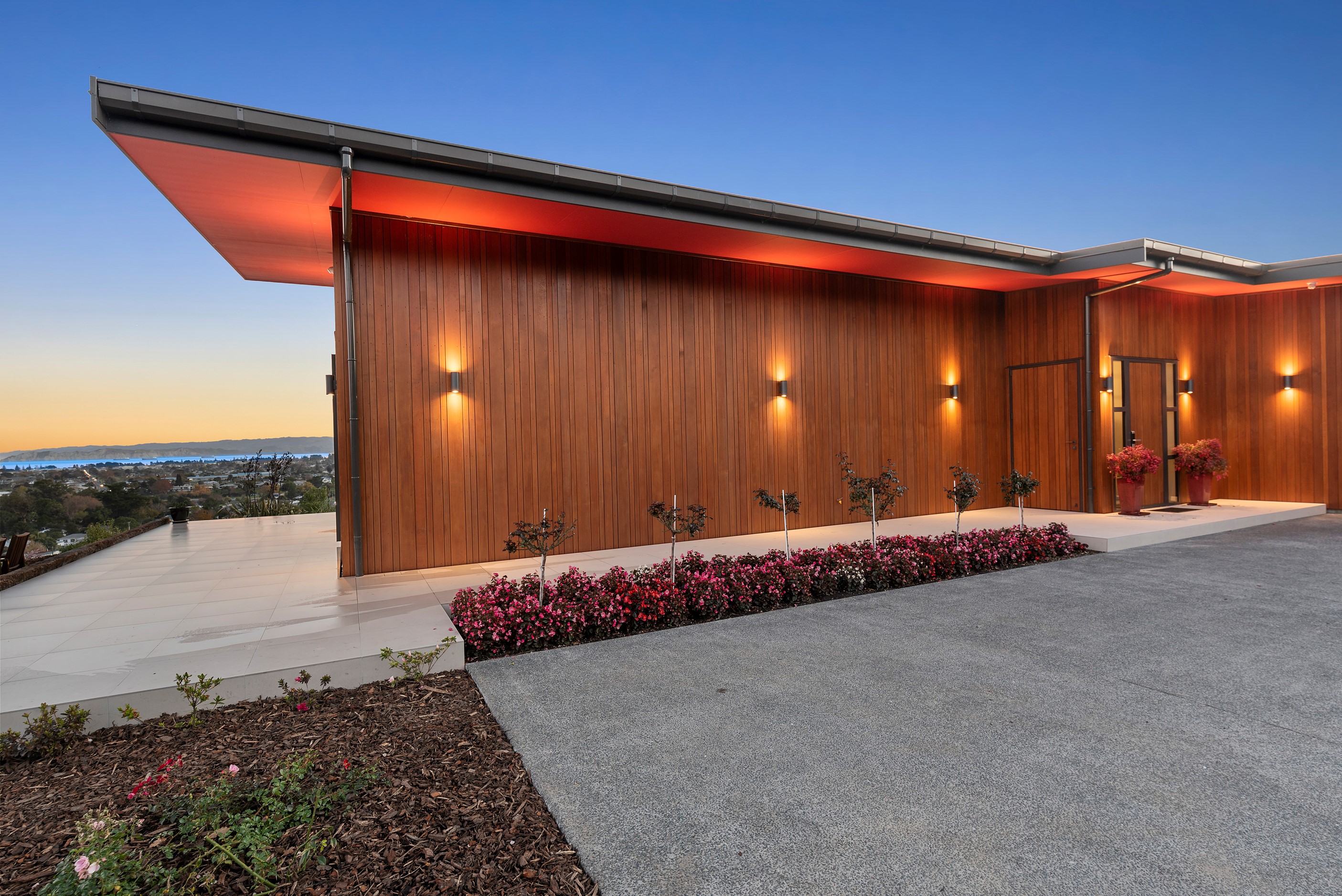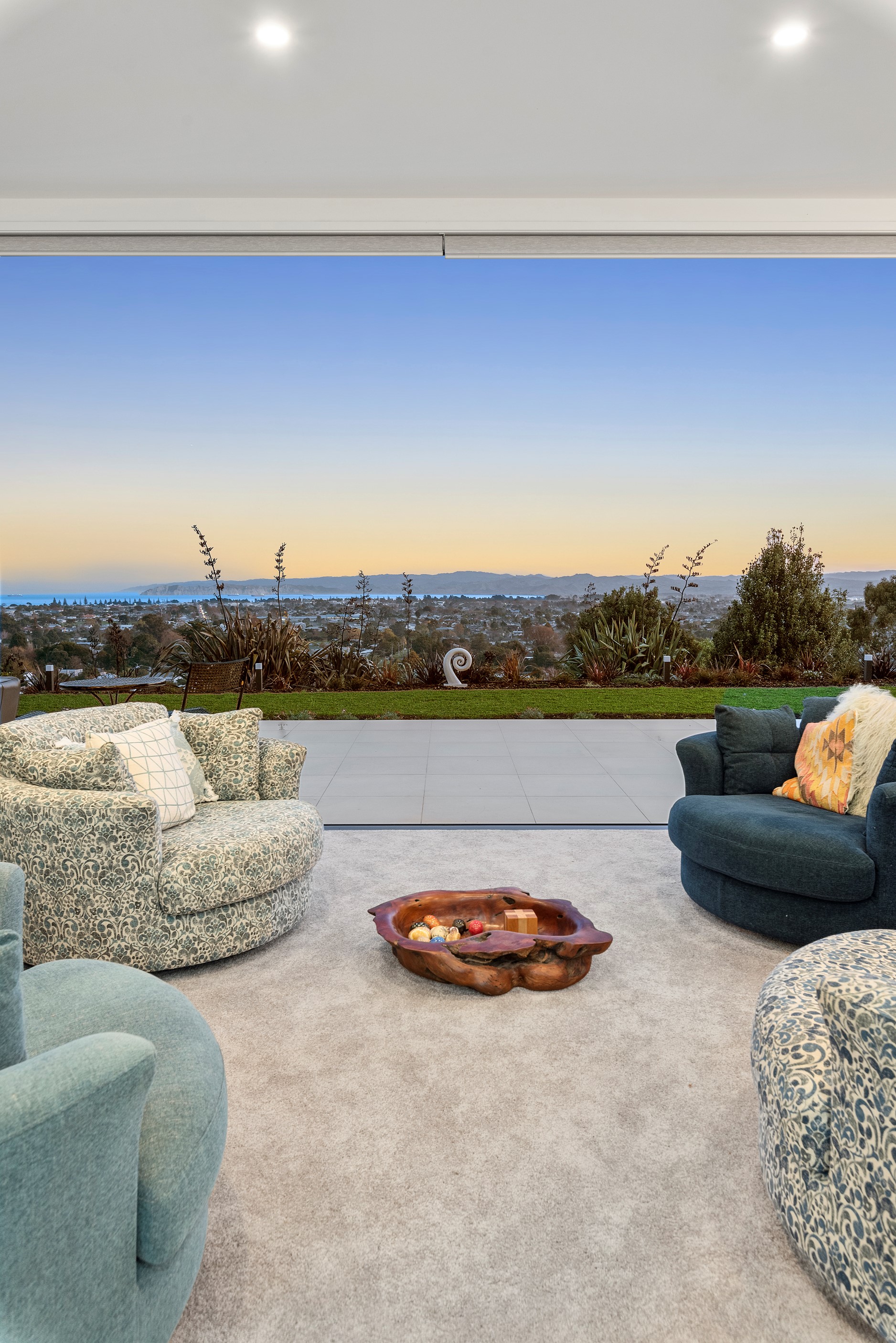 Enjoying hilltop positioning, this striking three-bedroom home has been built to capture picturesque views overlooking Tūranganui-a-Kiwa, Poverty Bay. Generously proportioned and precisely engineered glazing makes the most of the tranquil vista, while ample eaves provide shelter. Designed solely for two, the majority of the home’s 272sqm floorplan has been dedicated to the kitchen, living area and main bedroom wing. Two spare bedrooms and a large office allow ample space for the owners to work from home. Surrounded on two sides with panoramic views, the main bedroom wing is a haven. Floor-to-ceiling full-width glazing opens onto the attractively paved outdoor living area, which wraps its way around the home. The main suite is perfectly partitioned with a dressing room in the centre and the generous ensuite – complete with a freestanding bath – taking up full width at the back. Bold designer tiles, pops of colour in the kitchen and feature wallpaper add interesting touches and express the owners’ creative personalities.